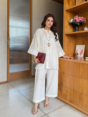 Product Details - This garment features an ivory long mulmul kaftan designed for refined summer...