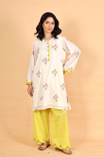 Product Details :This ensemble features a lime yellow floral hand block printed Chanderi short kurta,...