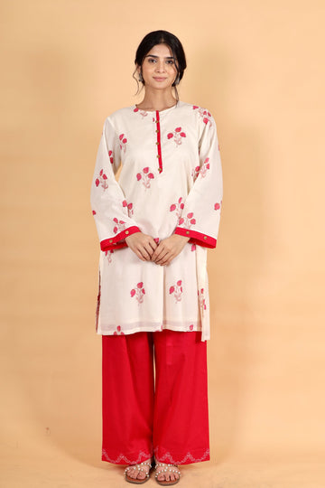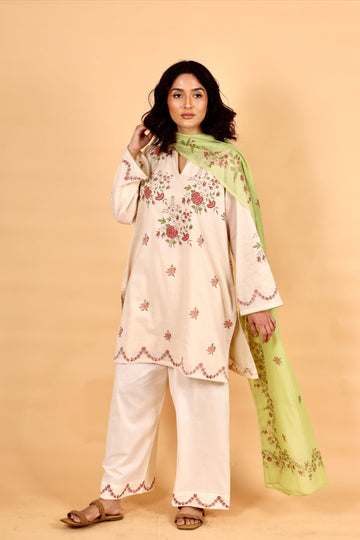 Product Details : This ensemble features an ivory cotton short kurta paired with coordinating pants,...