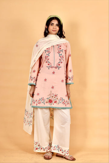 Product Details - This ensemble features a peach short mulmul kurta adorned with delicate floral...