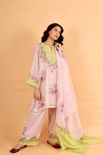 Product Details : This ensemble features a pink hand block printed chanderi kurta detailed with...