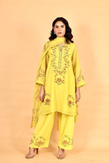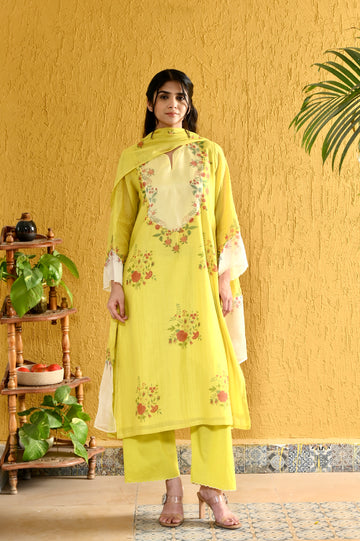 Product Details : This ensemble features a lime yellow hand block printed chanderi kurta detailed...