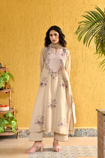Product Details : This ensemble features a beige hand block printed chanderi kurta detailed with...