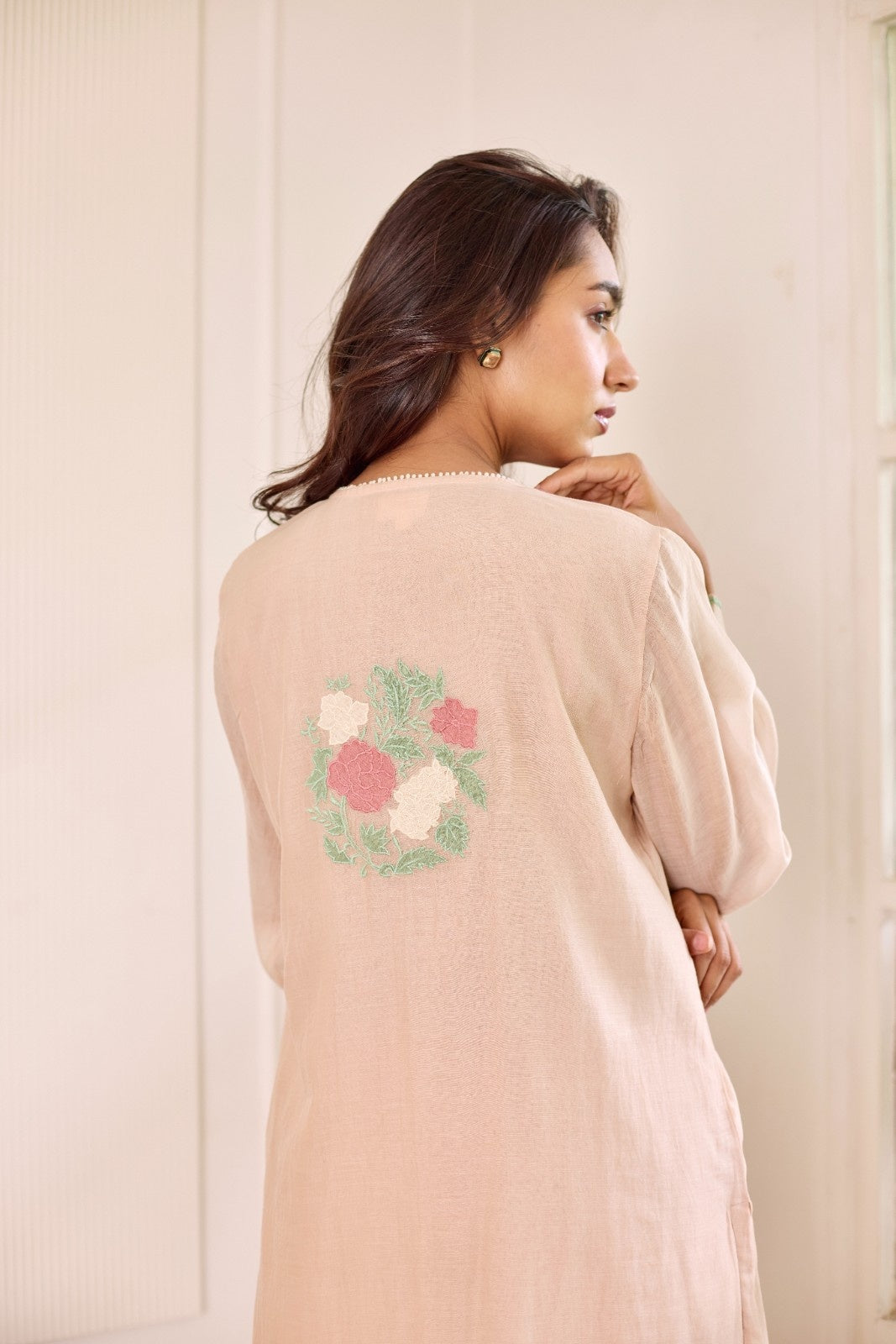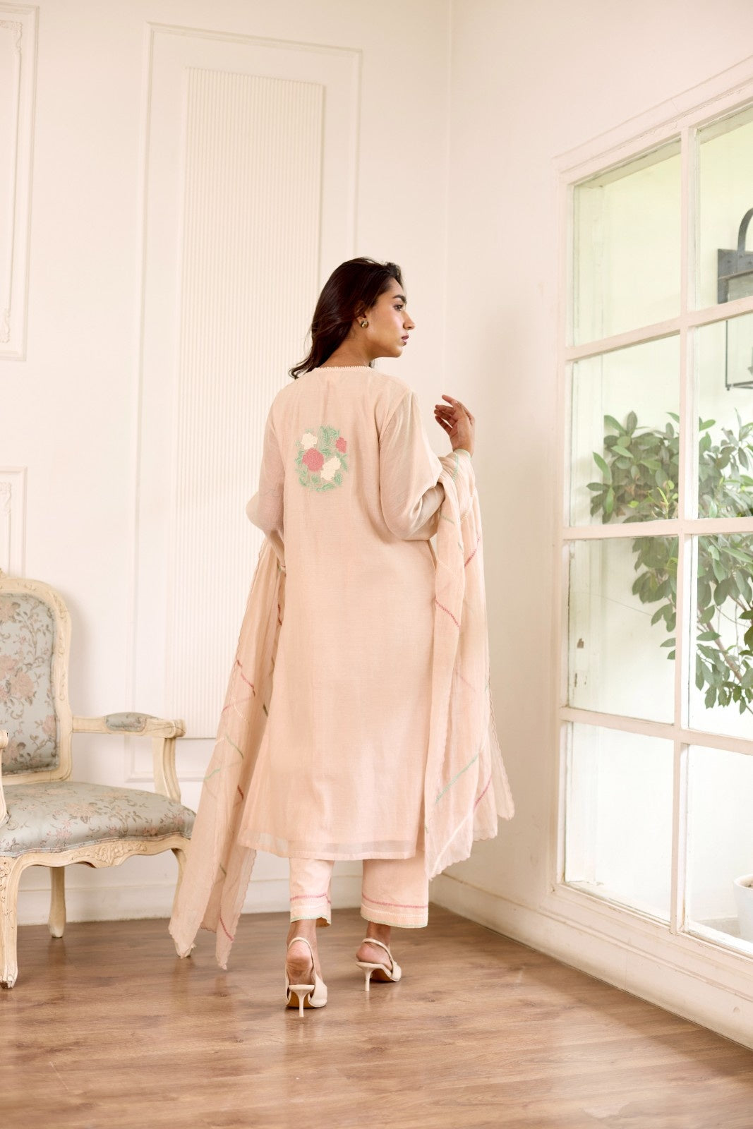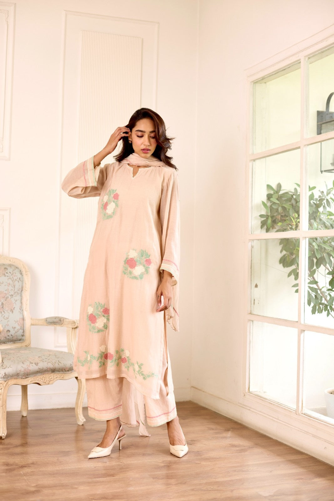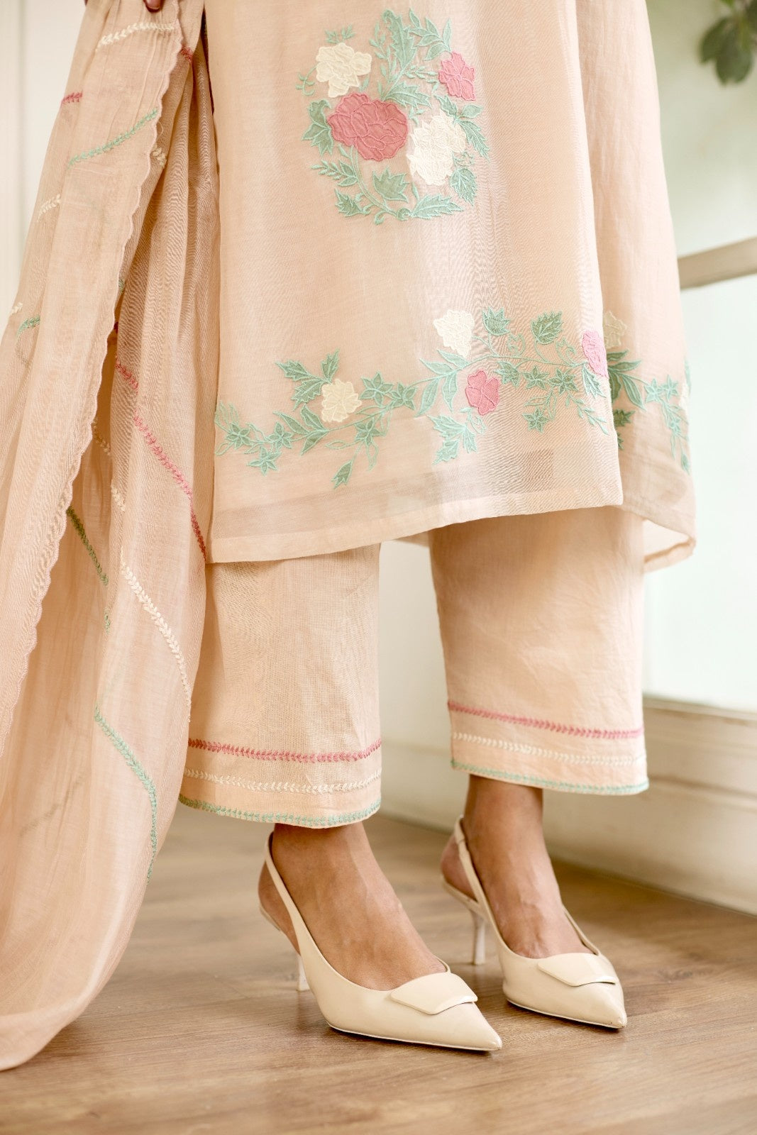 Adira peach hand applique and thread embroidered chanderi kurta set (set of 3)