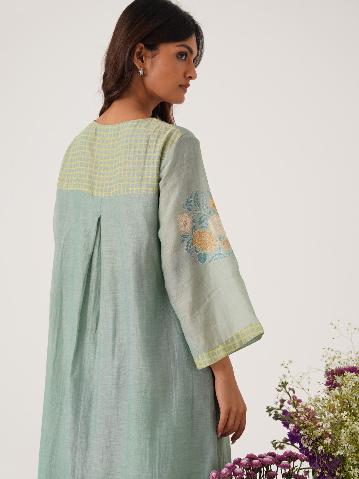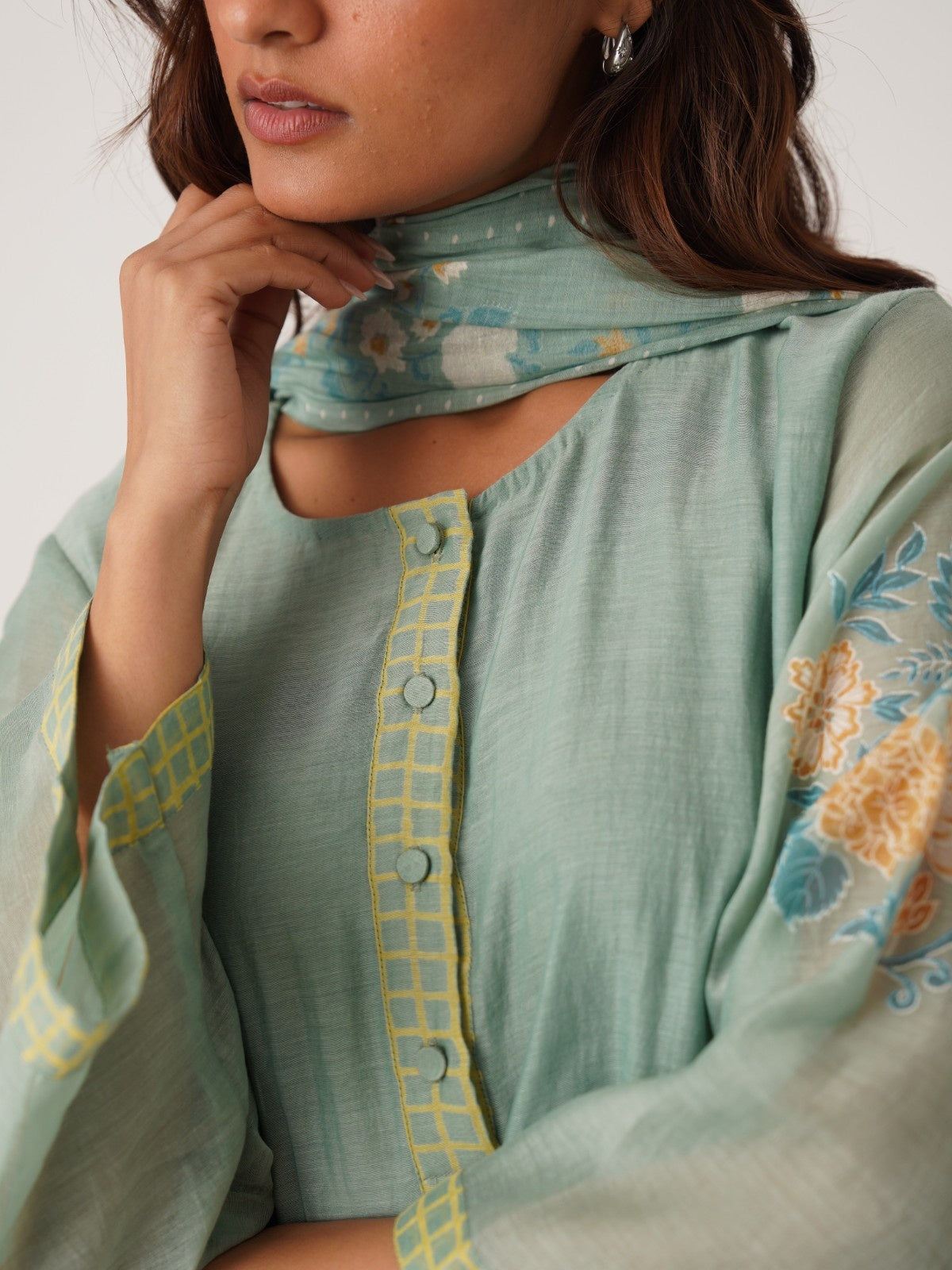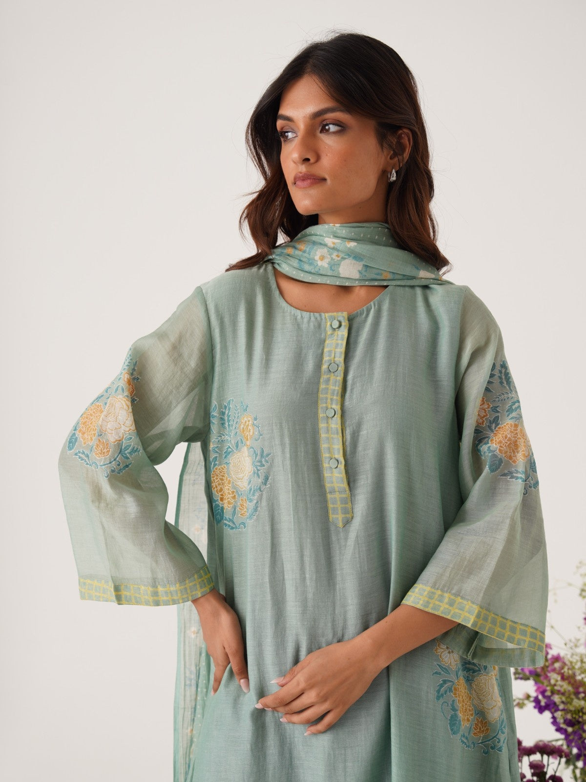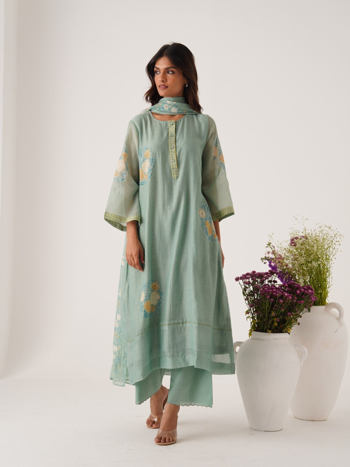 Adira powder blue hand block printed aline chanderi kurta set (set of 3)