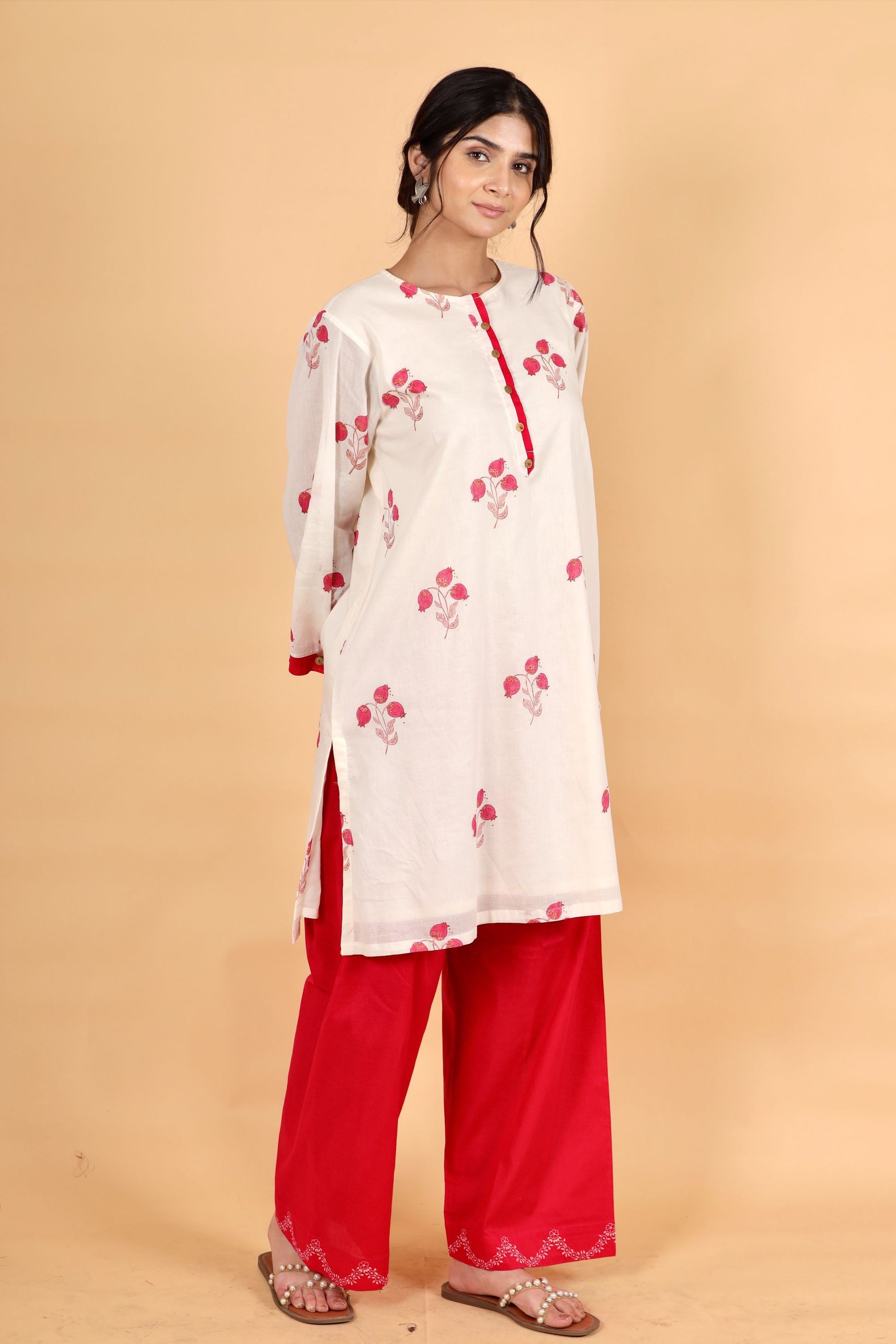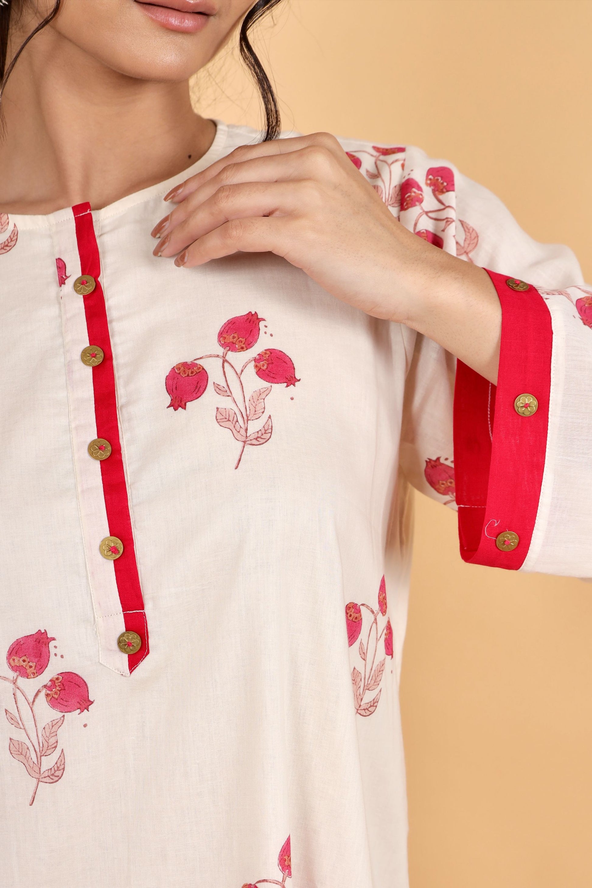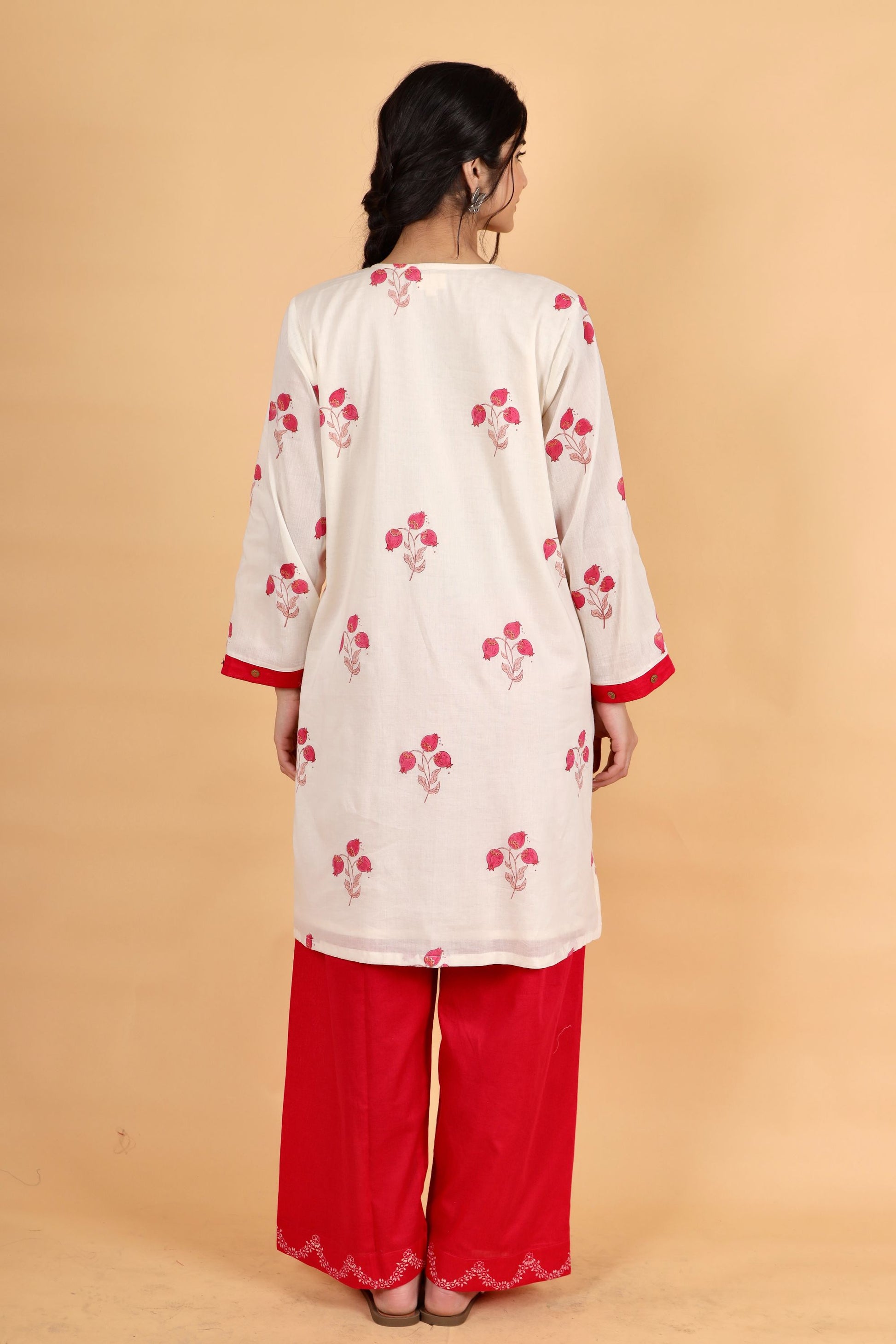 Anar ivory-fuschia hand block printed cotton short kurta set