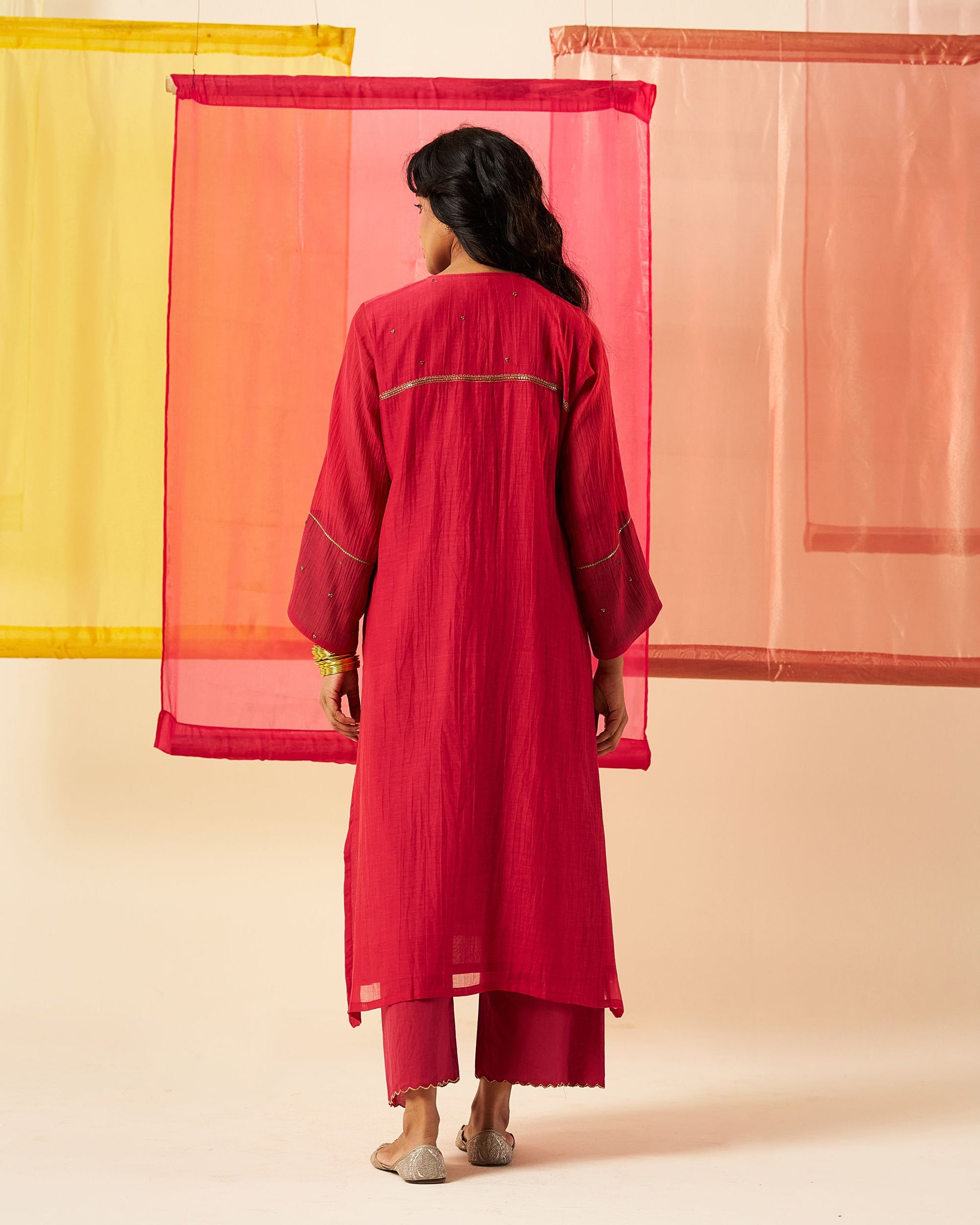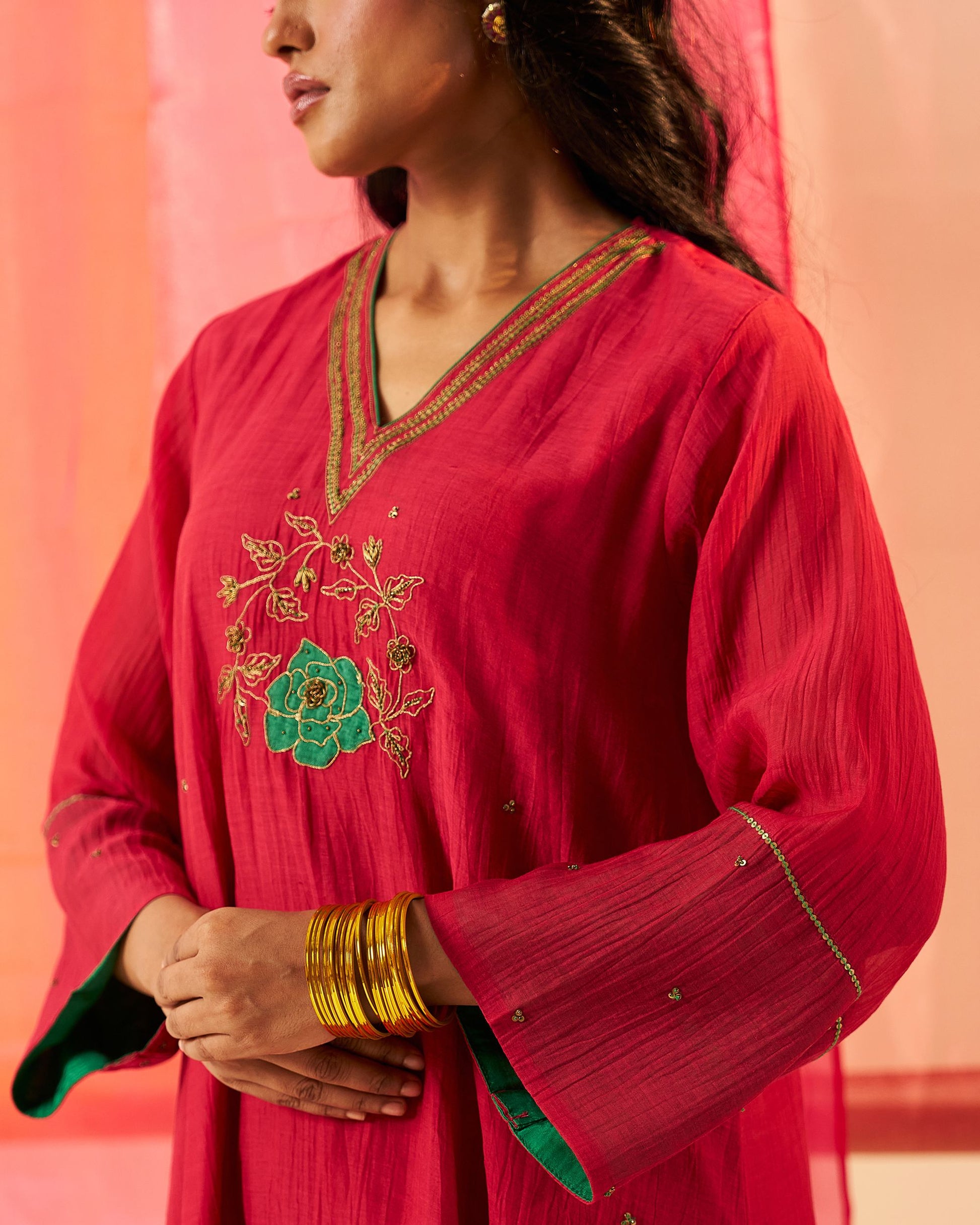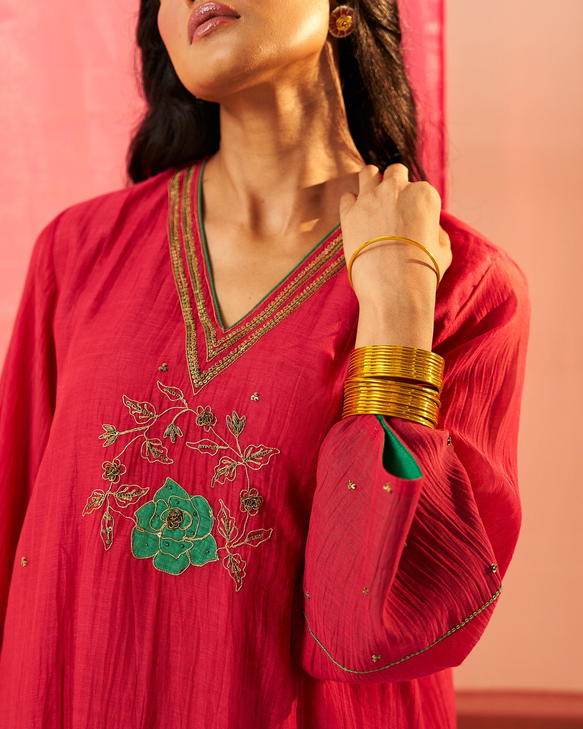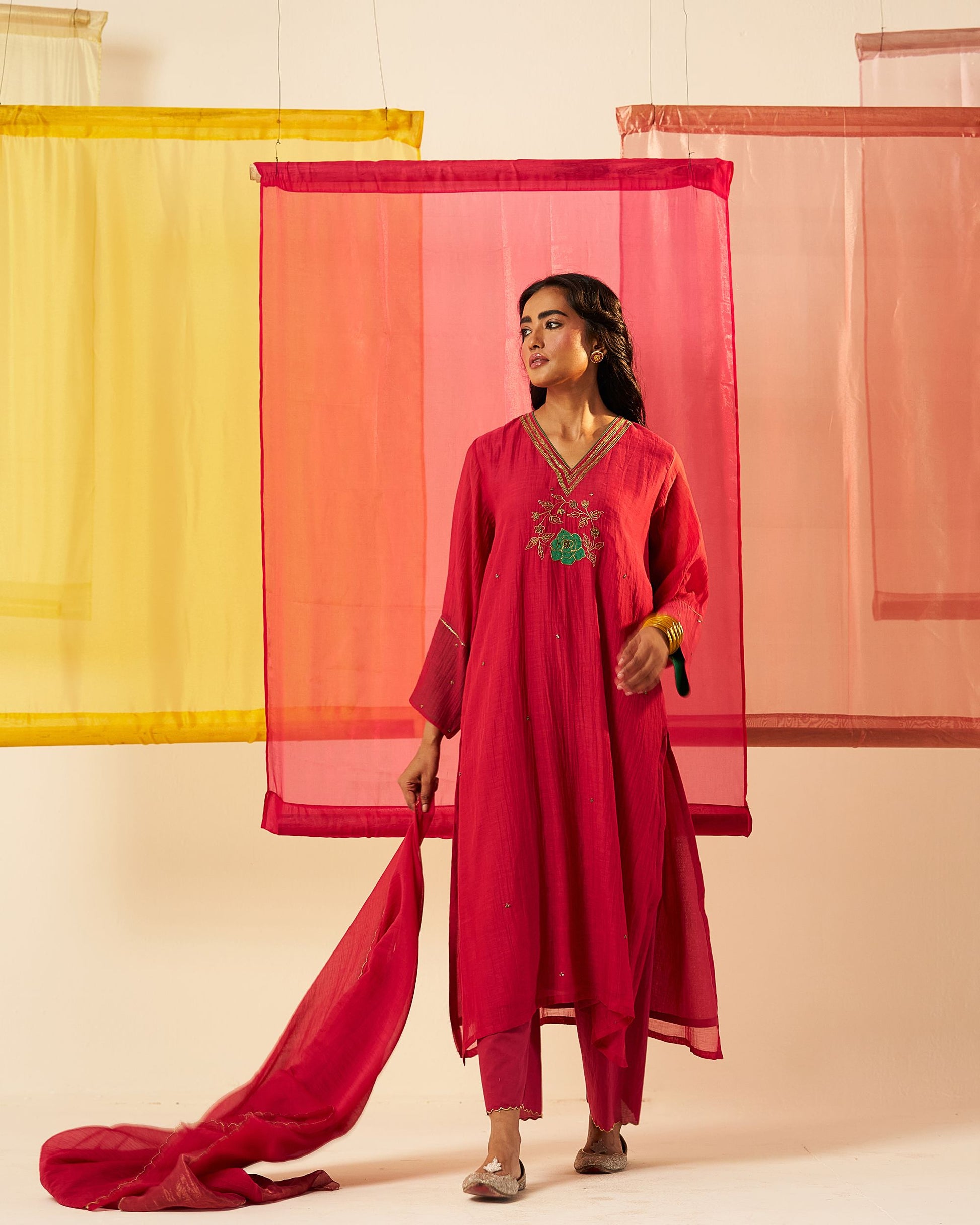 Anola fuschia applique hand embroidered chanderi kurta set.