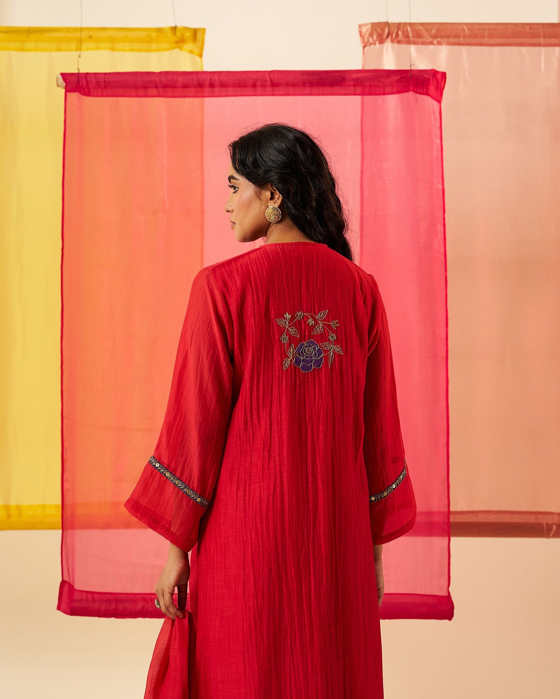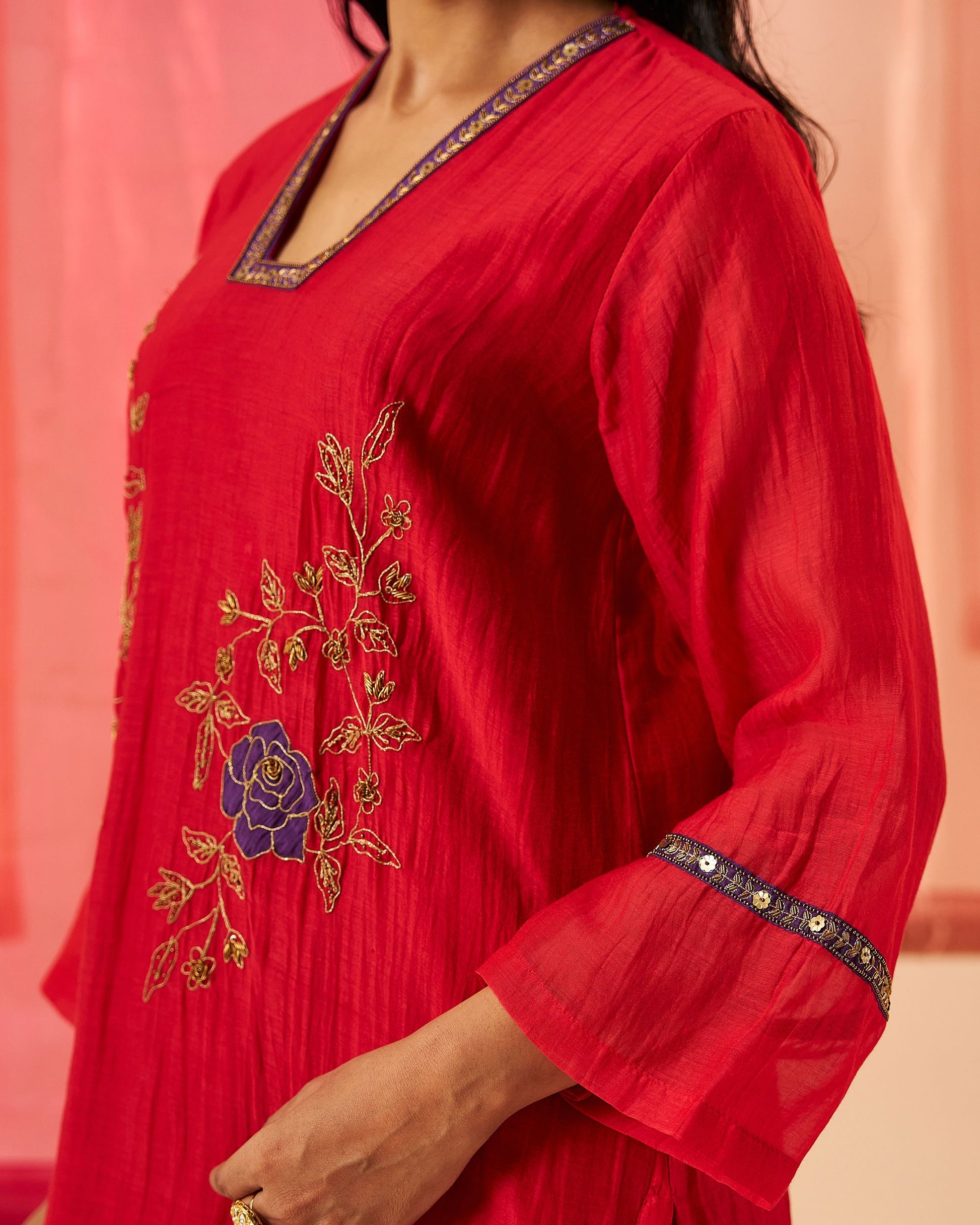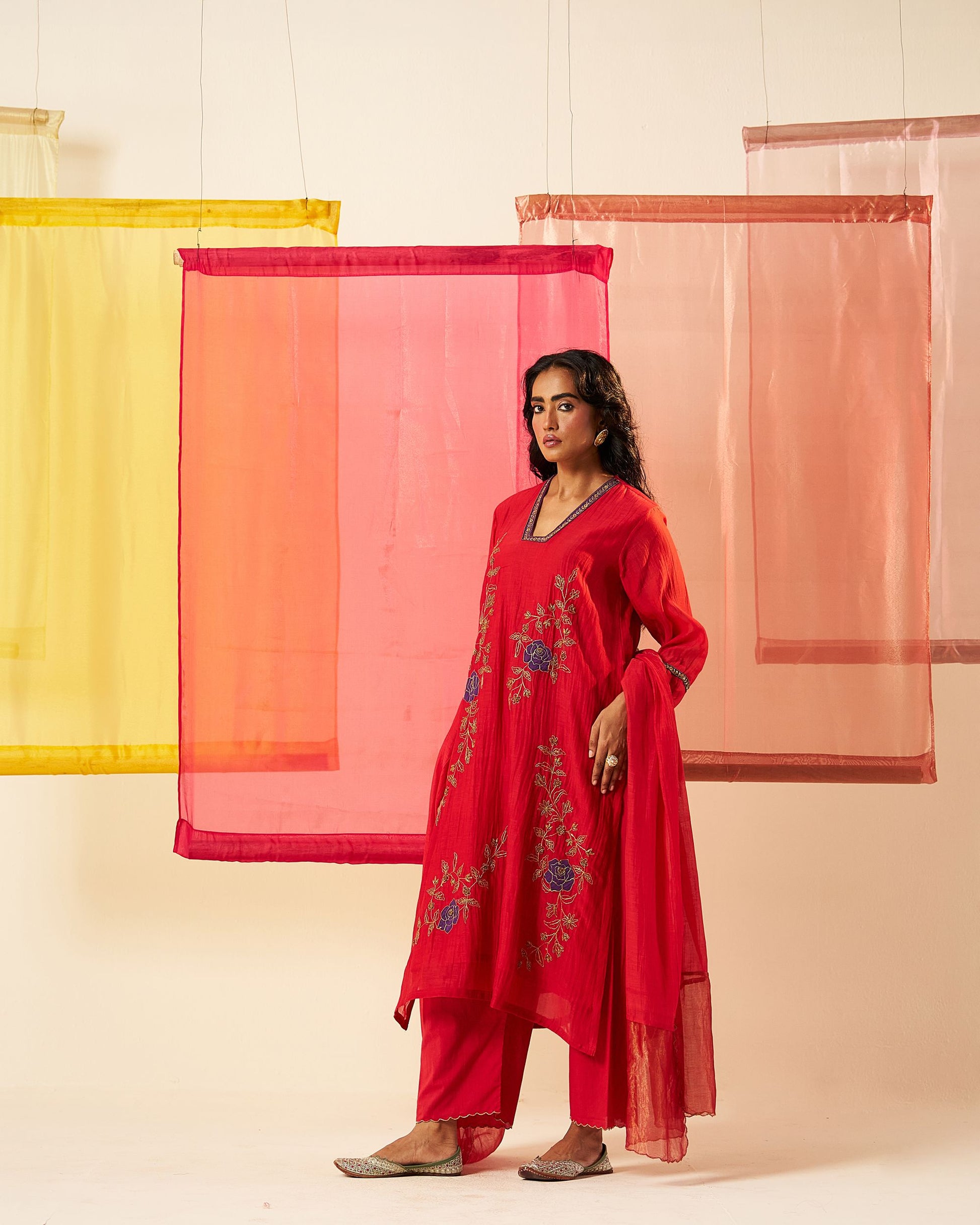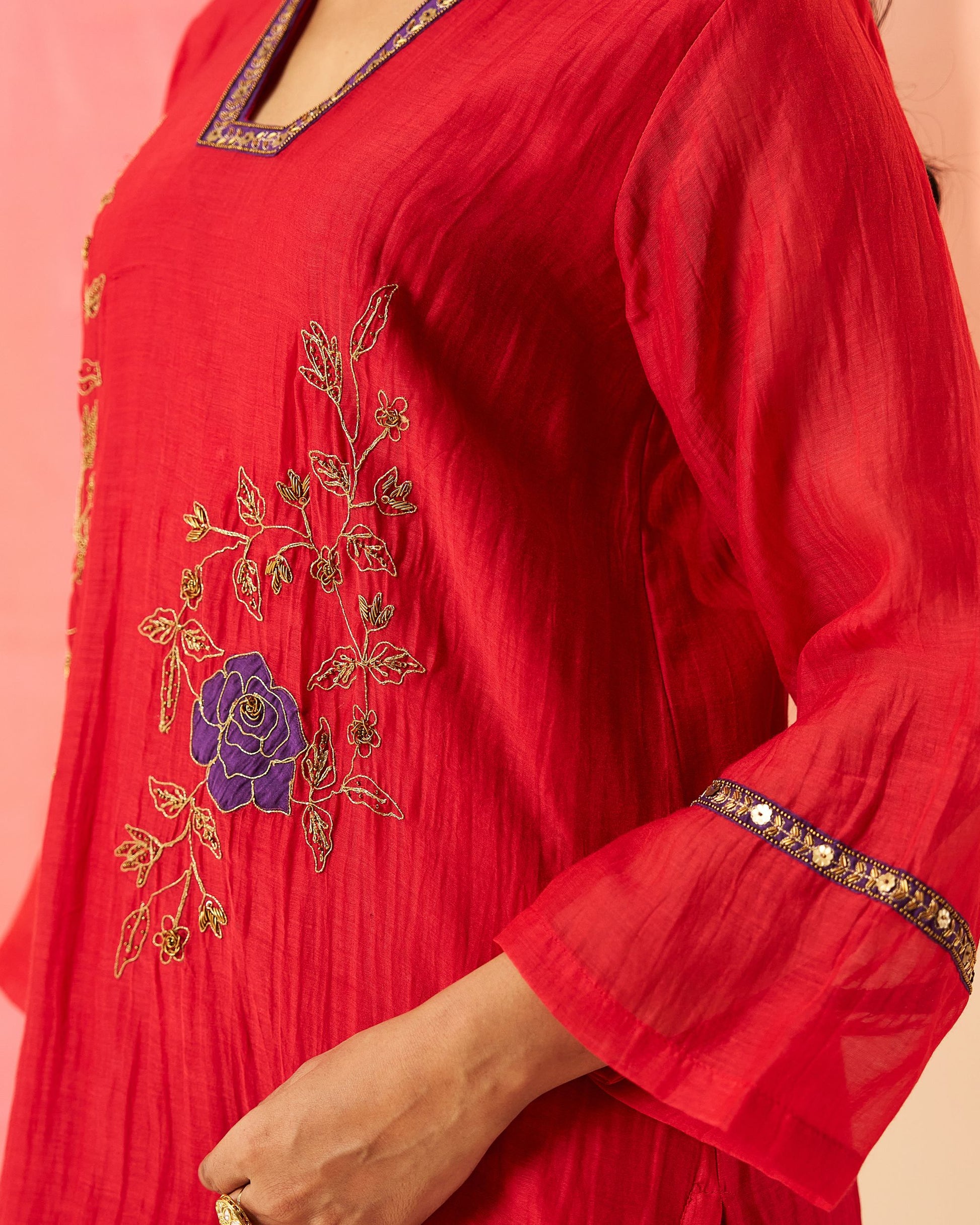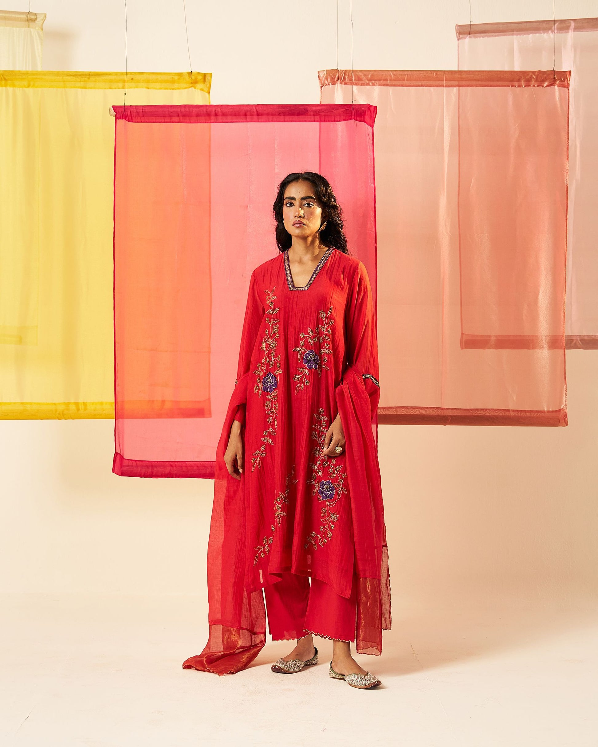 Anola store red applique dori and dabka embroidery chanderi kurta set.