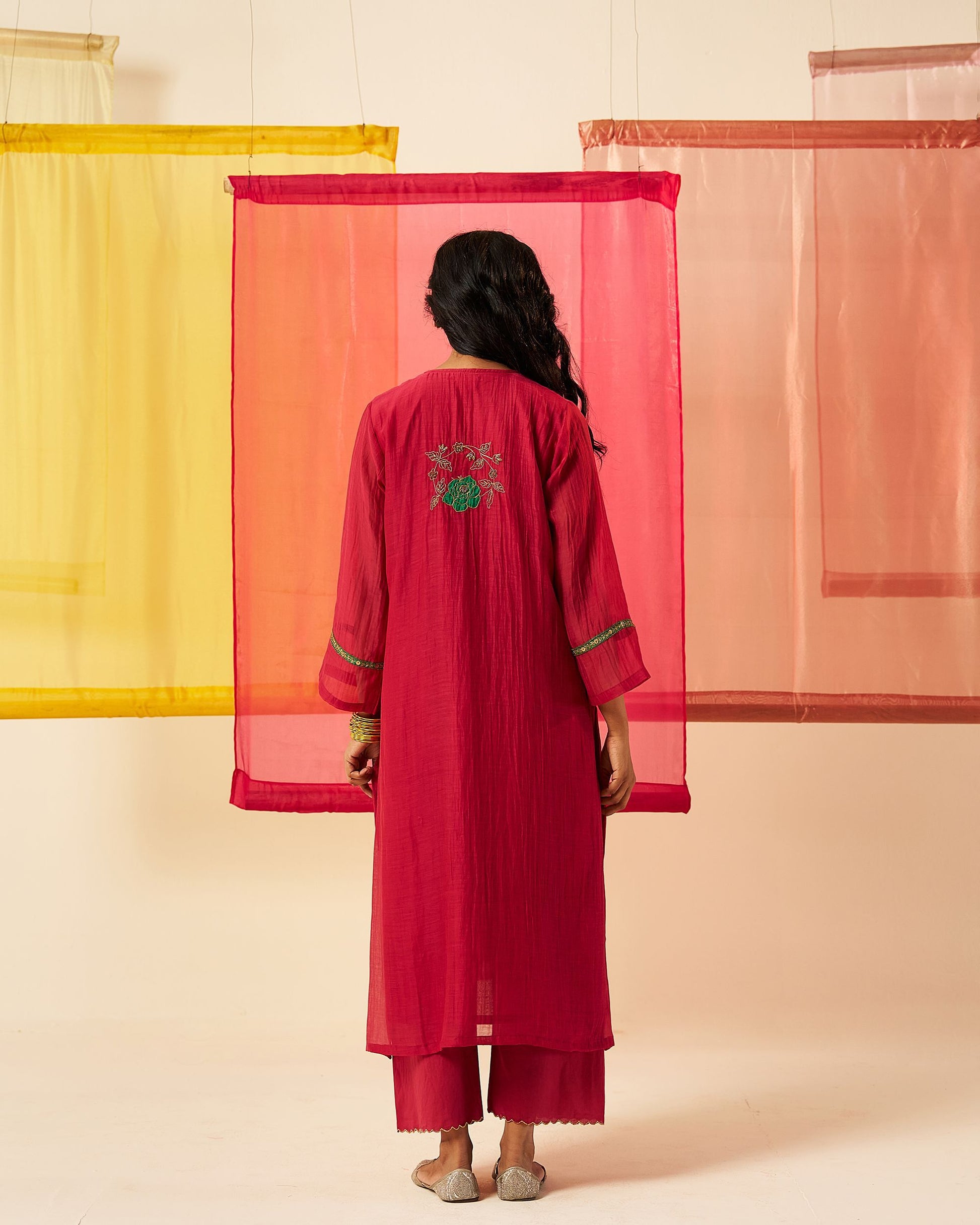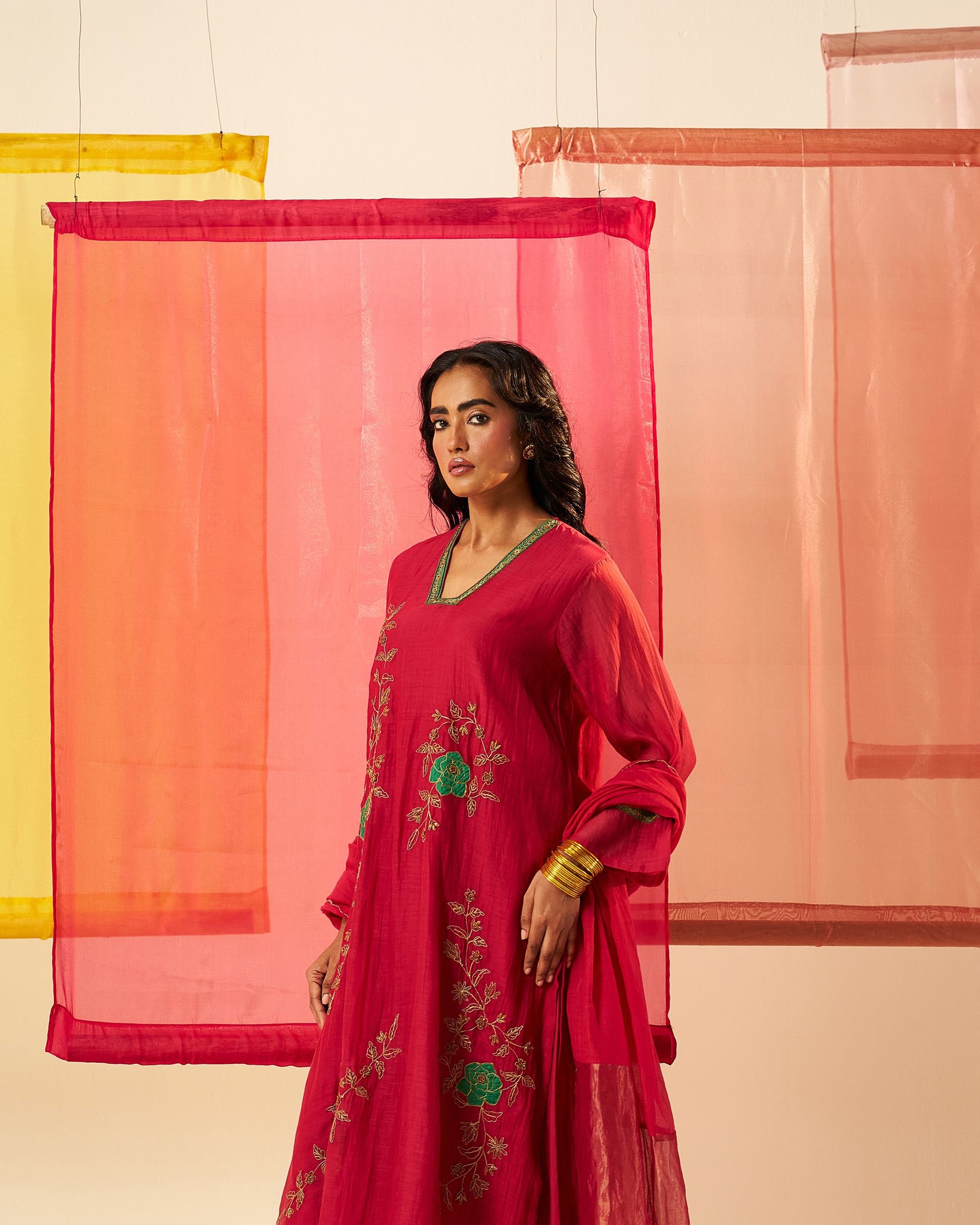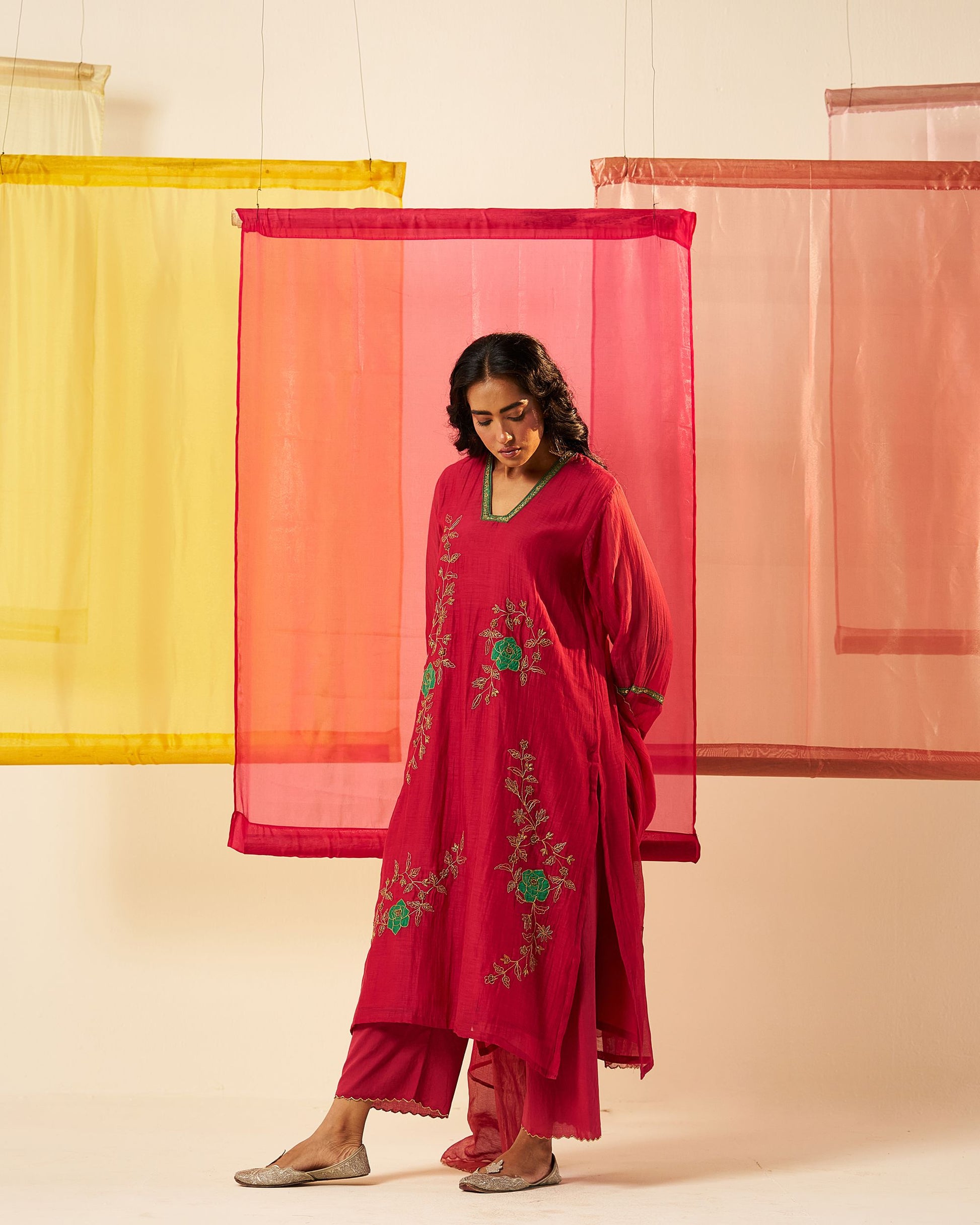 Anola store fuschia applique dori and dabka embroidery chanderi kurta set.