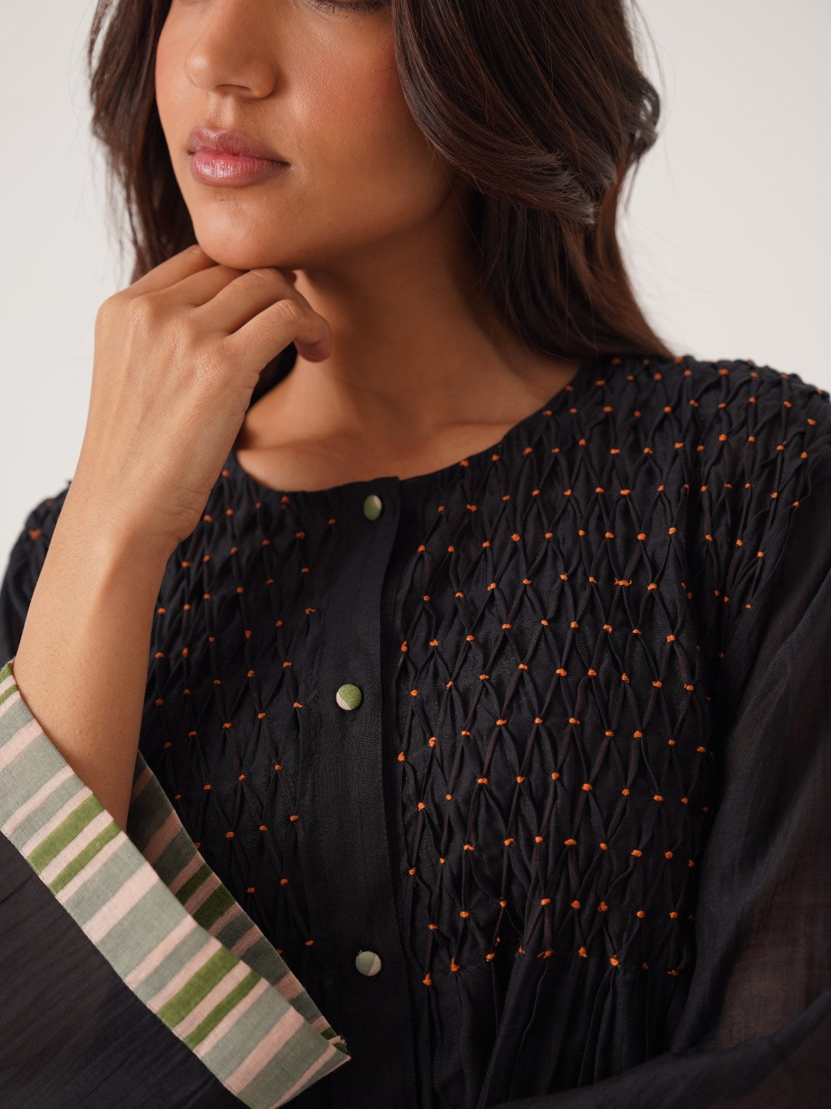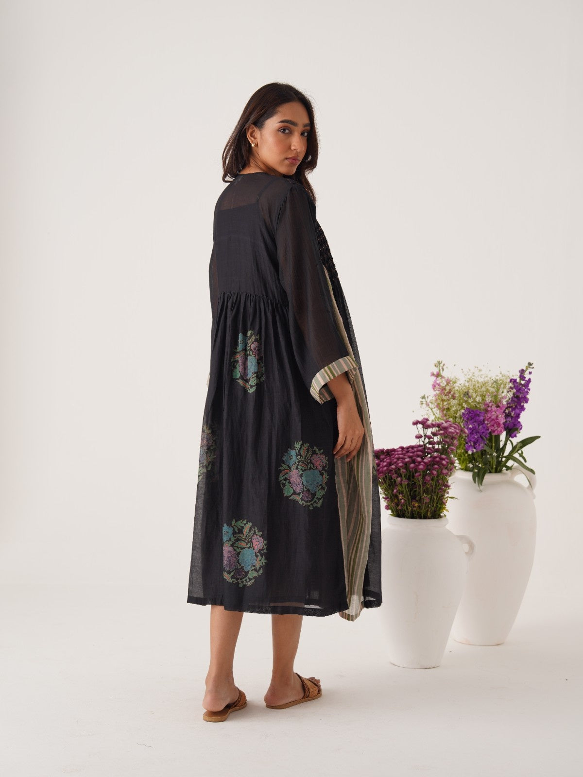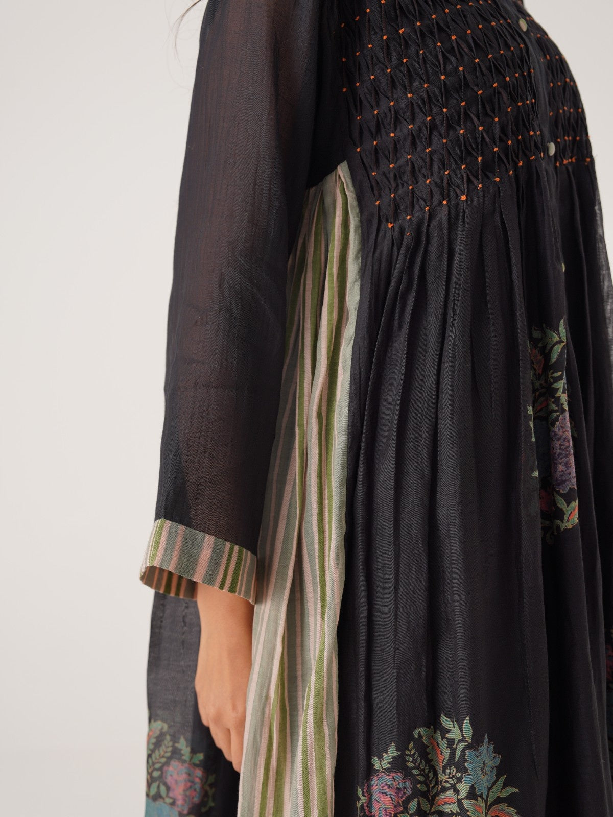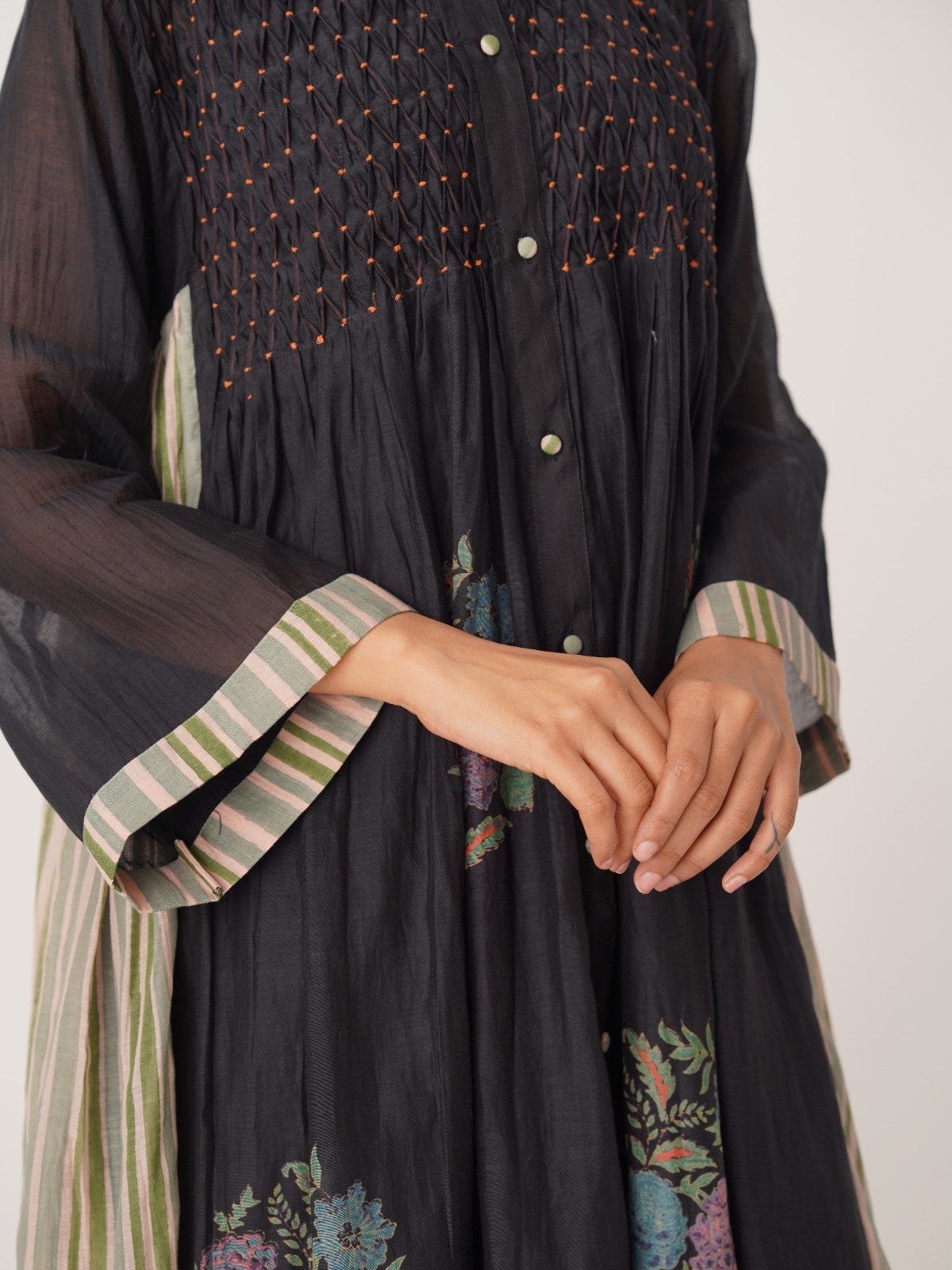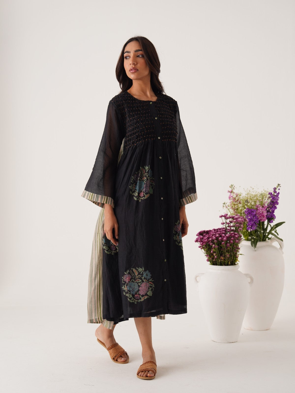 Cabana black hand smocked and block printed chanderi dress