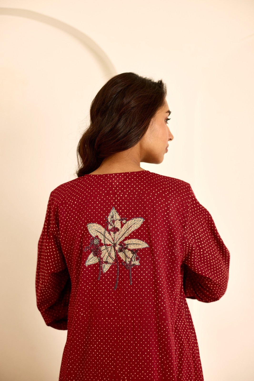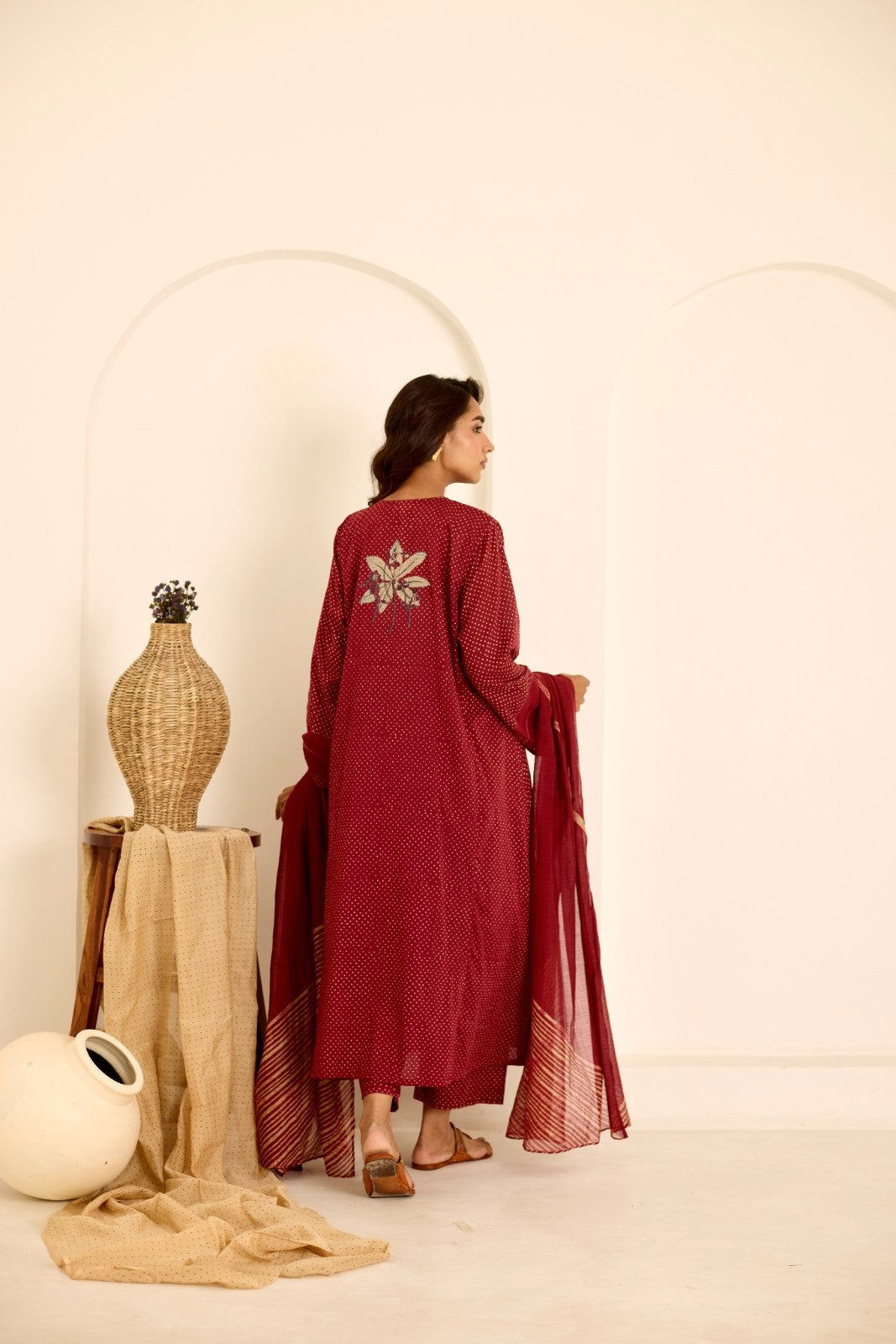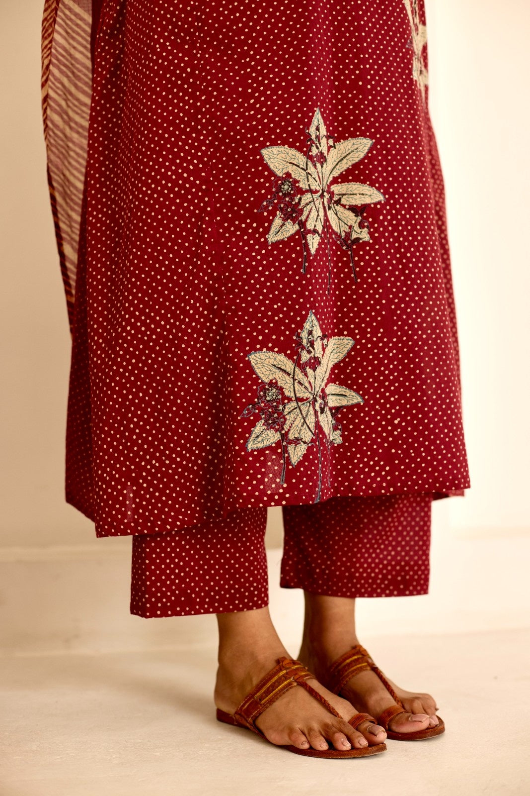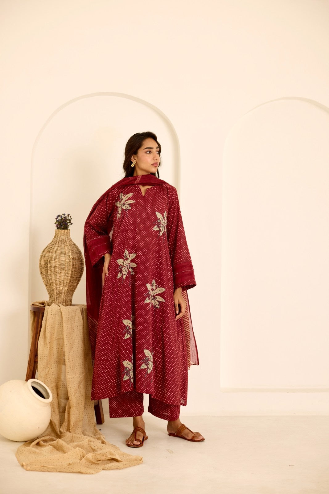 Deeya maroon hand block printed mulmul kalidar kurta set (set of 3)
