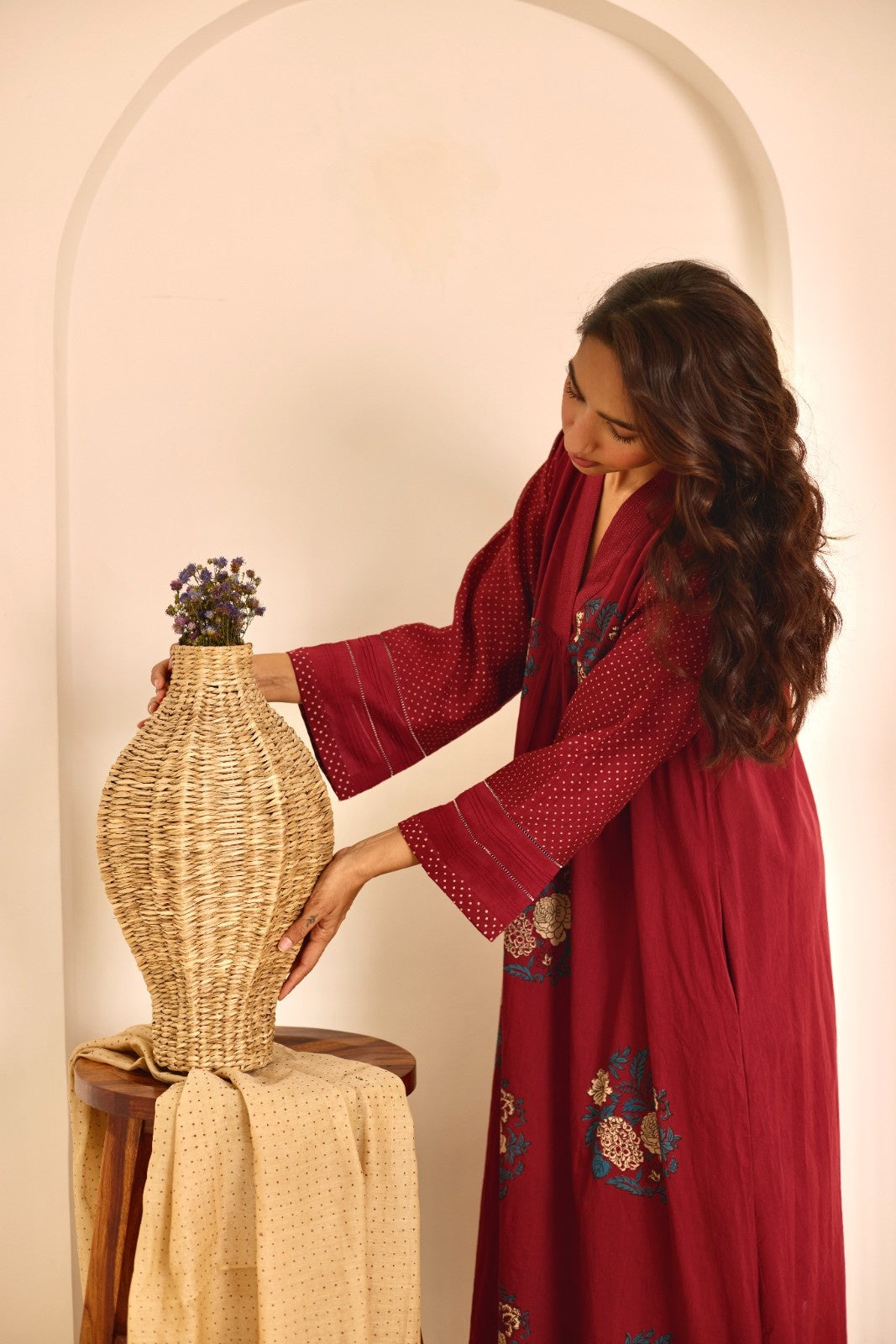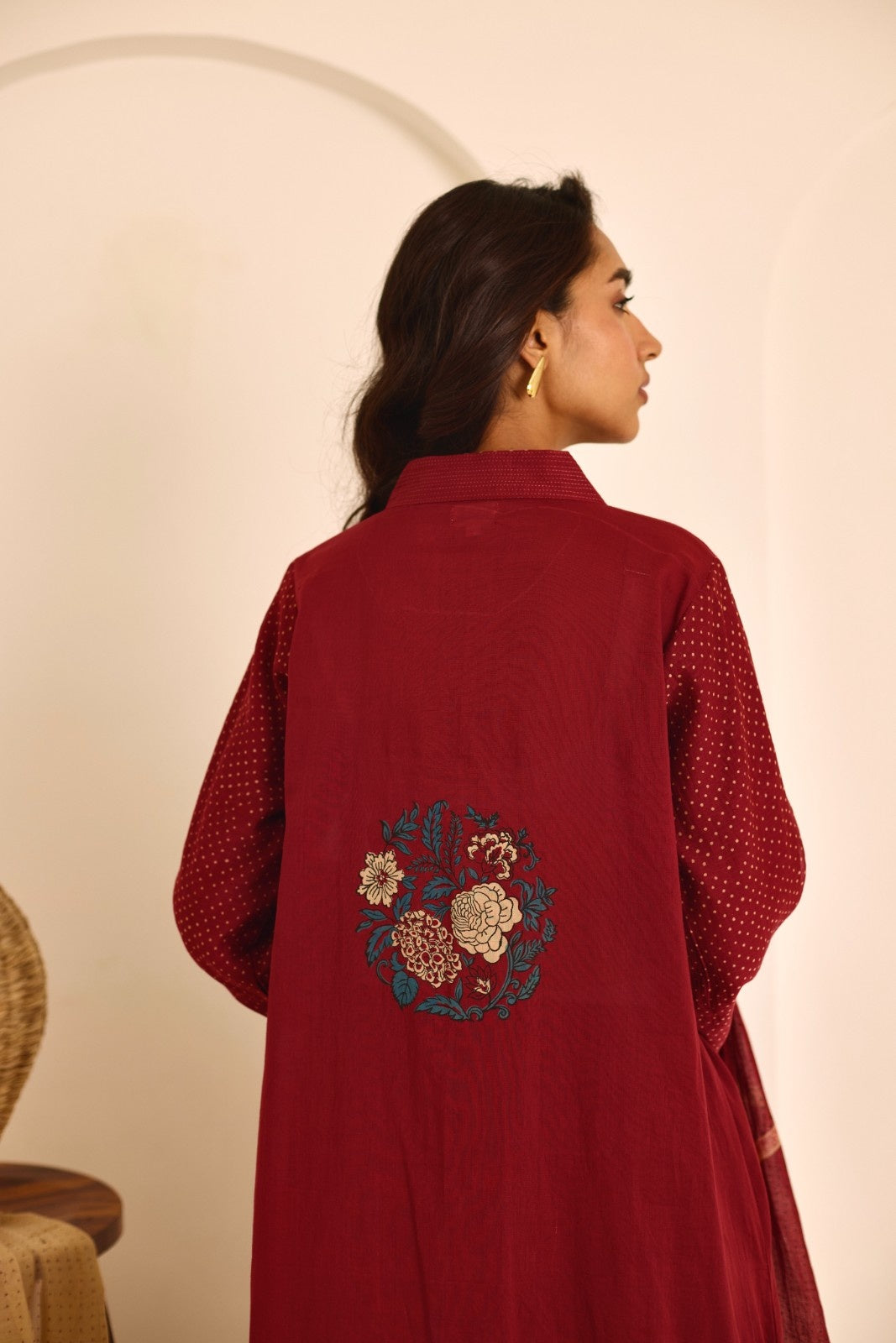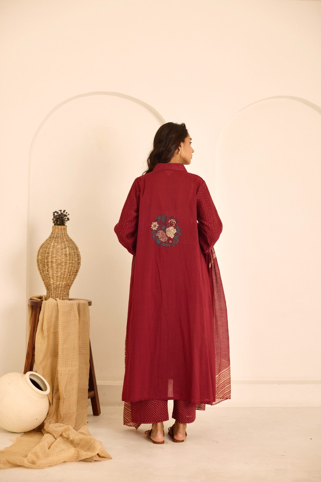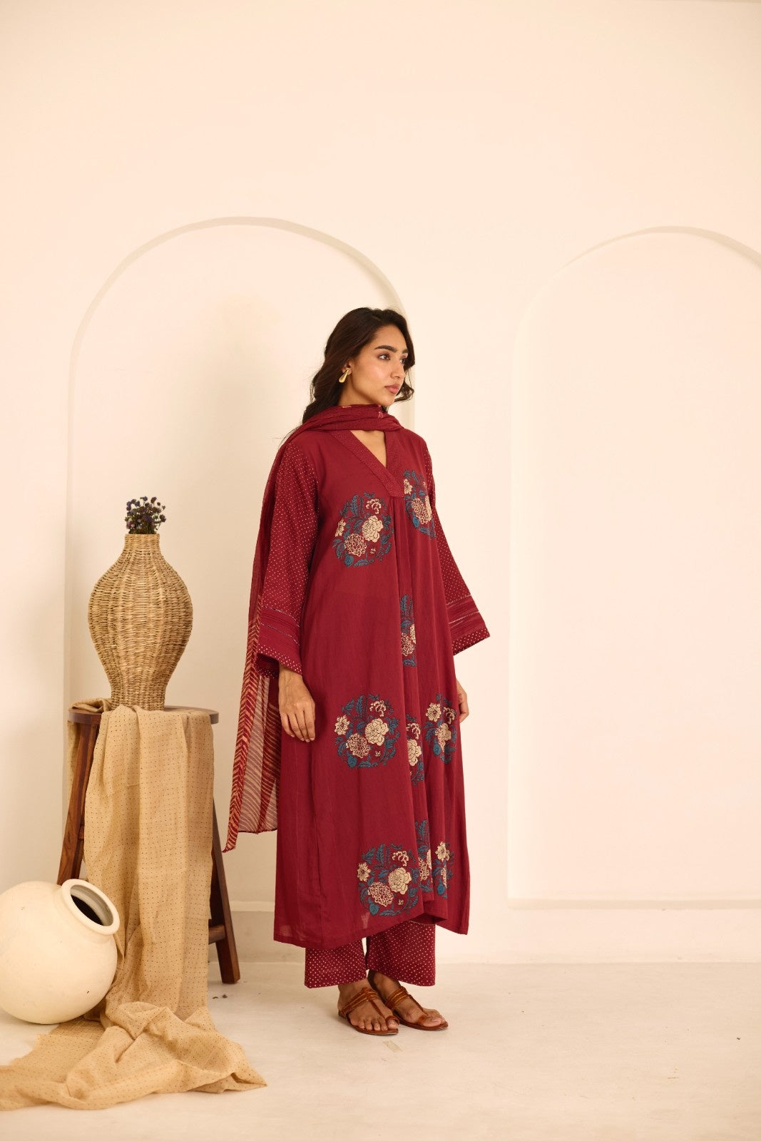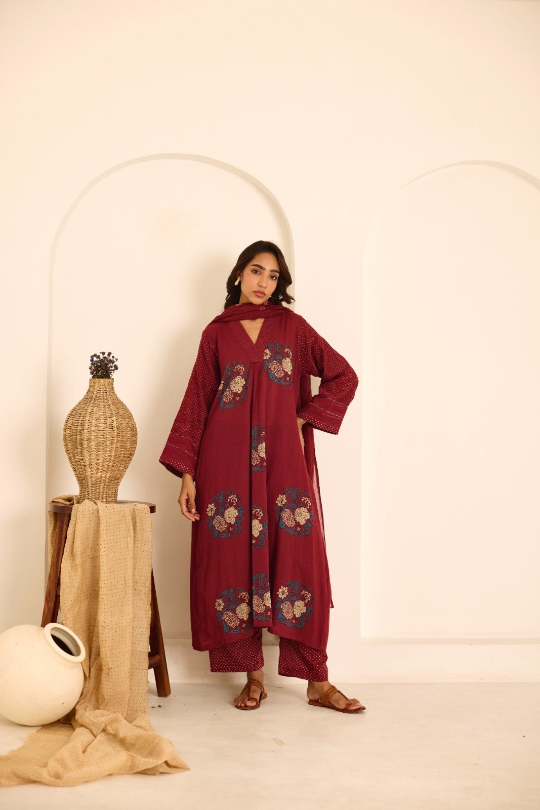 Deeya maroon hand block printed mulmul kurta set (set of 3)