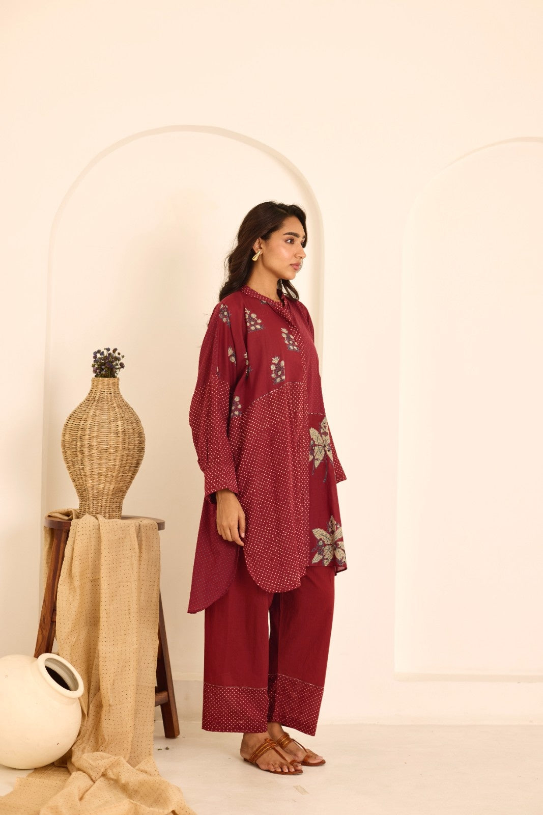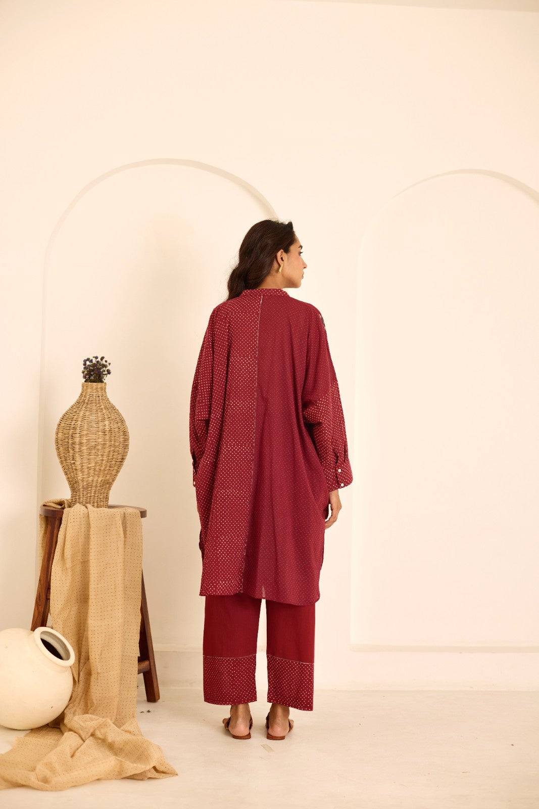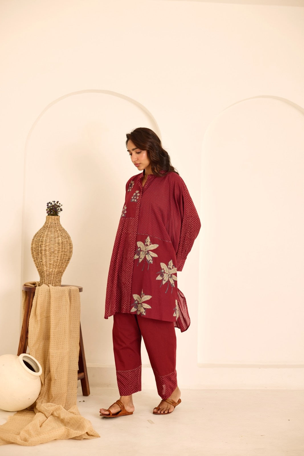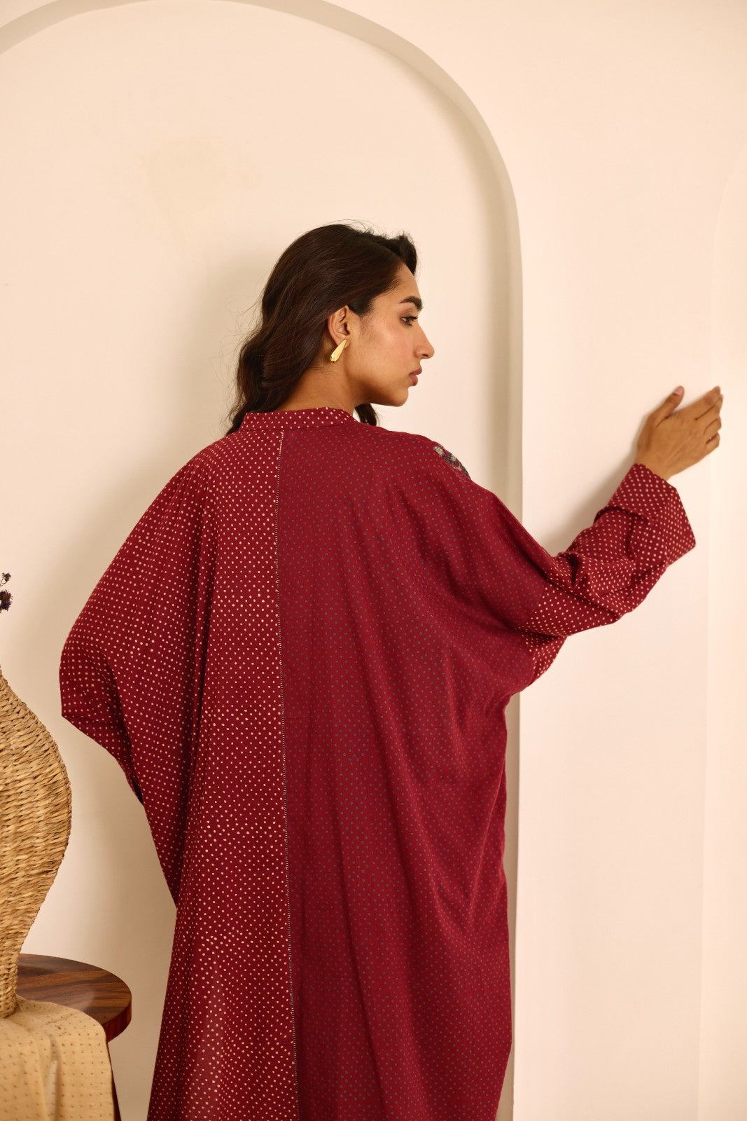 Deeya maroon hand block printed with jaali work mulmul kaftan (Pants separate)