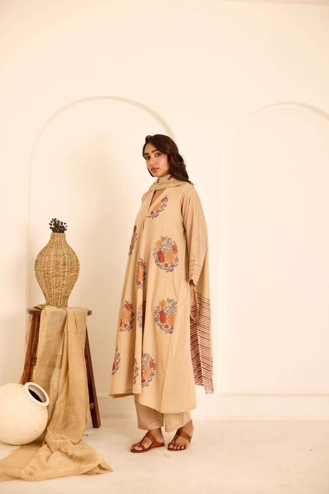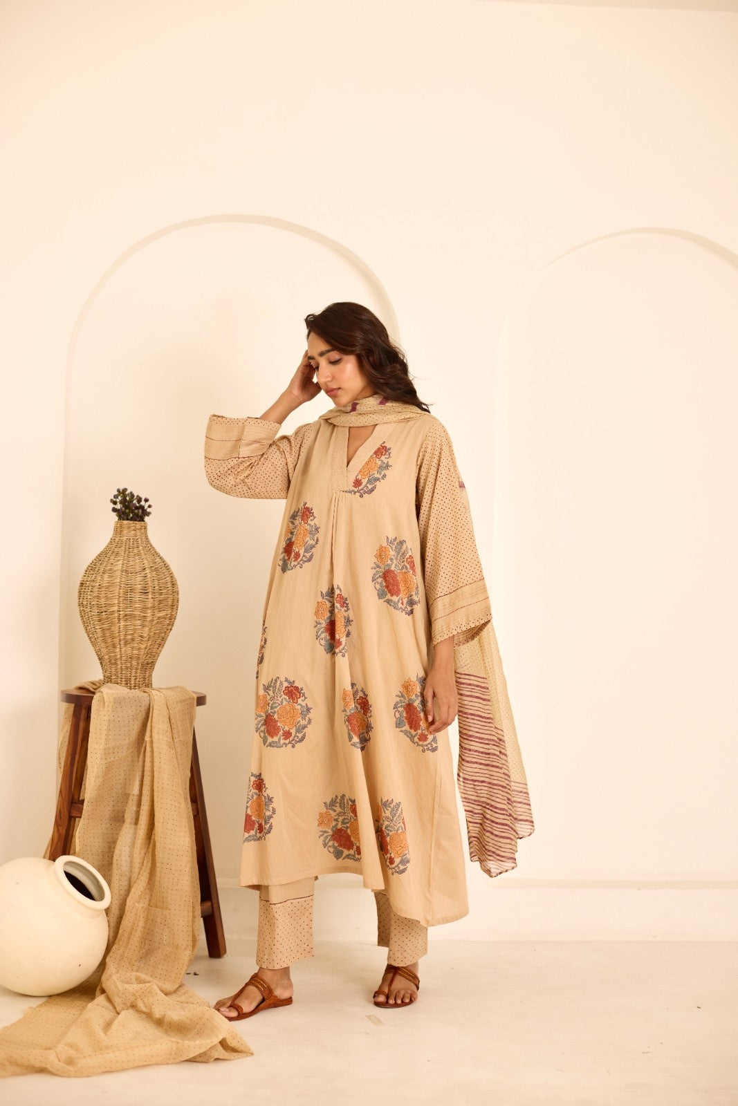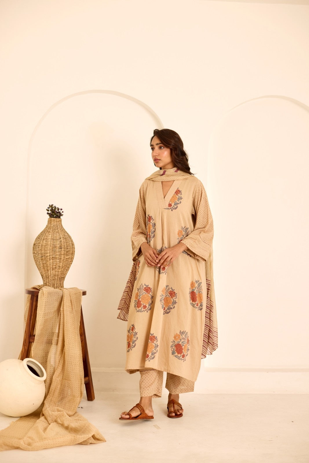 Deeya tea hand block printed mulmul kurta set (set of 3)
