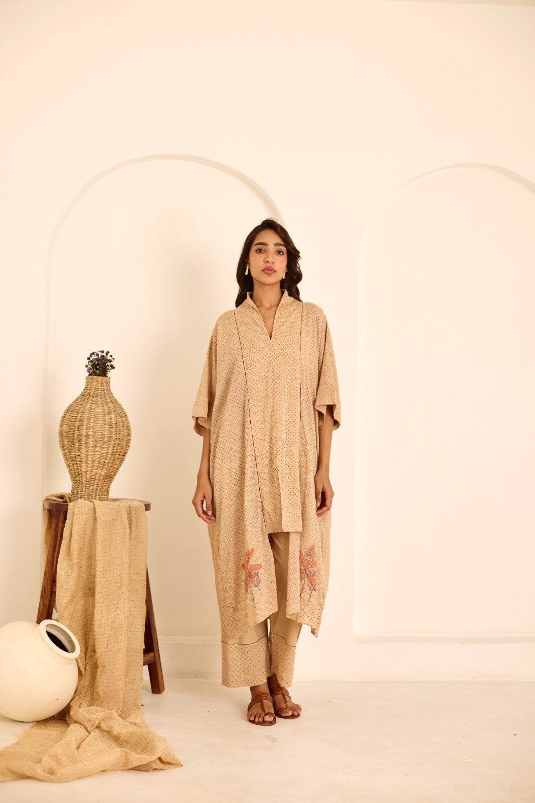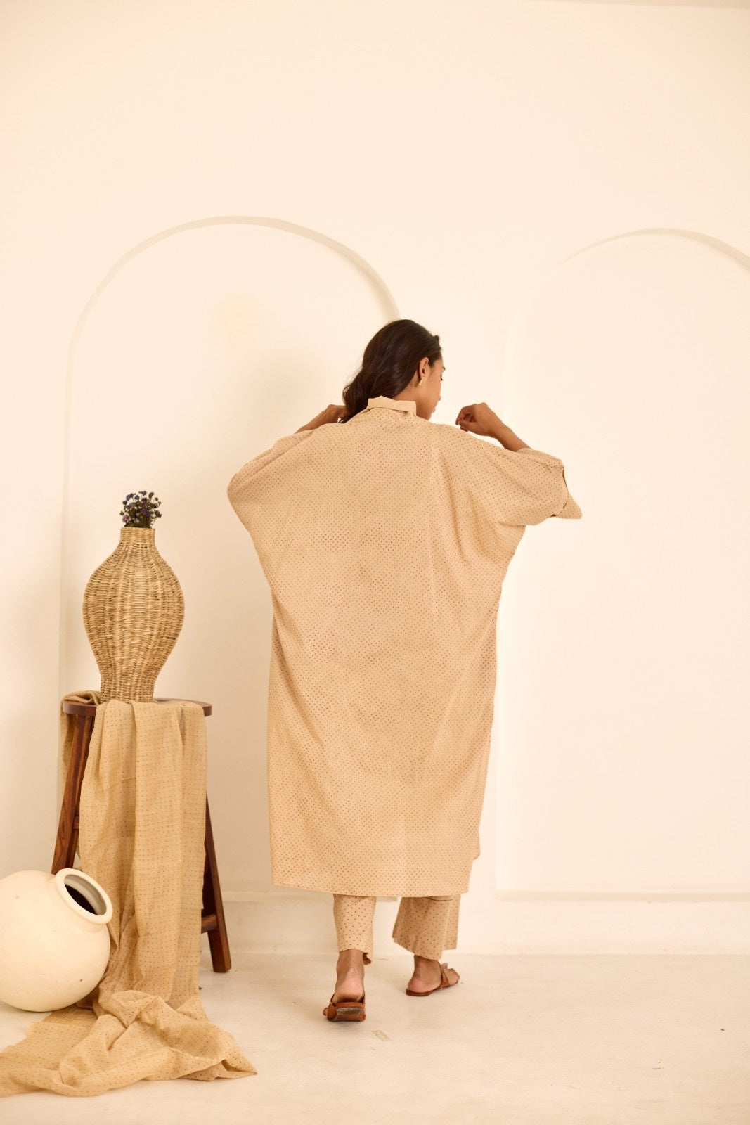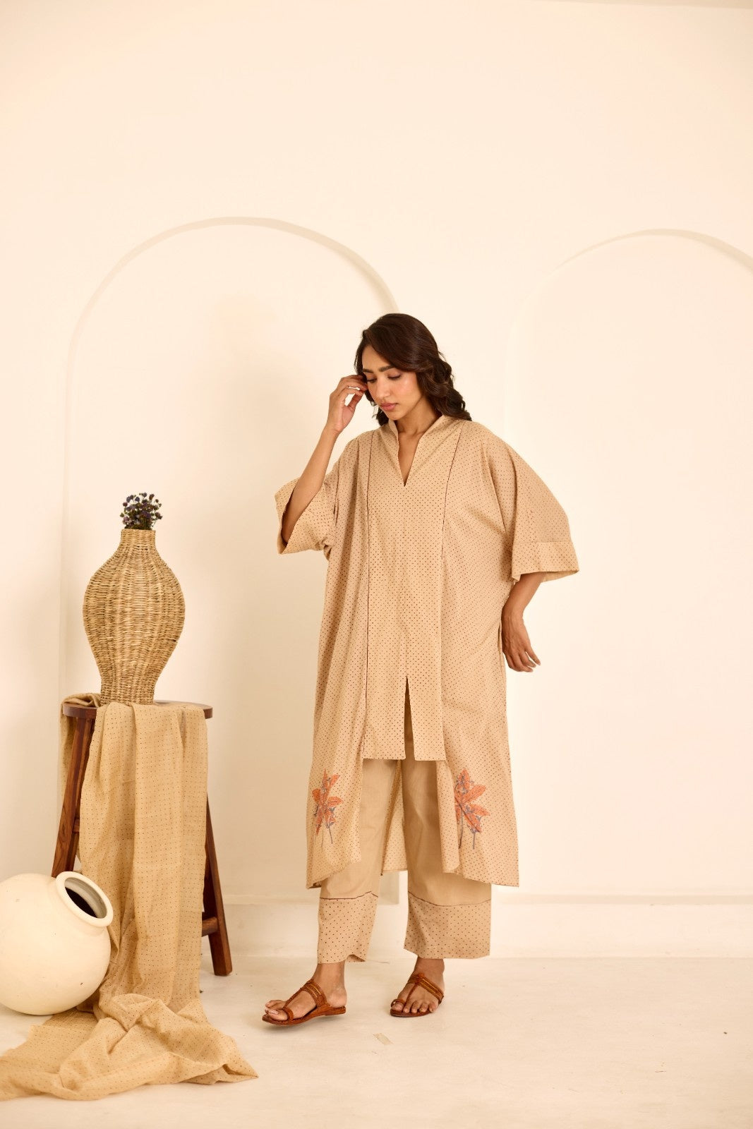 Deeya tea hand block printed with jaali embroidery mulmul kaftan (Pants separate)