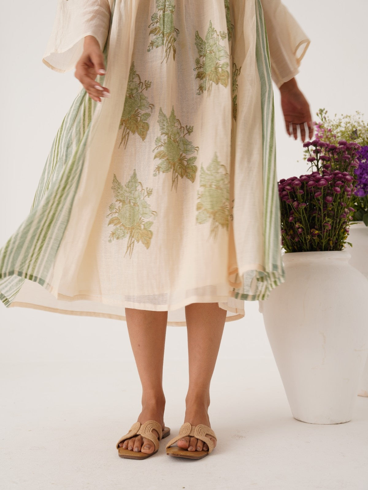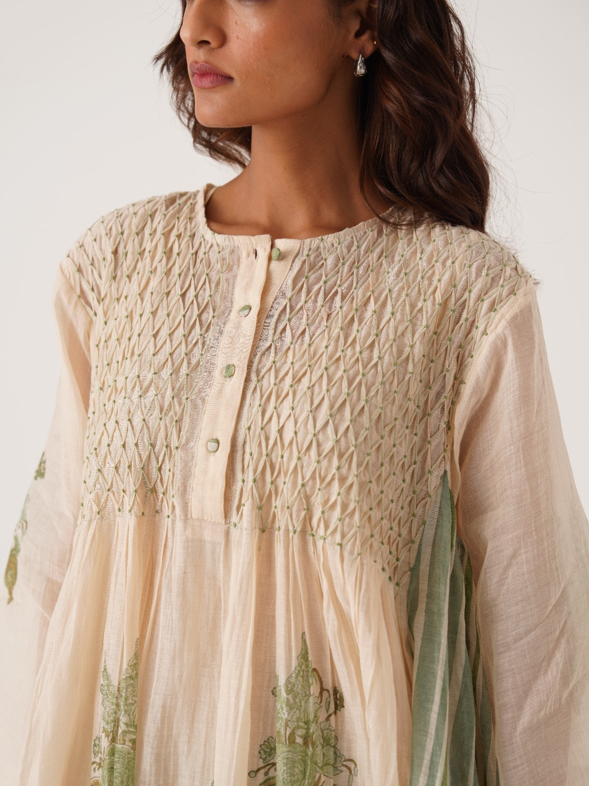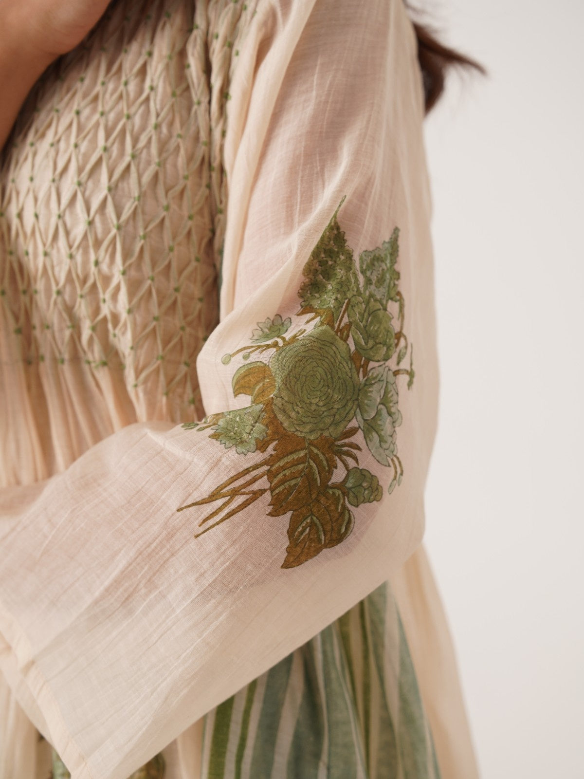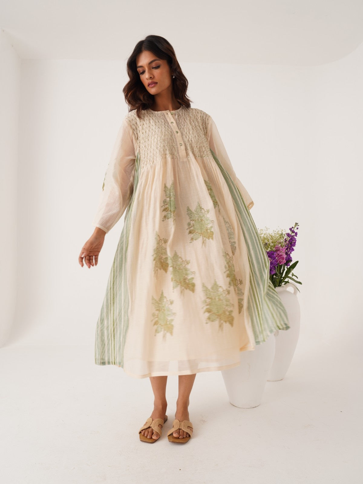 Gul ivory-celedon hand smocked and block printed chanderi dress