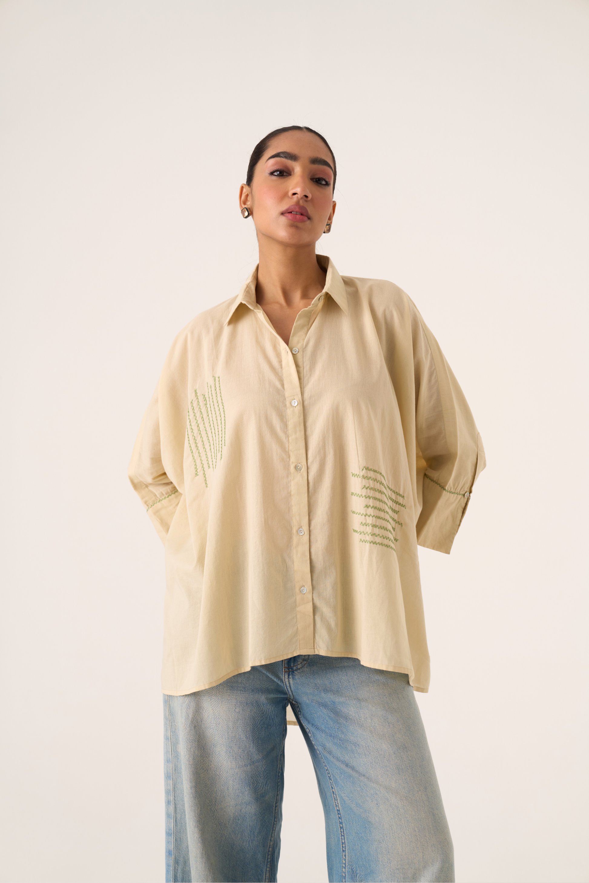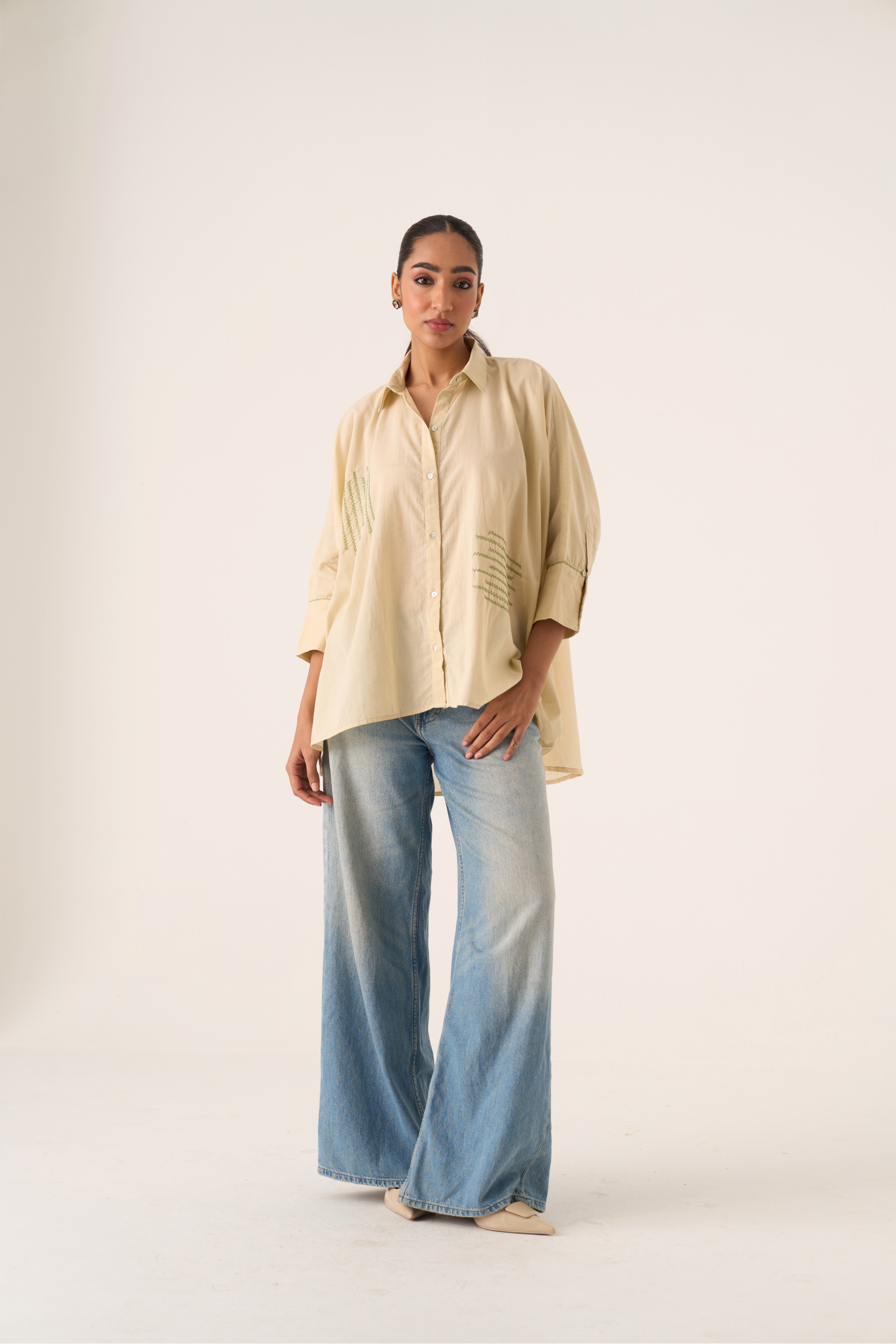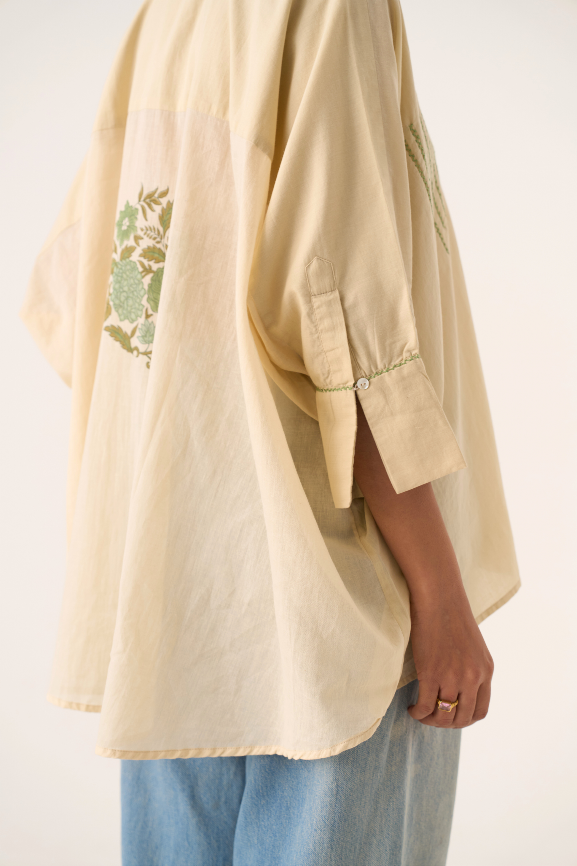Gul ivory-celedon hand thread embroidered cotton kaftan shirt