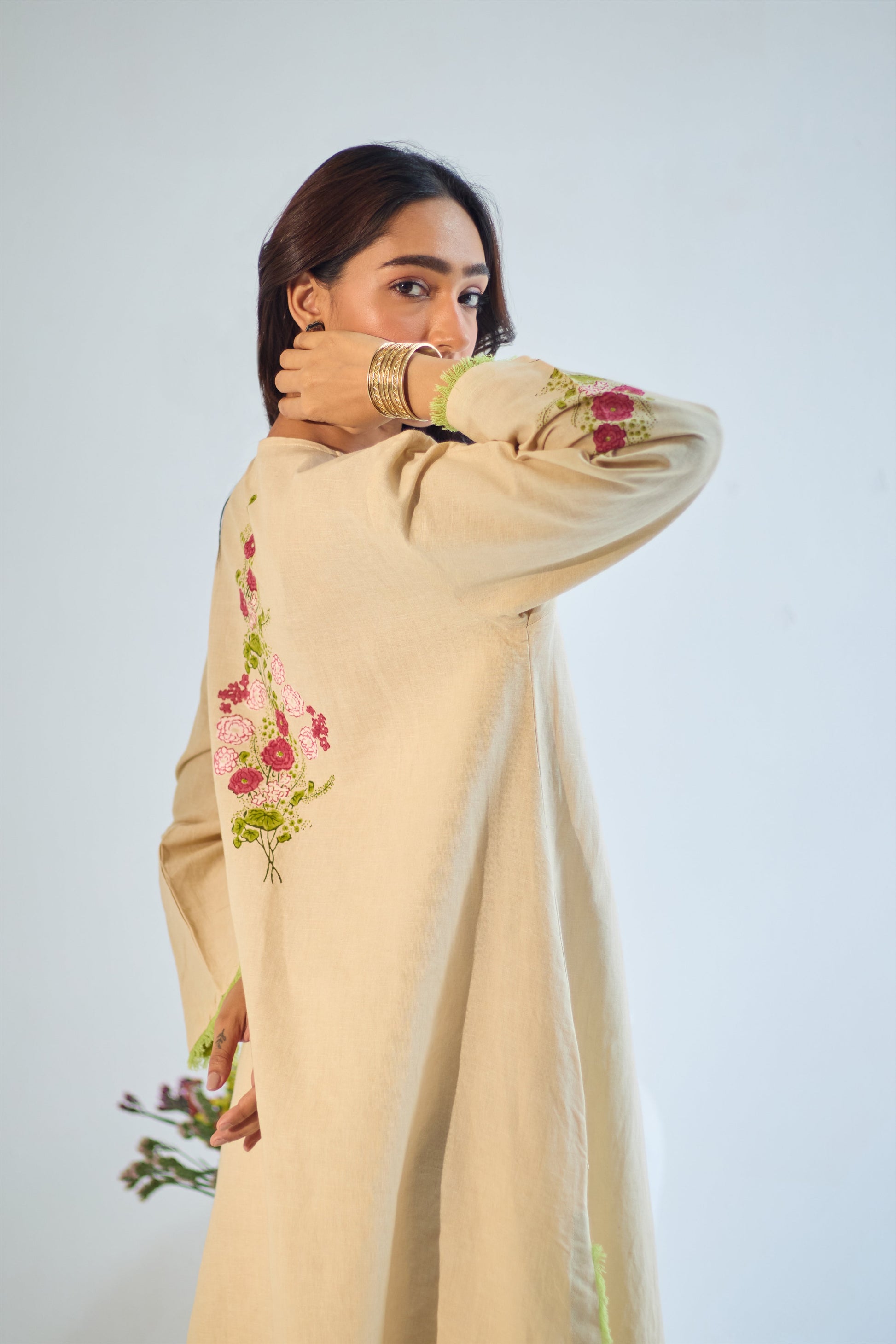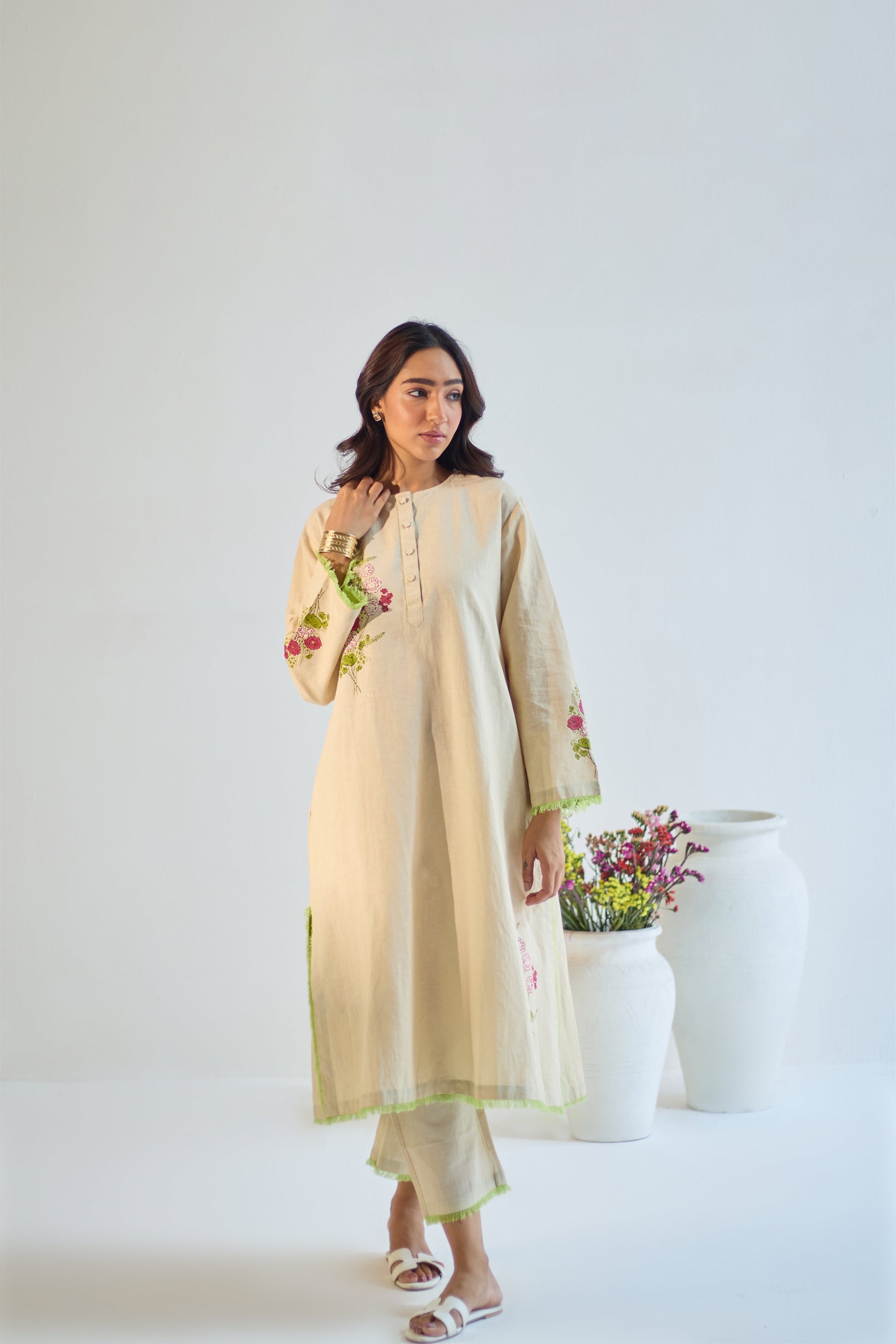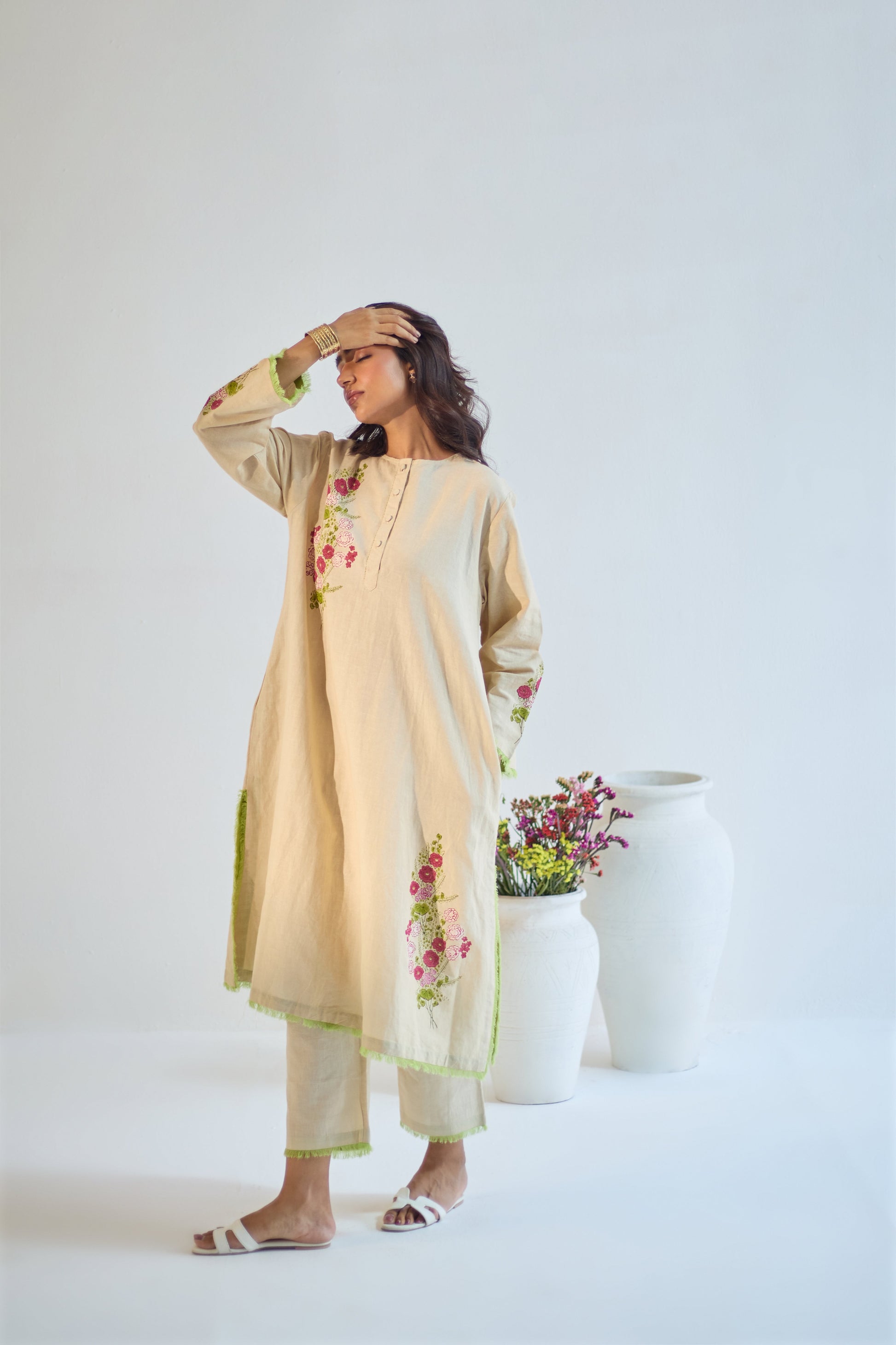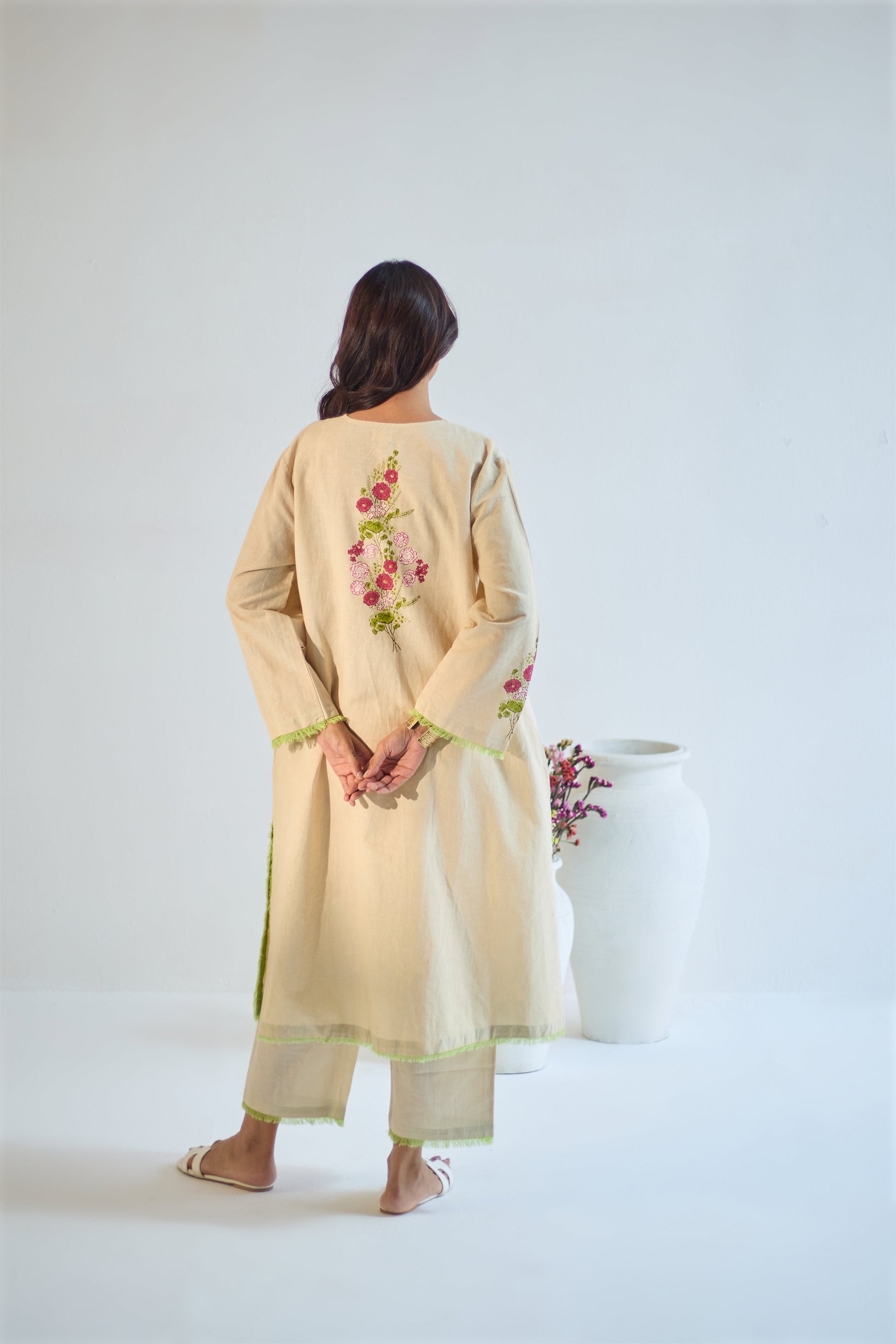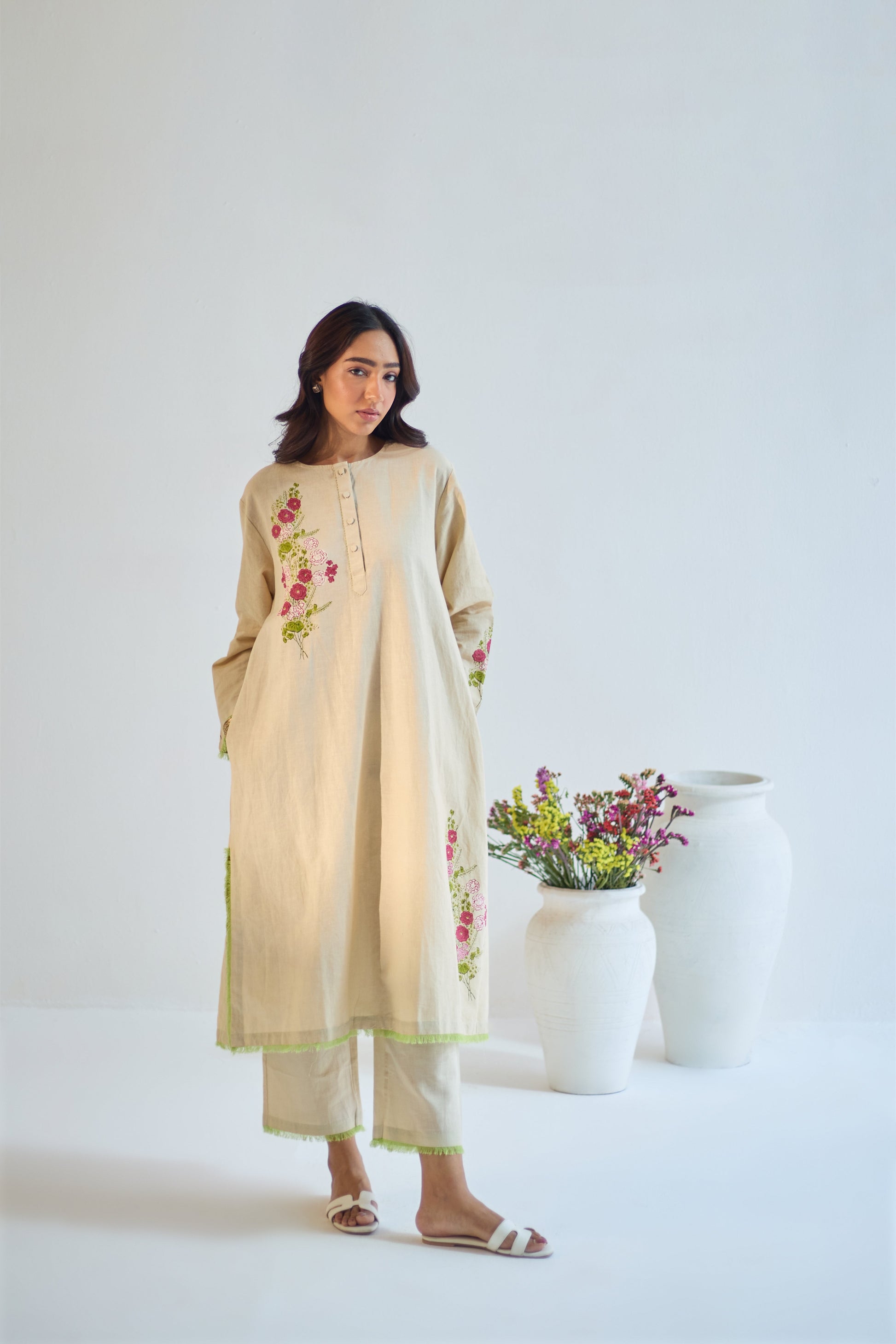 Gulaab beige green hand block printed linen kurta set (set of 2)