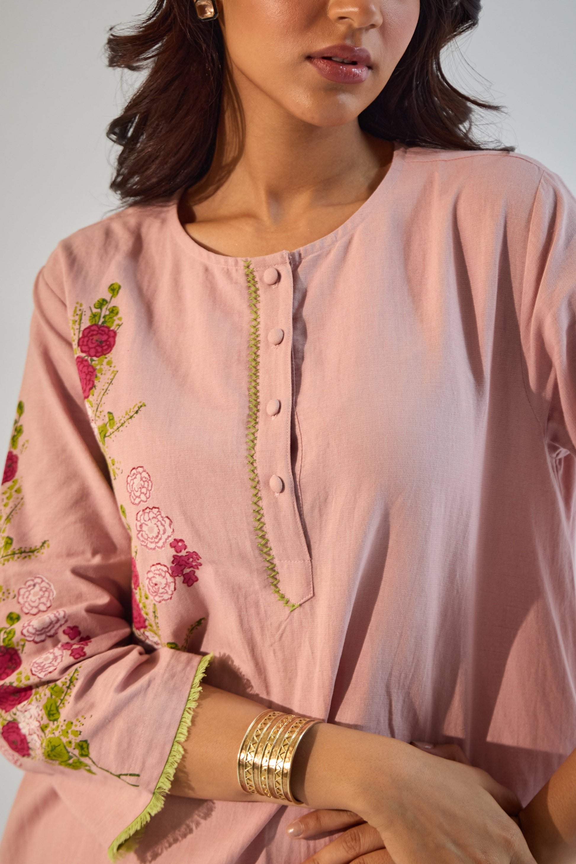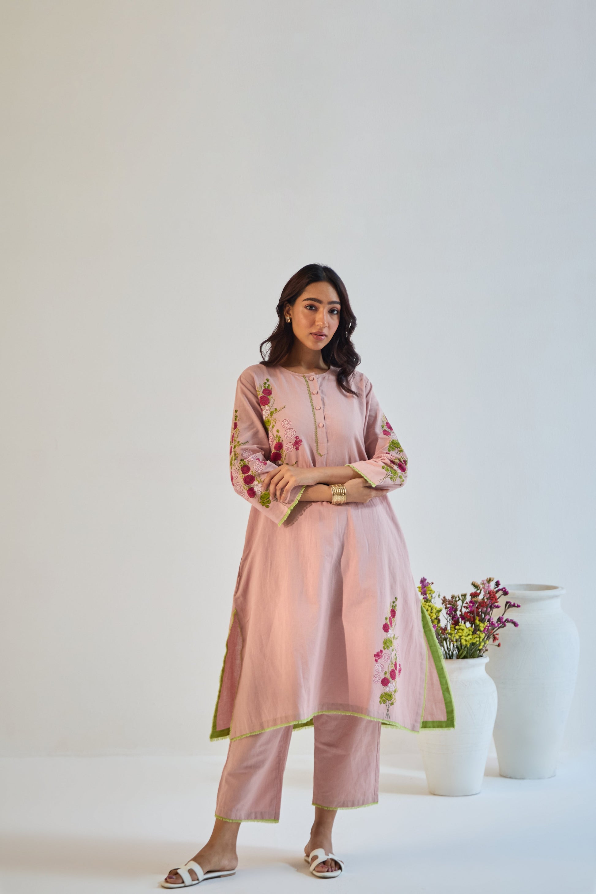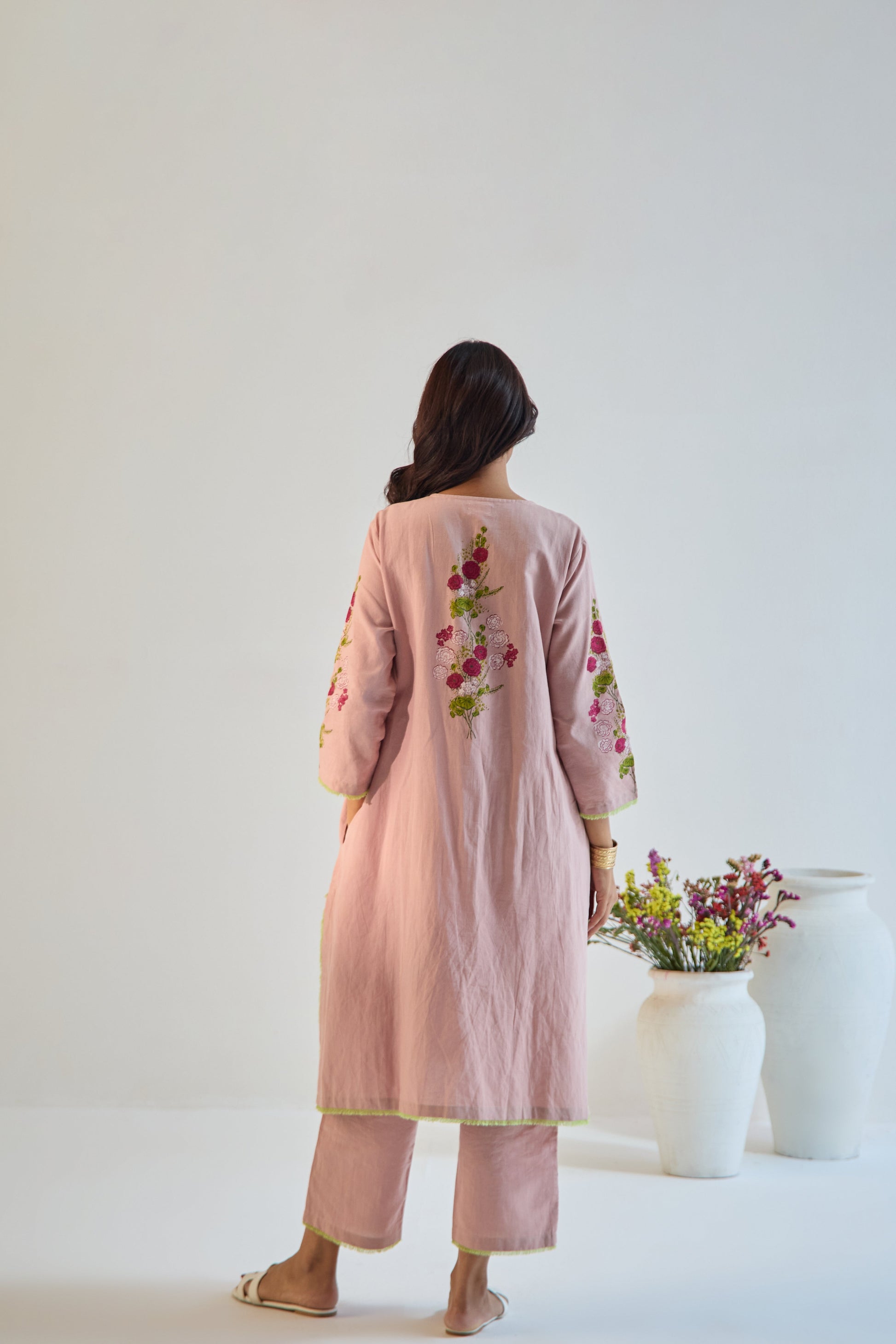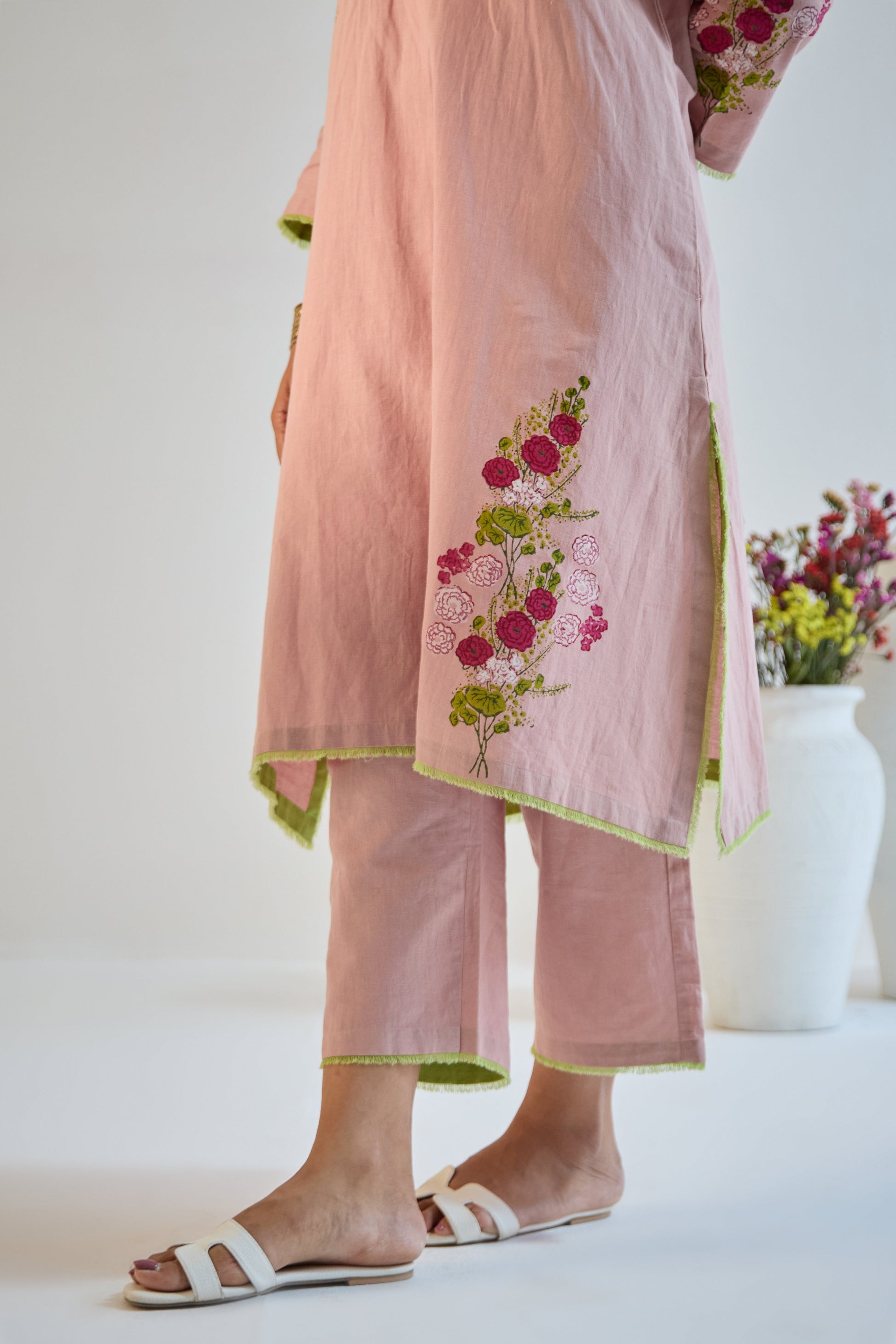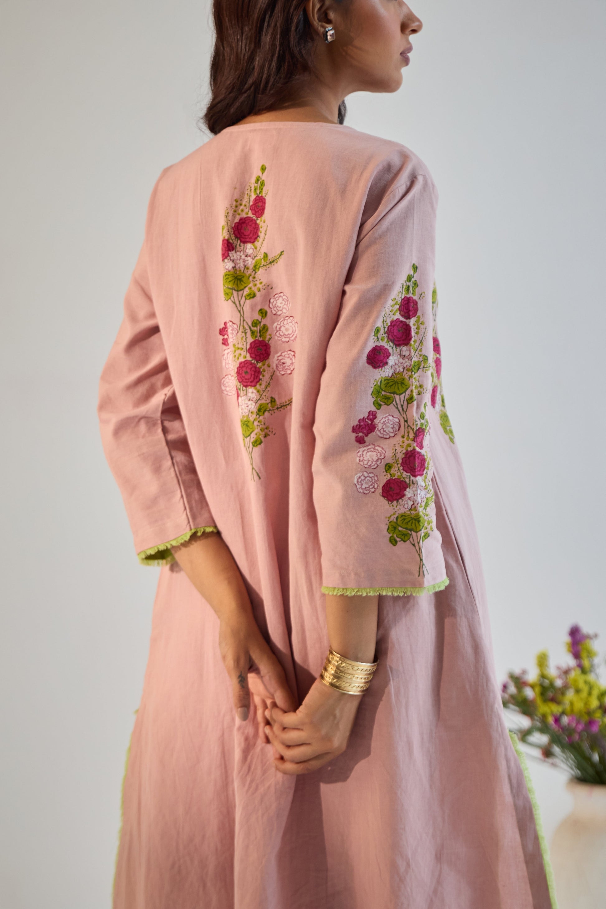 Gulaab rose pink hand block printed linen kurta set (set of 2)