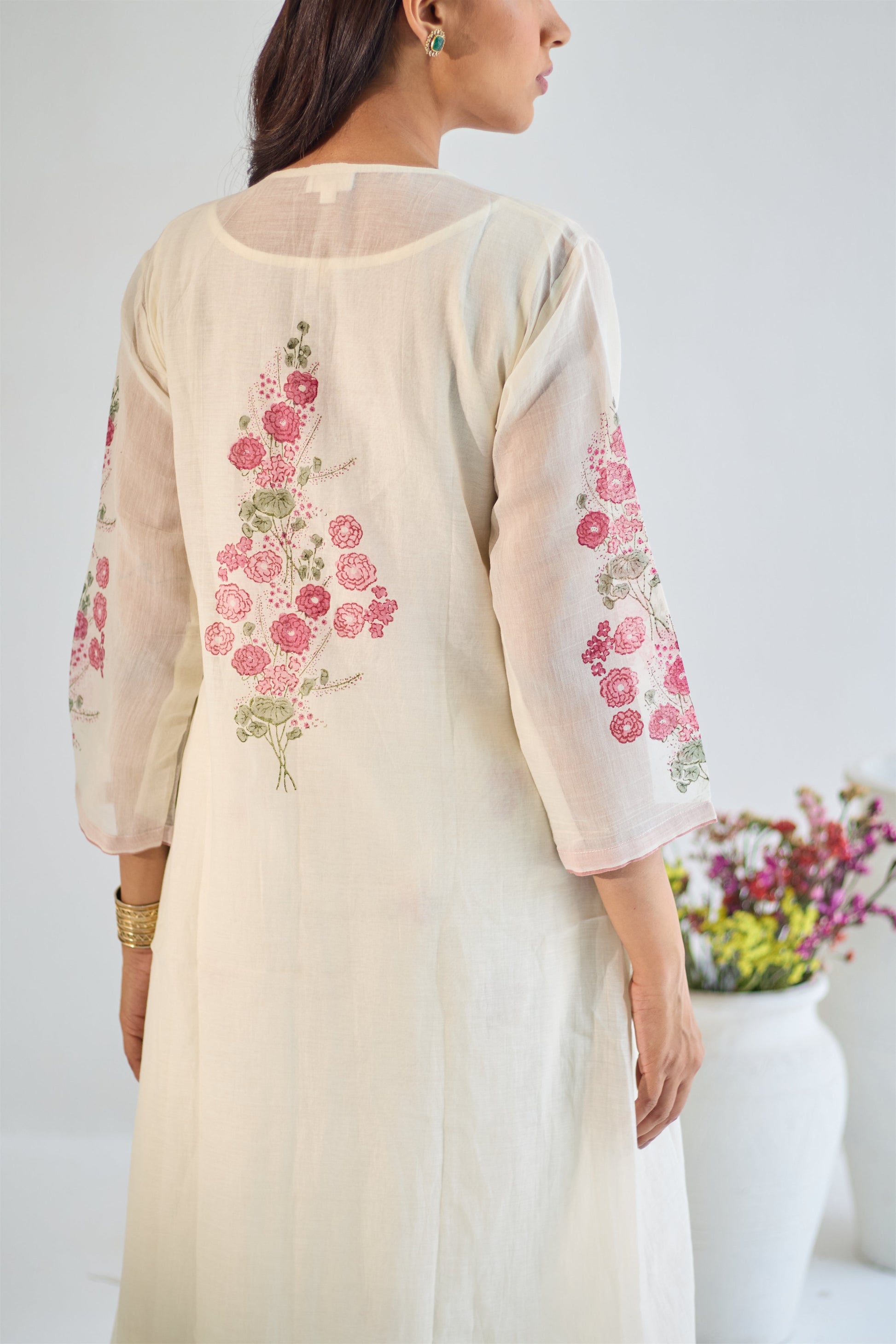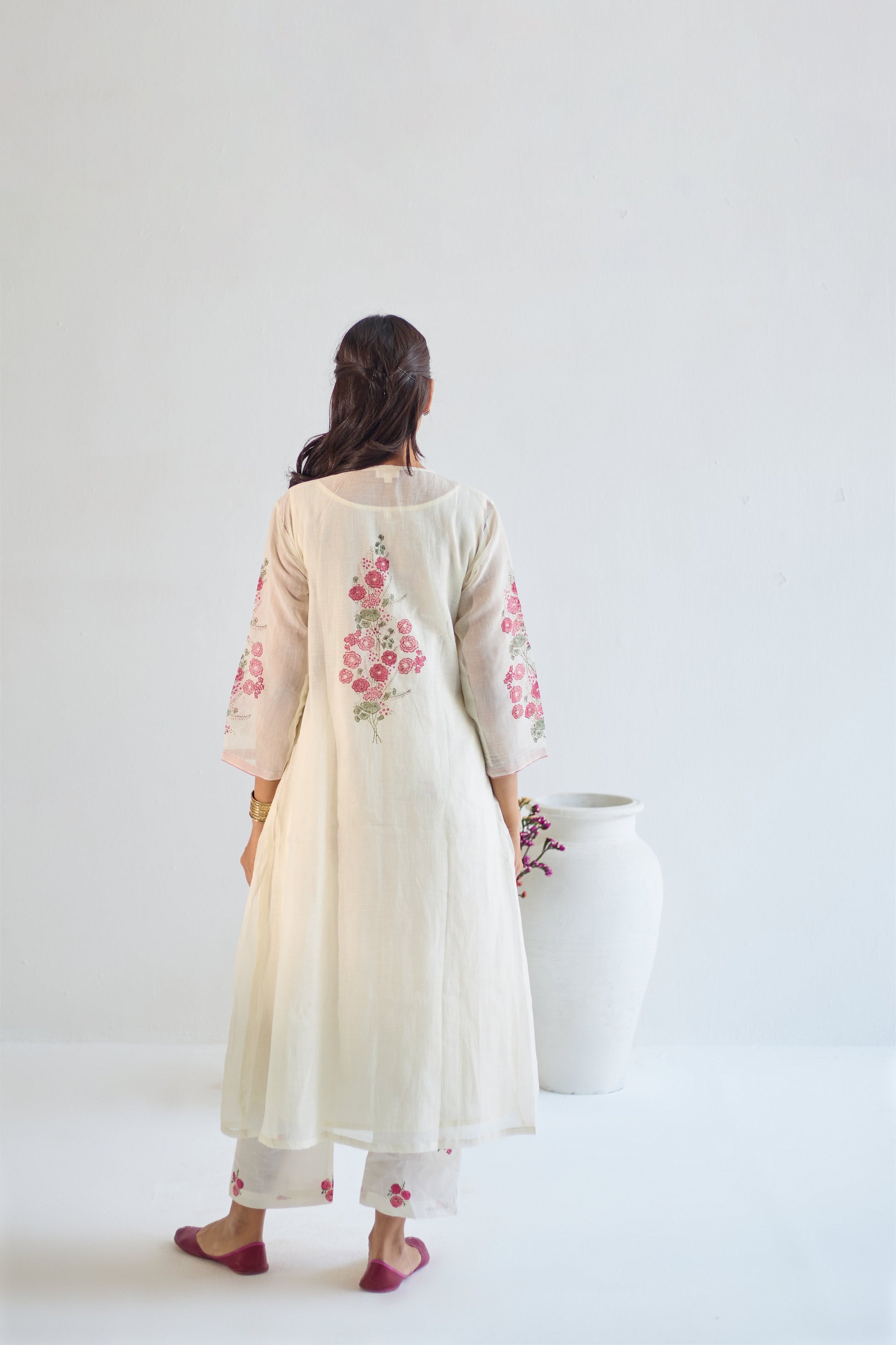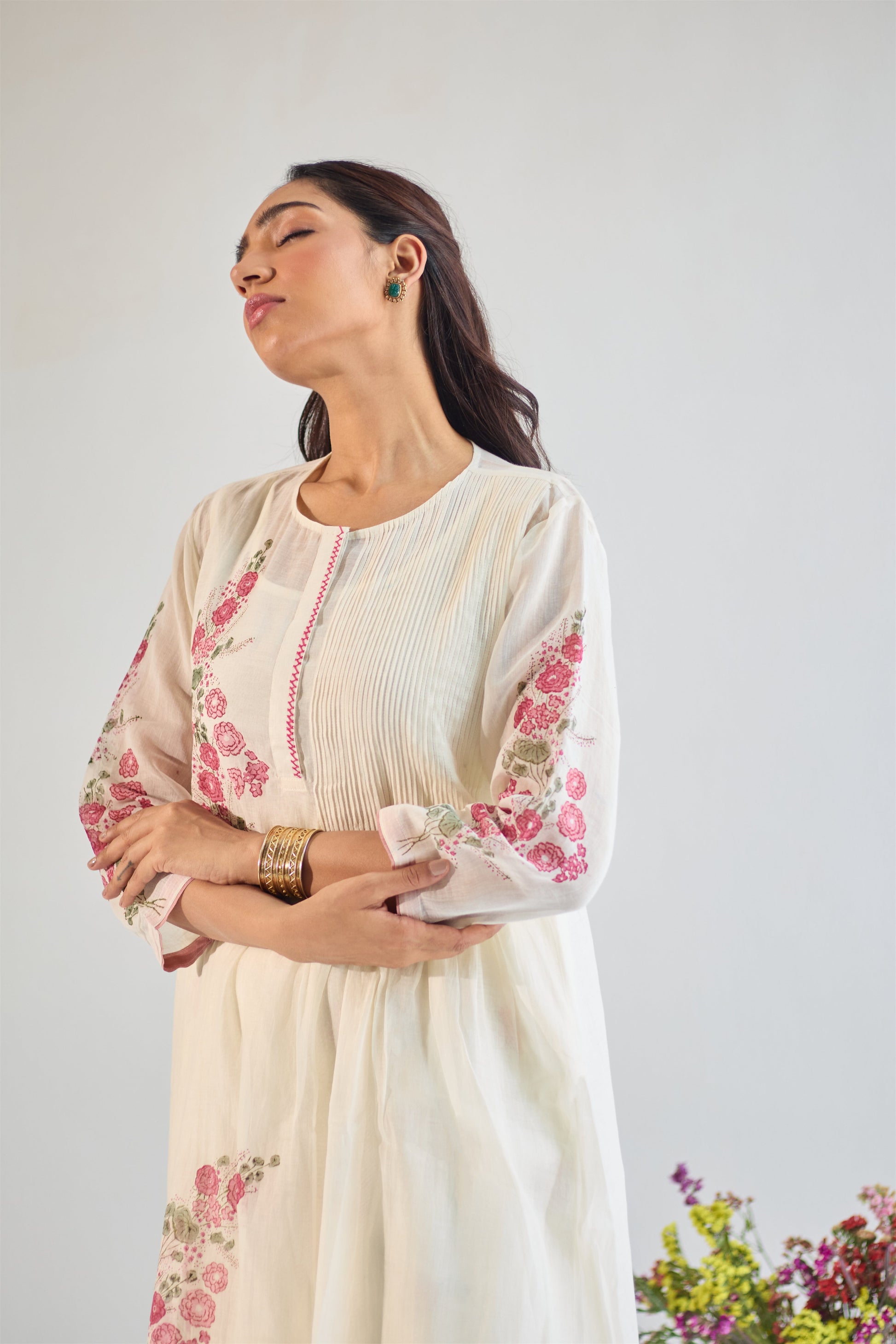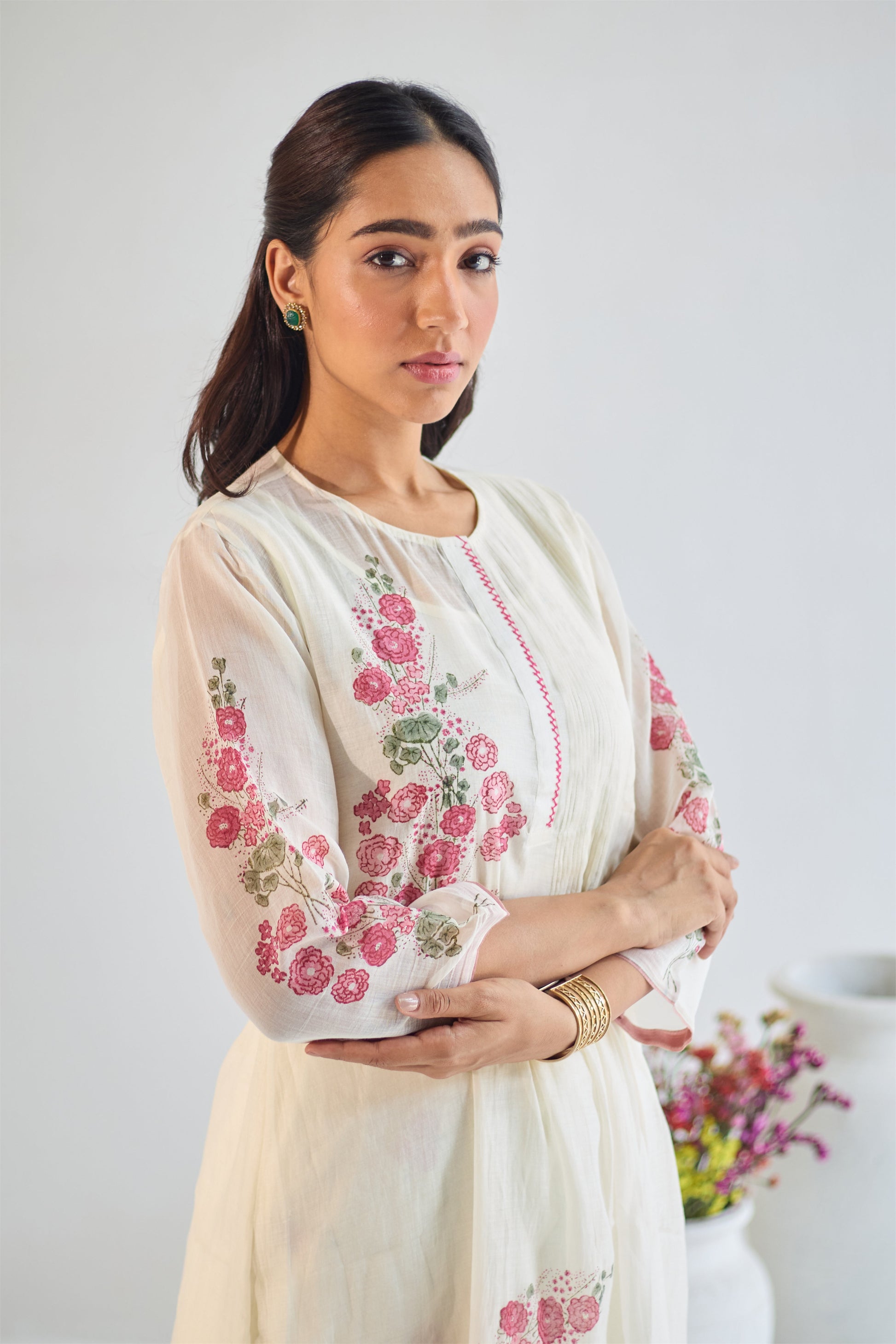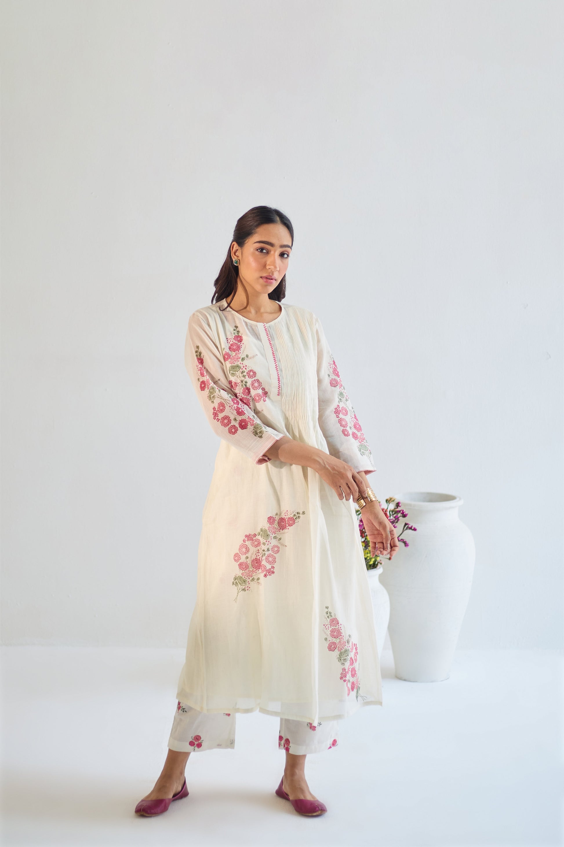 Gulaab white pink hand block printed pintuck chanderi kurta set (set of 2)