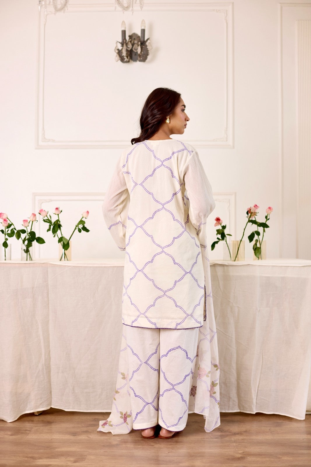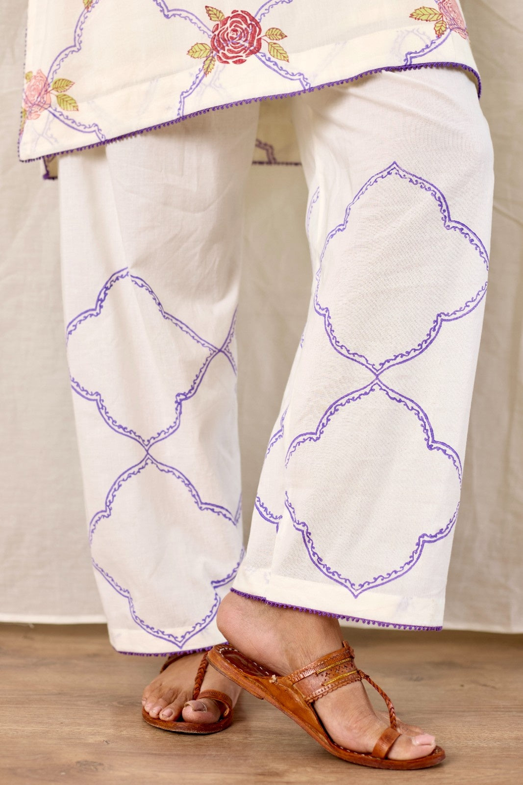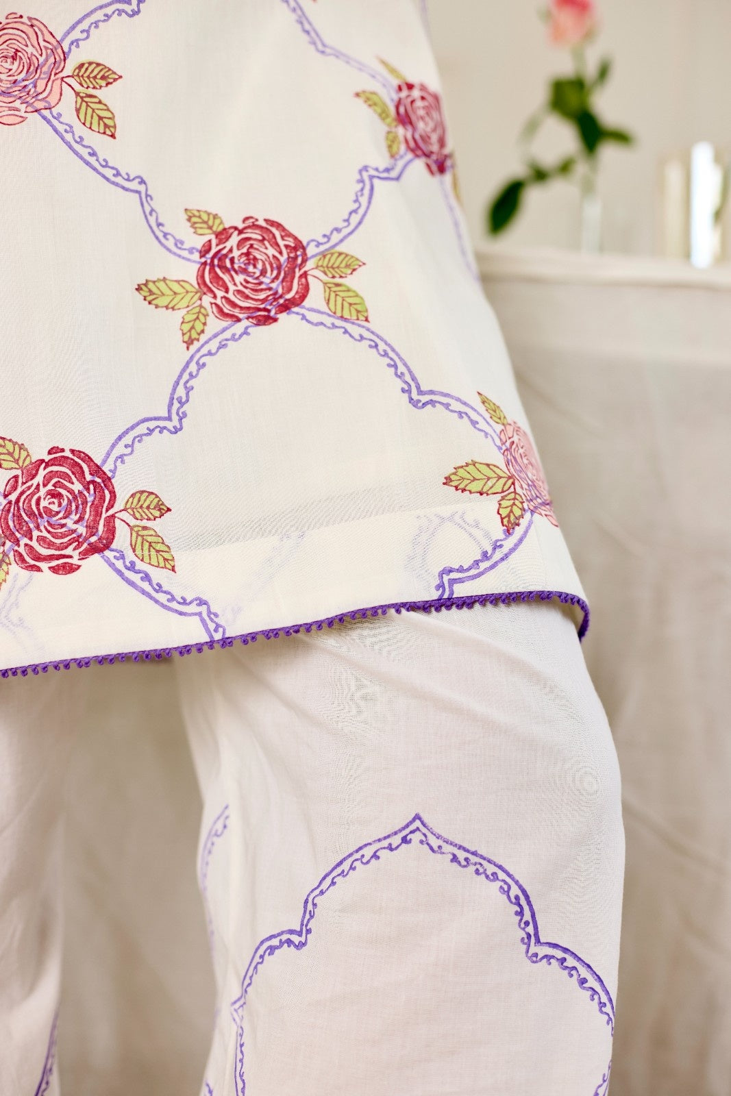 GulBel white-purple hand block printed mulmul short kurta set (set of 3)