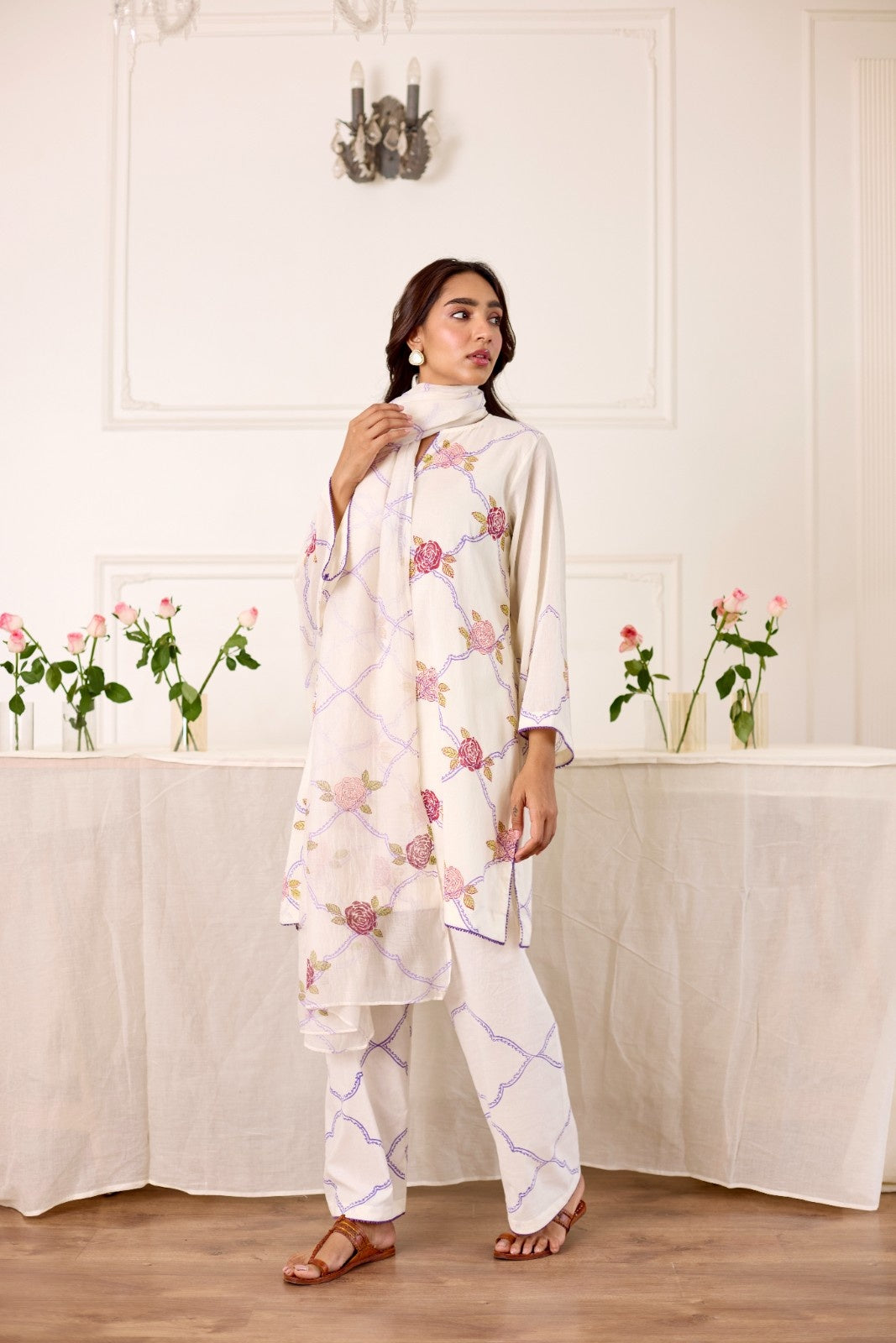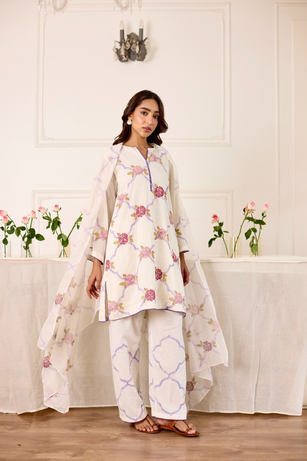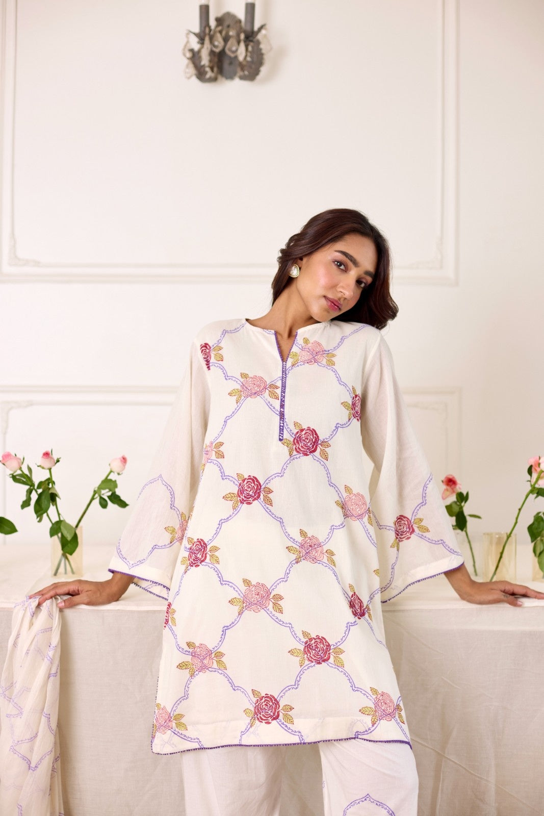 GulBel white-purple hand block printed mulmul short kurta set (set of 3)