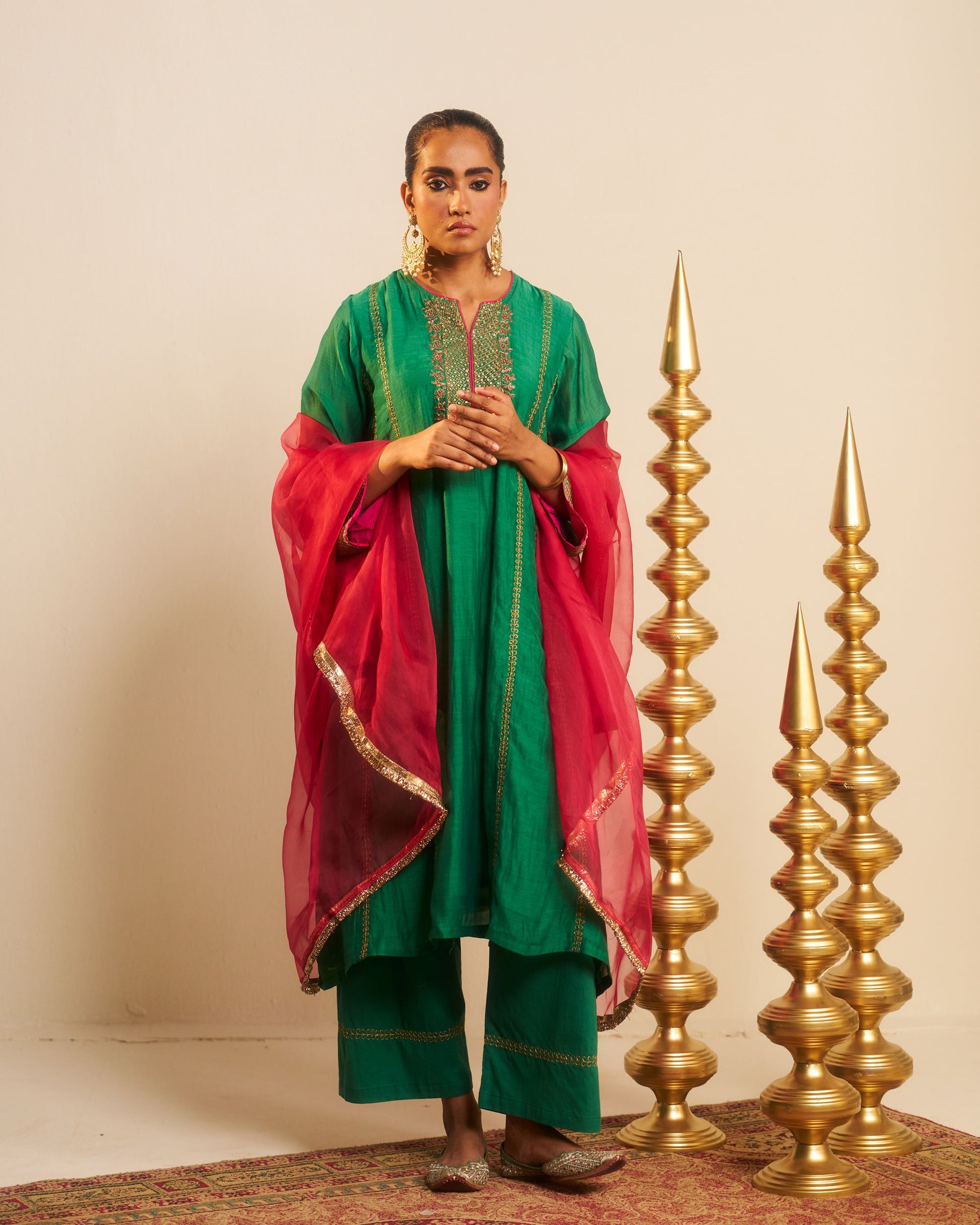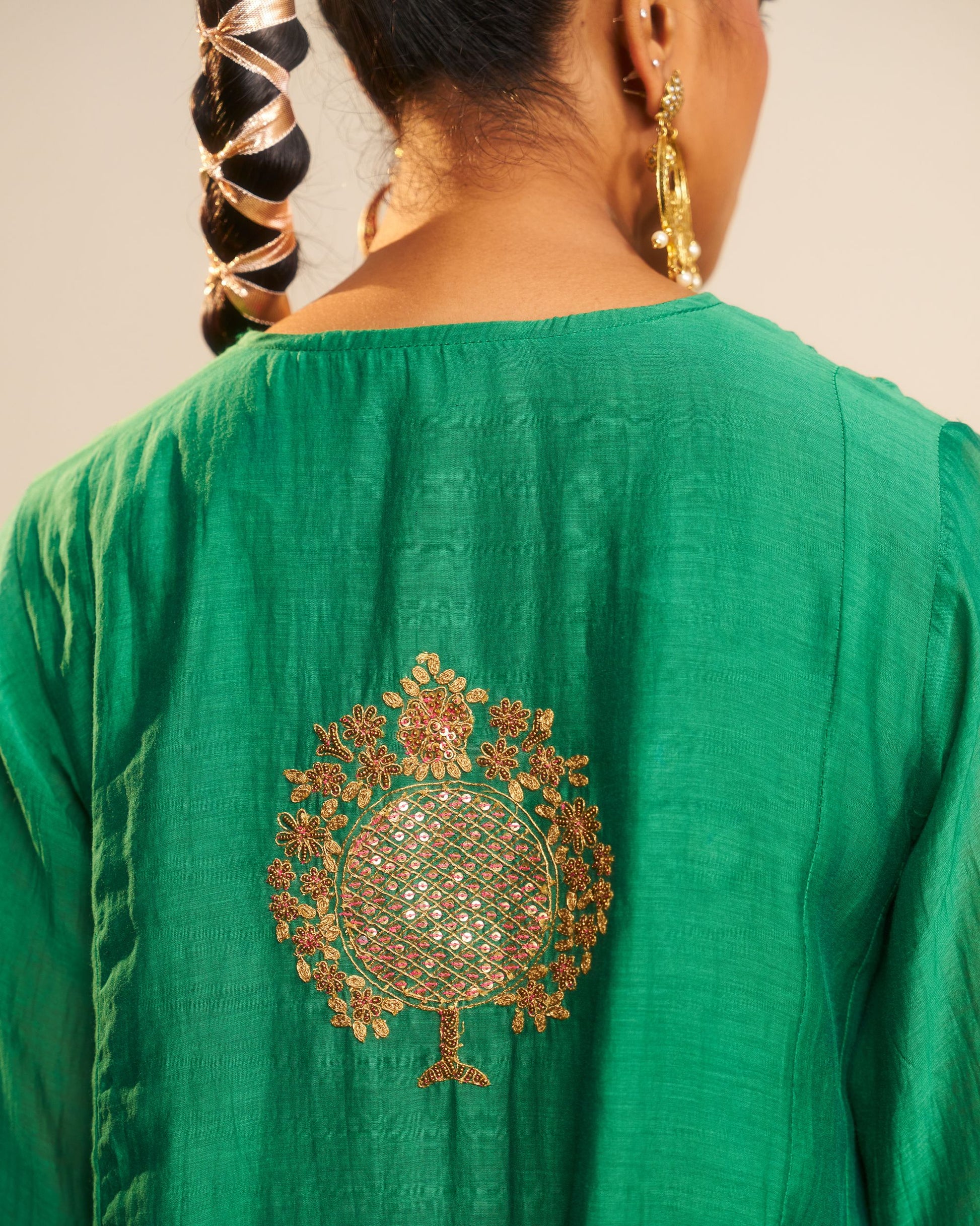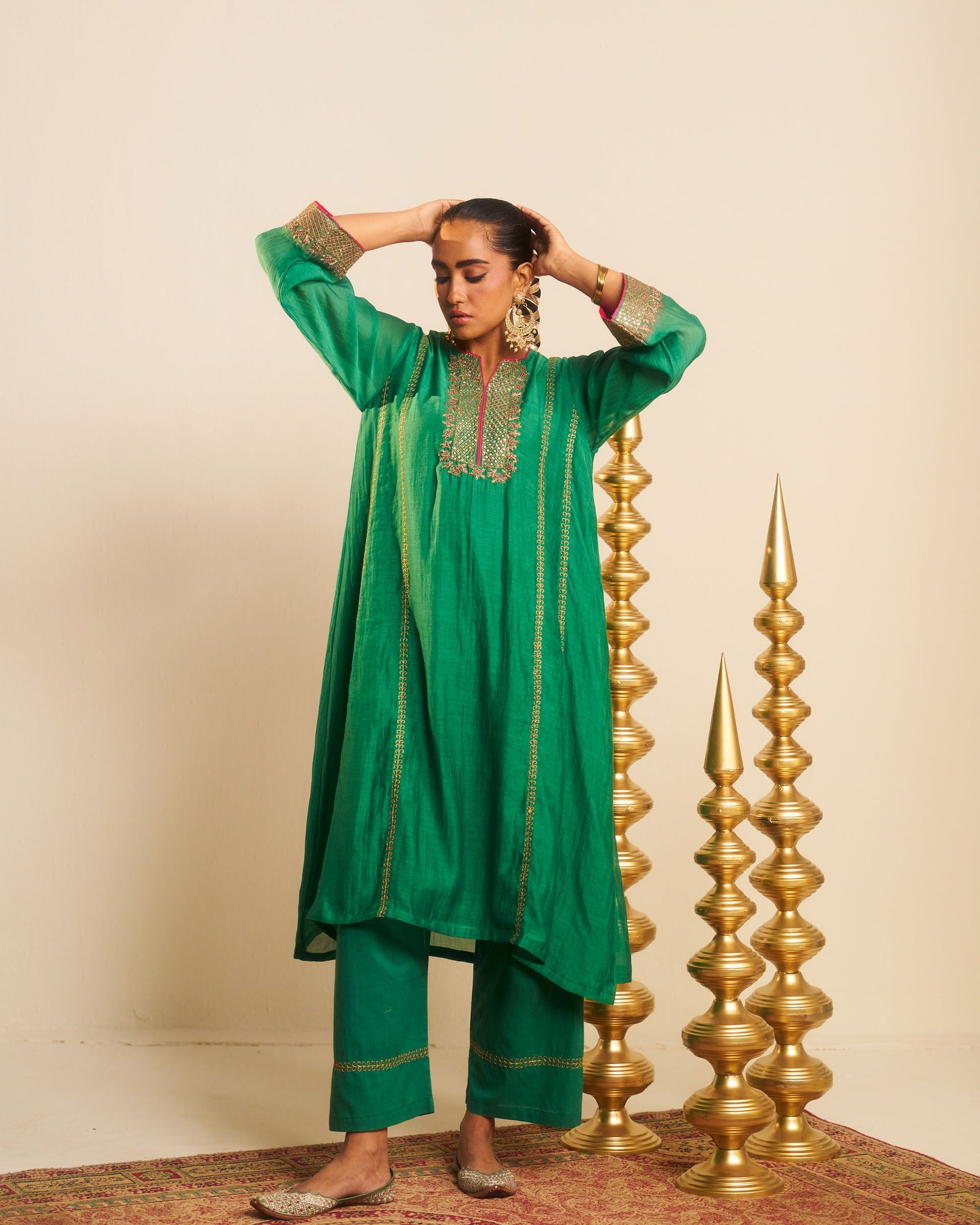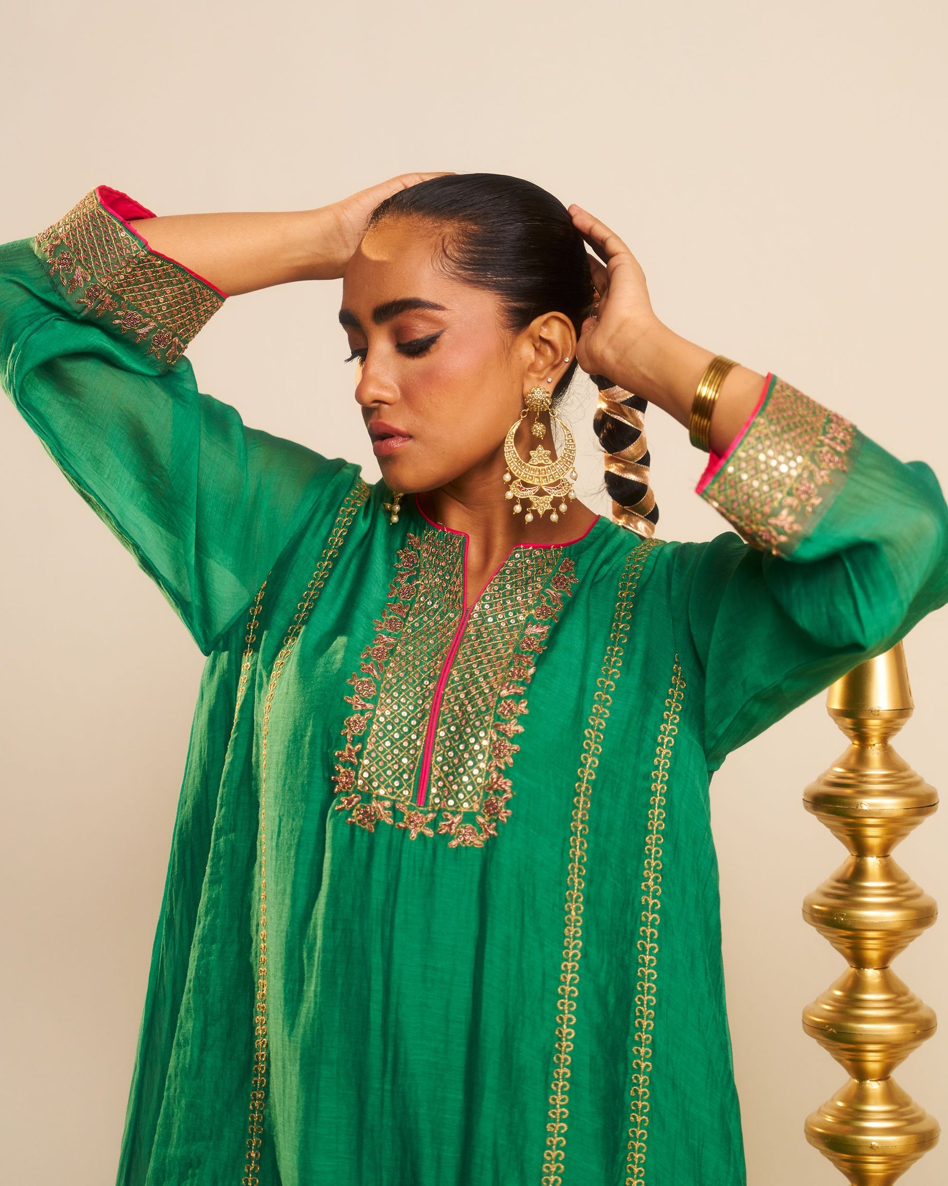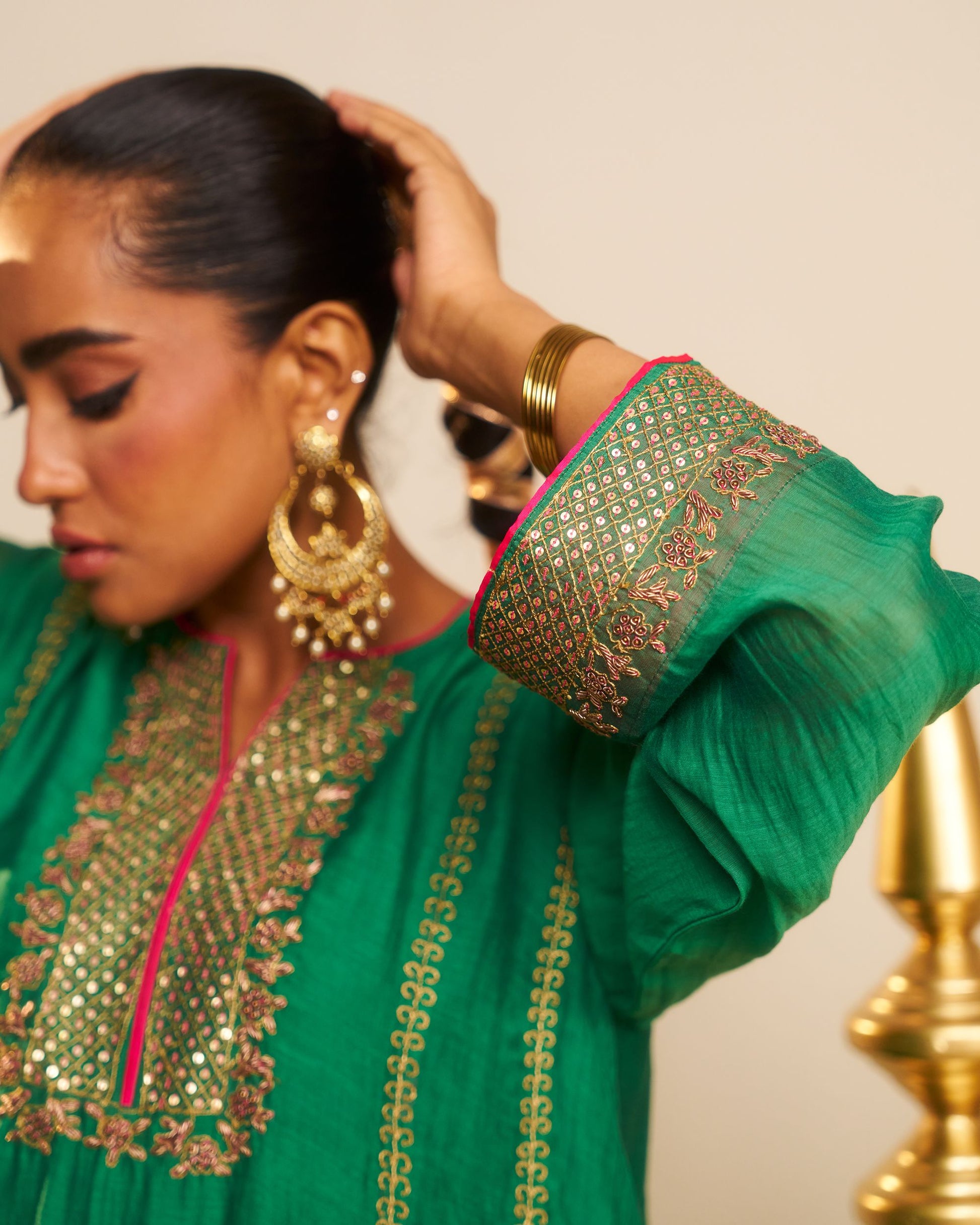 Ibaadat emerald green hand embroidered chanderi kurta set.