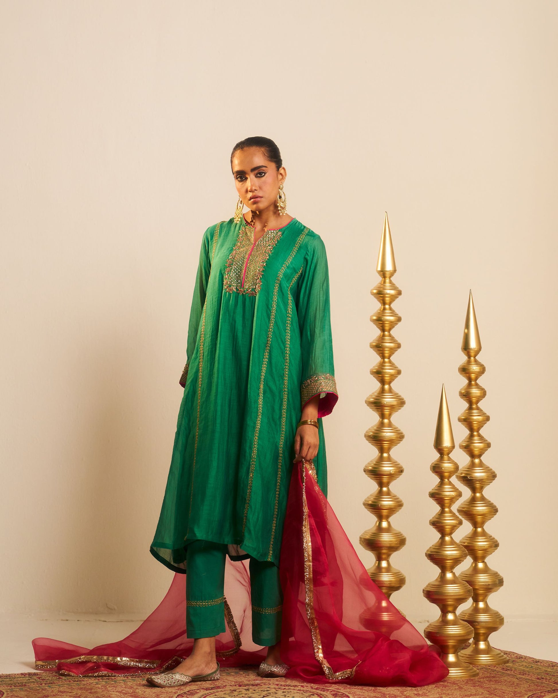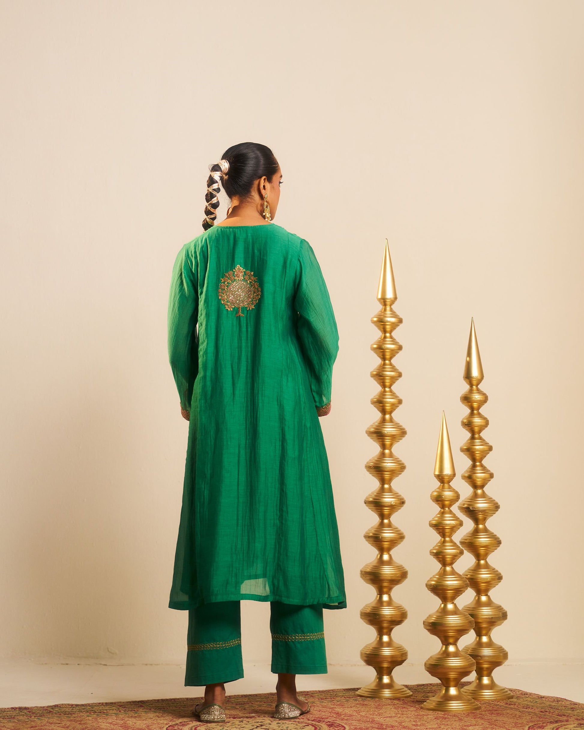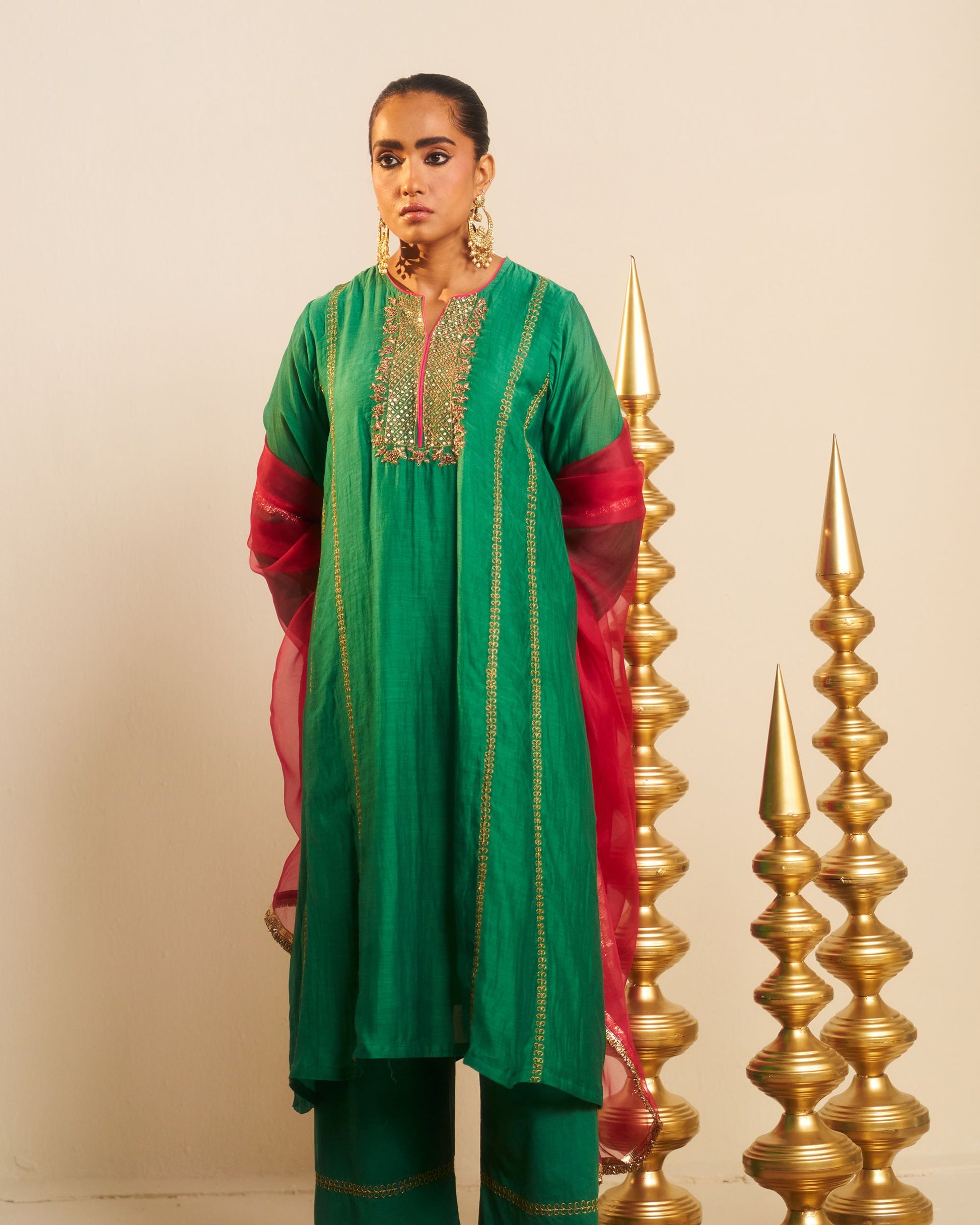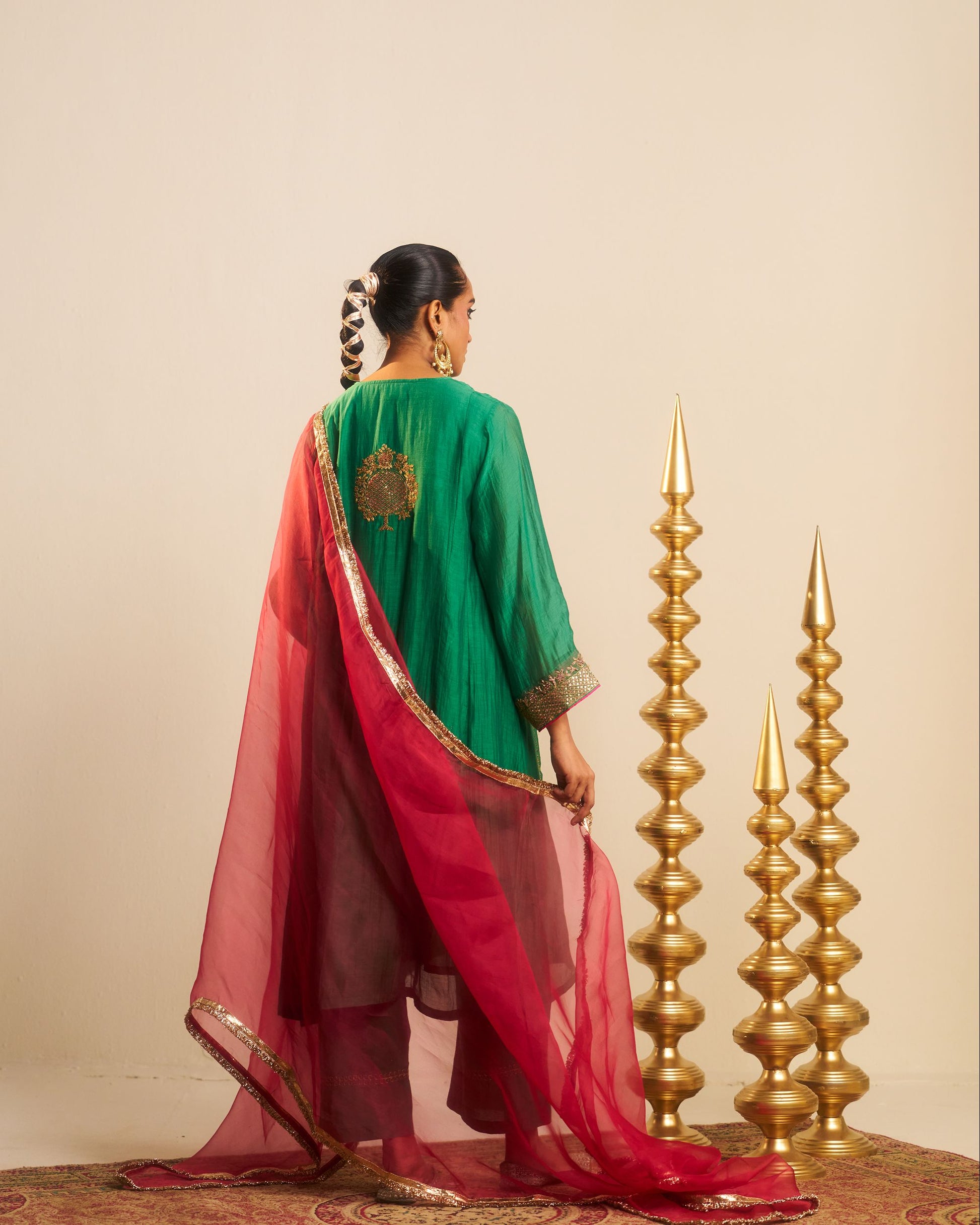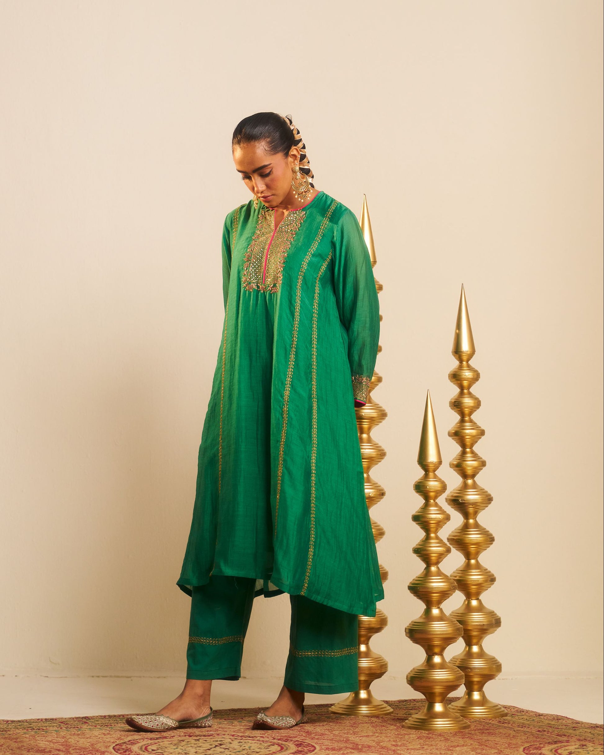 Ibaadat emerald green hand embroidered chanderi kurta set.