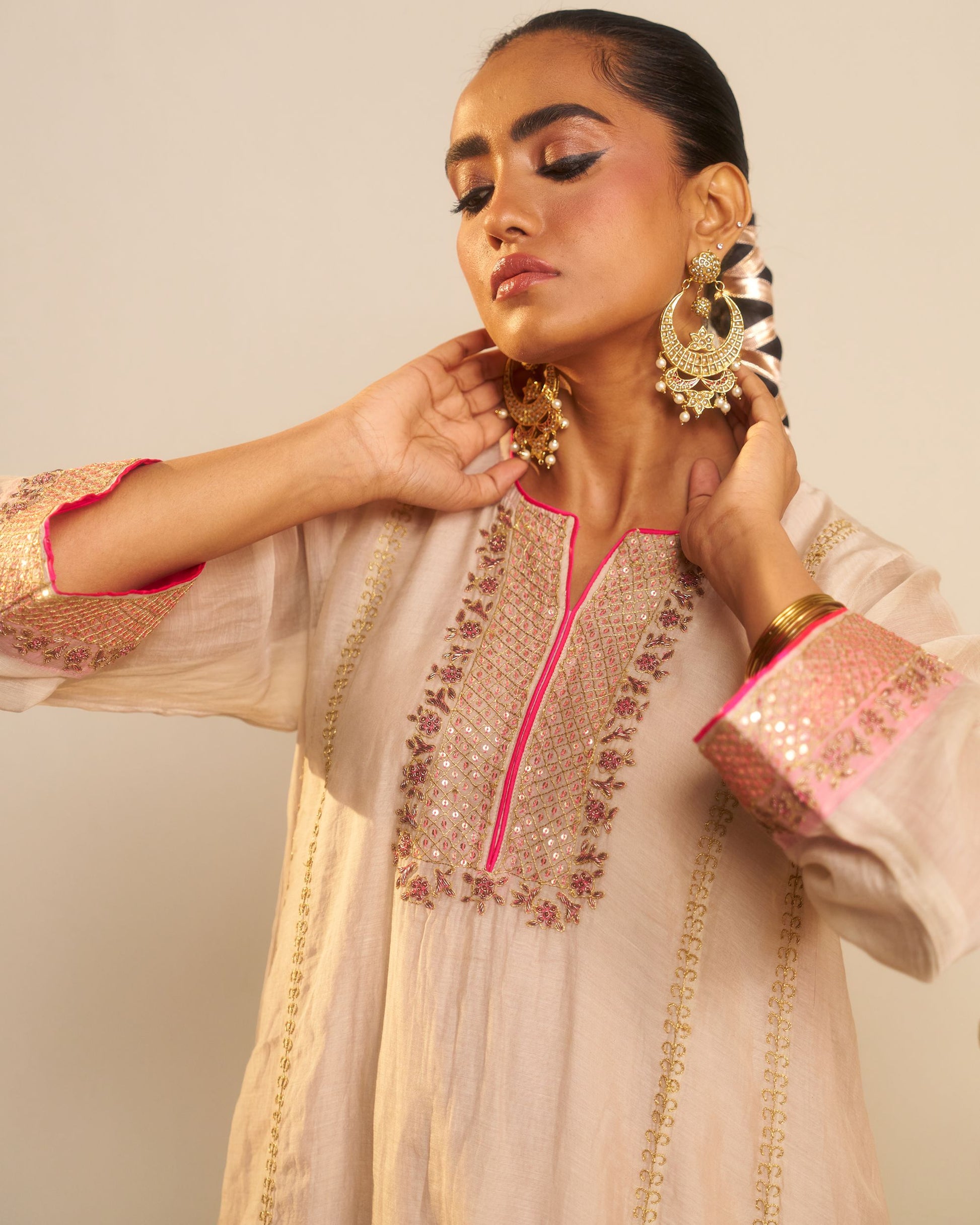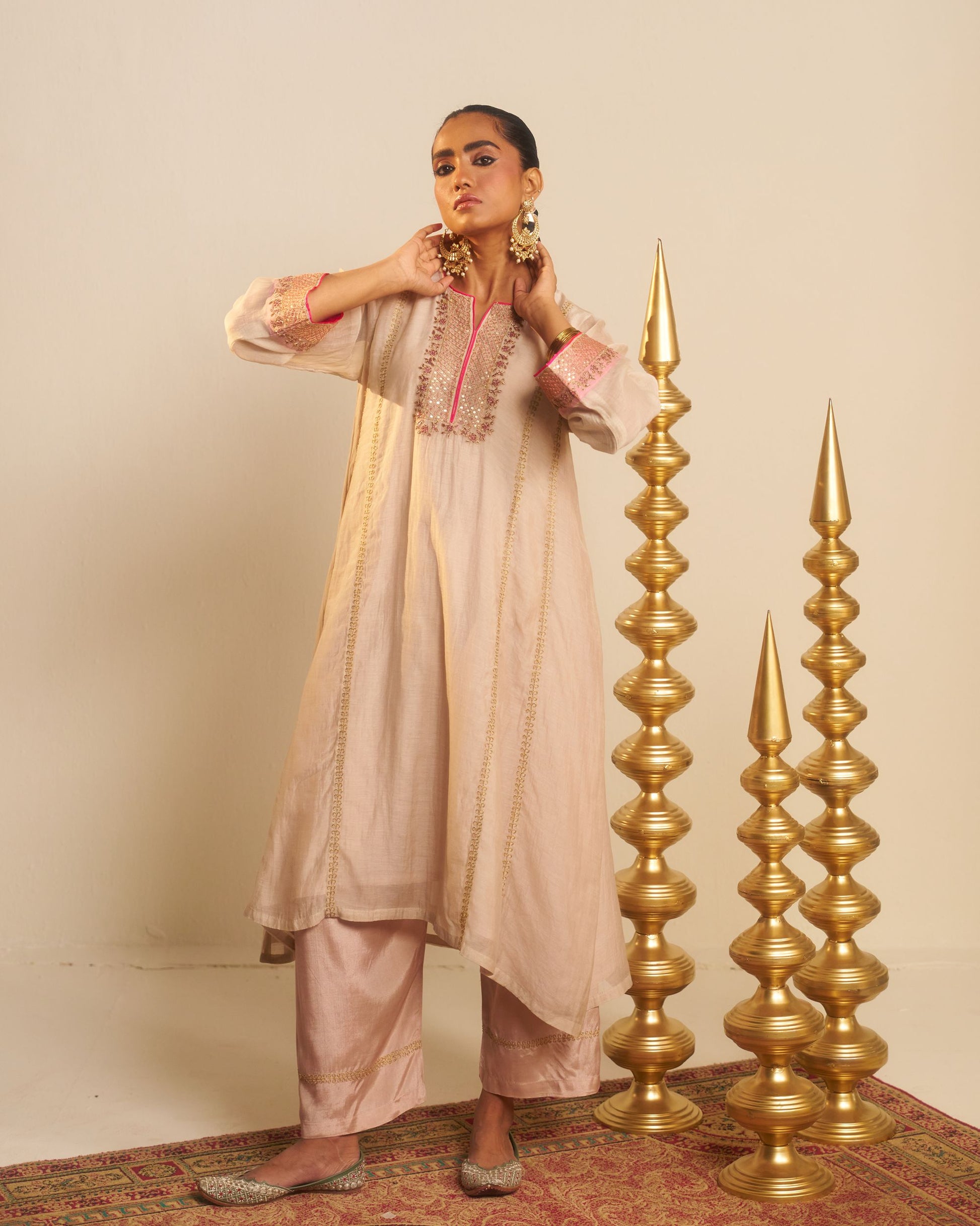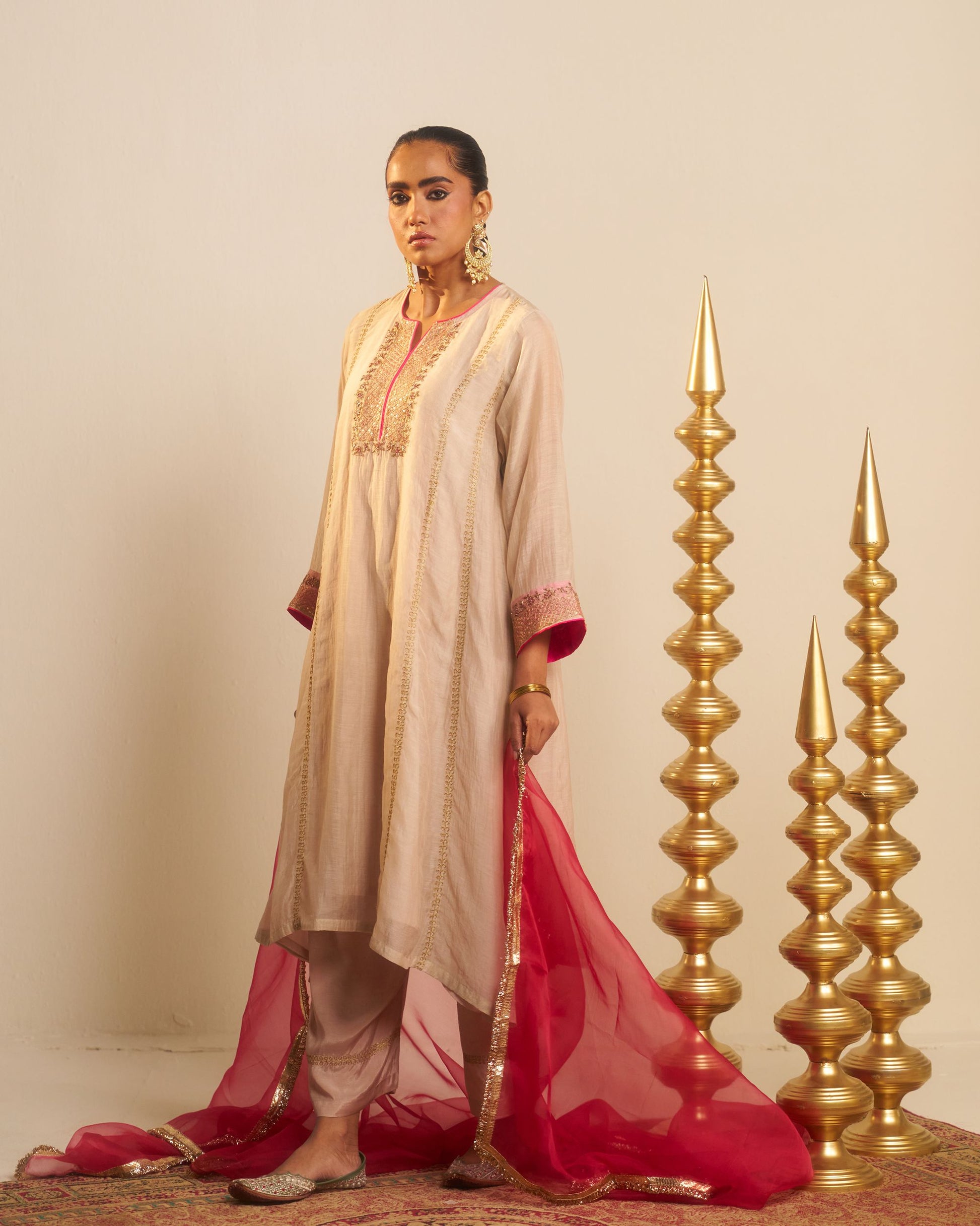 Ibaadat smoke grey hand embroidered chanderi kurta set.