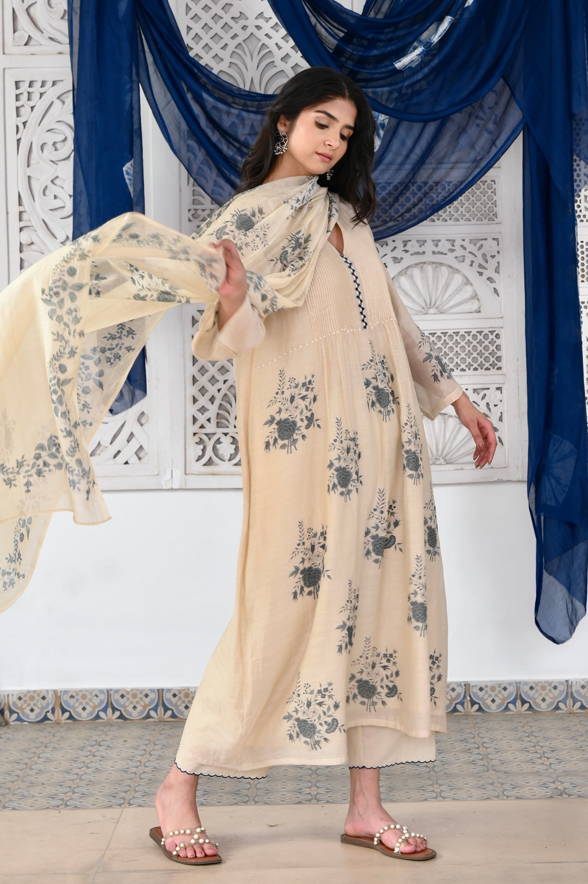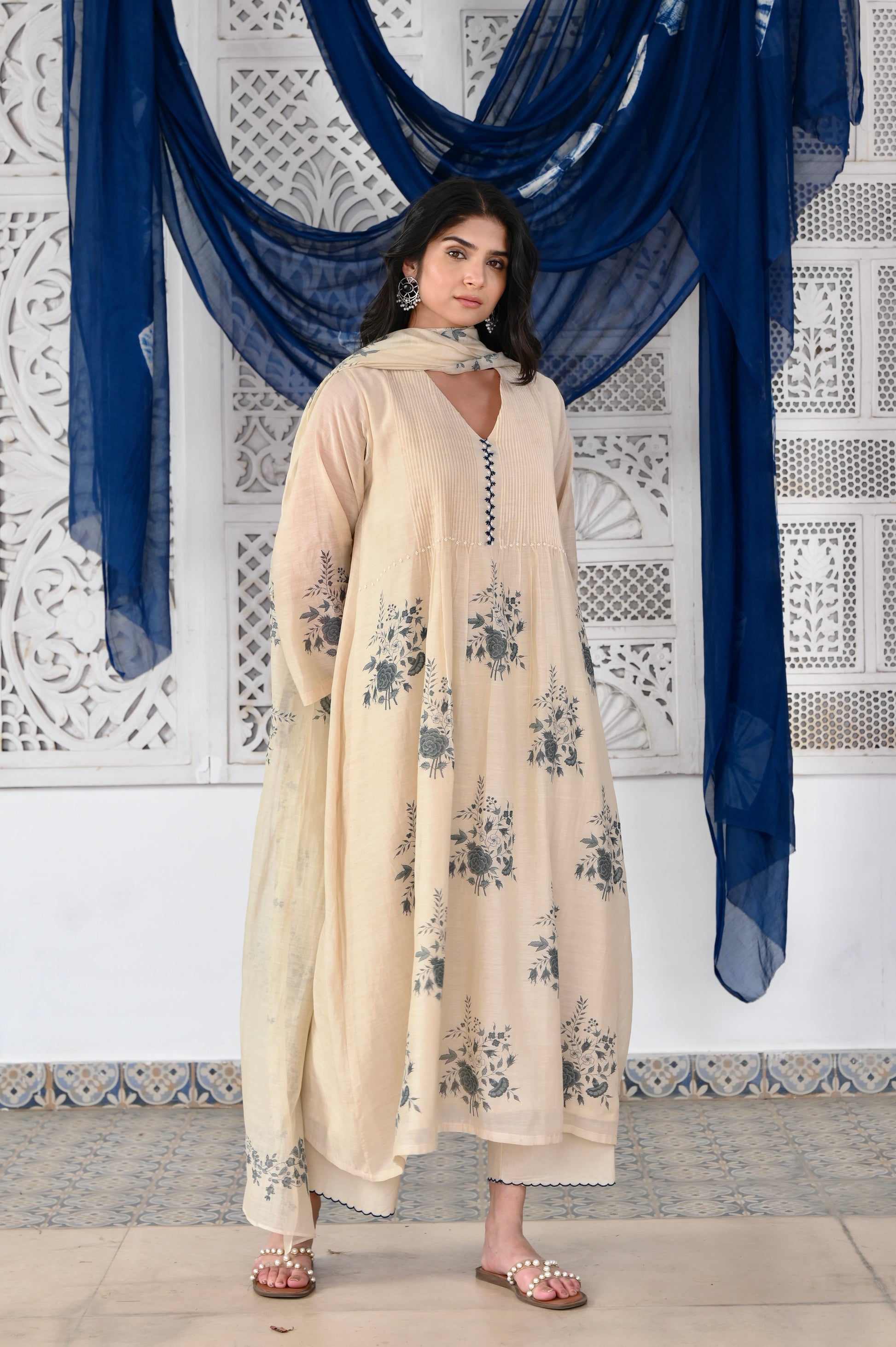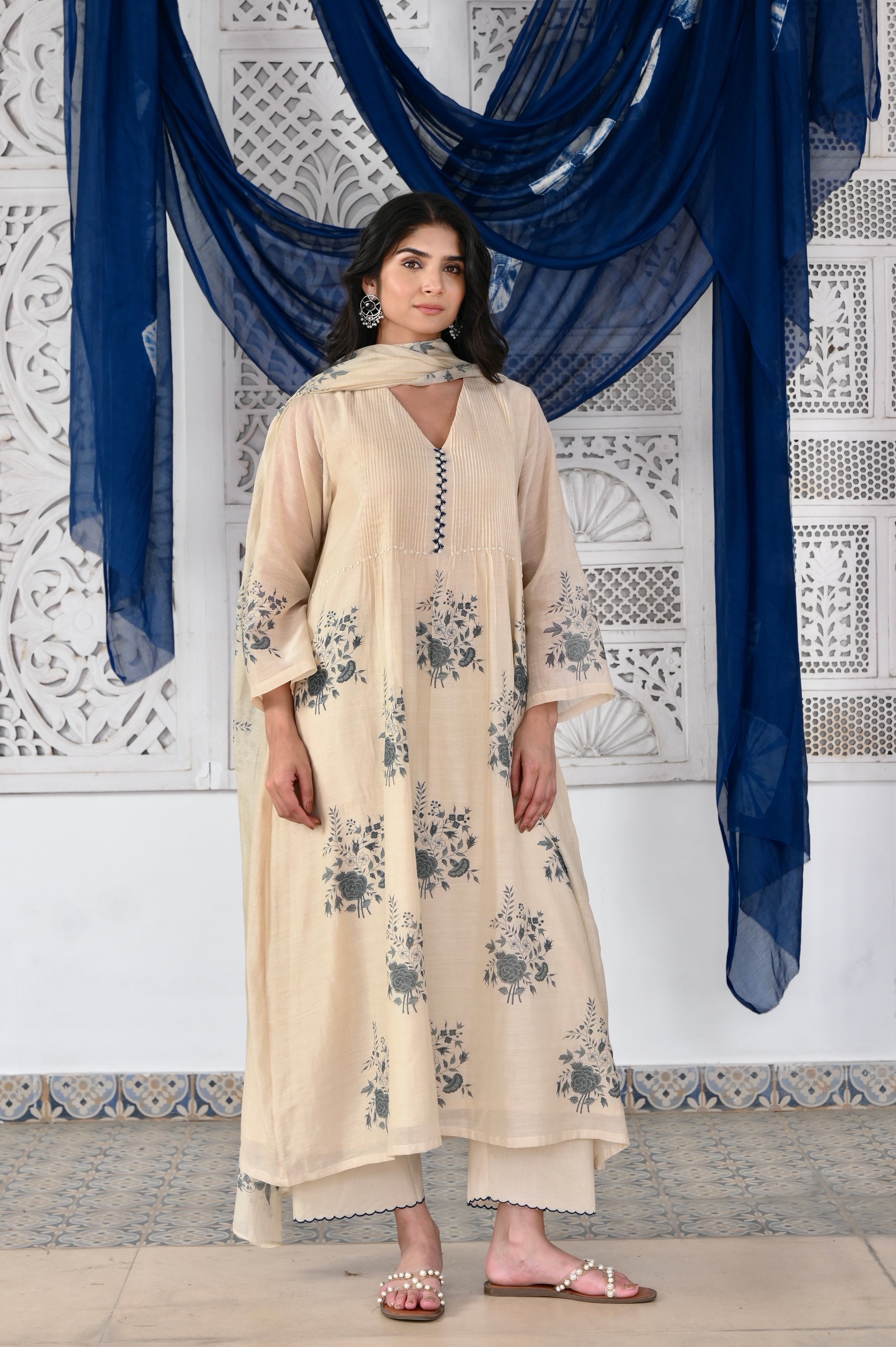 Kosumi ivory hand block printed pintuck chanderi kurta set