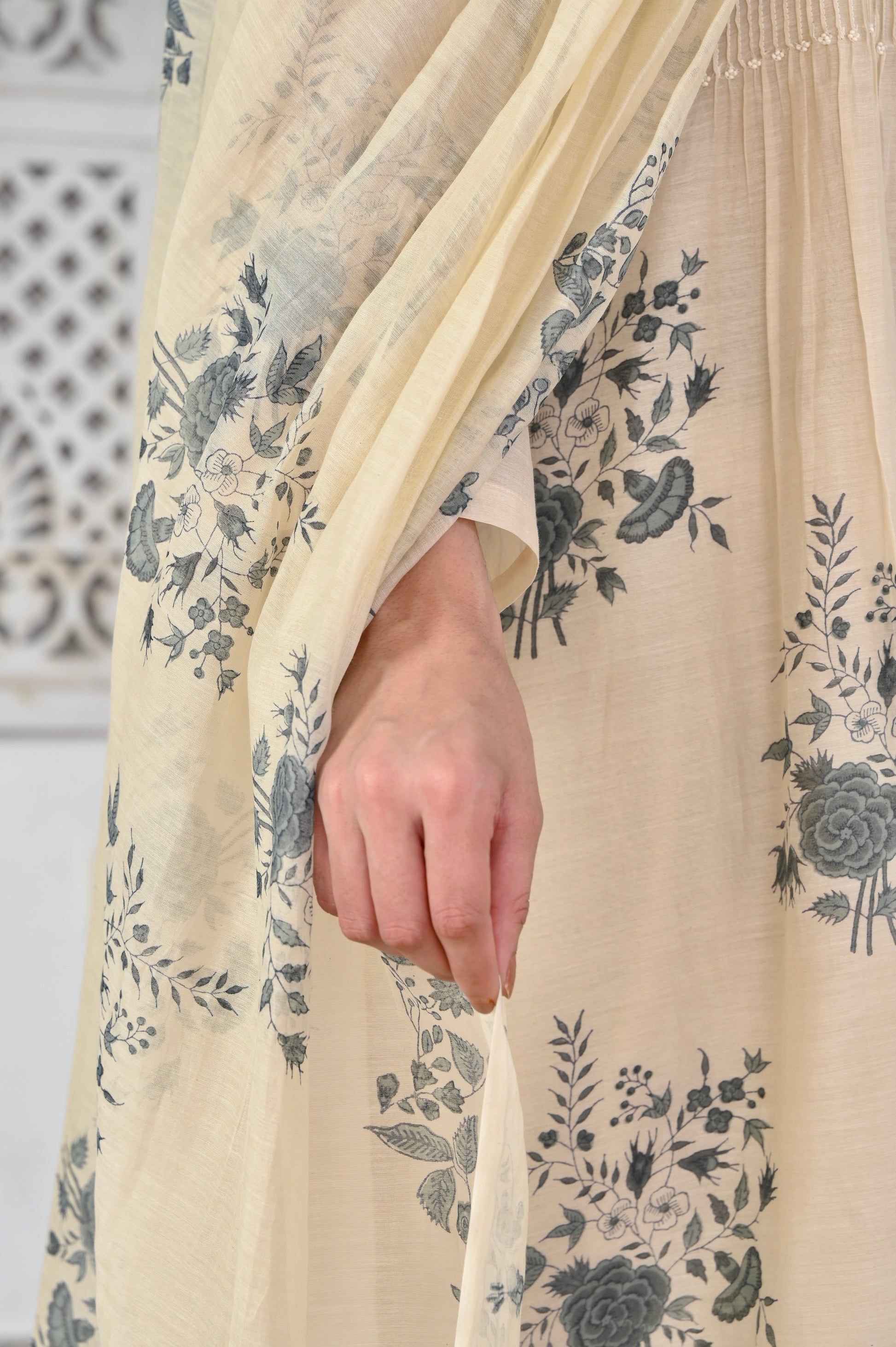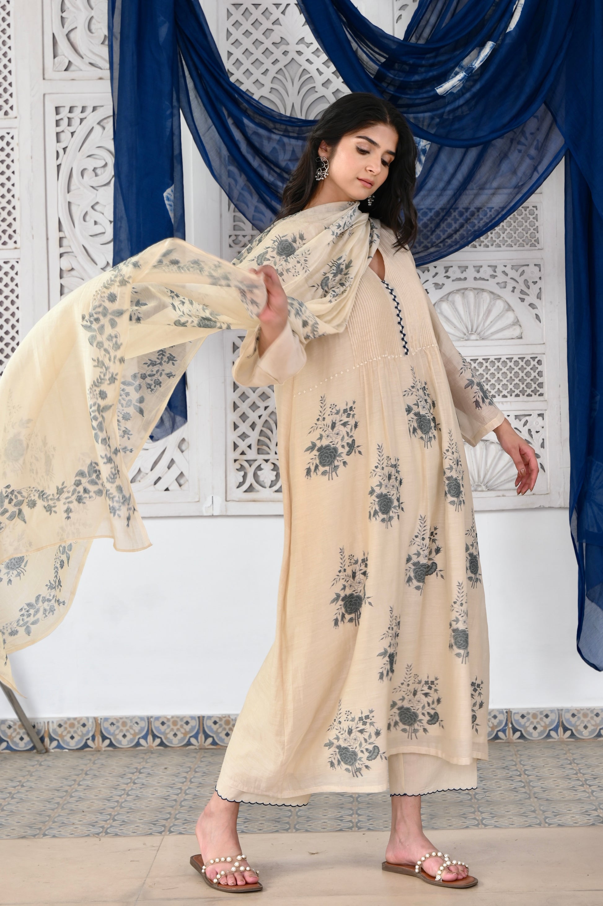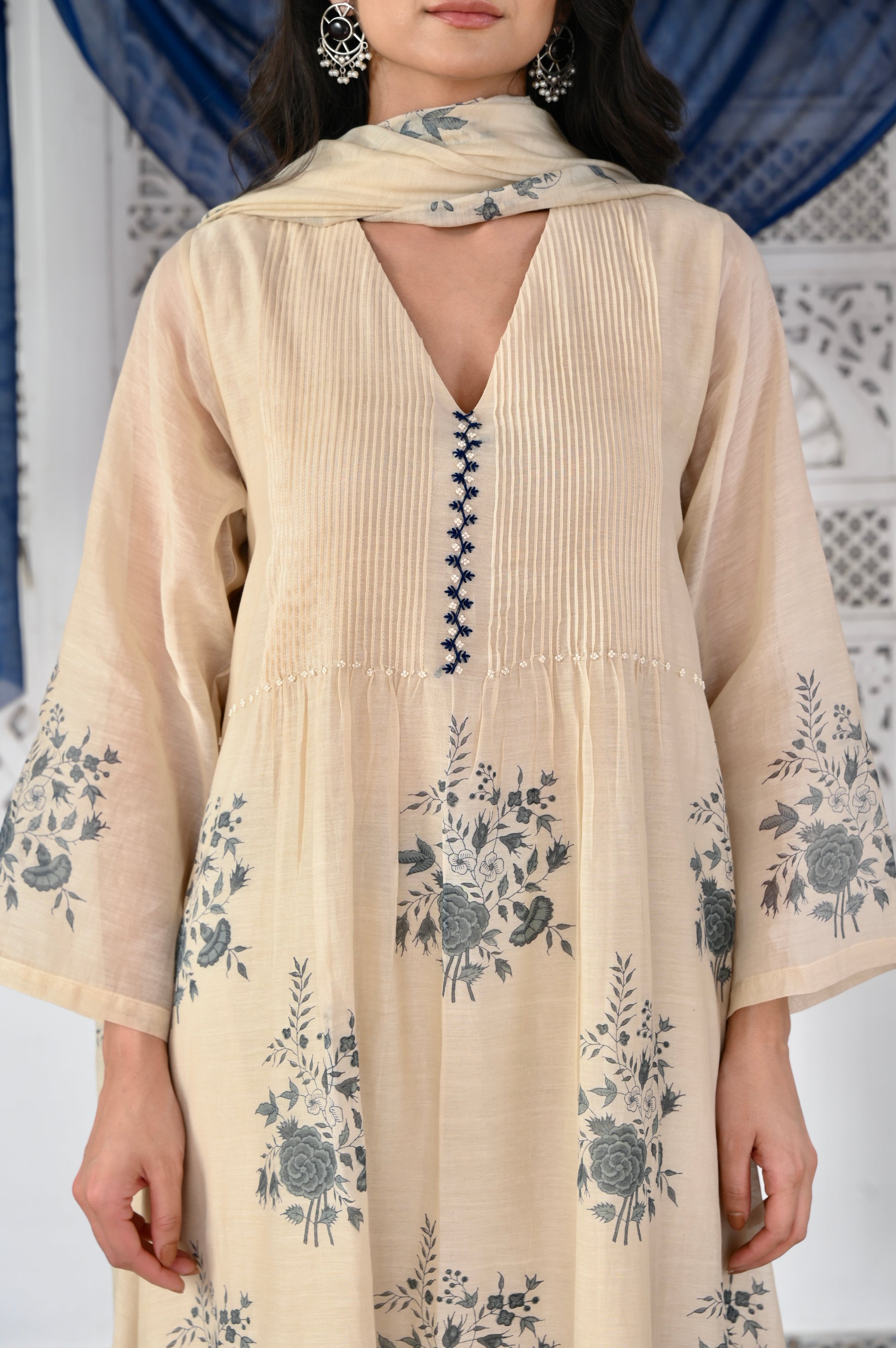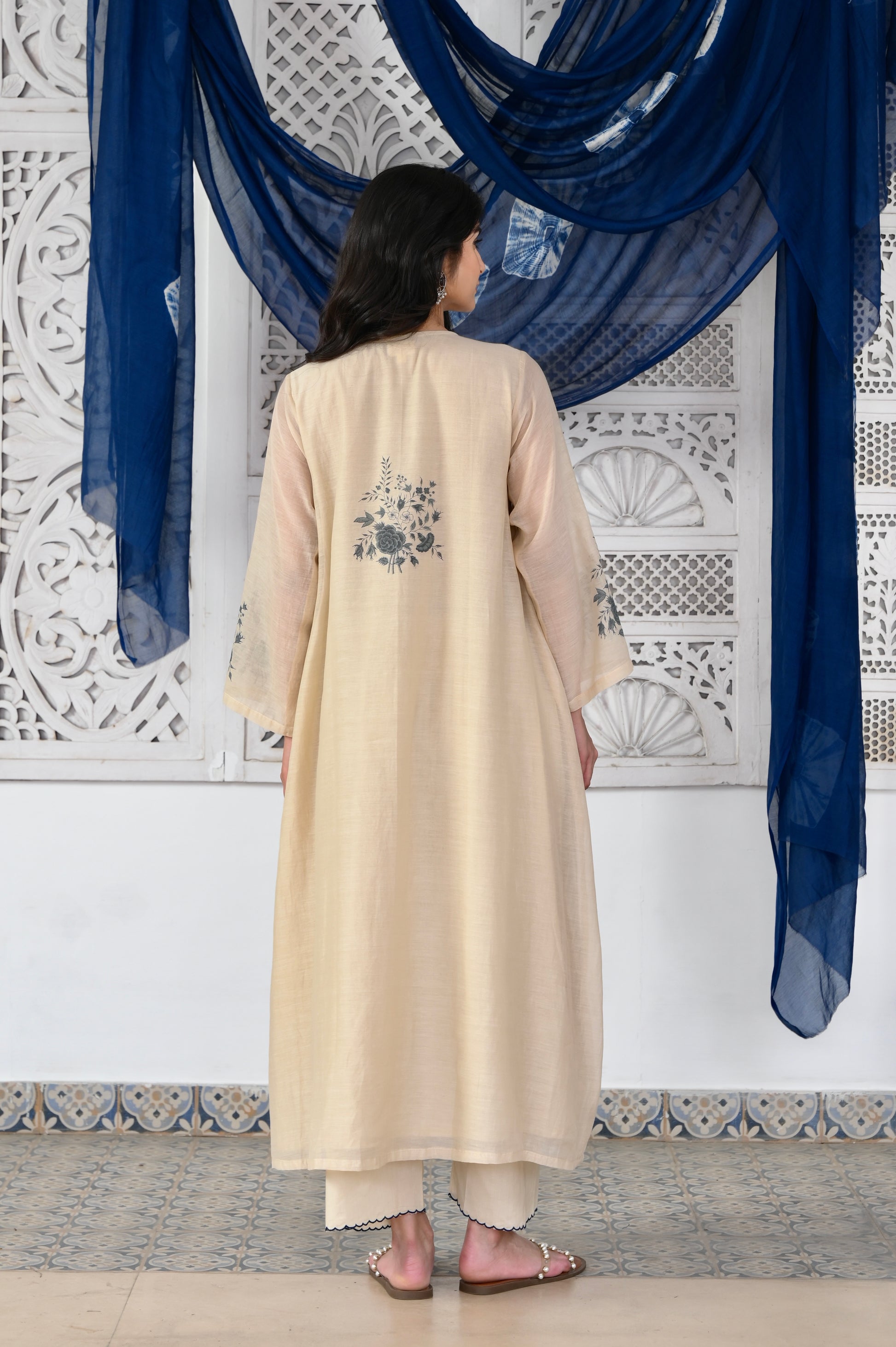 Kosumi ivory hand block printed pintuck chanderi kurta set