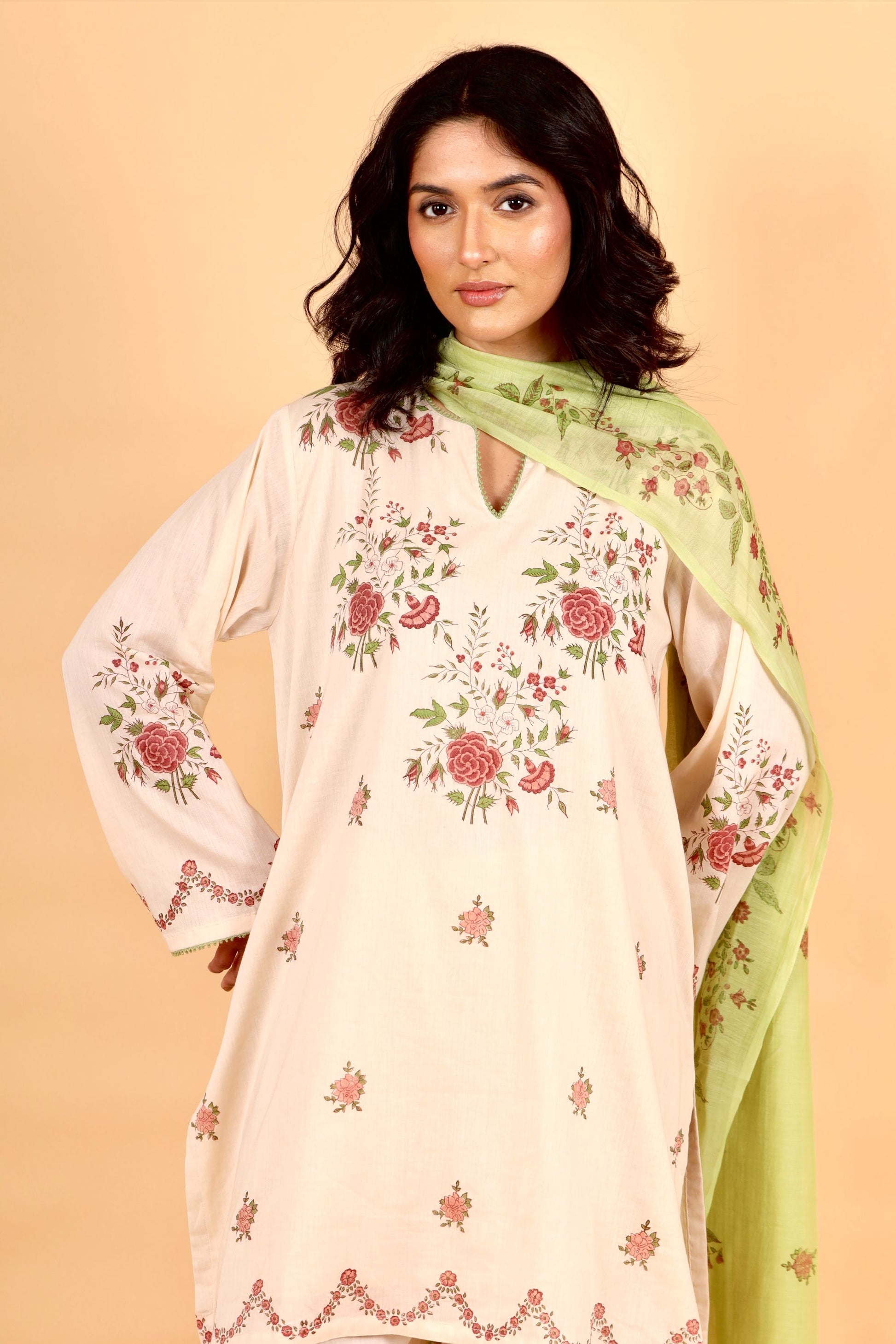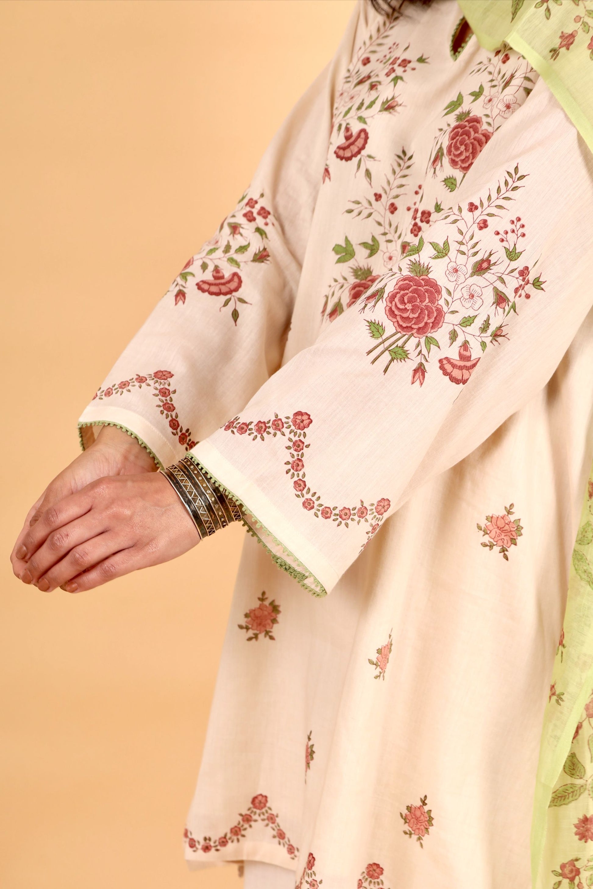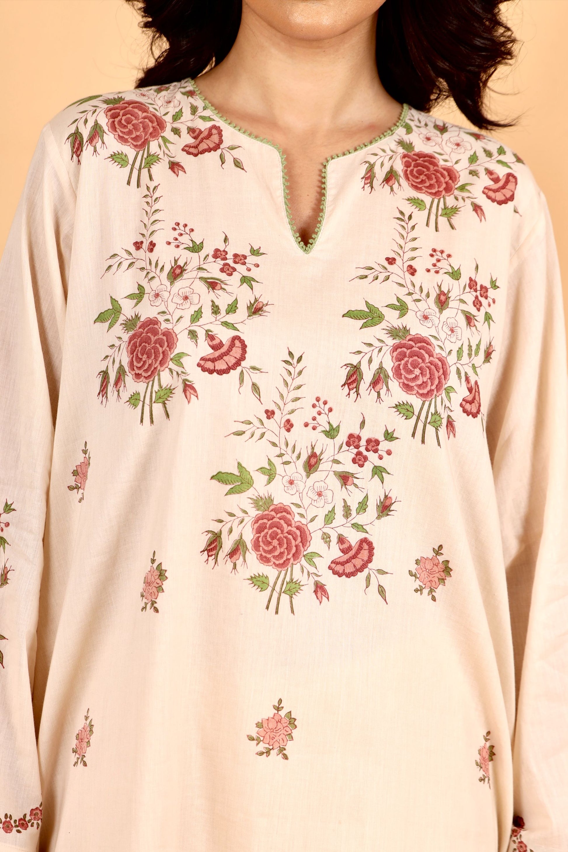 Kosumi peach hand block printed mulmul short kurta set
