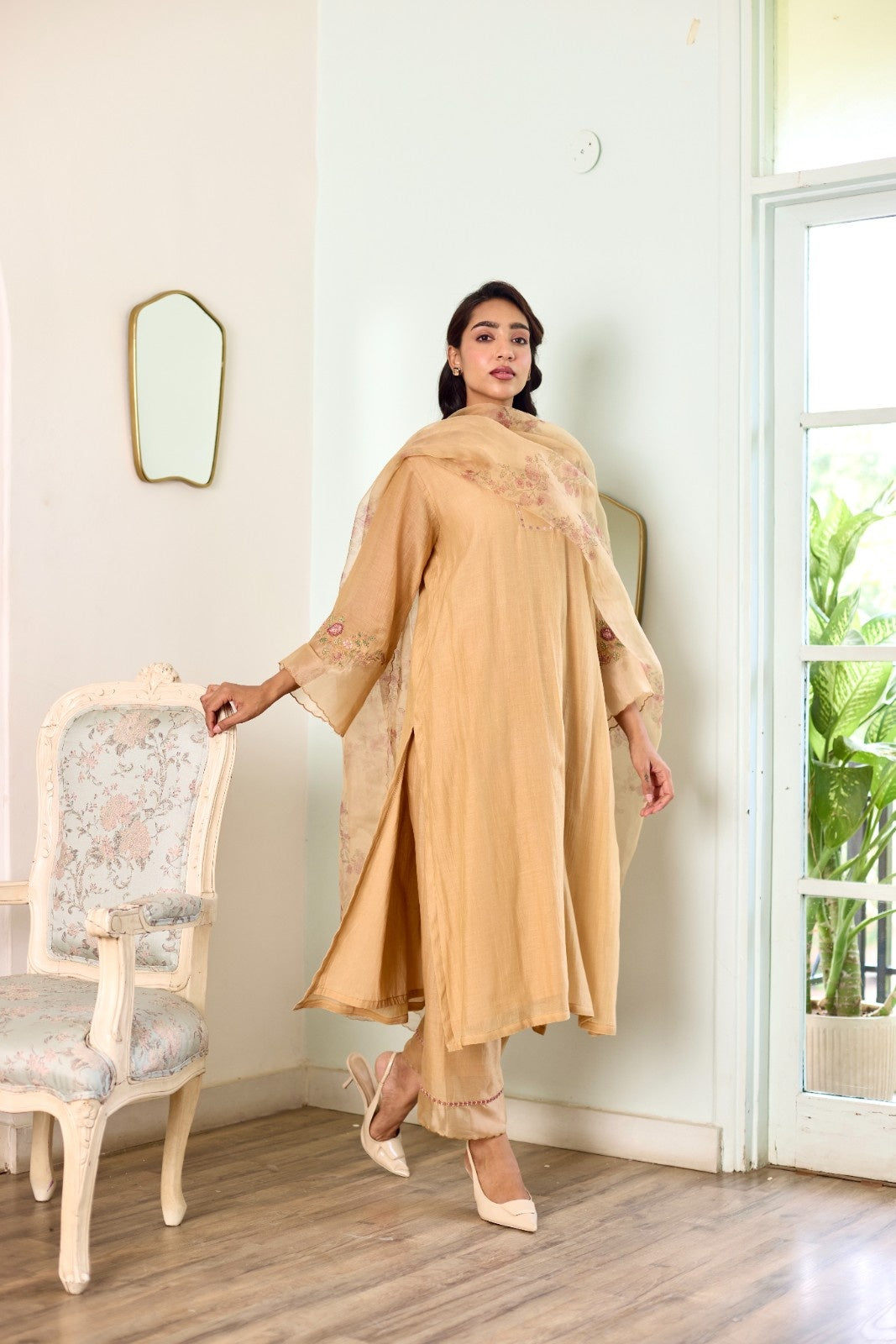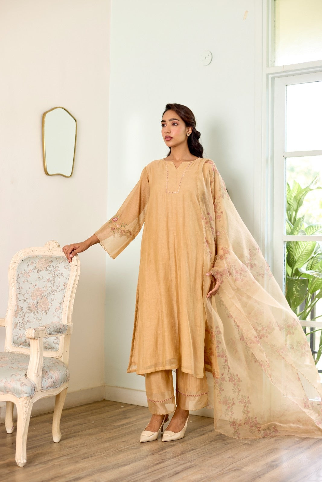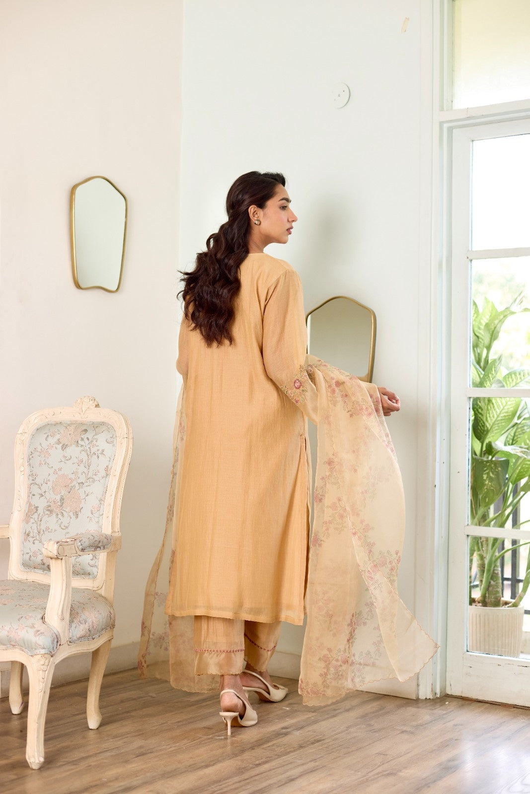 Meadows stone organza applique hand embroidered chanderi kurta set (set of 3)