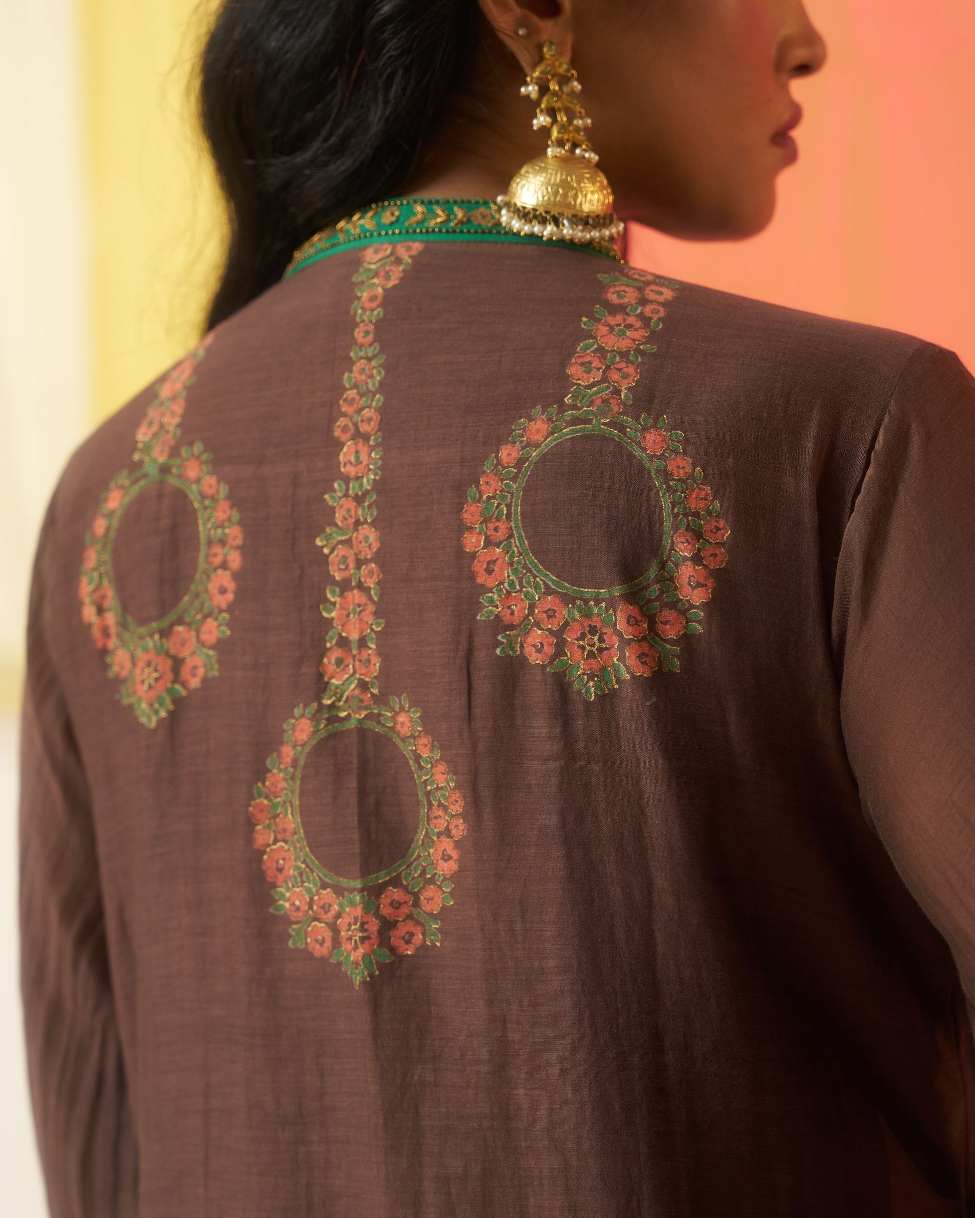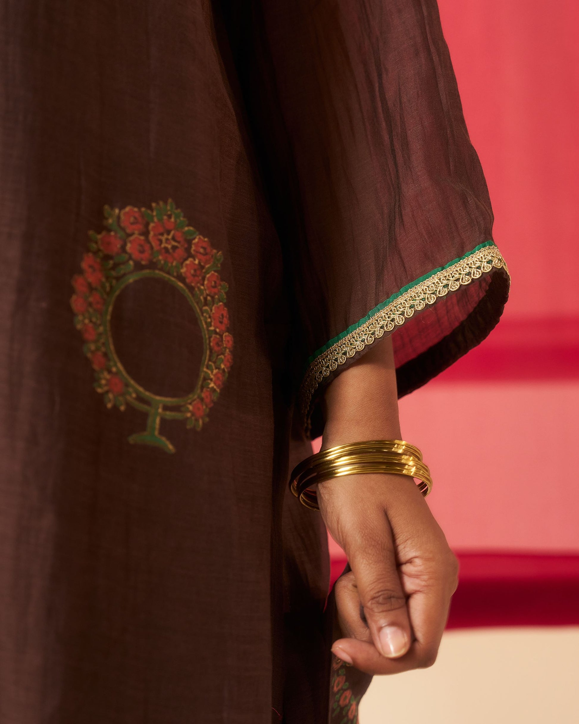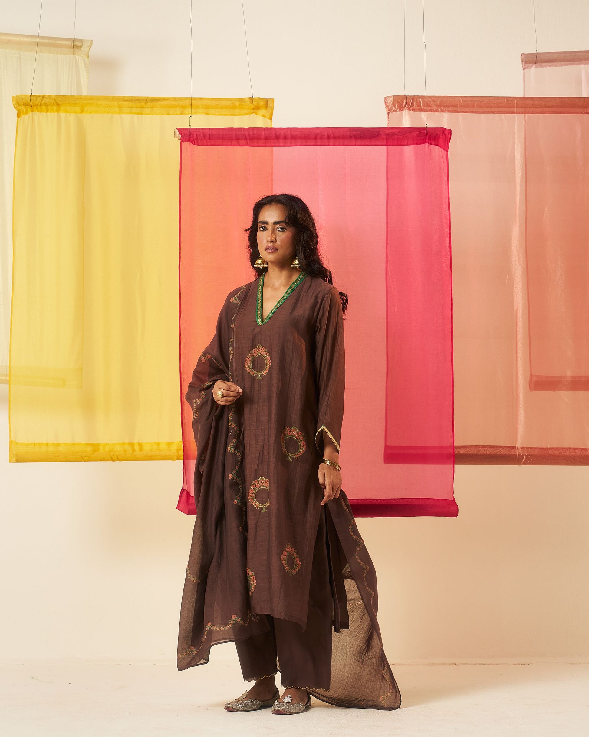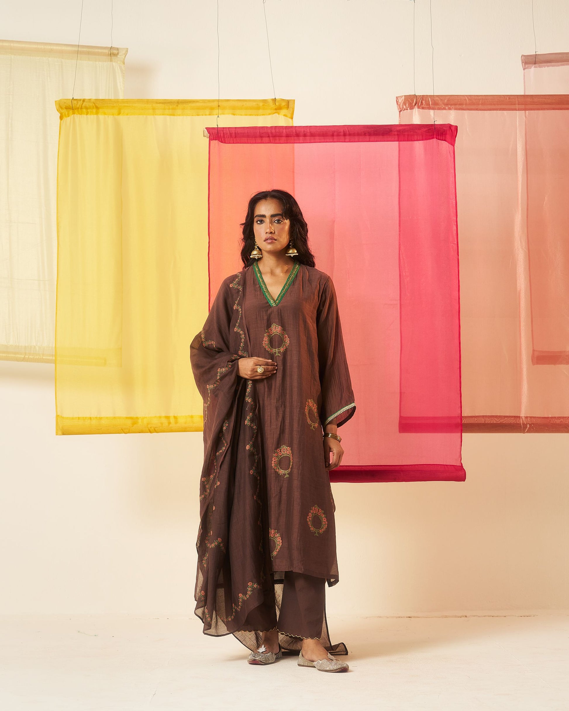 Mehraab print brown hand block printed chanderi dabka work kurta set.