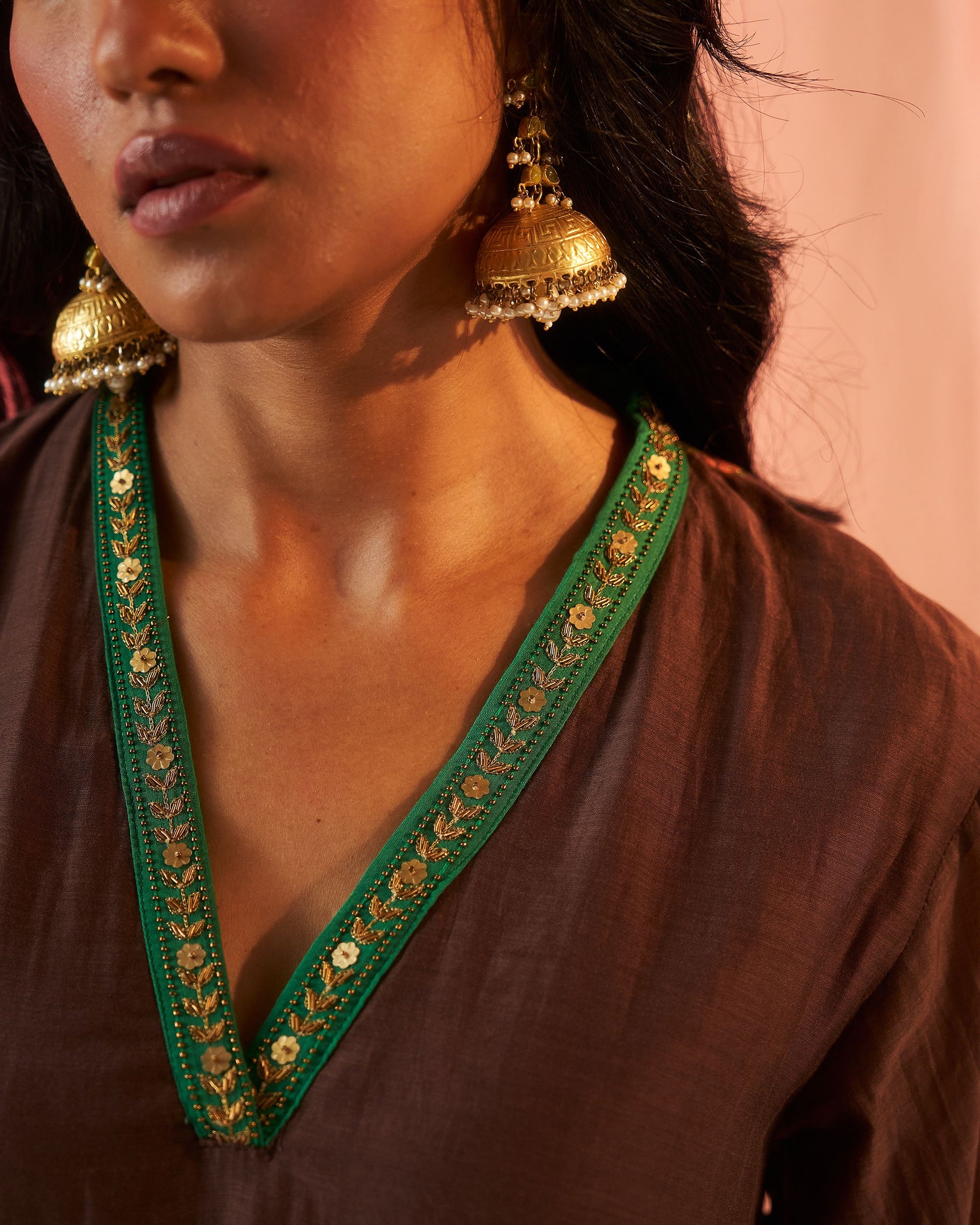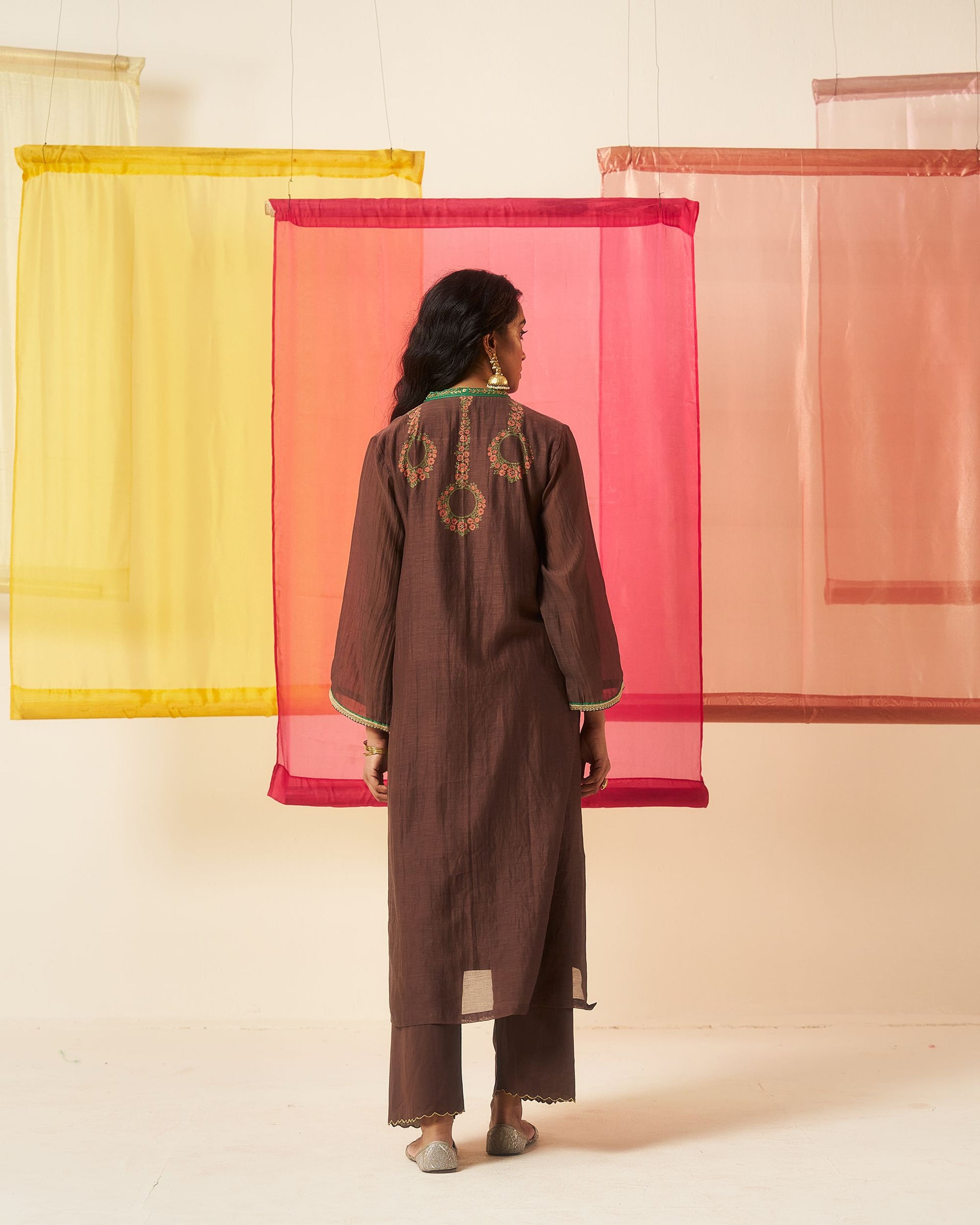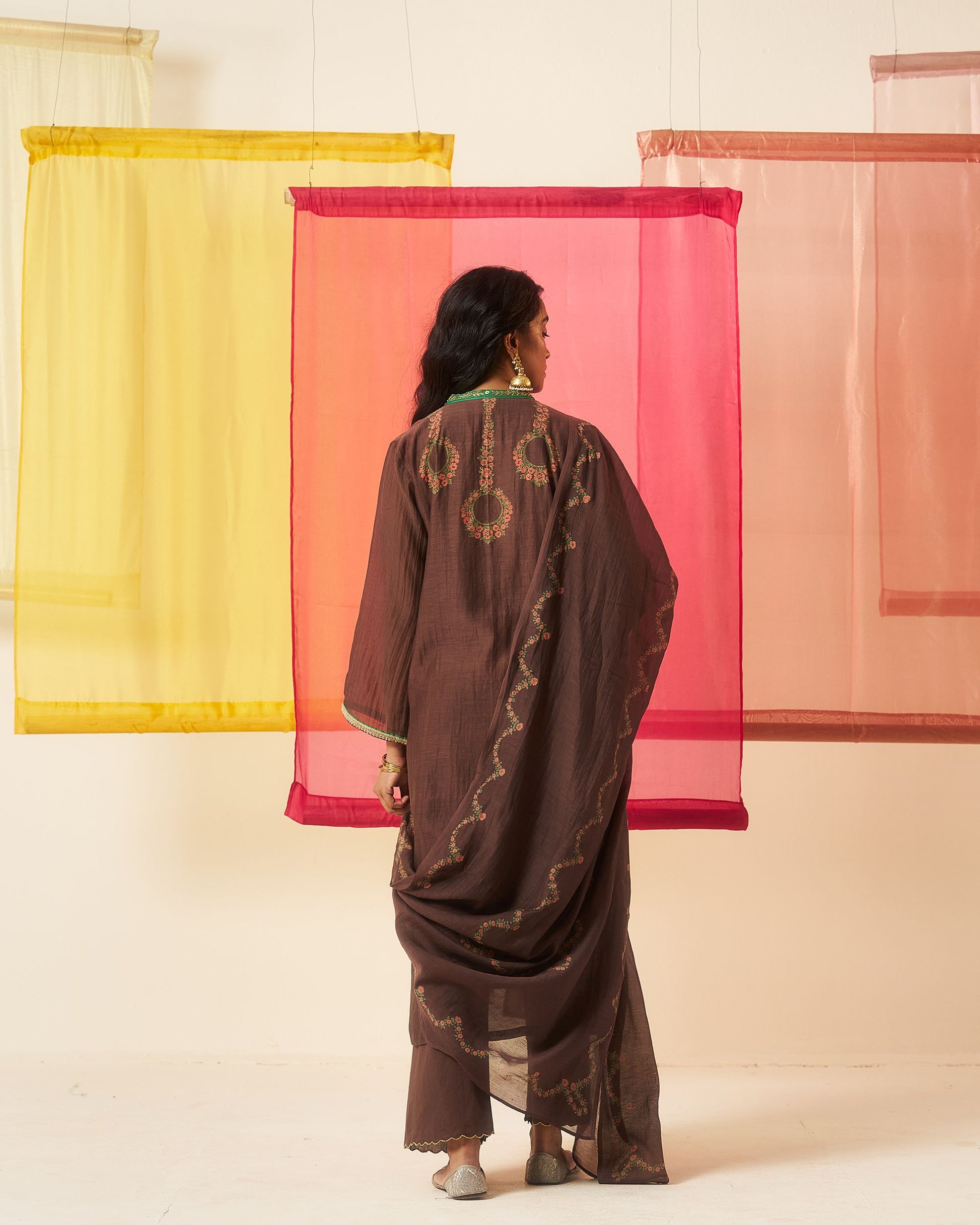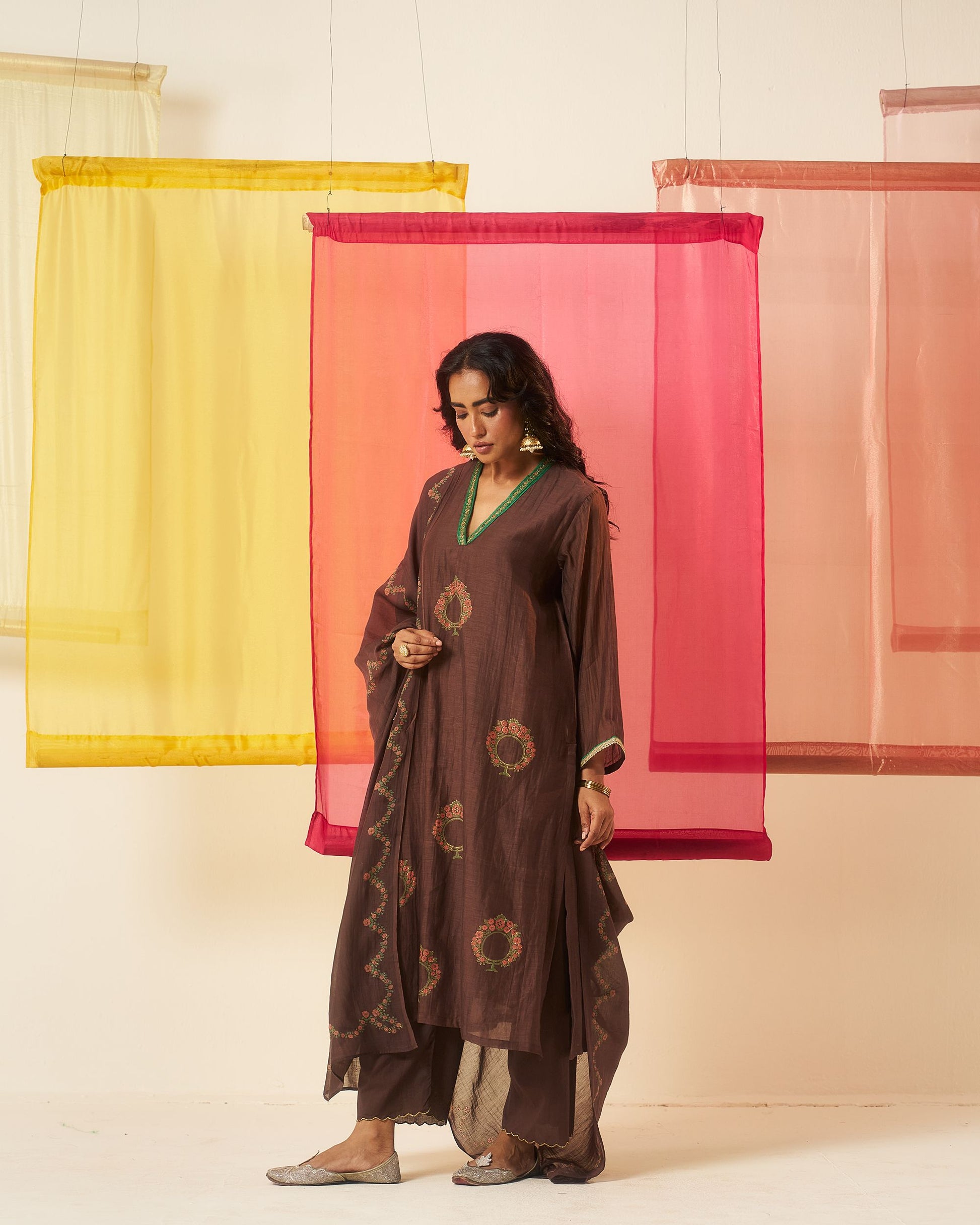Mehraab print brown hand block printed chanderi dabka work kurta set.