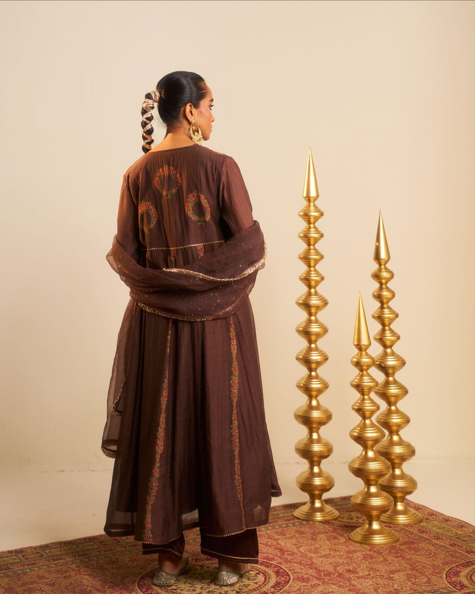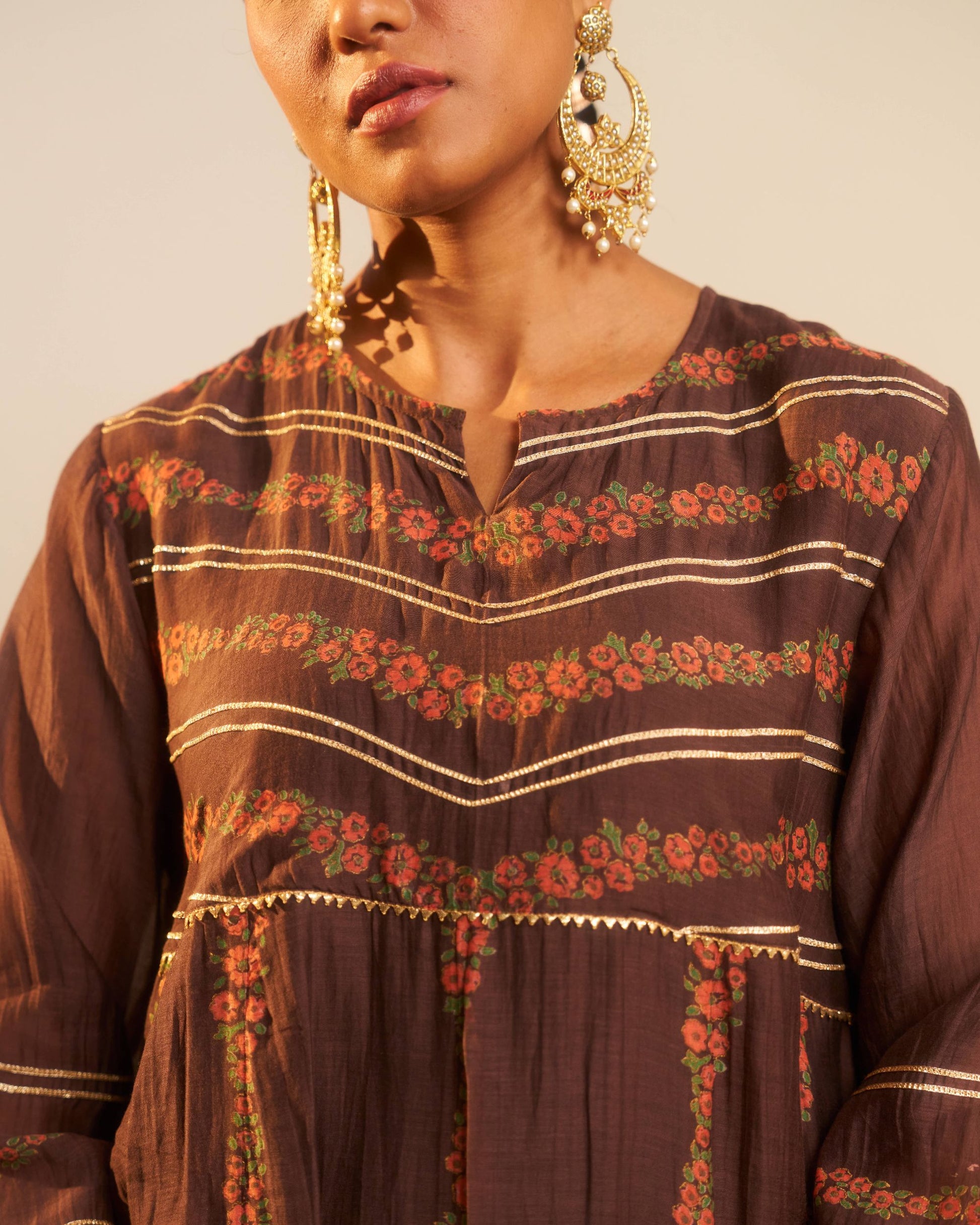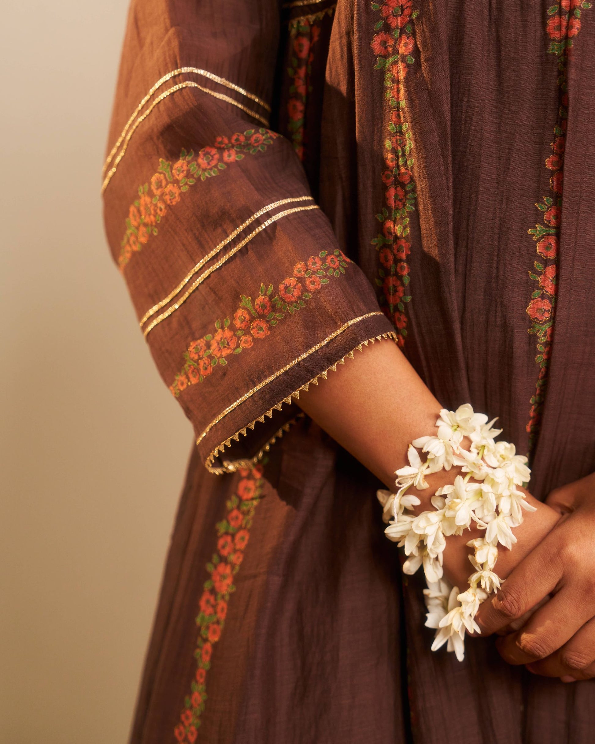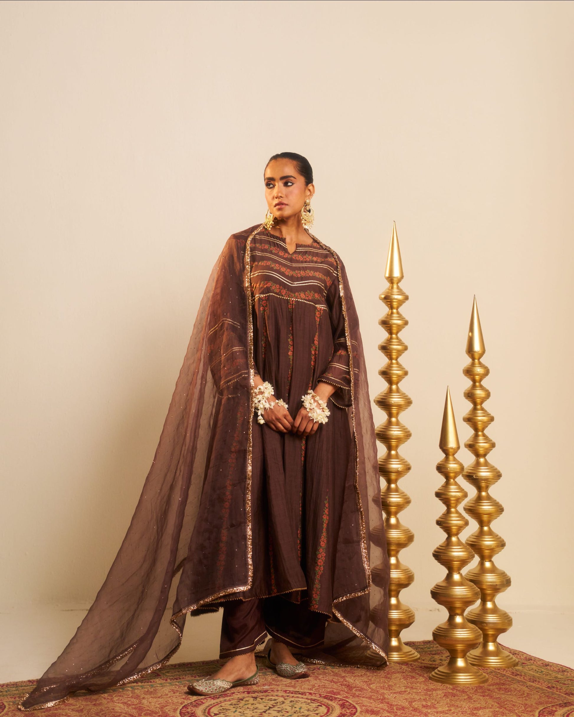 Mehrab brown hand block printed gota work chanderi anarkali kurta set.
