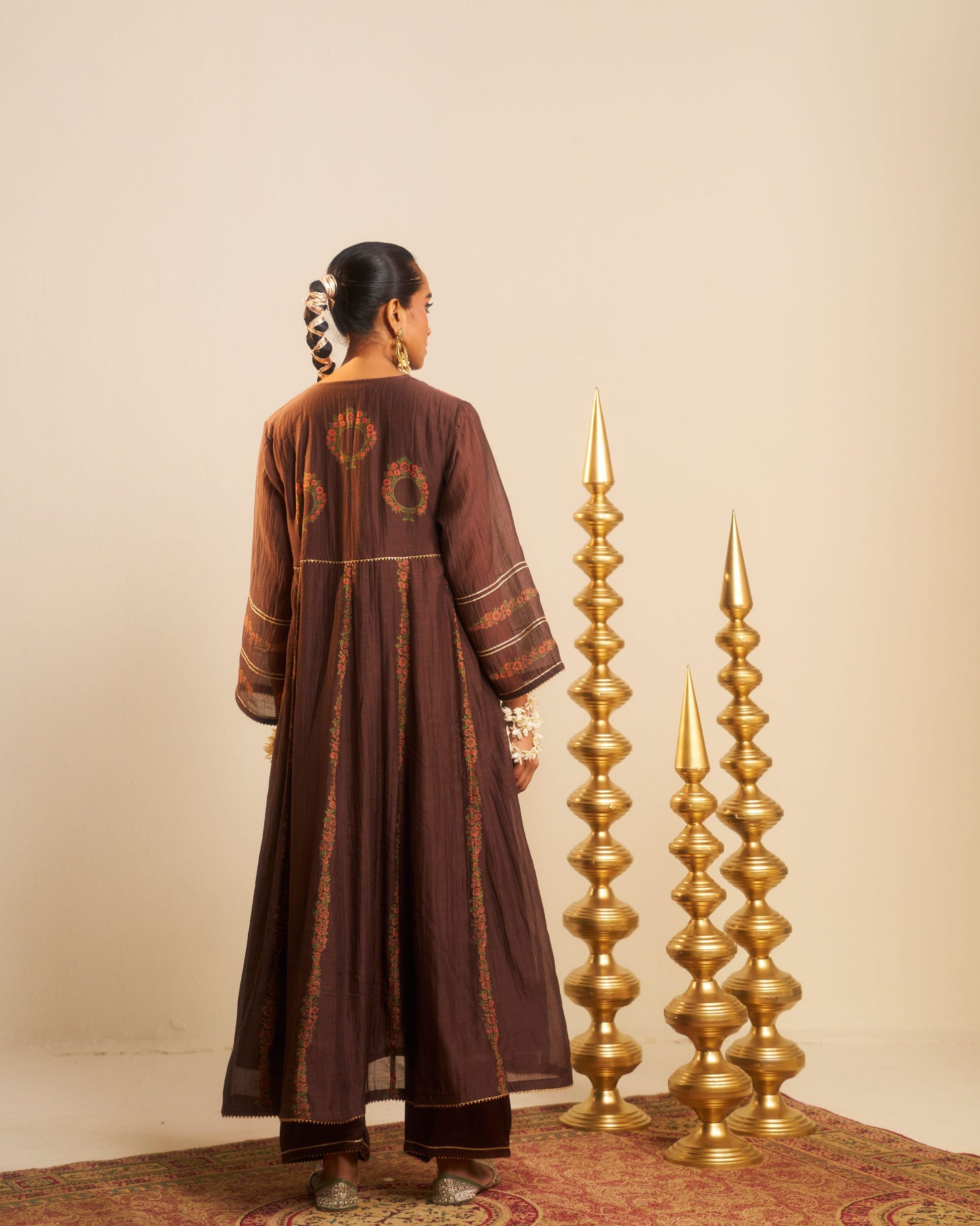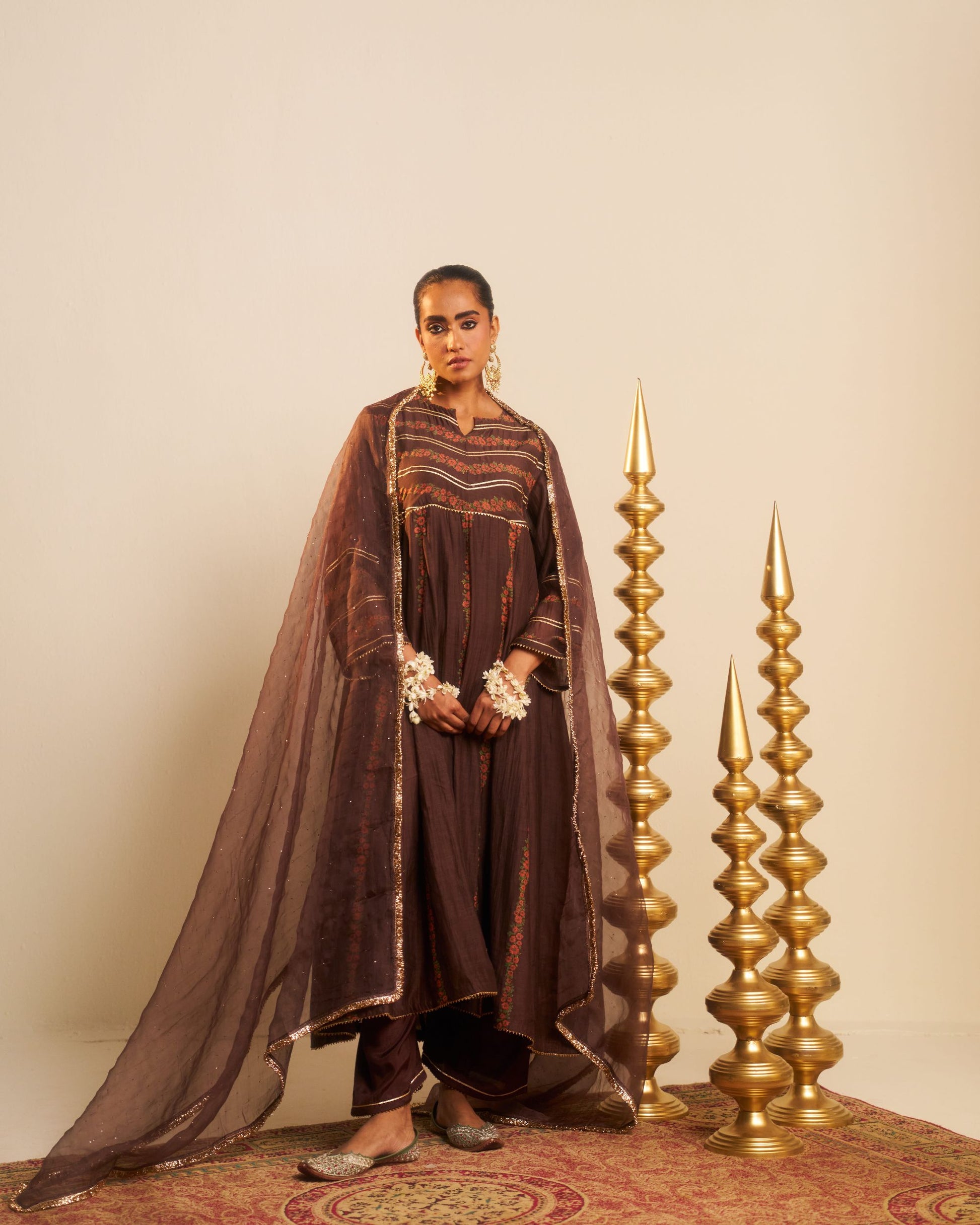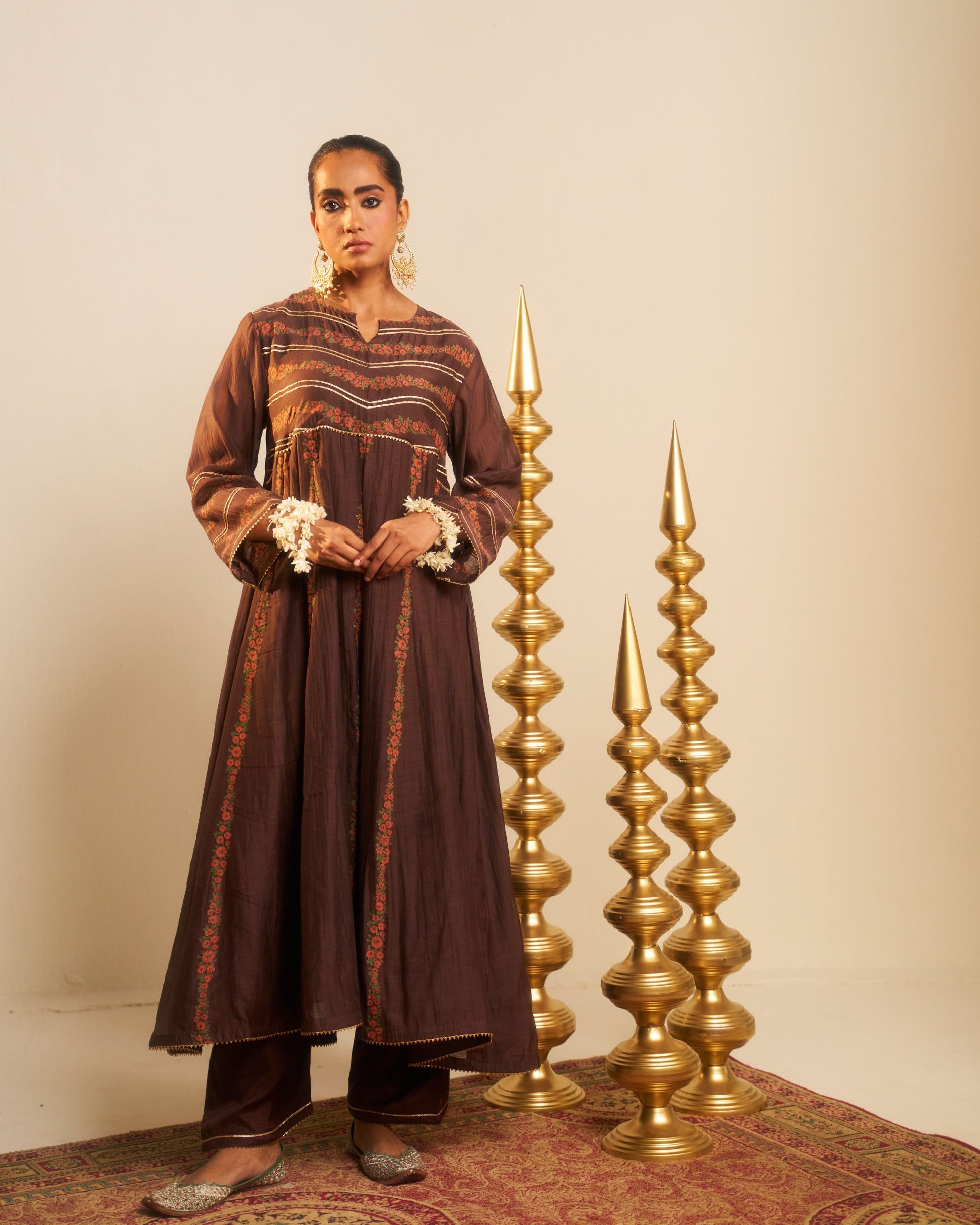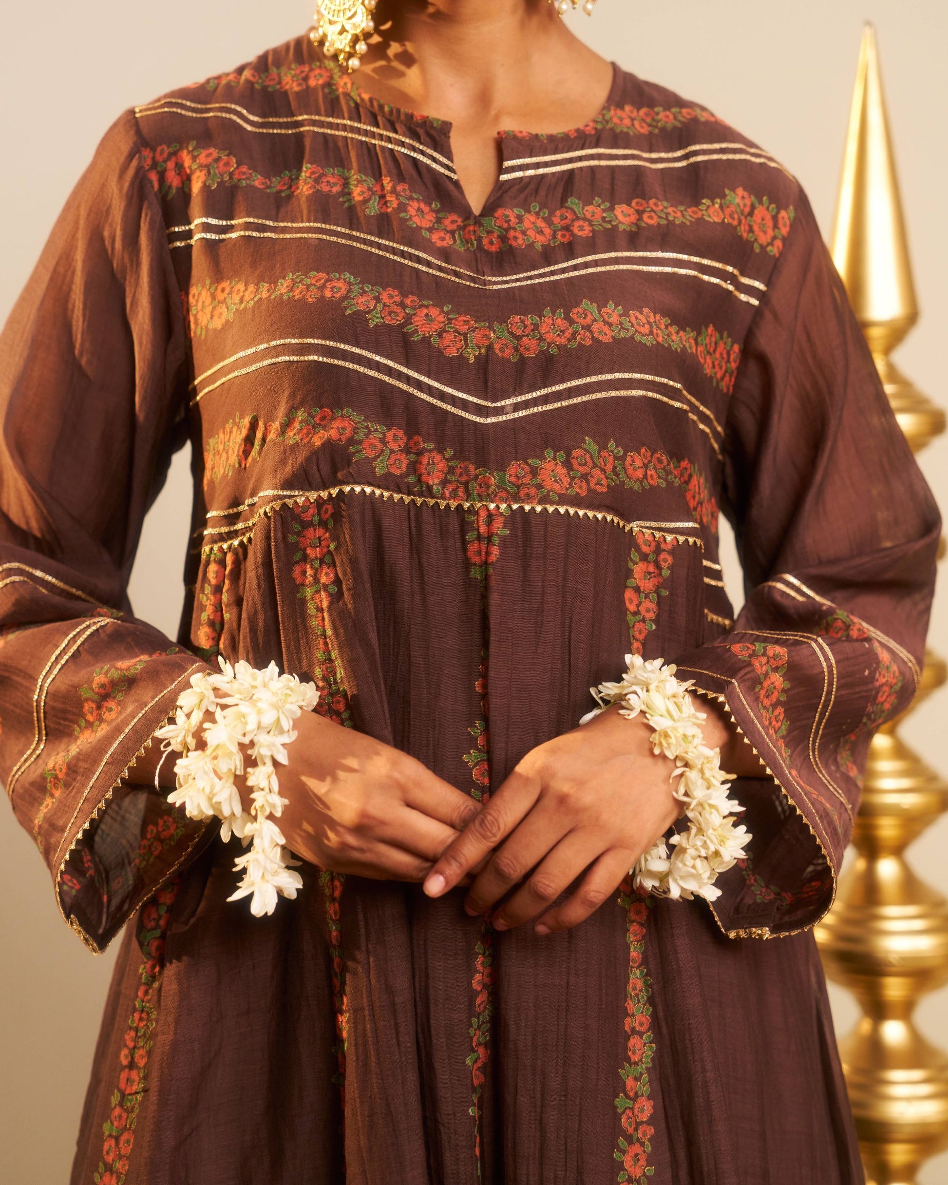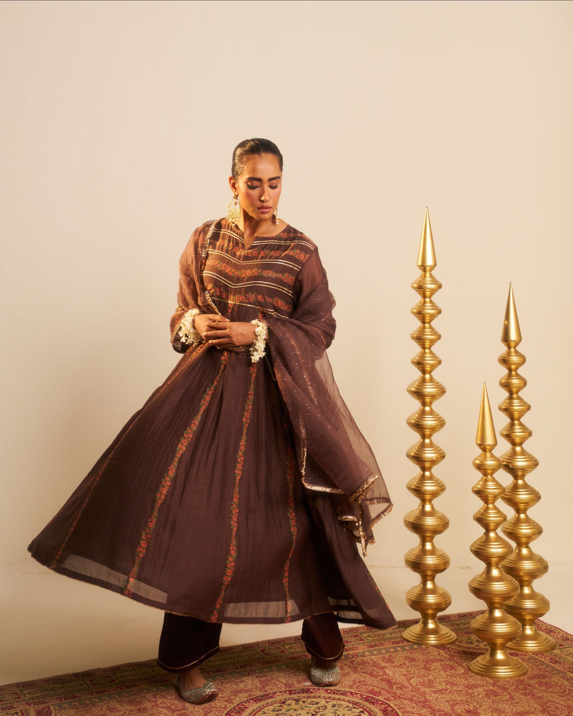 Mehrab brown hand block printed gota work chanderi anarkali kurta set.
