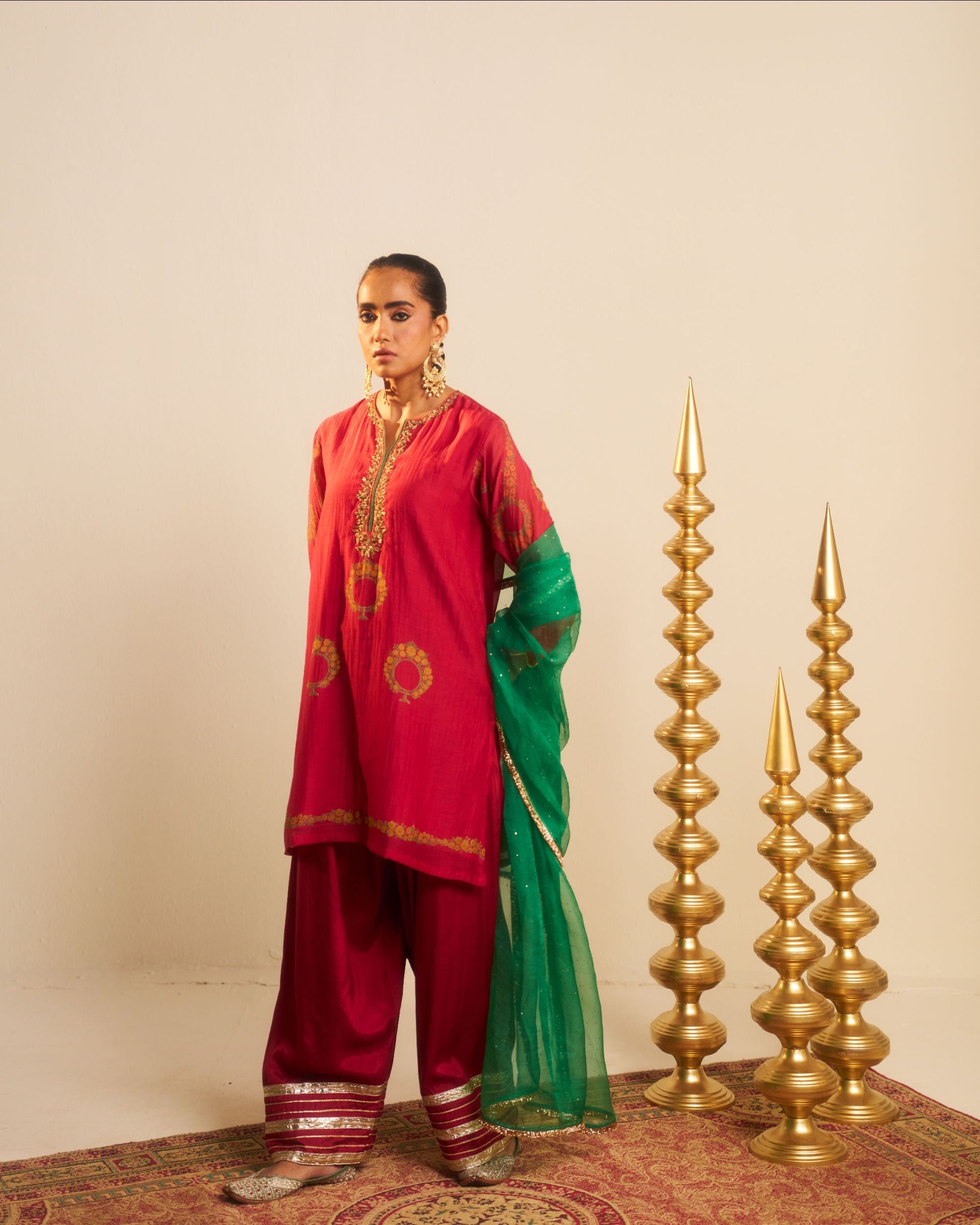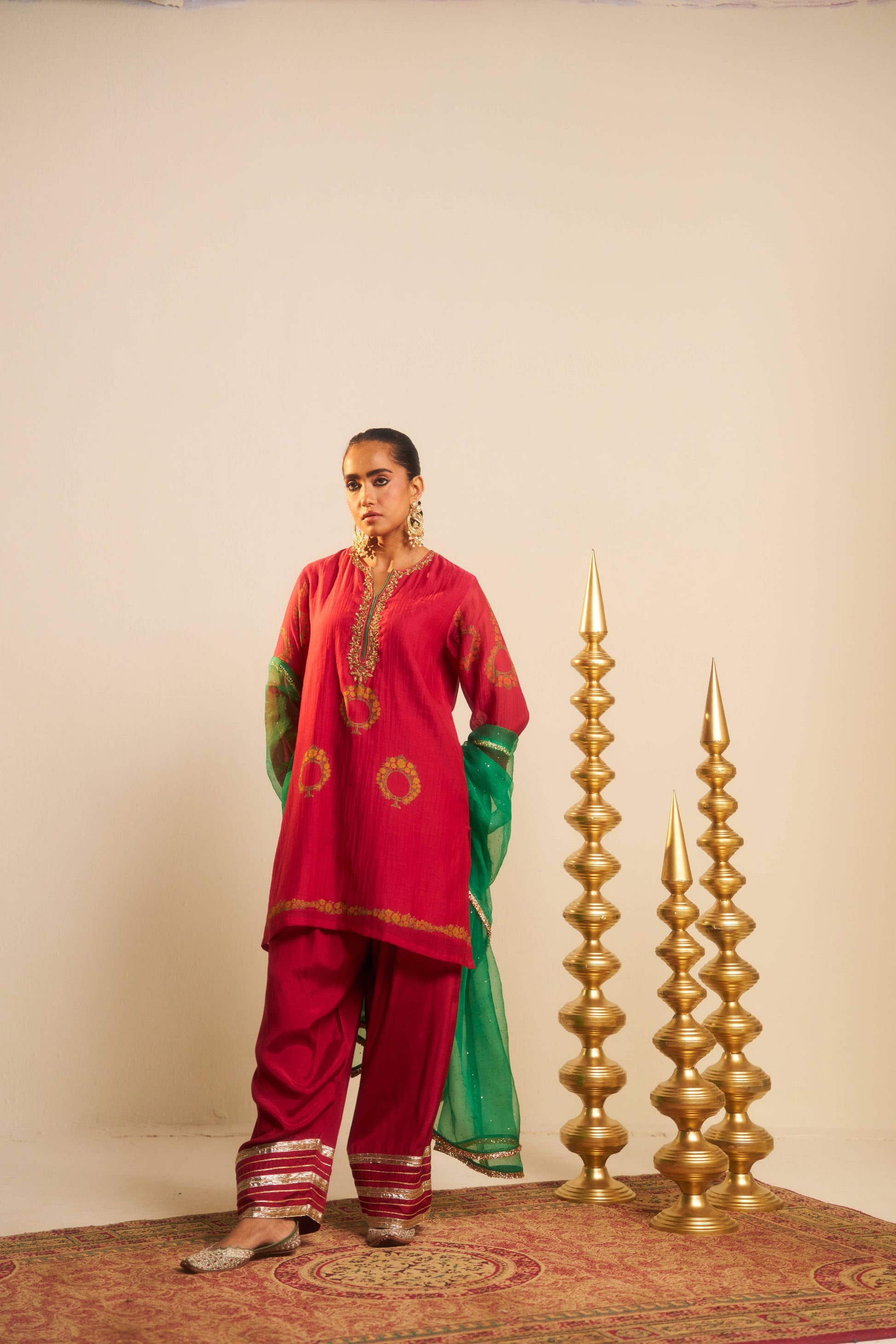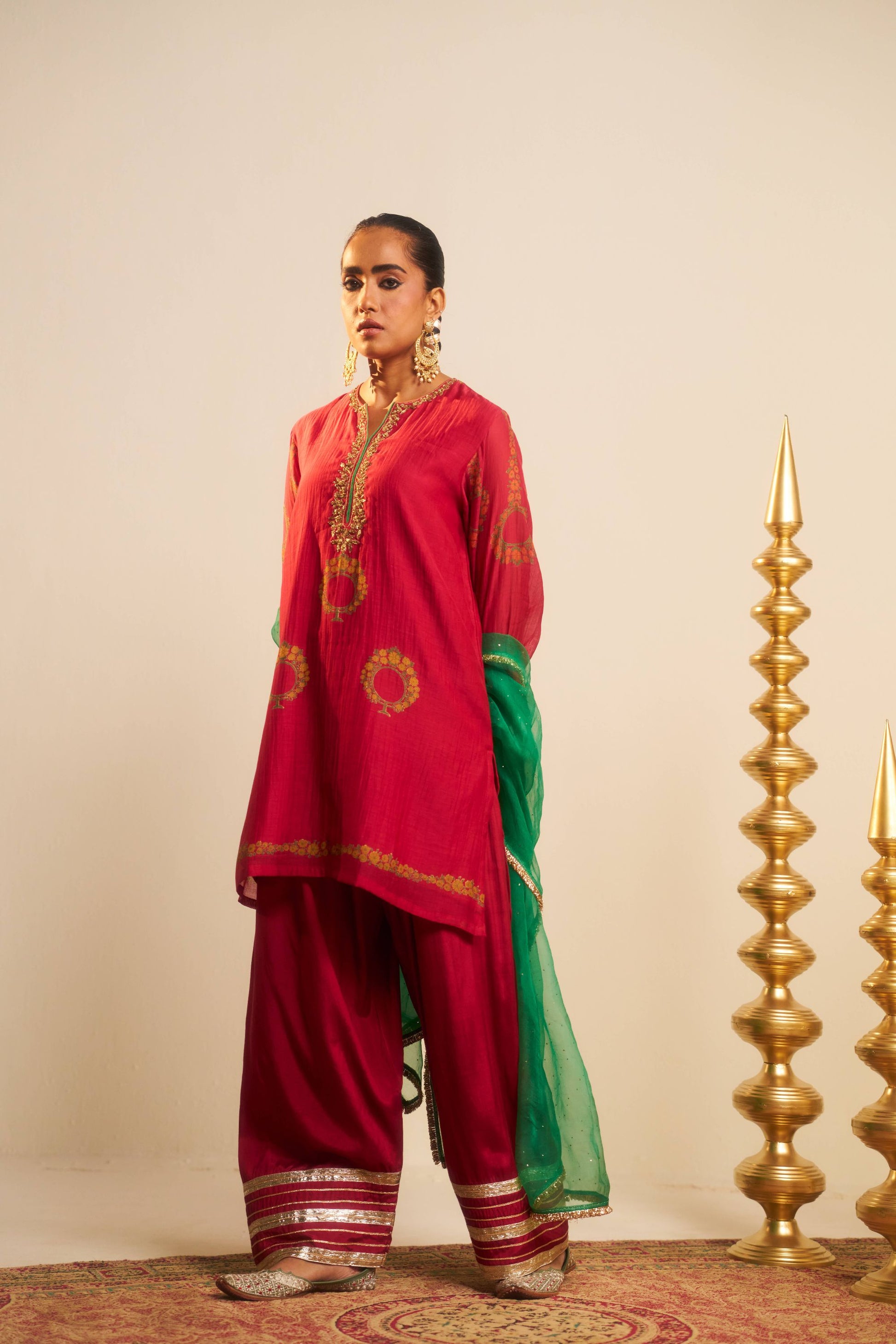 Mehrab fuschia hand dabka embroidered chanderi farshi set.