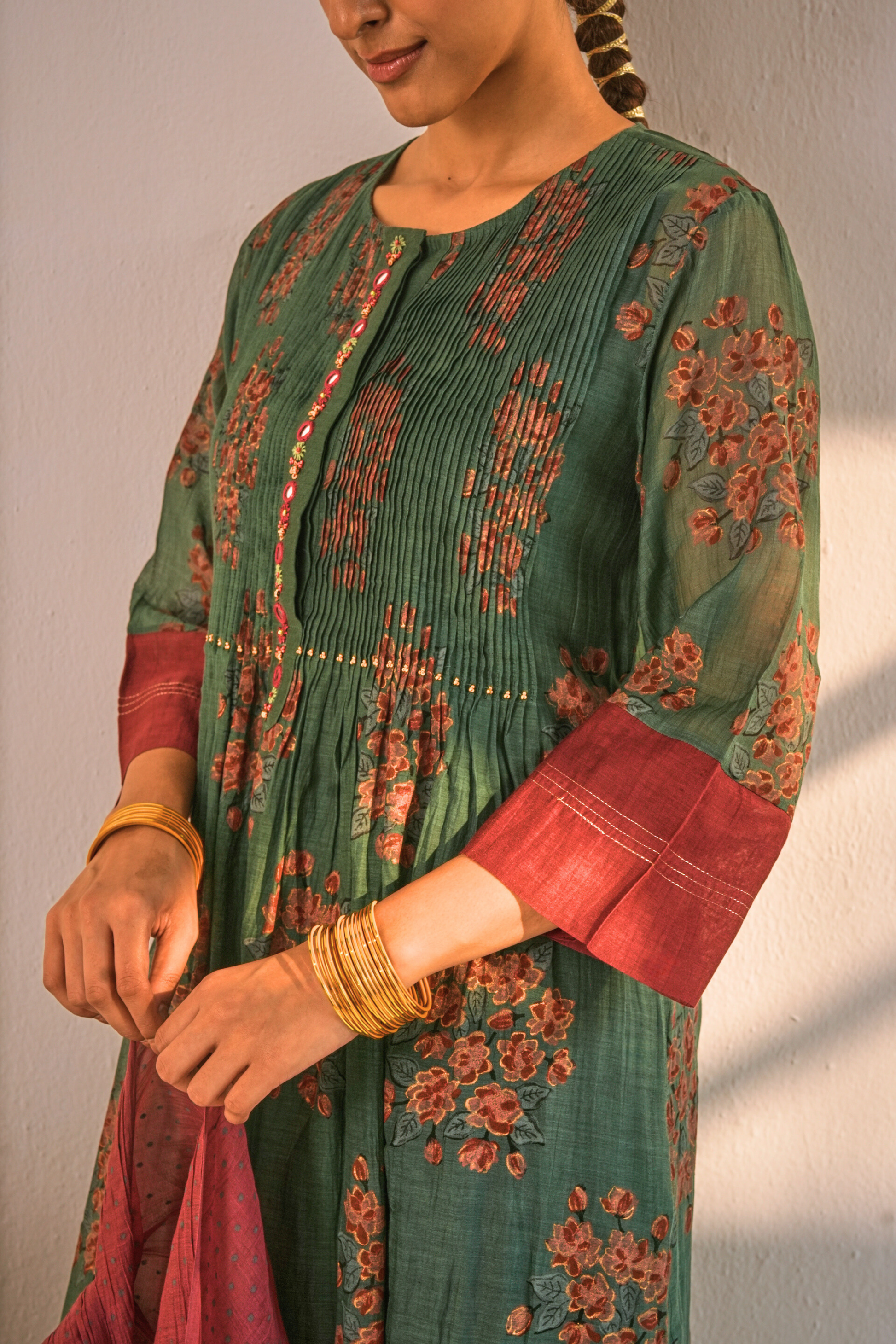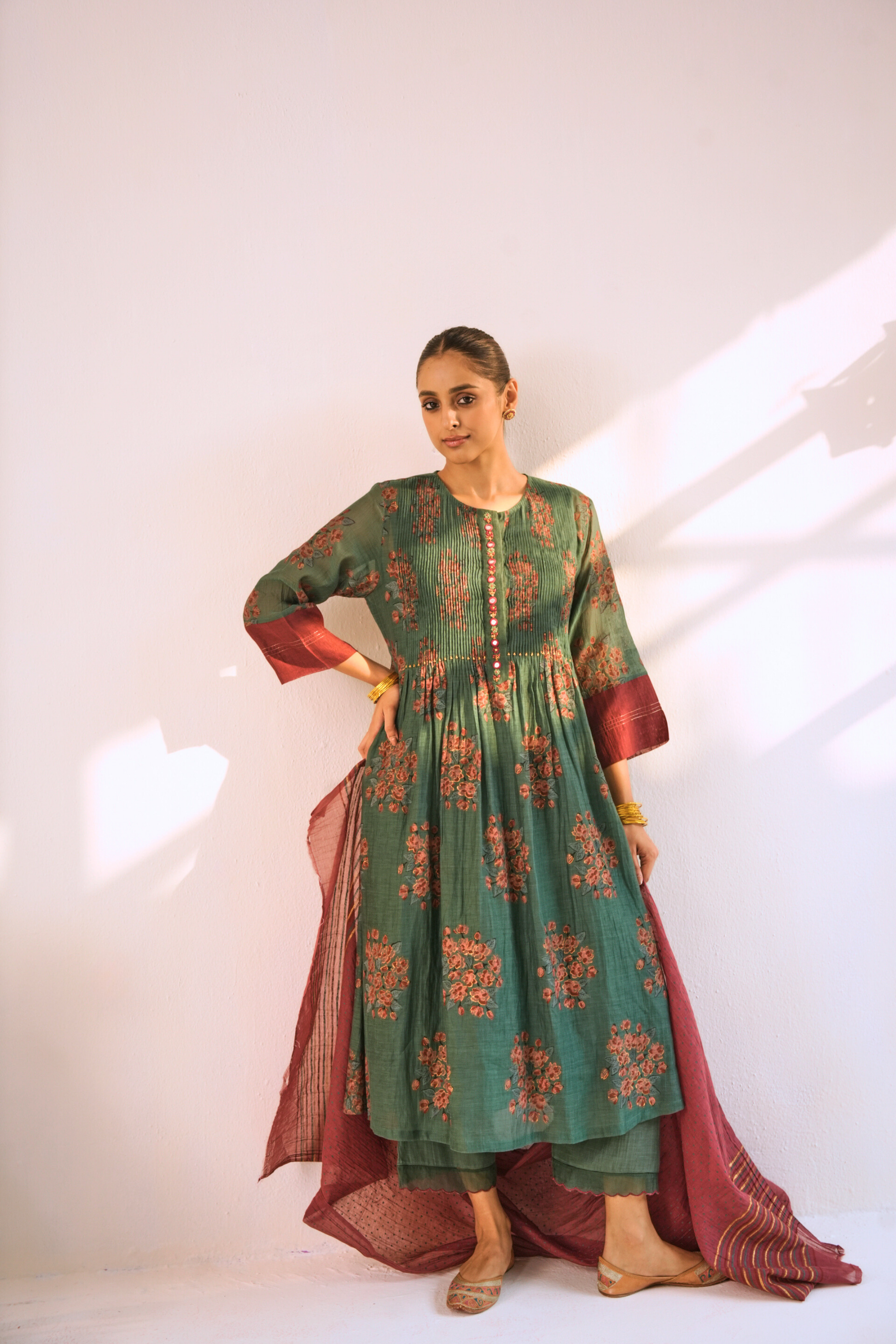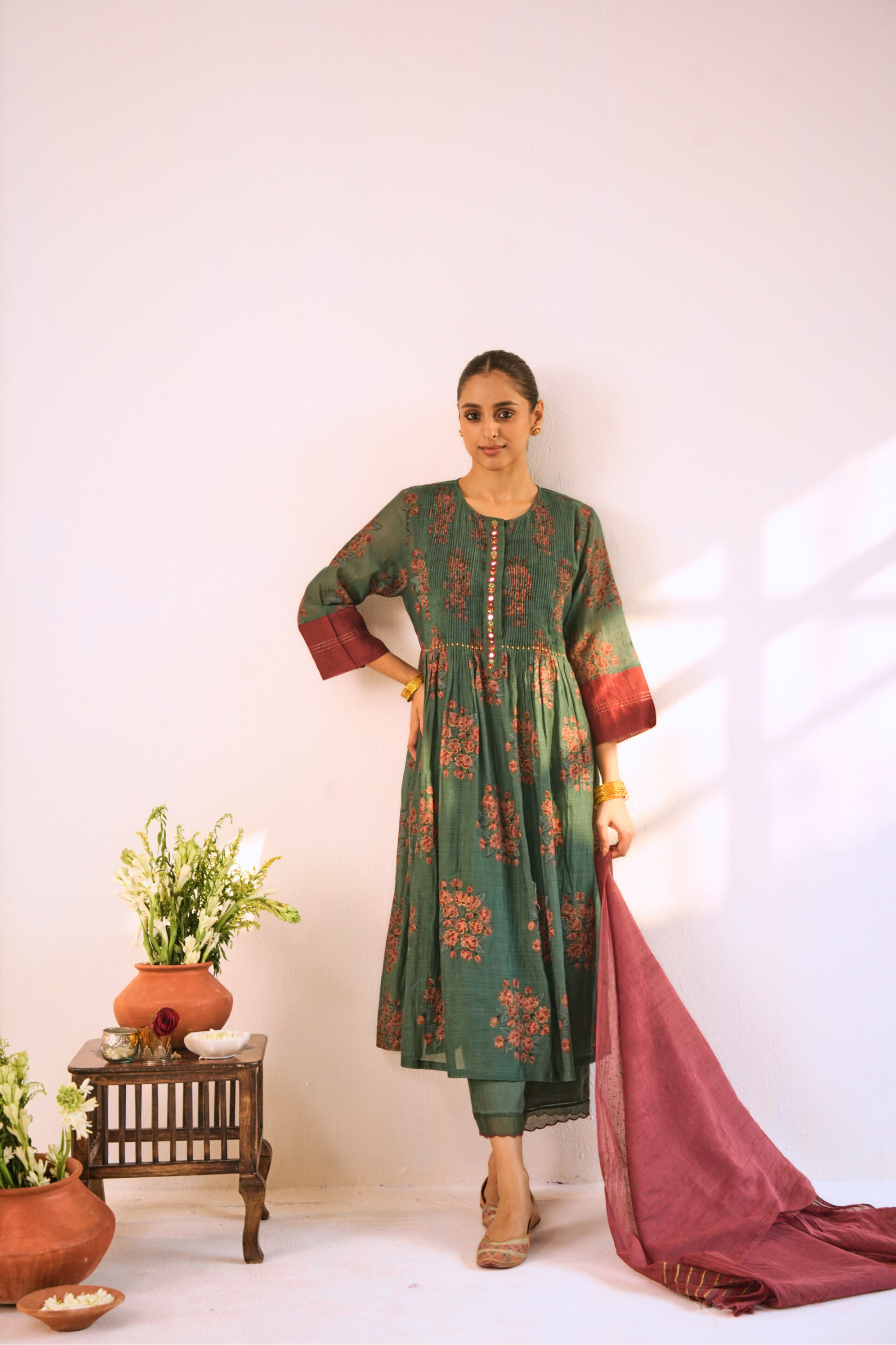 Mogra aqua hand block printed pintuck chanderi kurta set (set of 3)