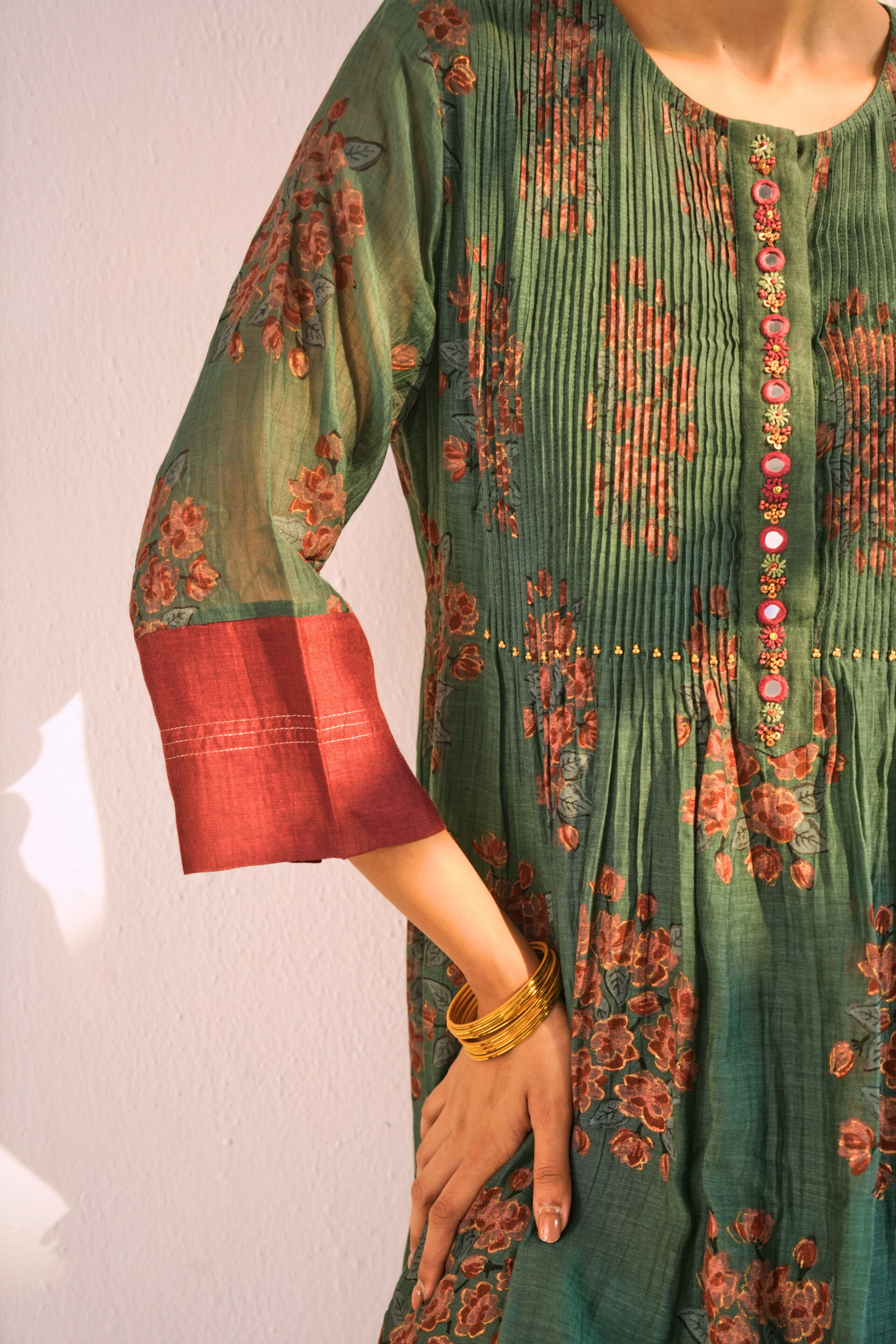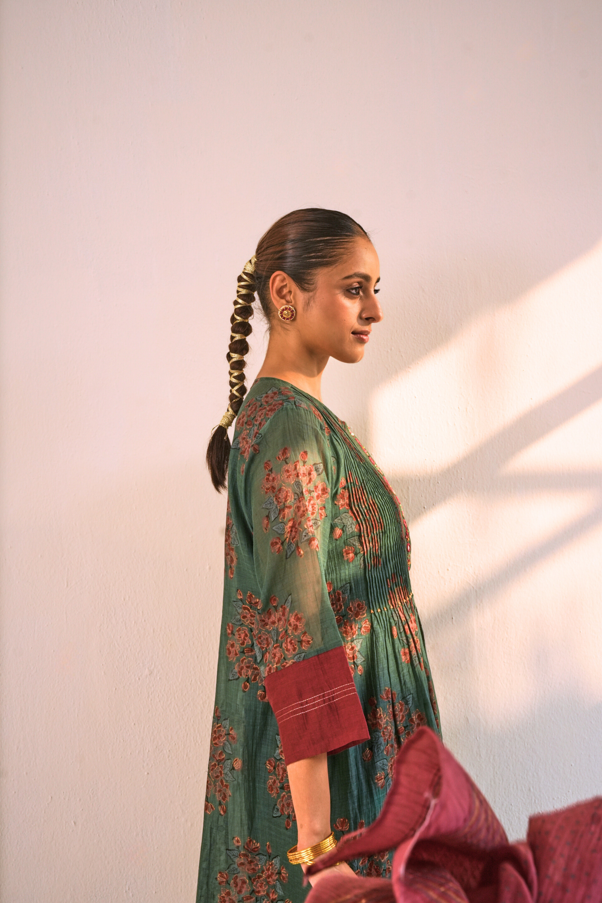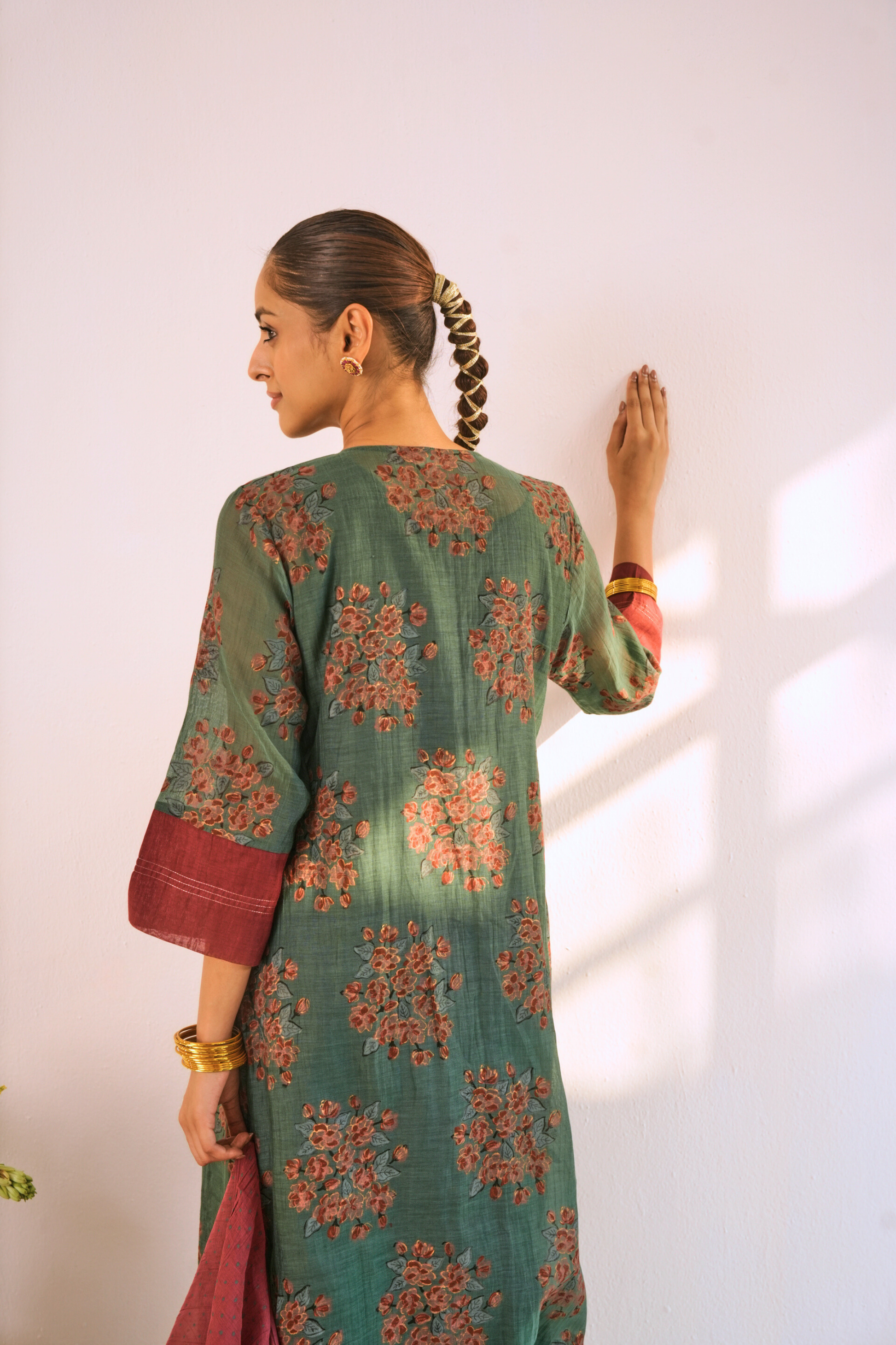 Mogra aqua hand block printed pintuck chanderi kurta set (set of 3)