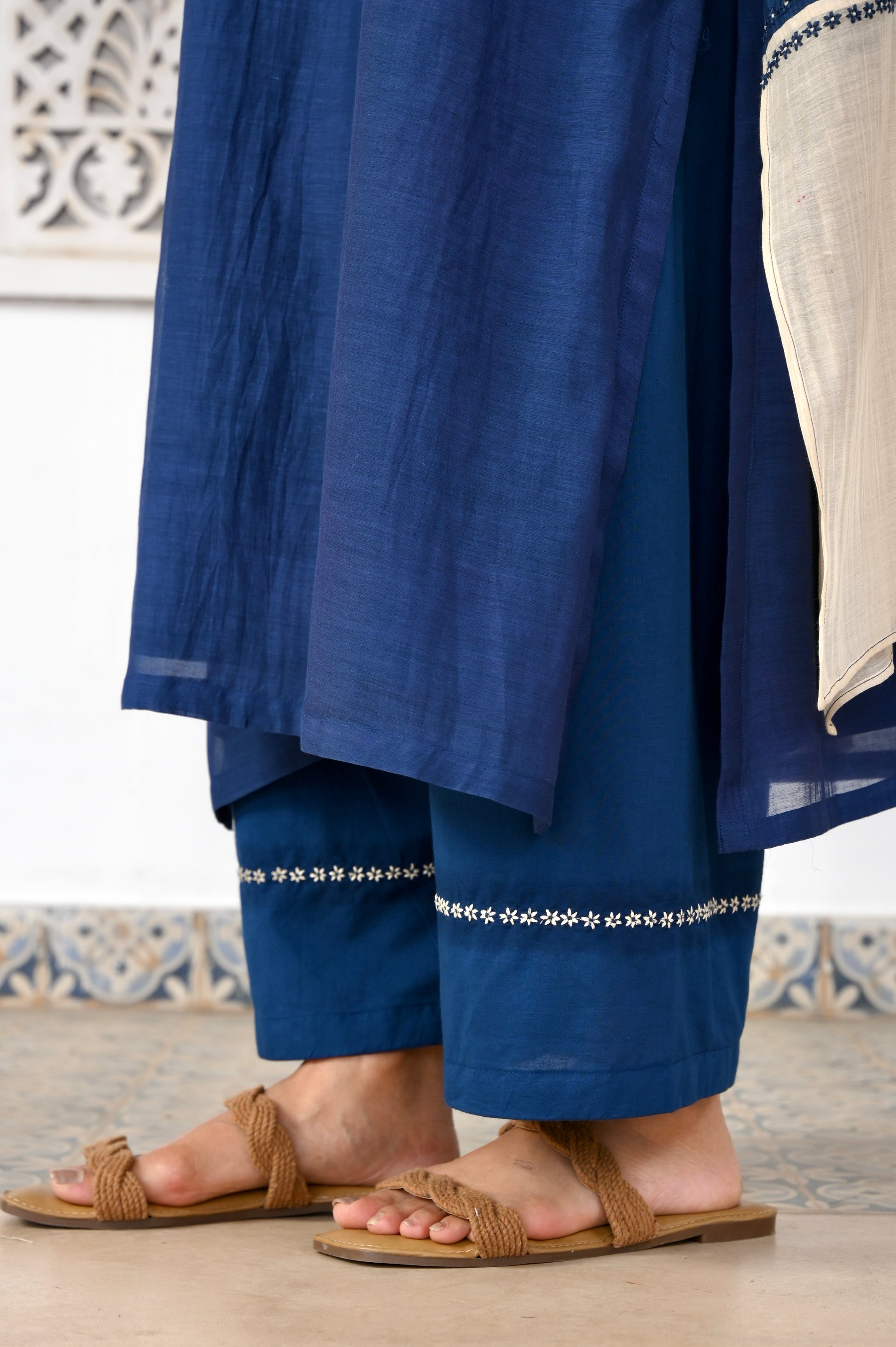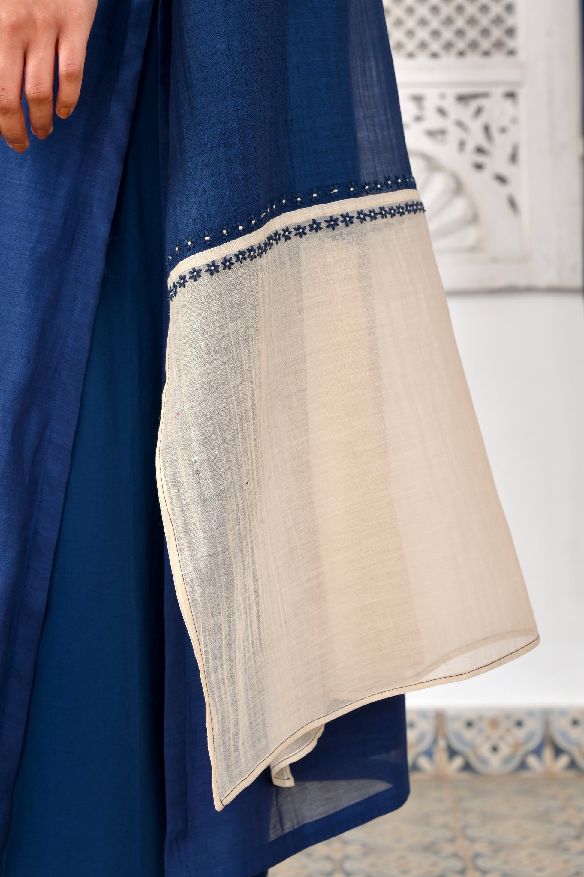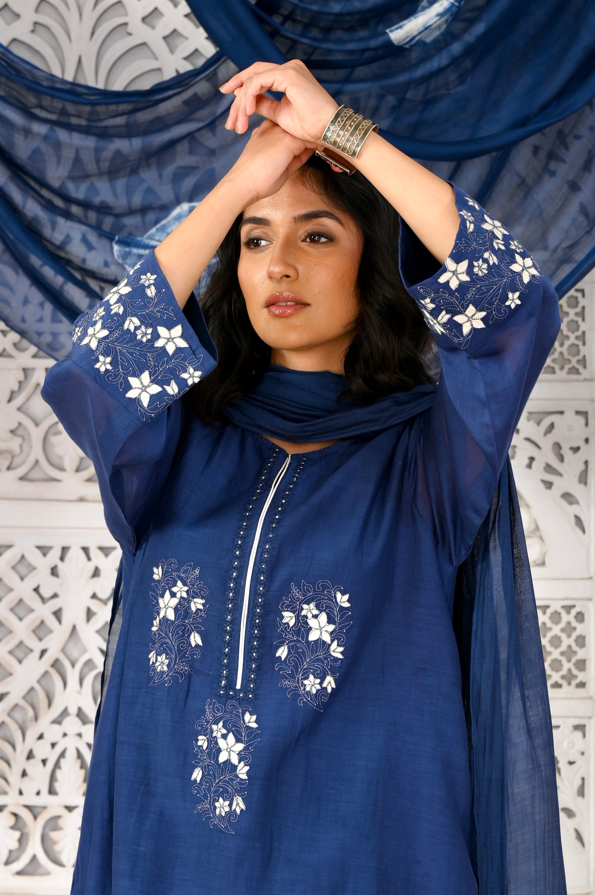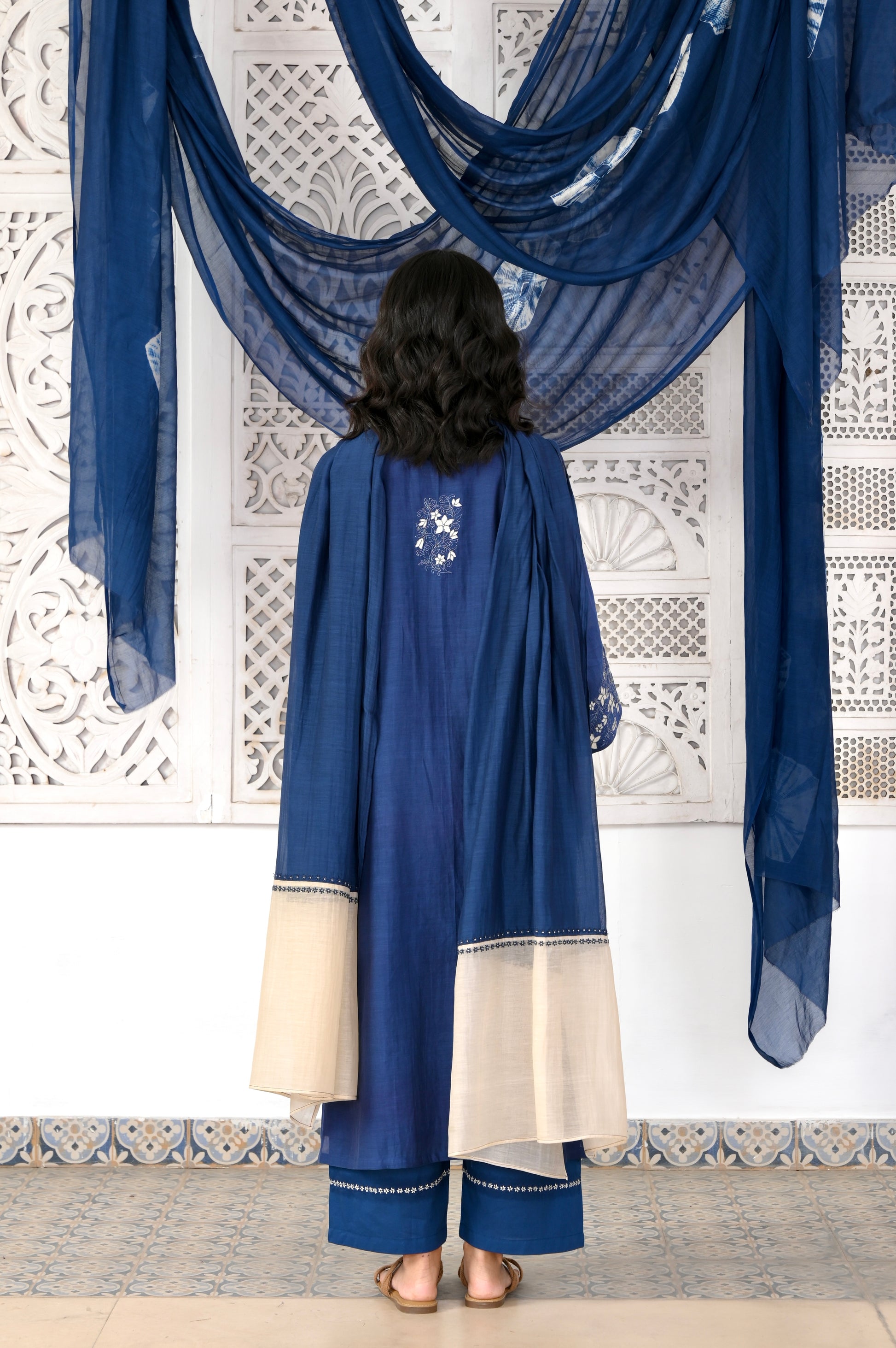 Mumtaz indigo applique hand embroidered chanderi kurta set