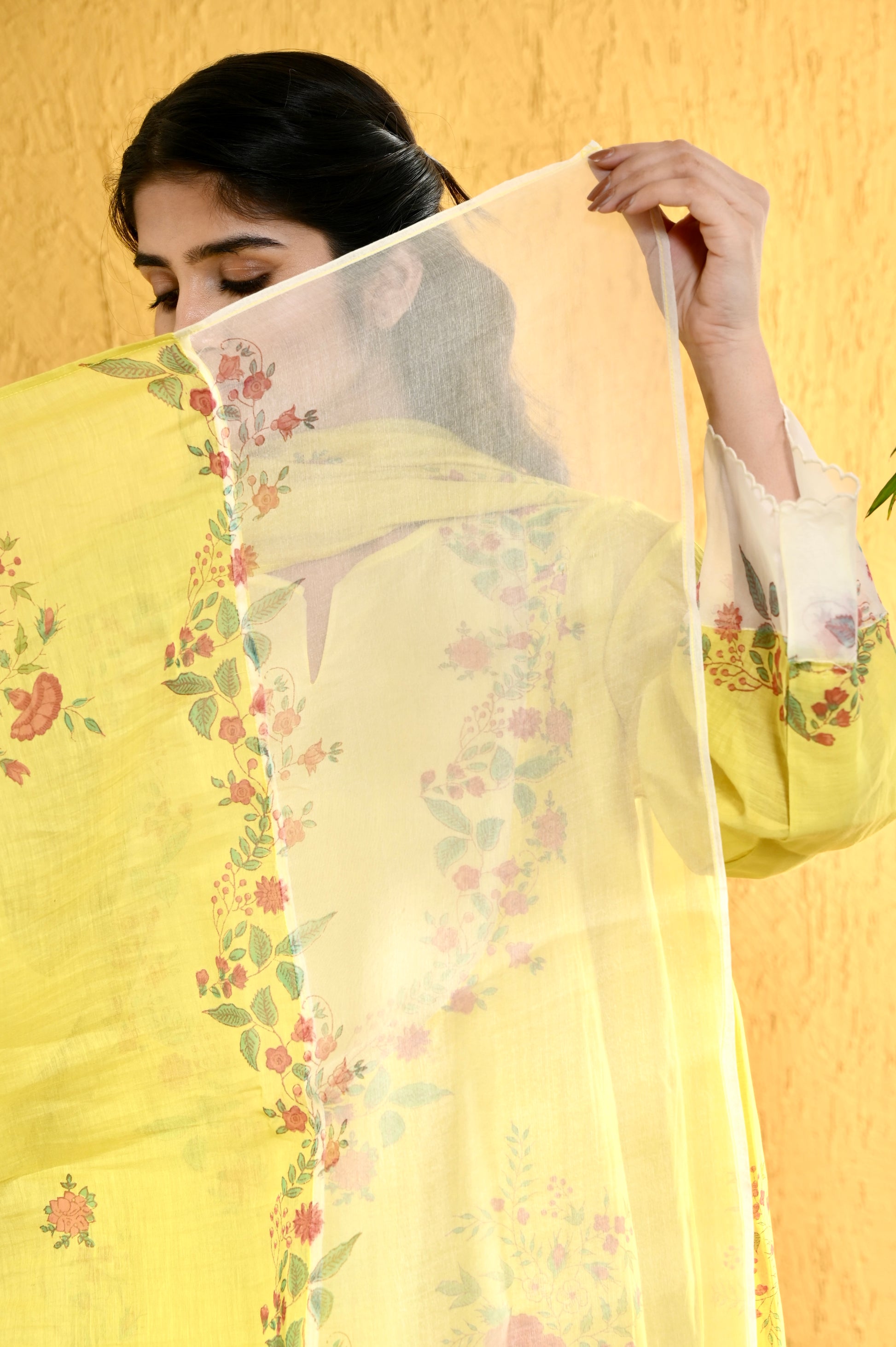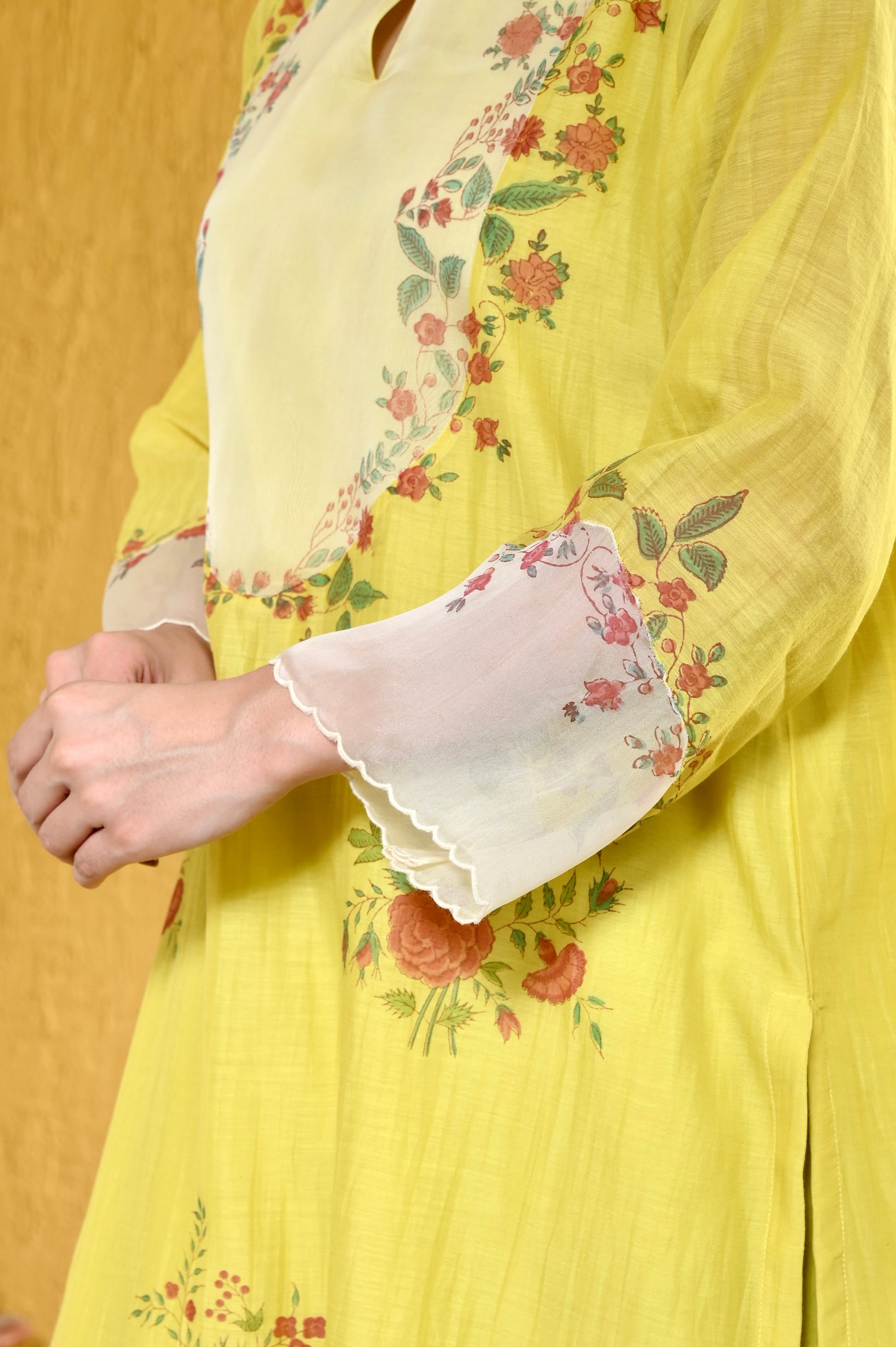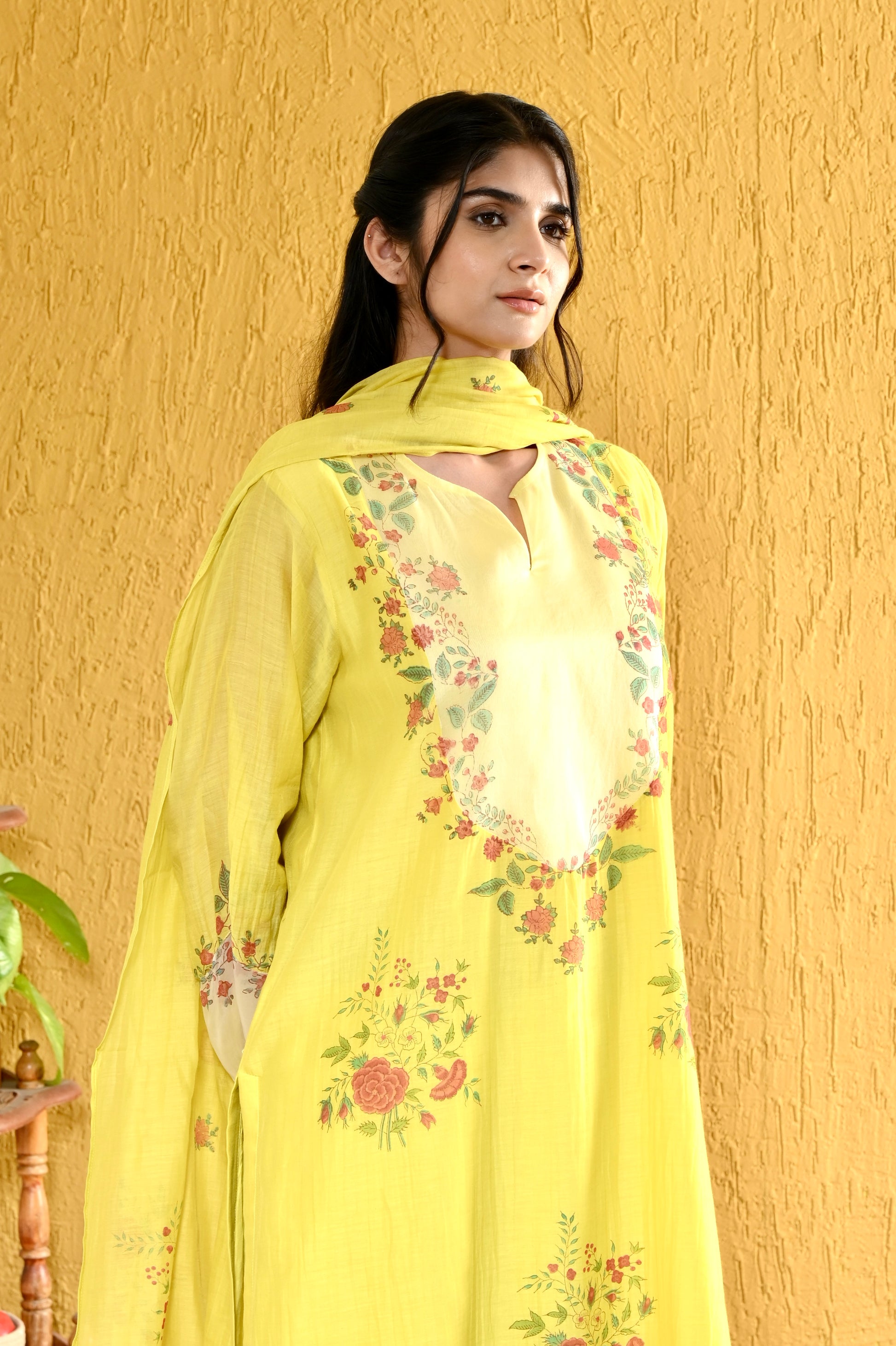 Nadley kosumi lime yellow hand block printed chanderi kurta set