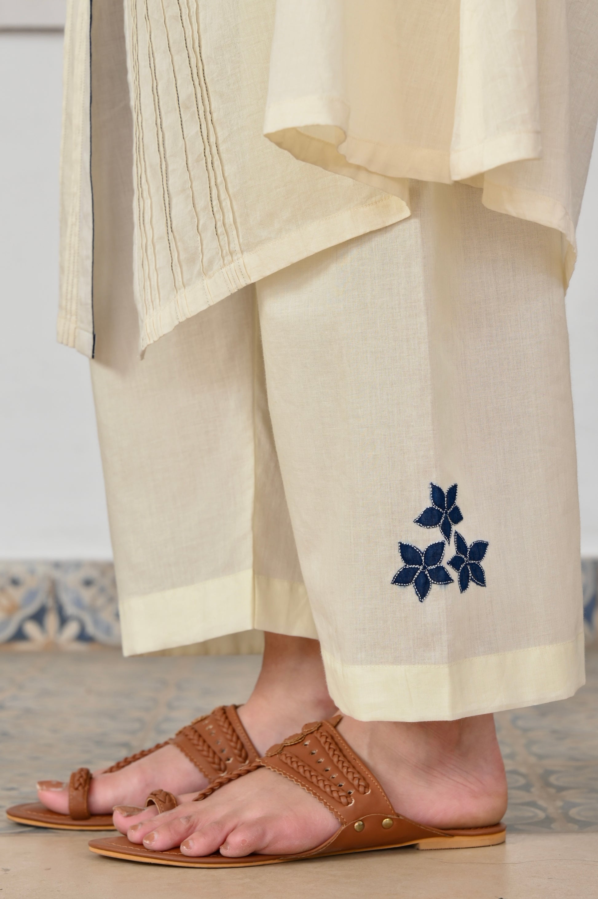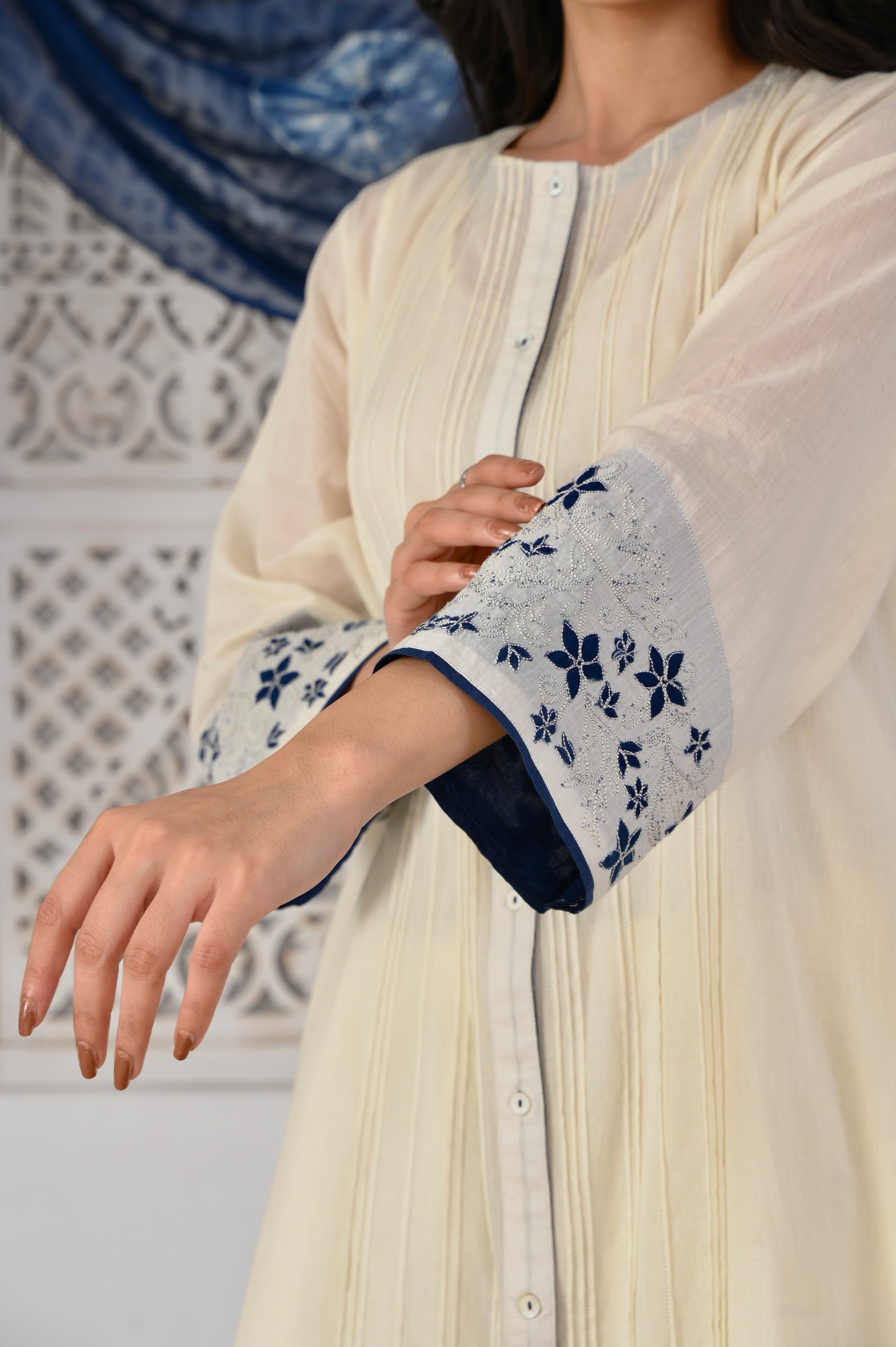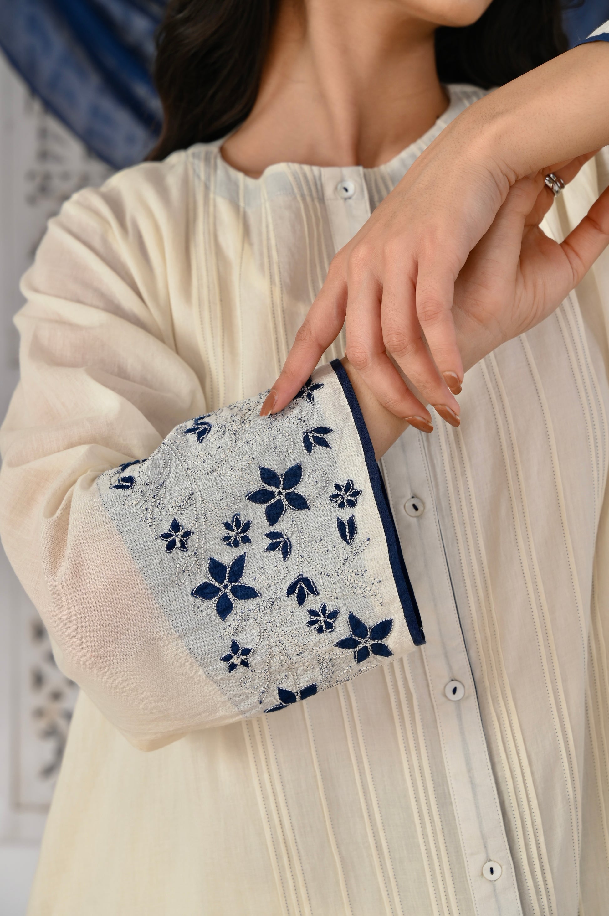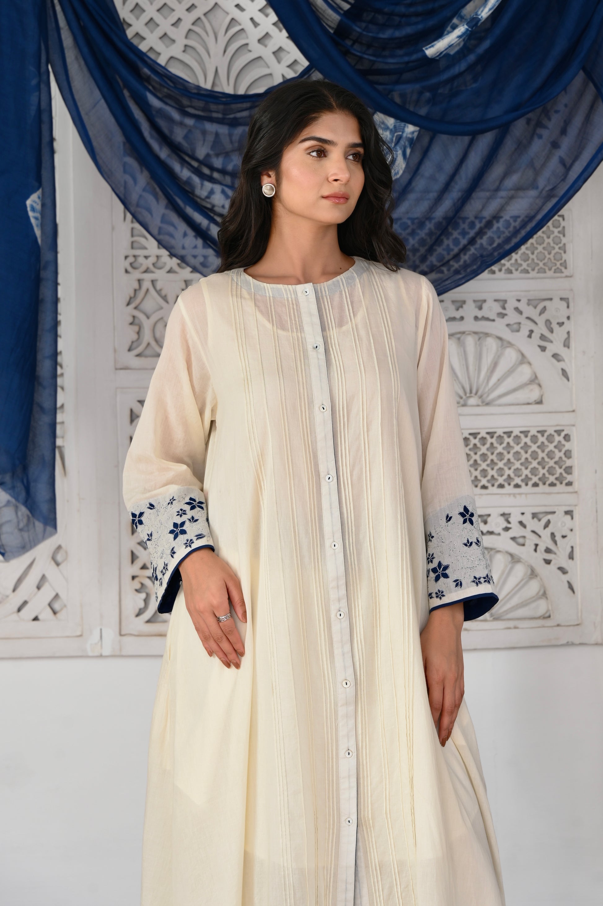 Neel ivory hand applique and pintuck mulmul kurta (Pant separate)