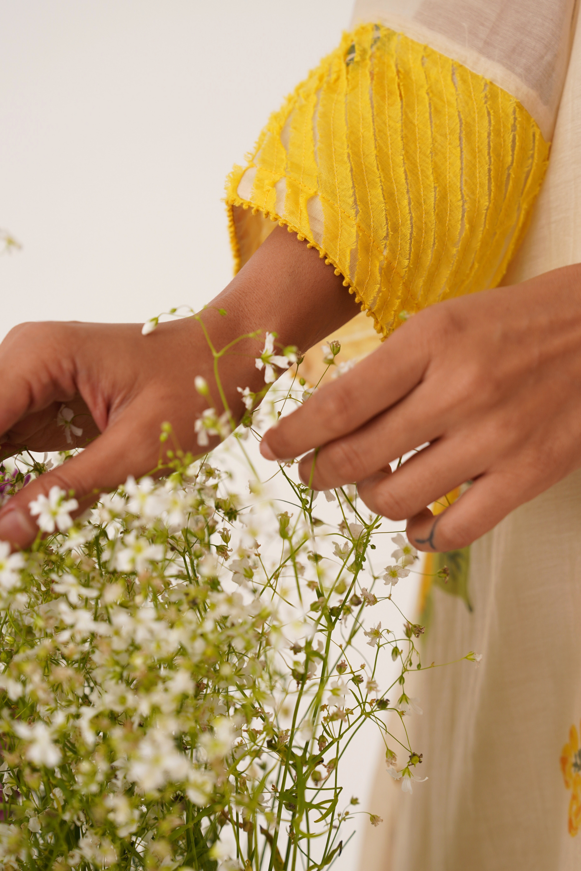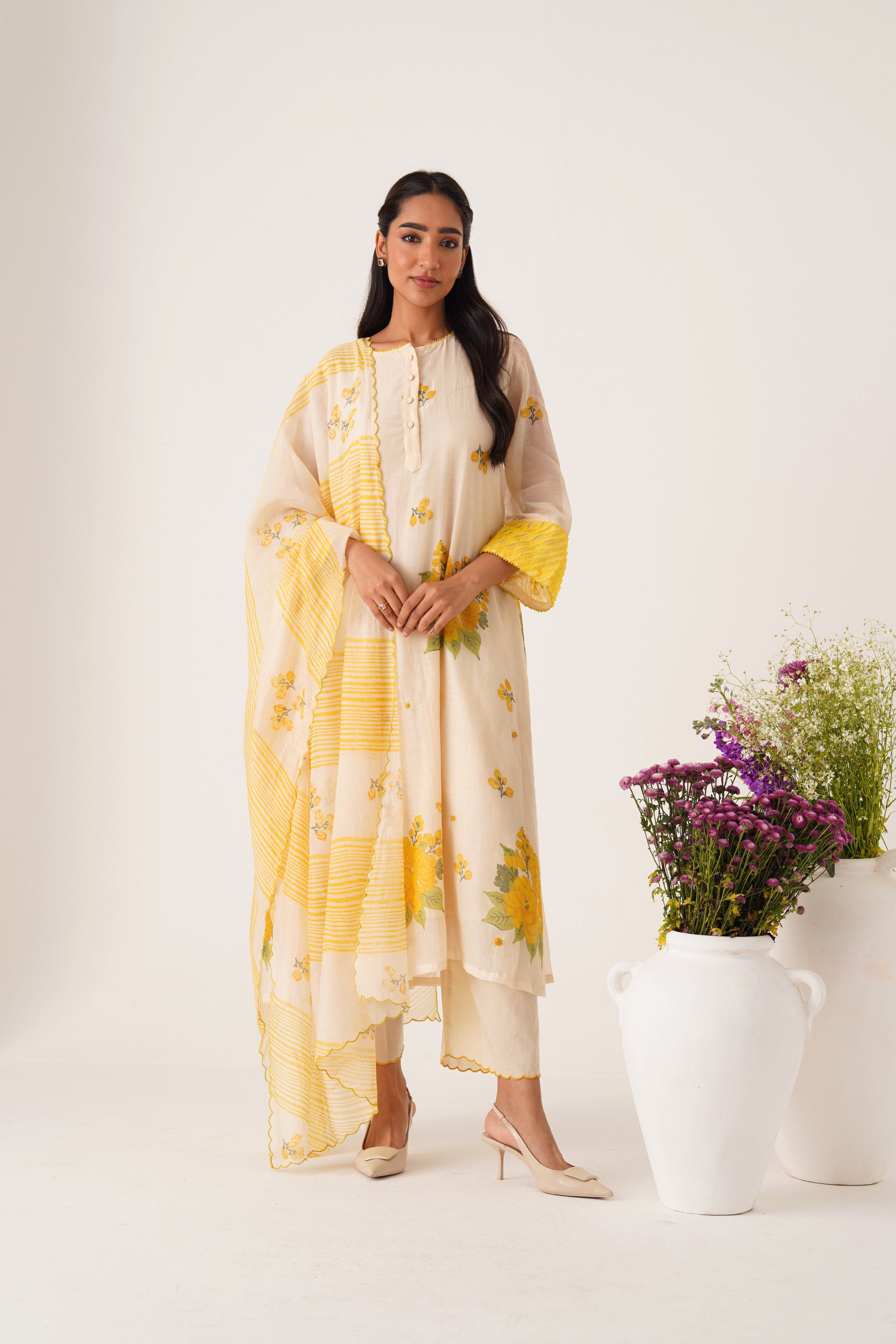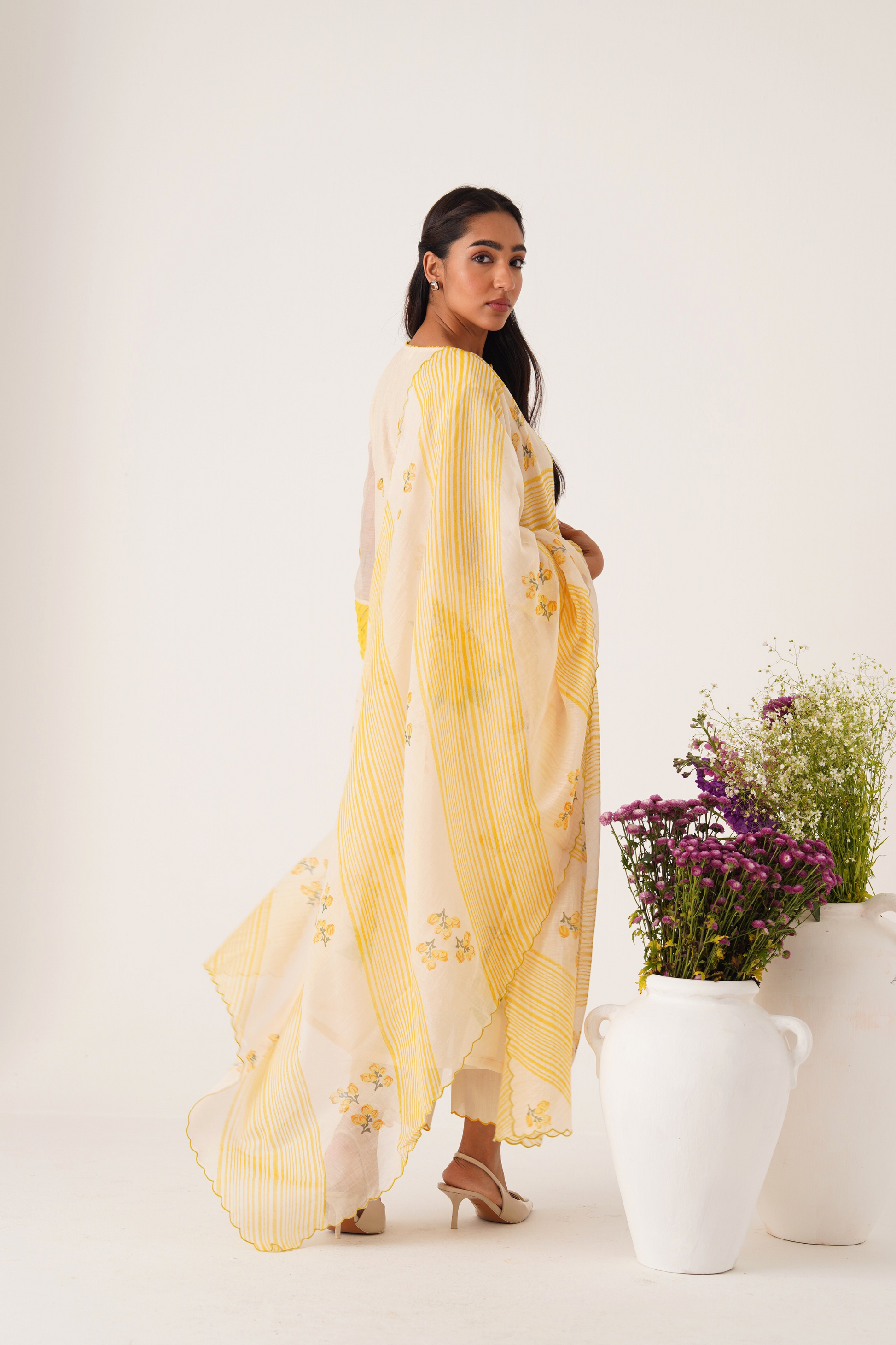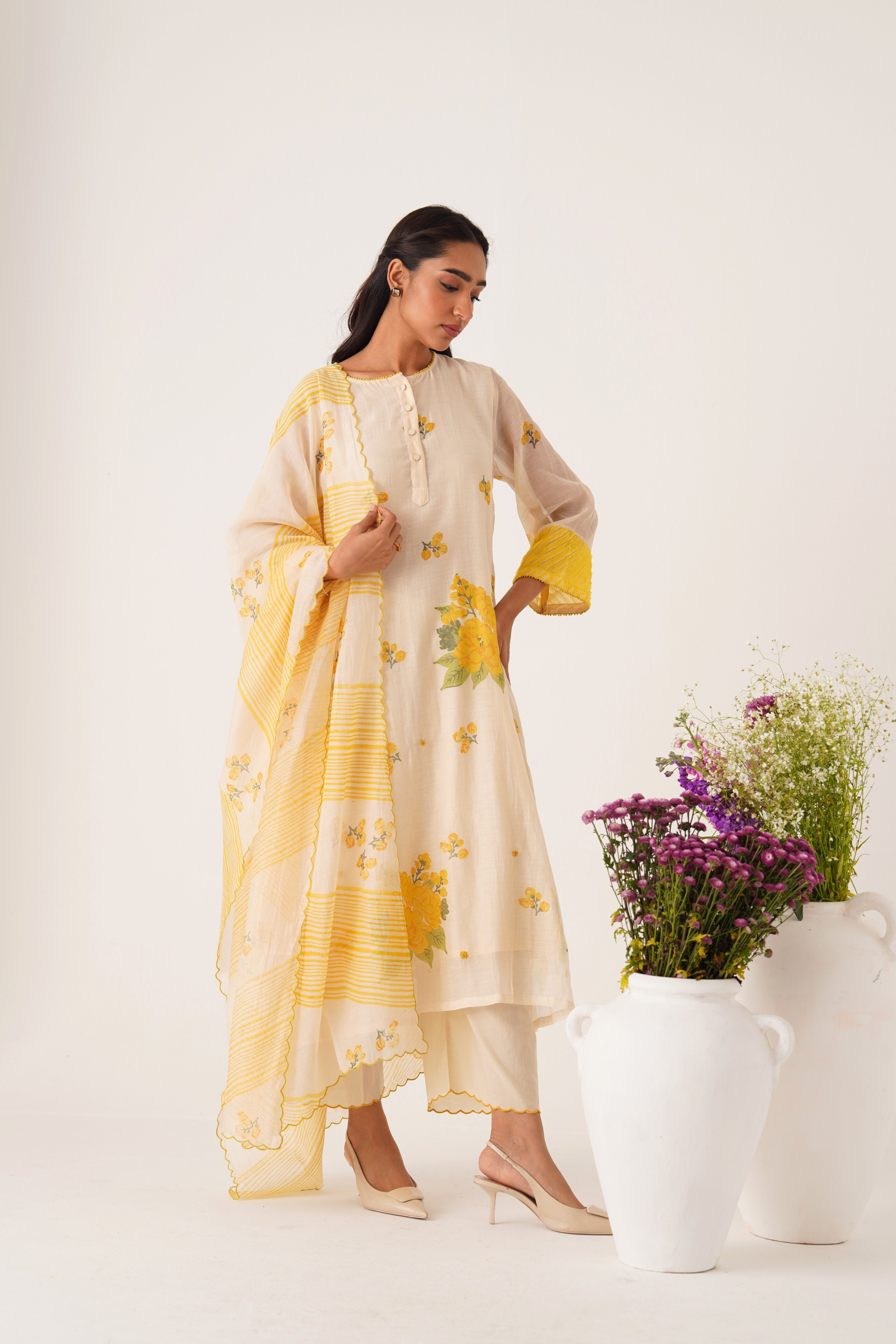 Phalgun yellow hand block printed chanderi kurta set (set of 3)