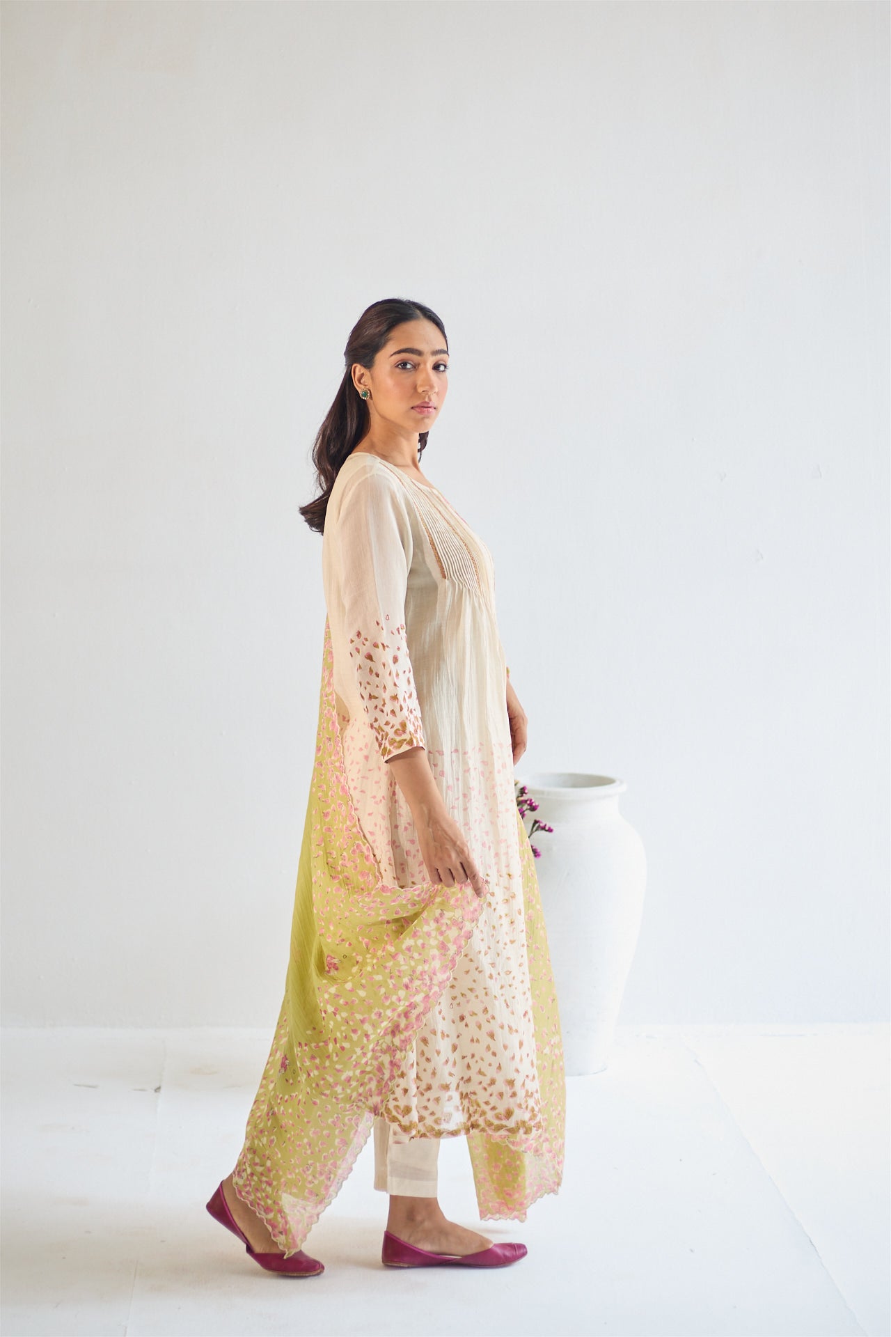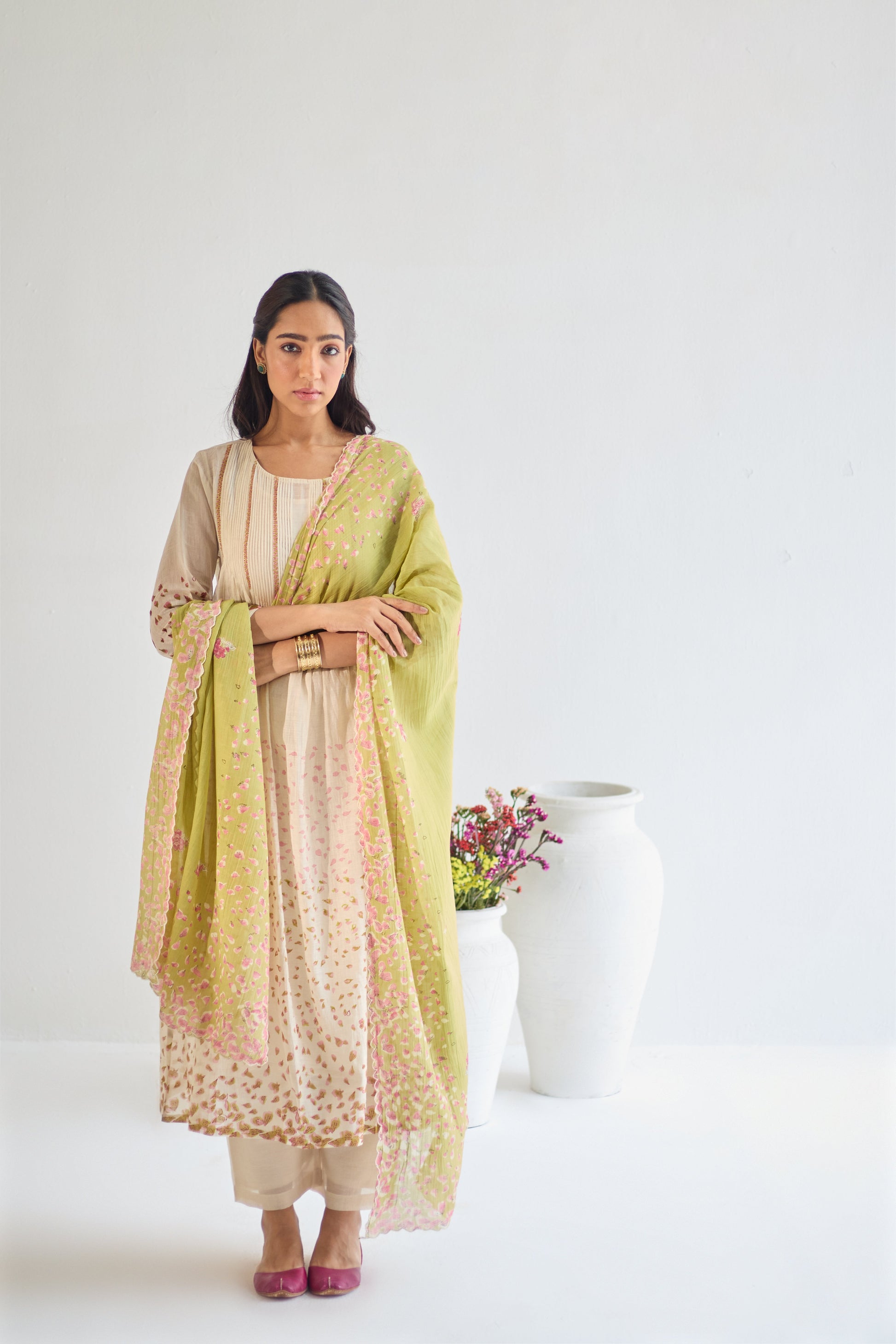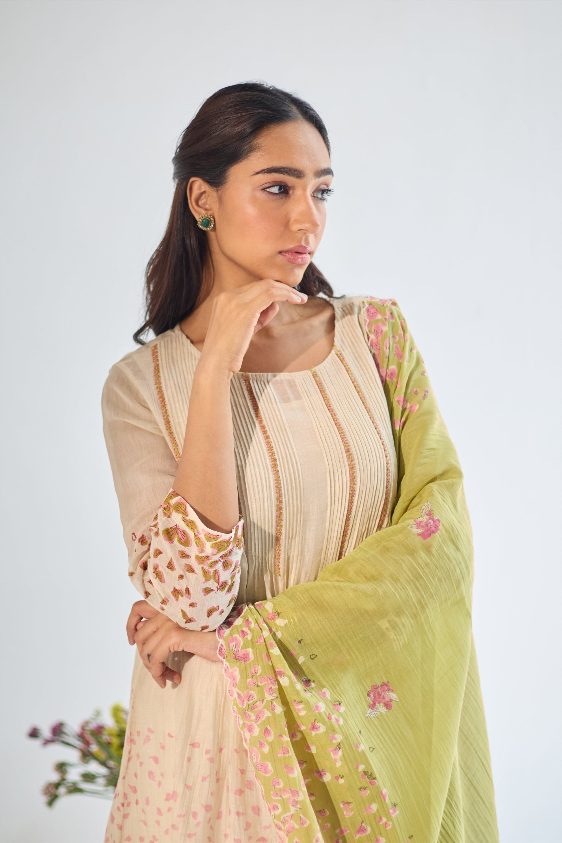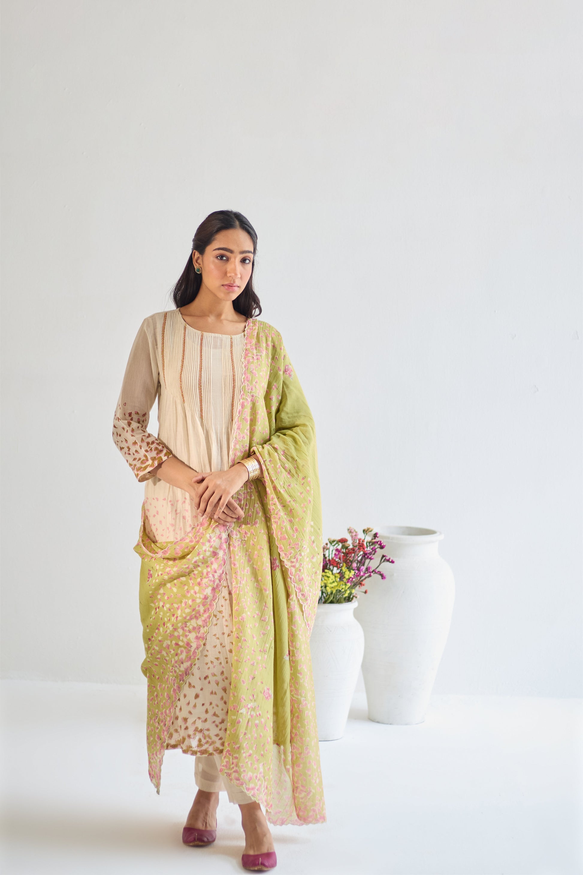 Pankhudi beige pink hand block printed chanderi kurta set (set of 3)