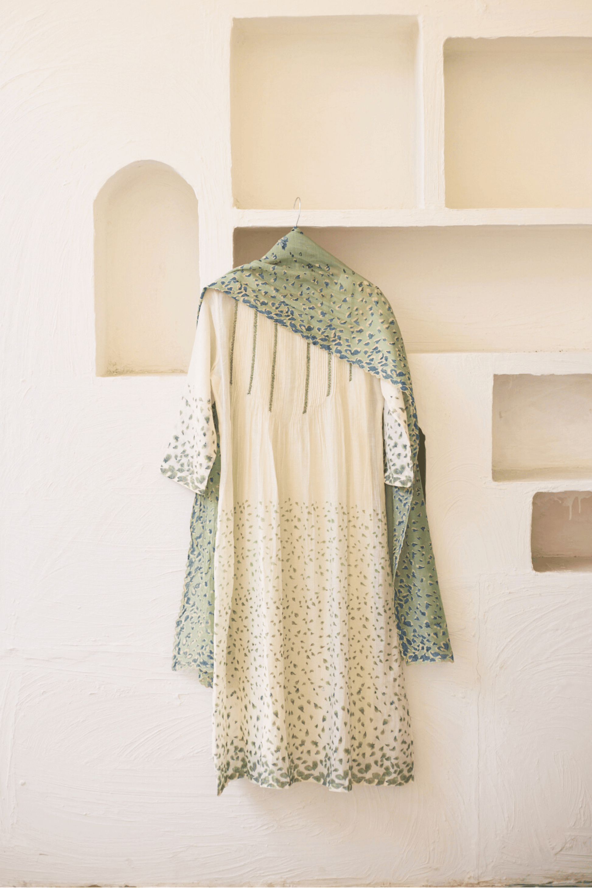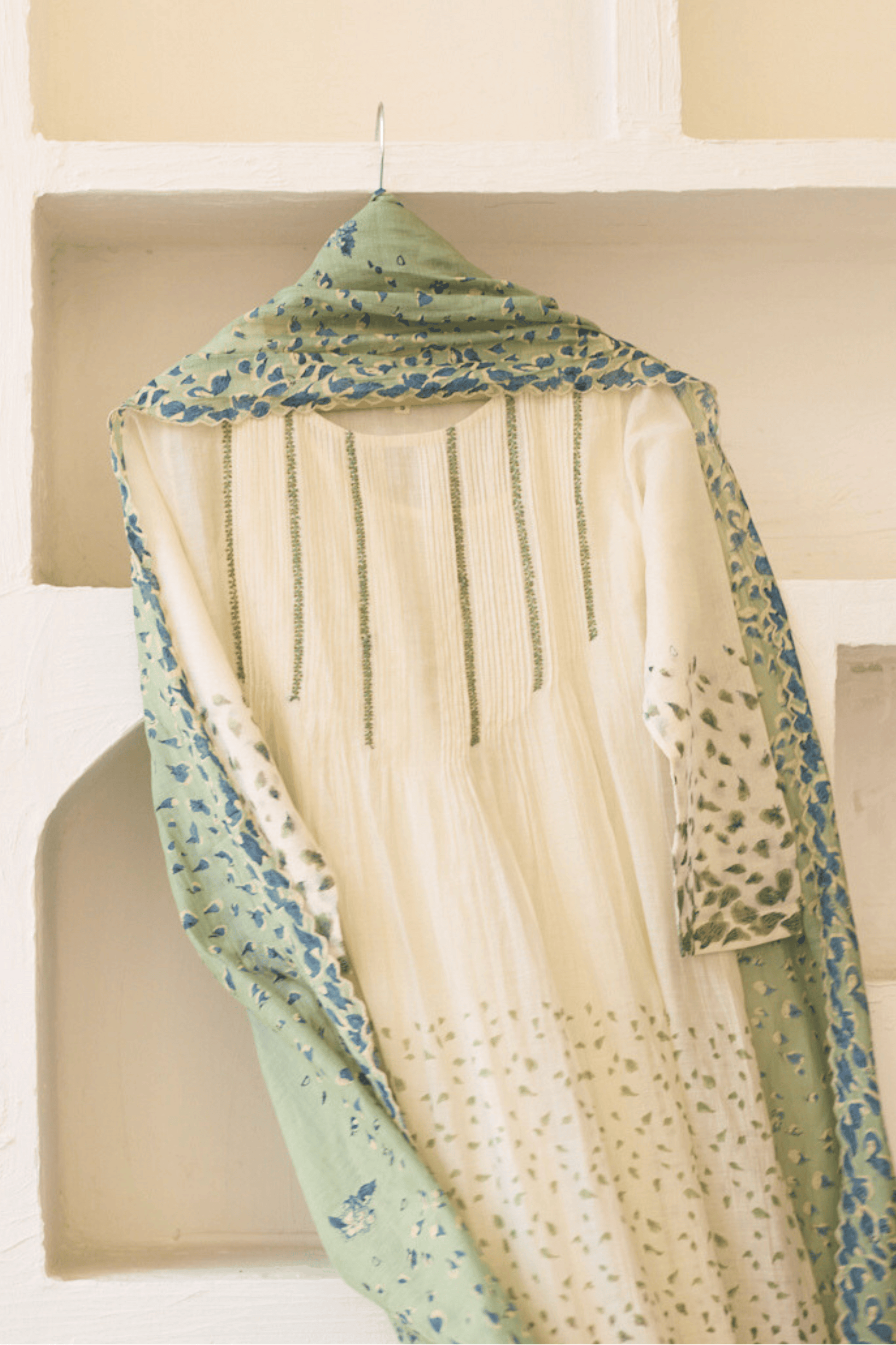 Pankhudi ivory sage green hand block printed chanderi kurta set (set of 3)