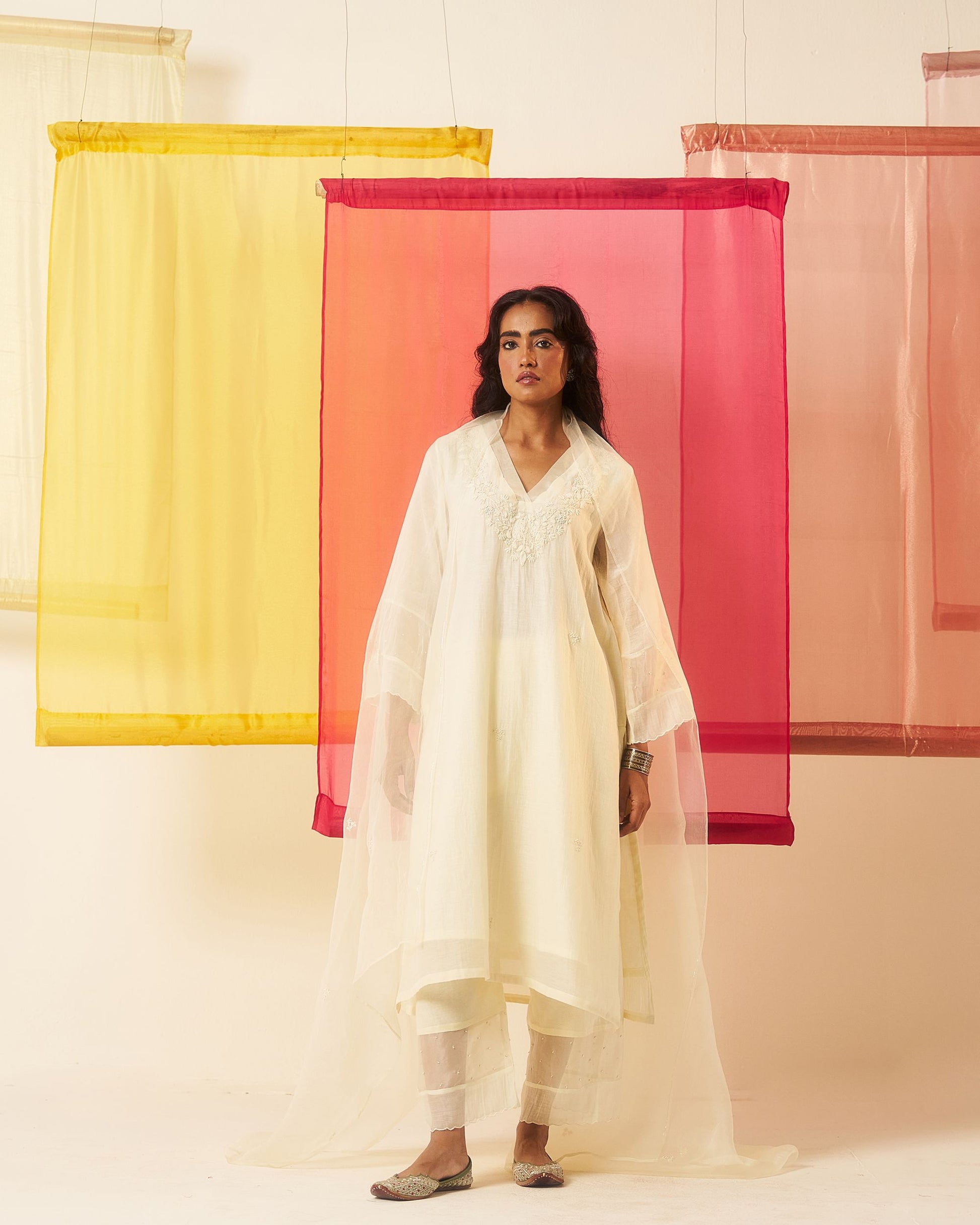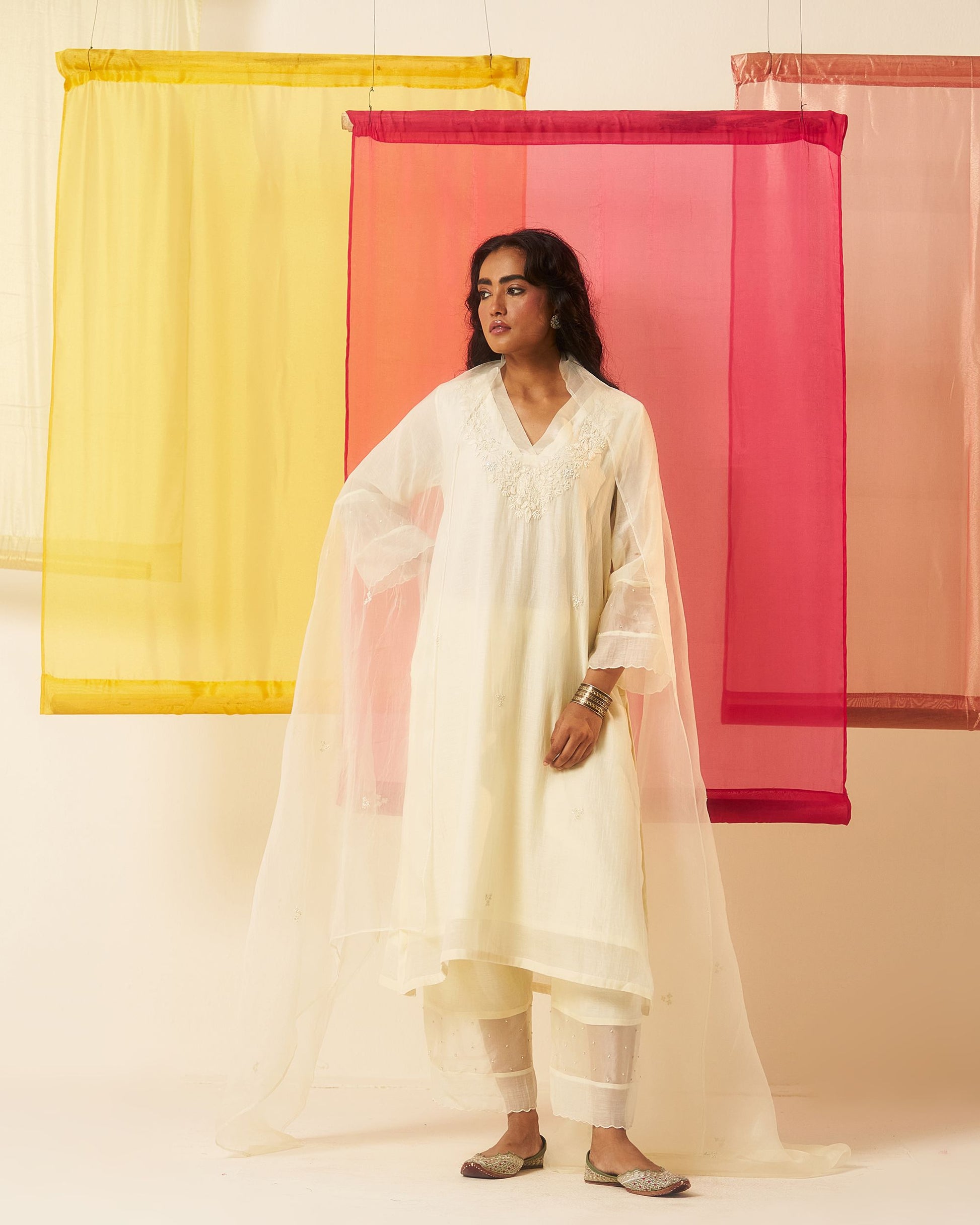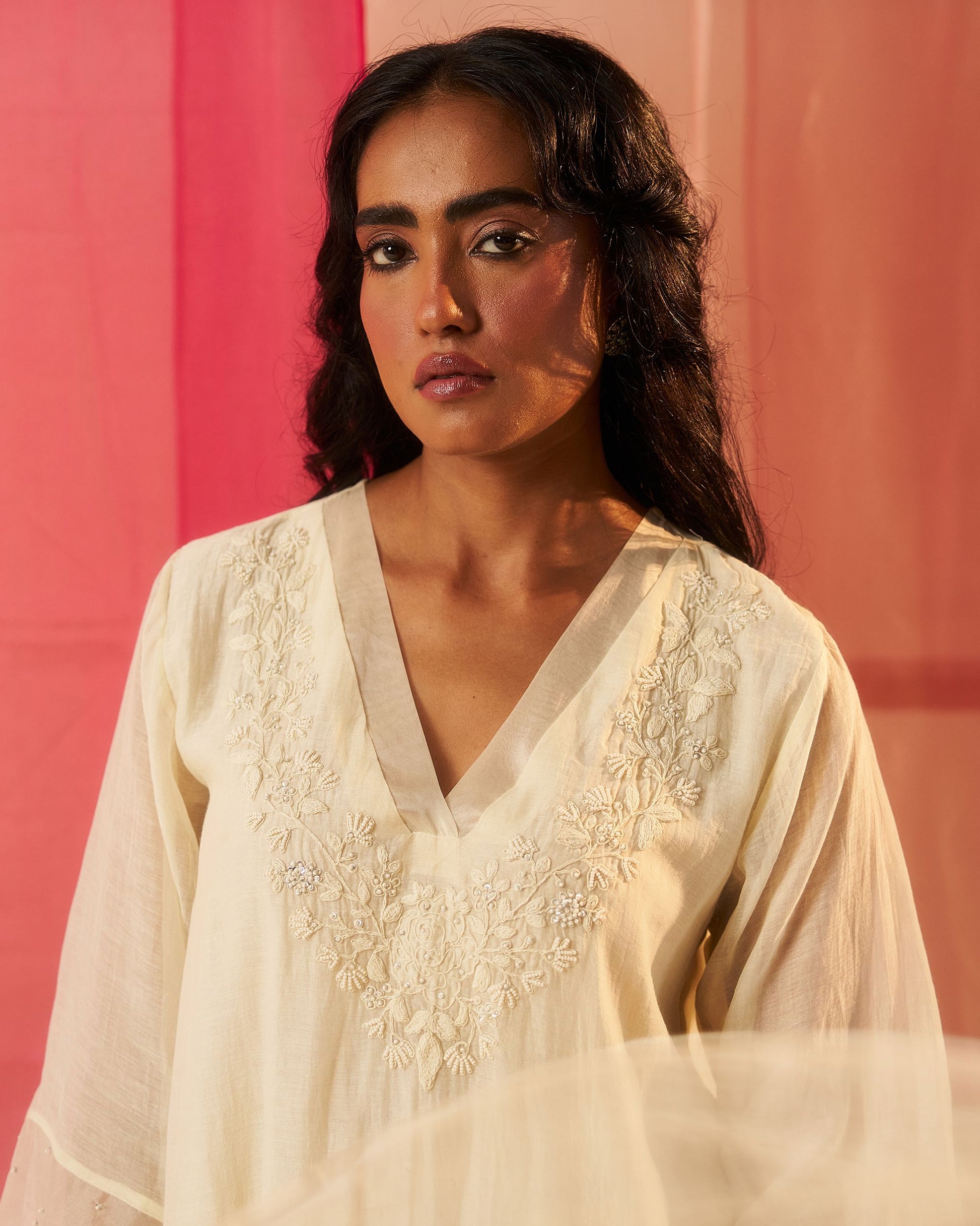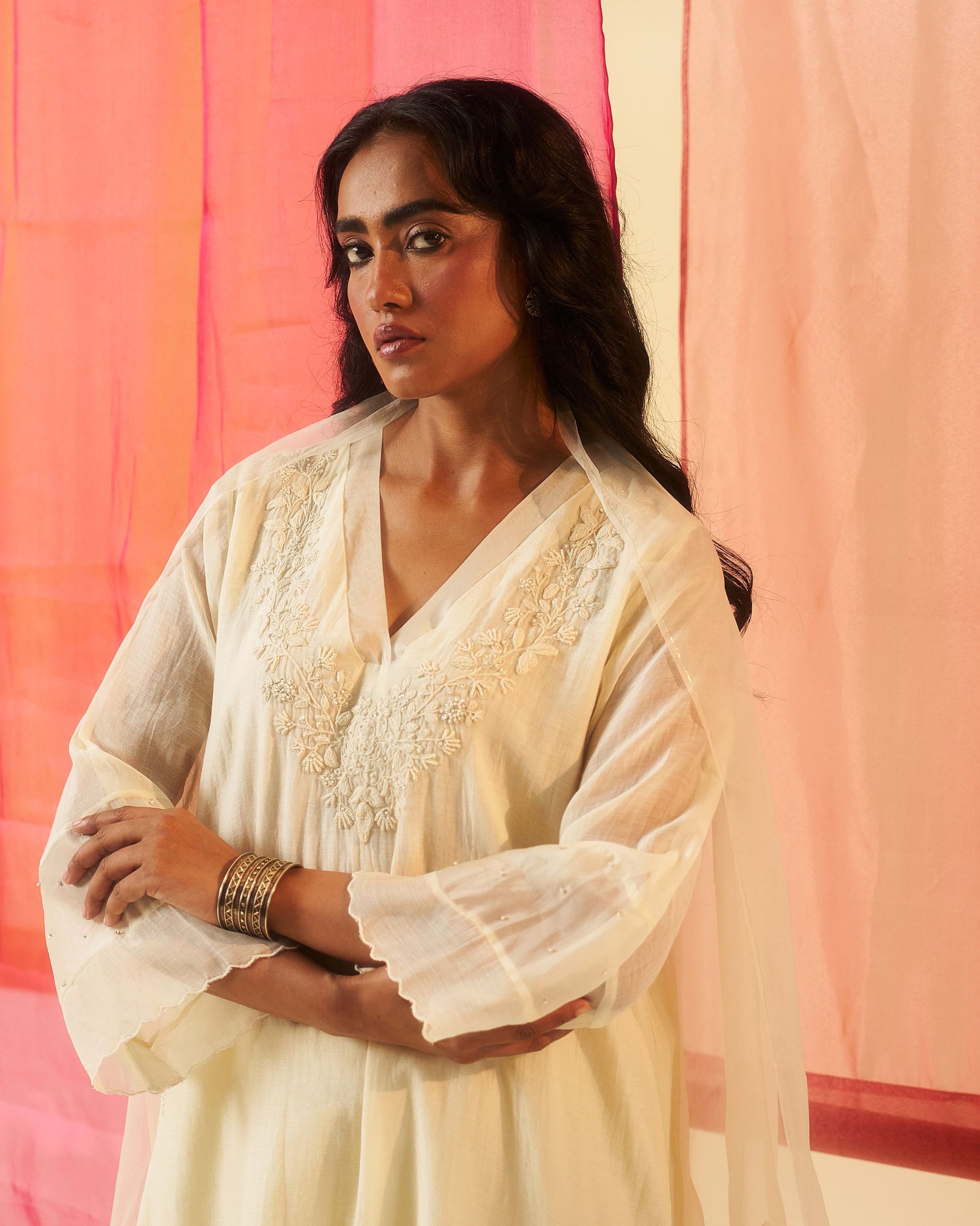 Phoolkari milky white dori hand embroidered chanderi kurta set