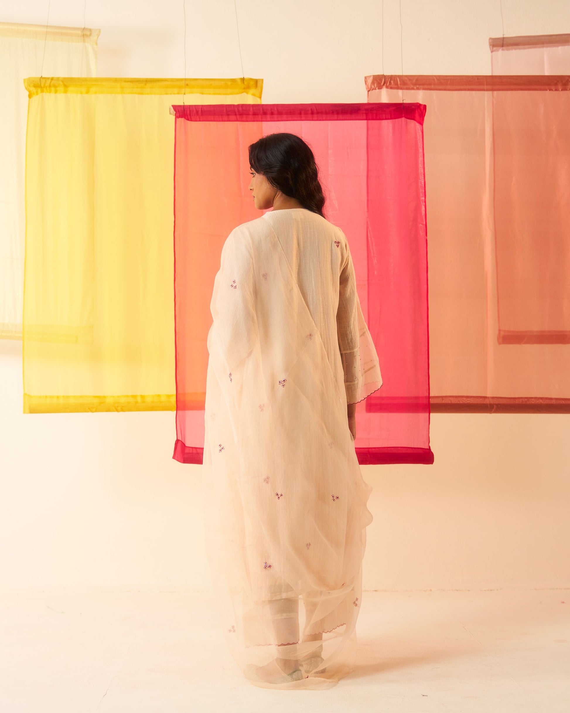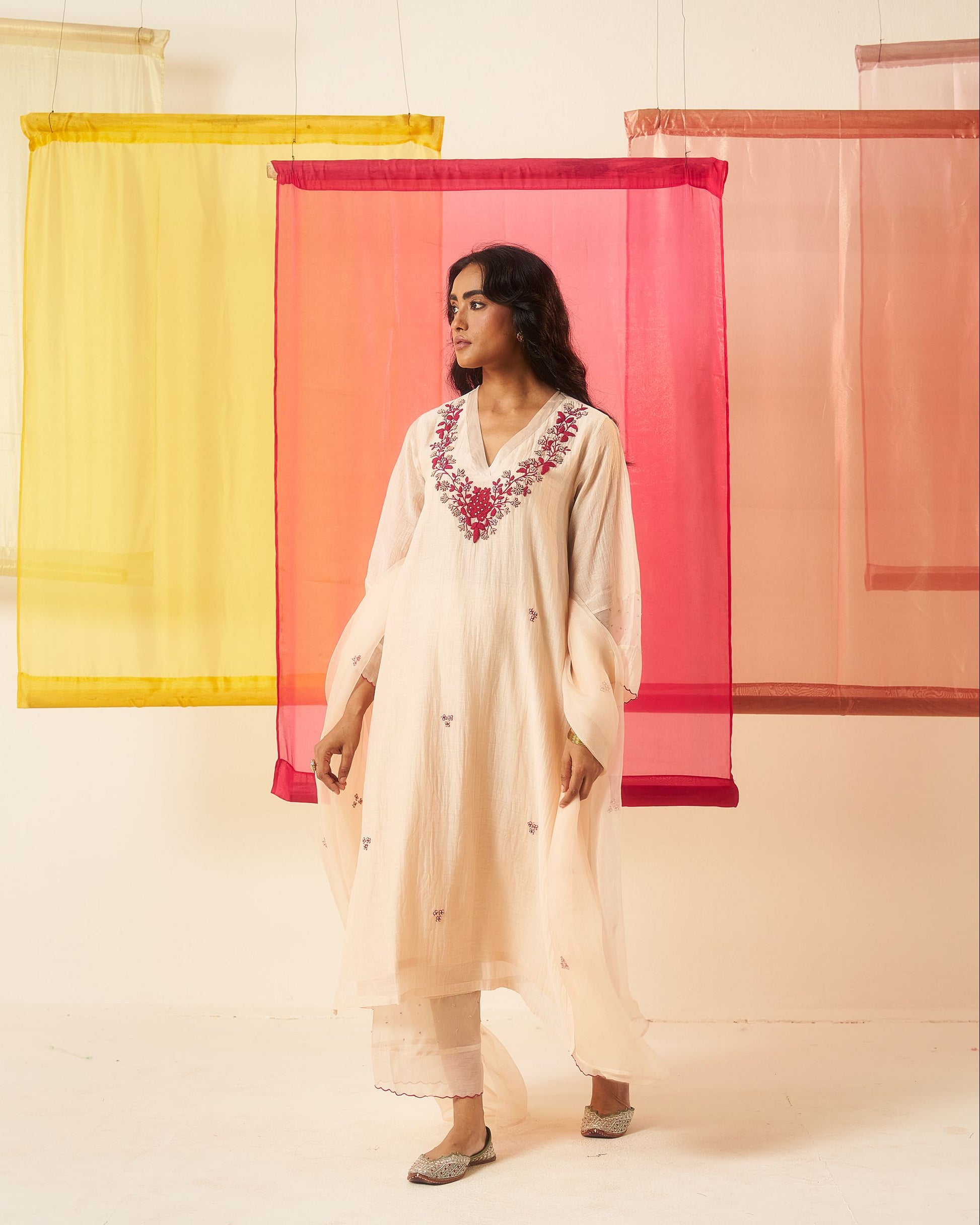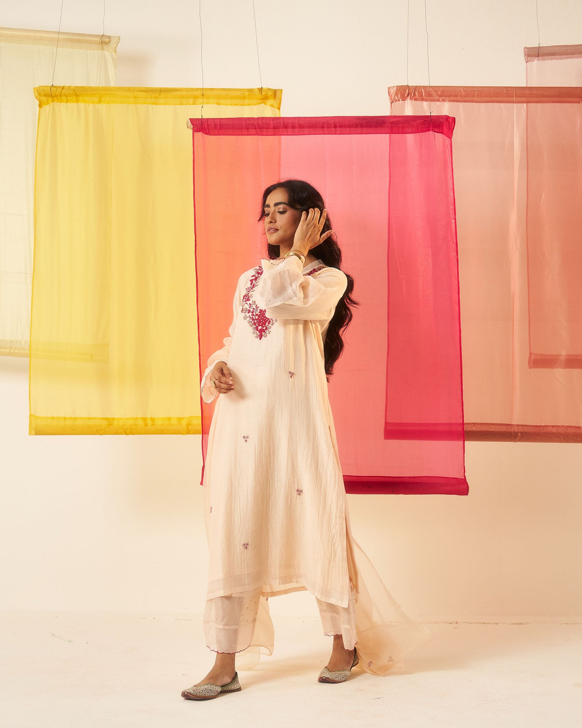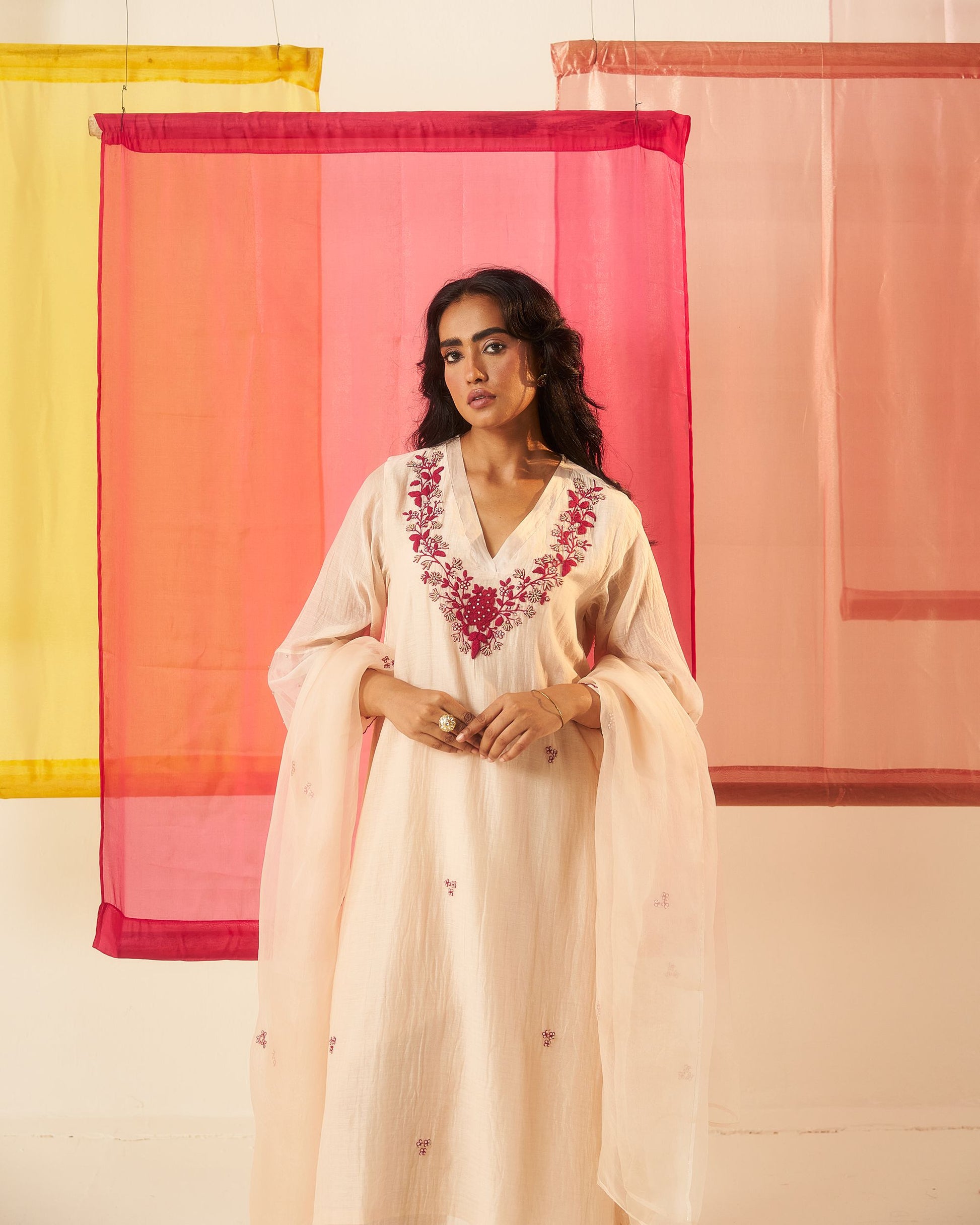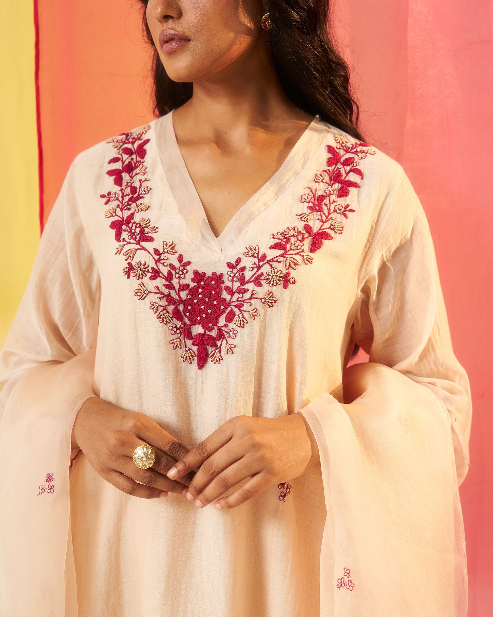 Phoolkari peach dori hand embroidered chanderi kurta set.