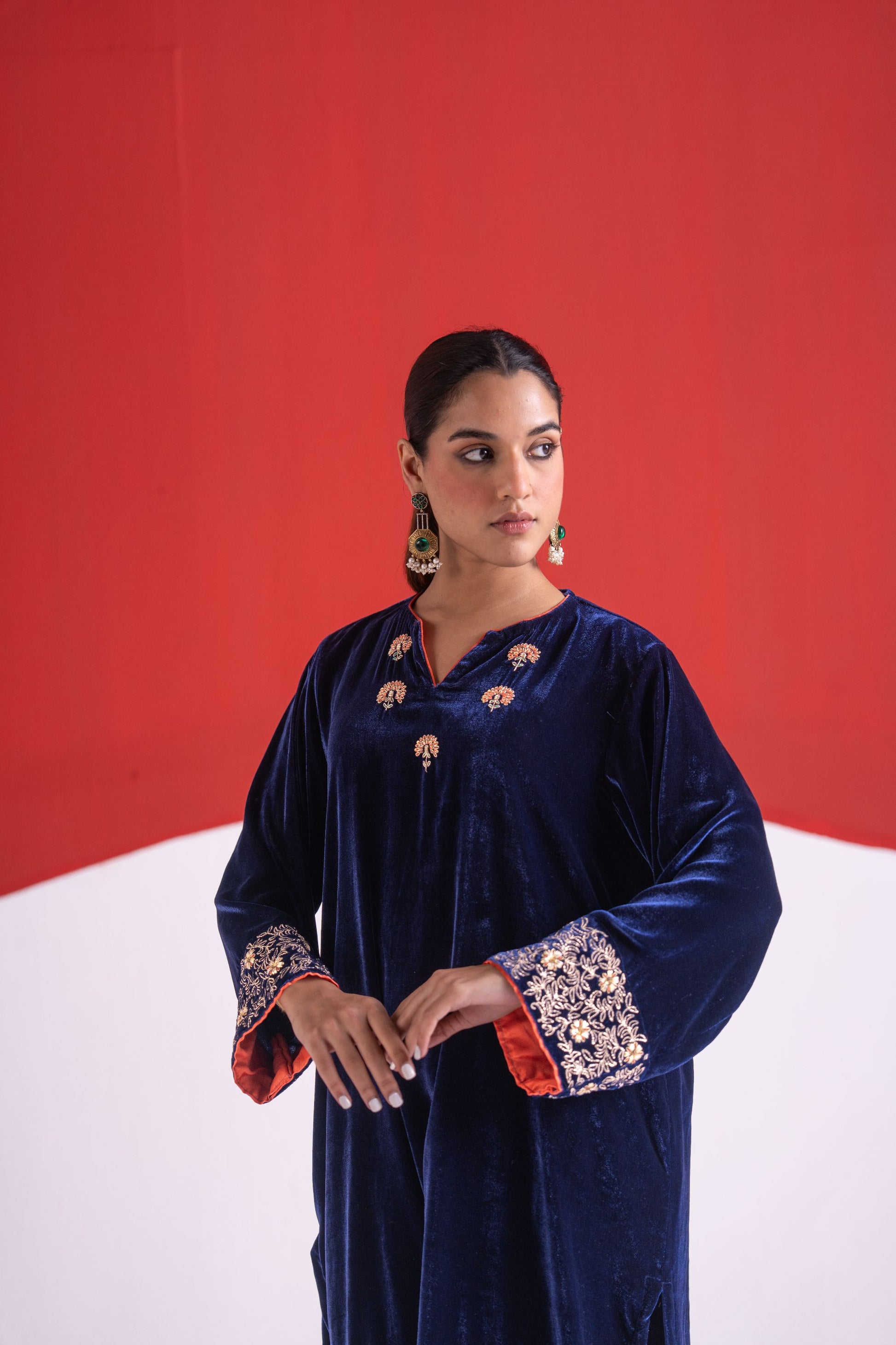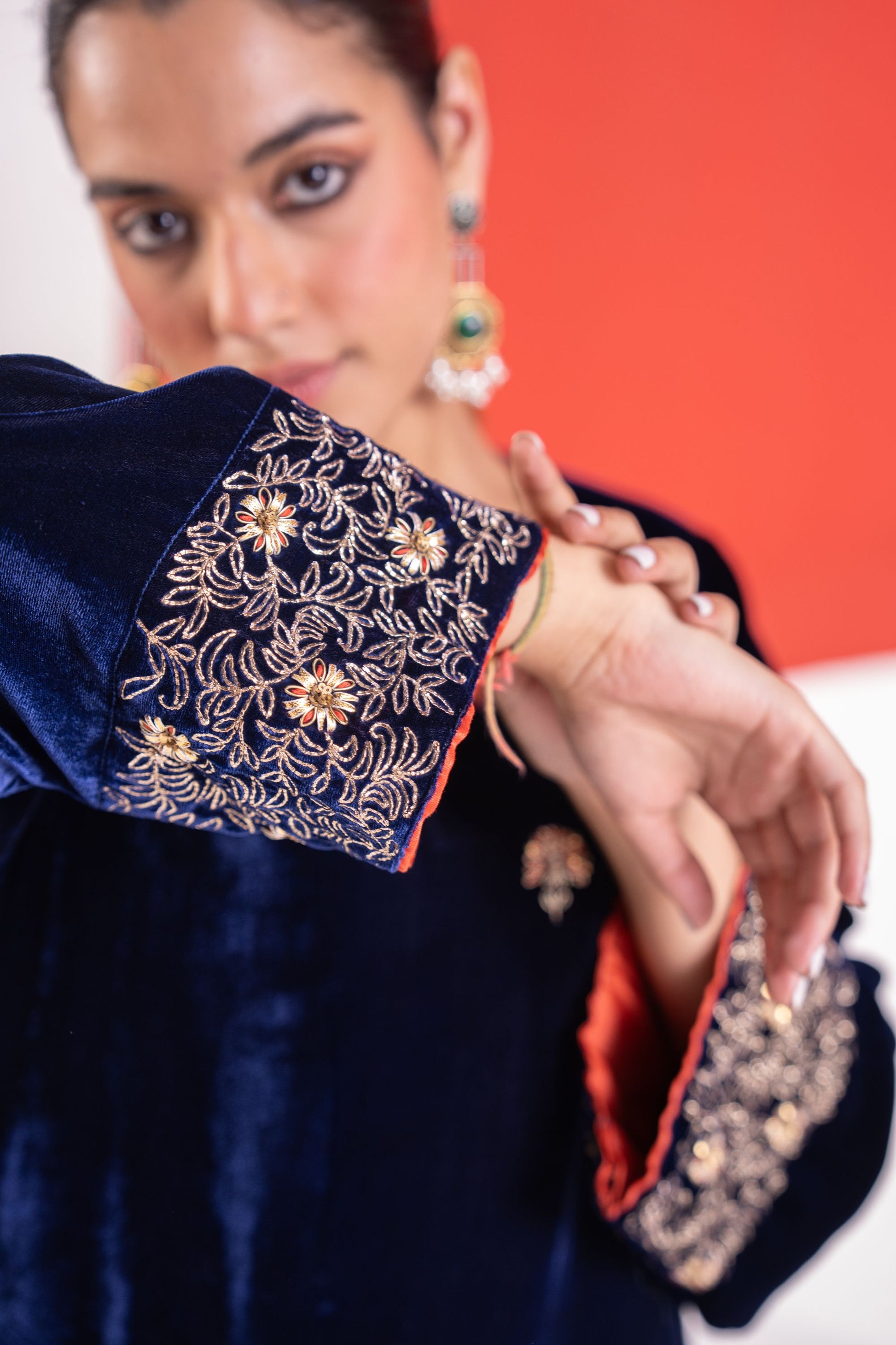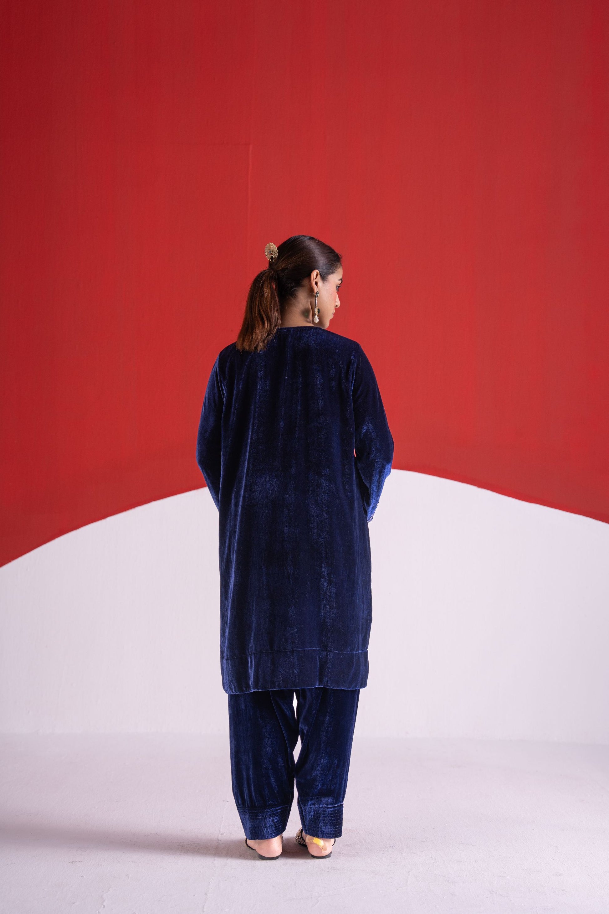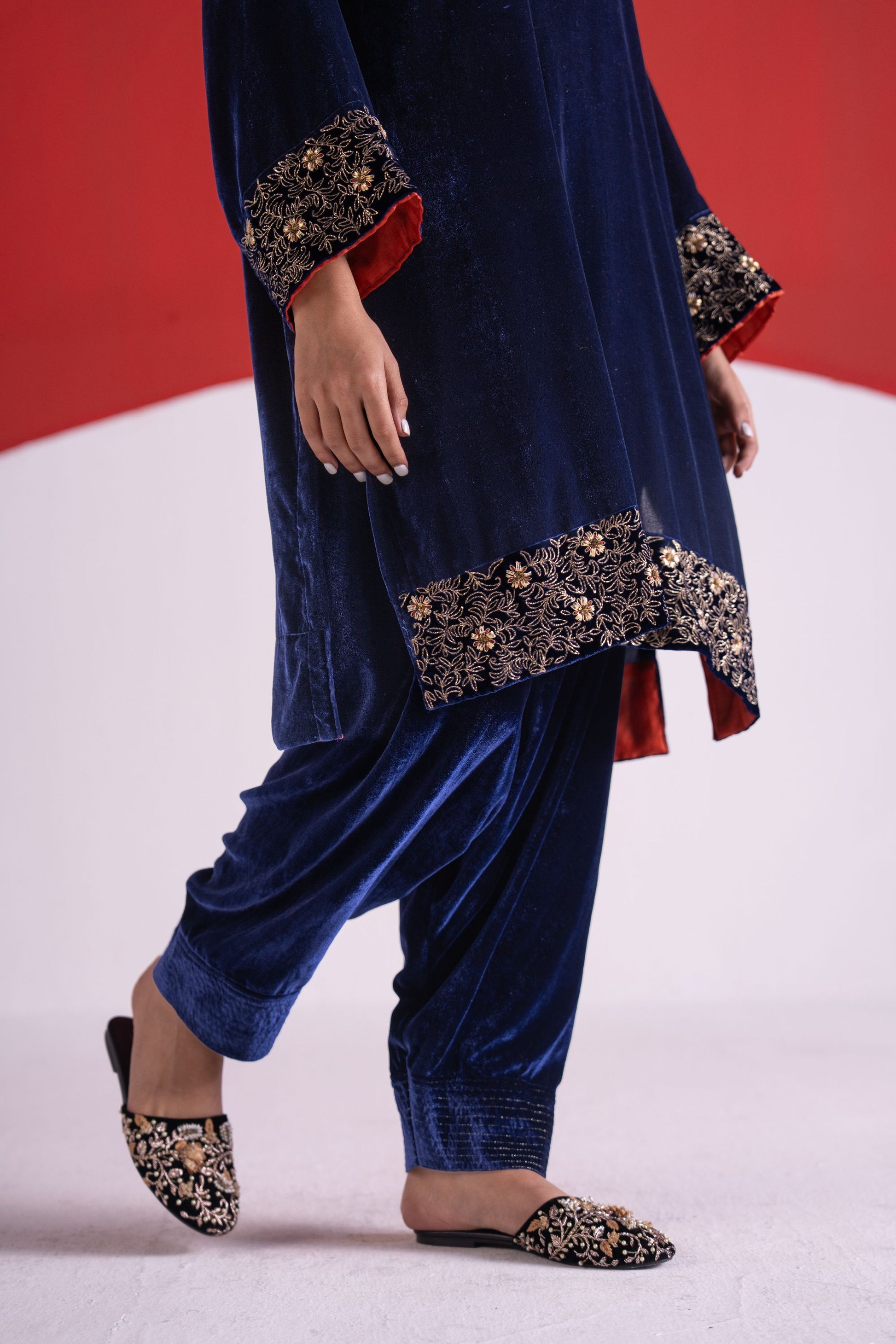 Roha blue gota and pitta work velvet short kurta set
