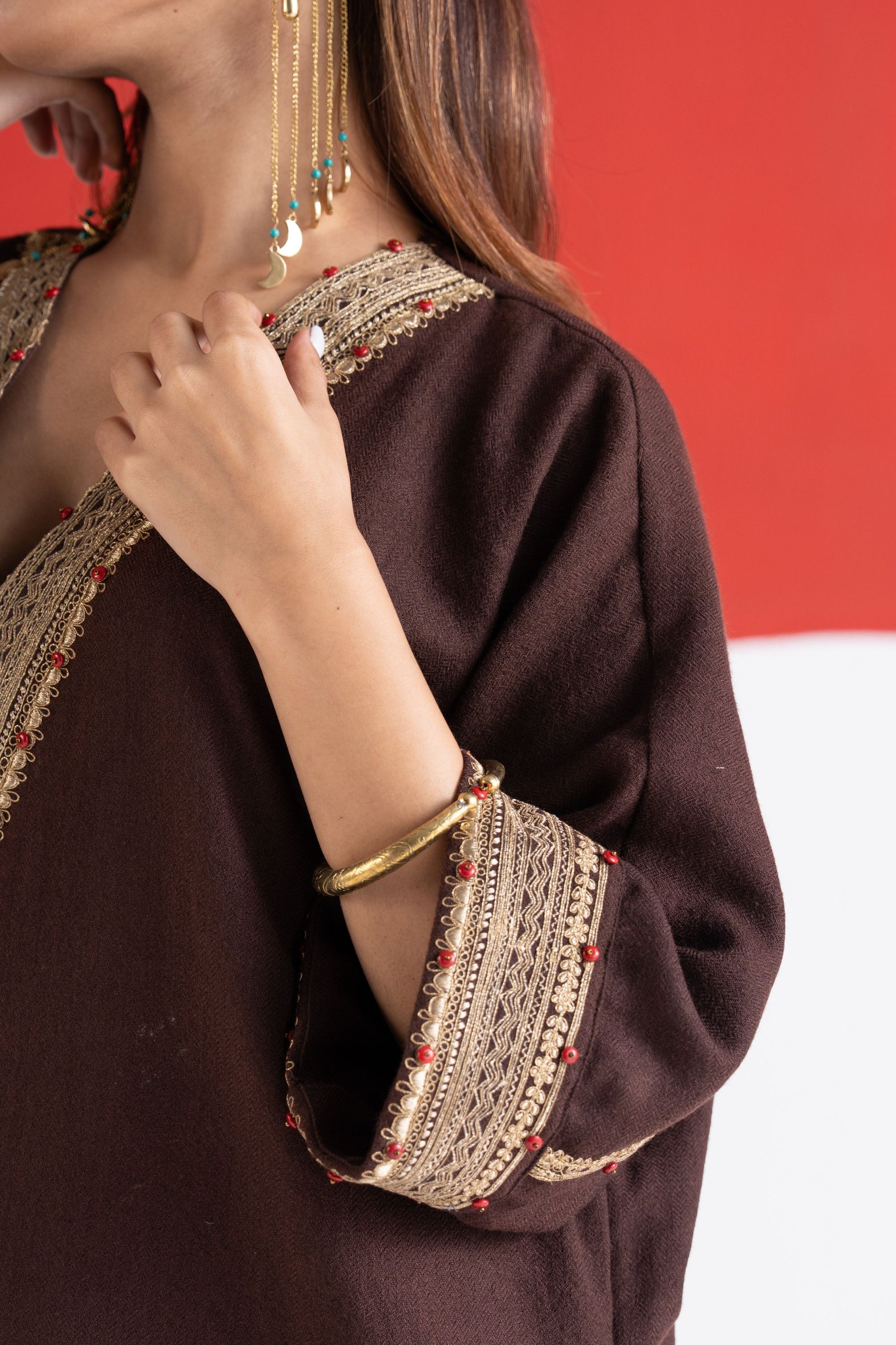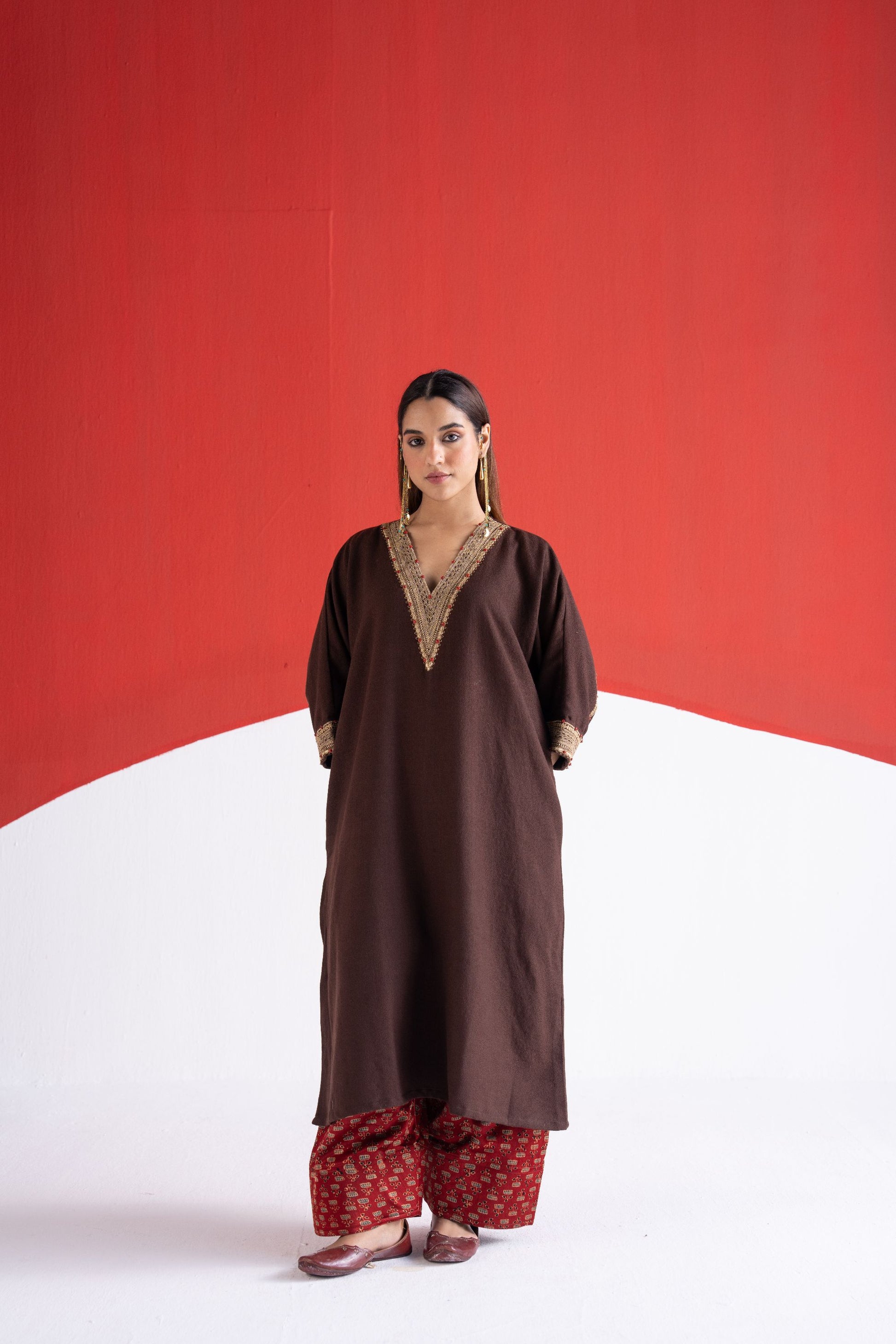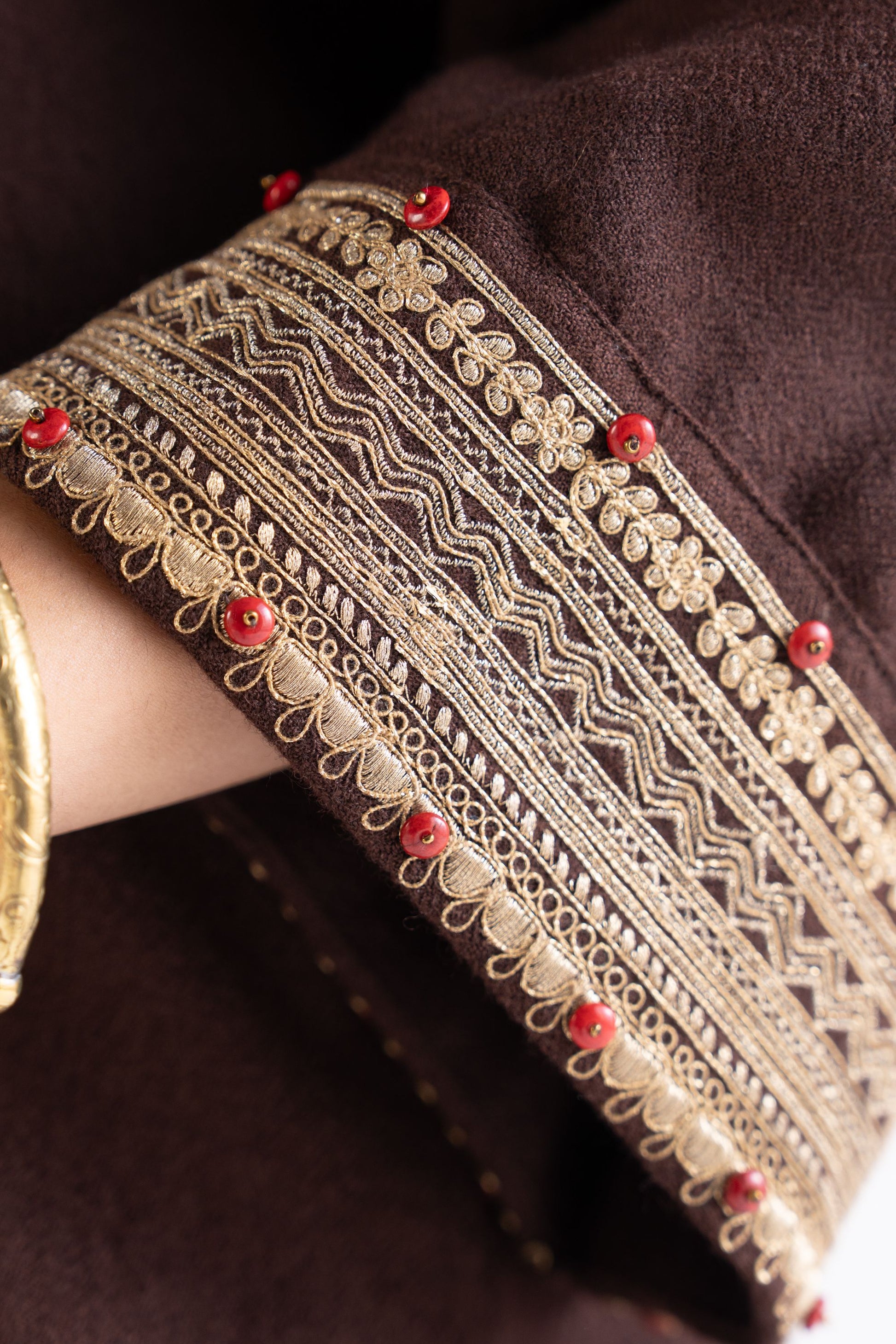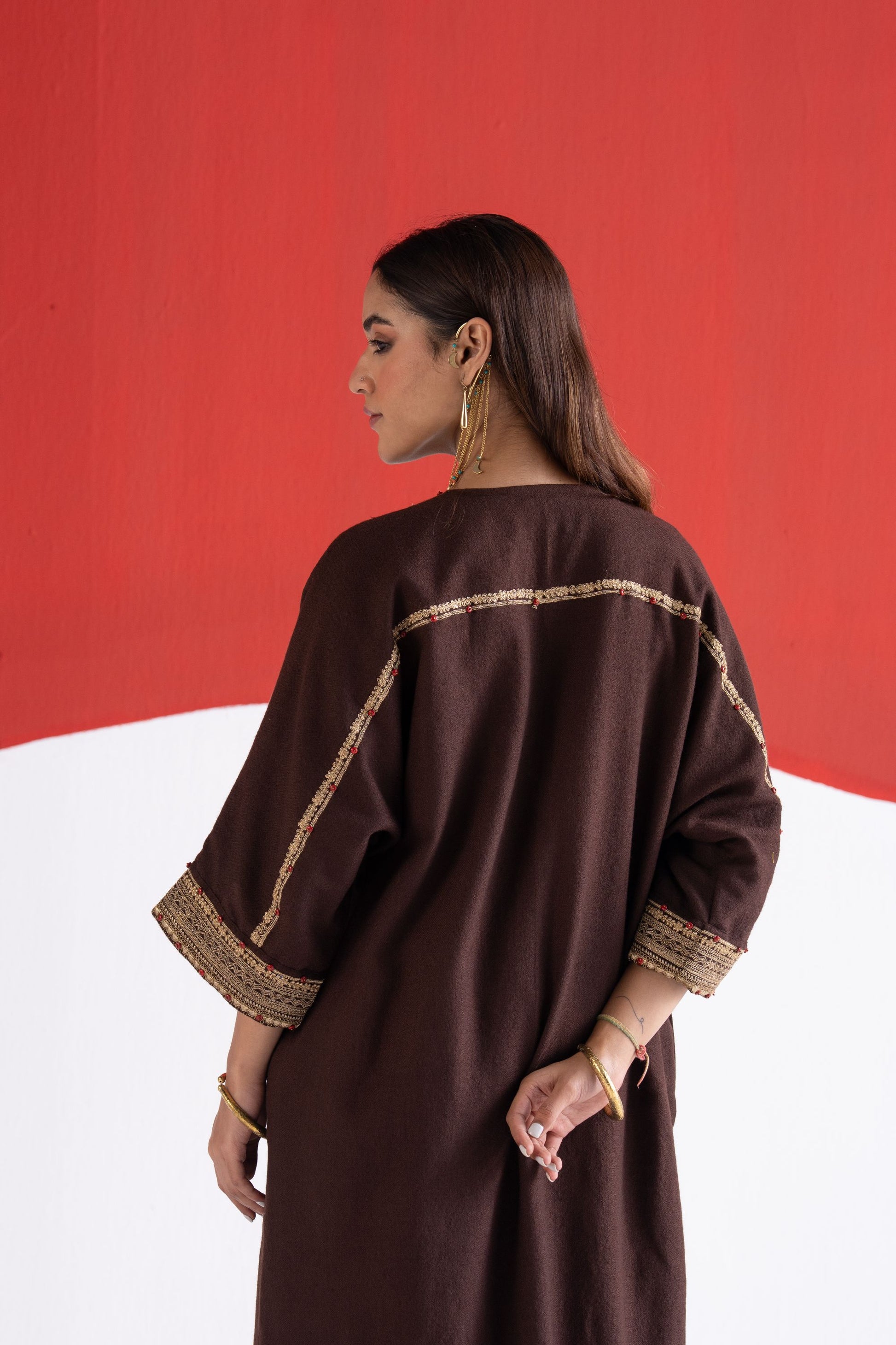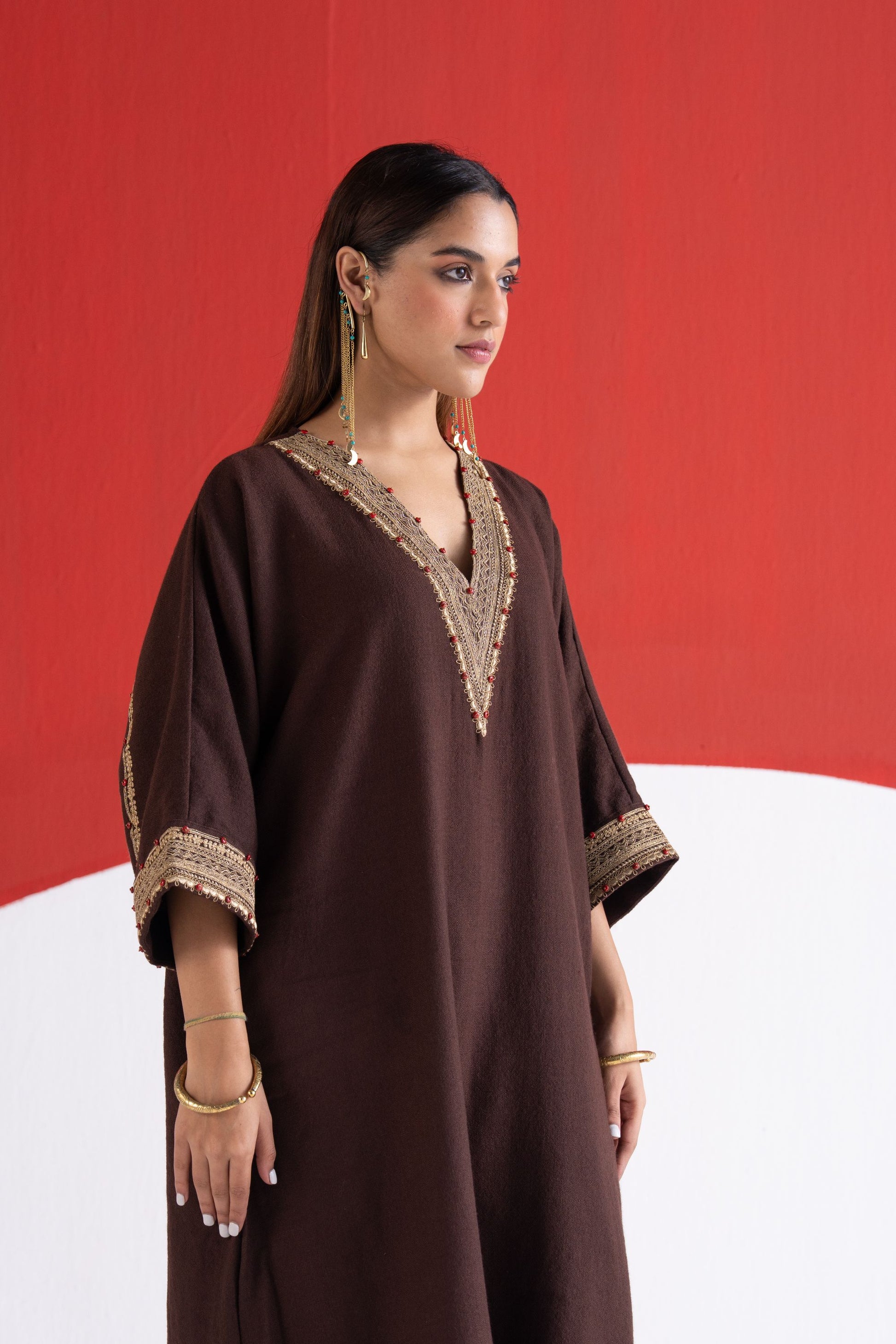 Roha brown zari and dori embroidered pure wool kaftan phiran